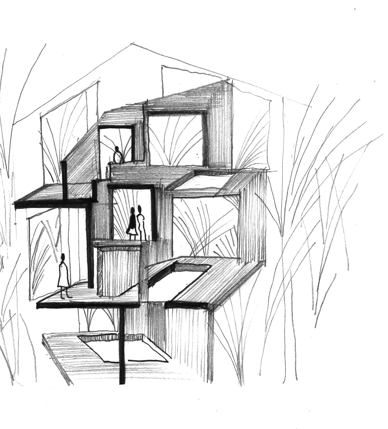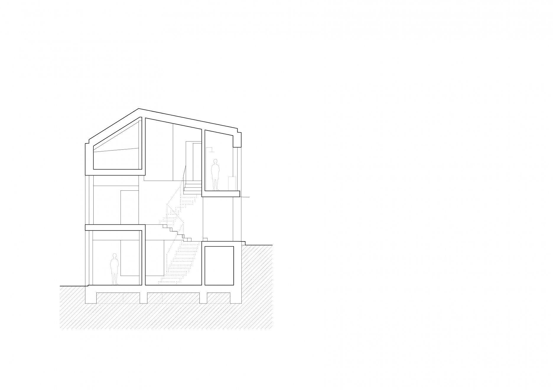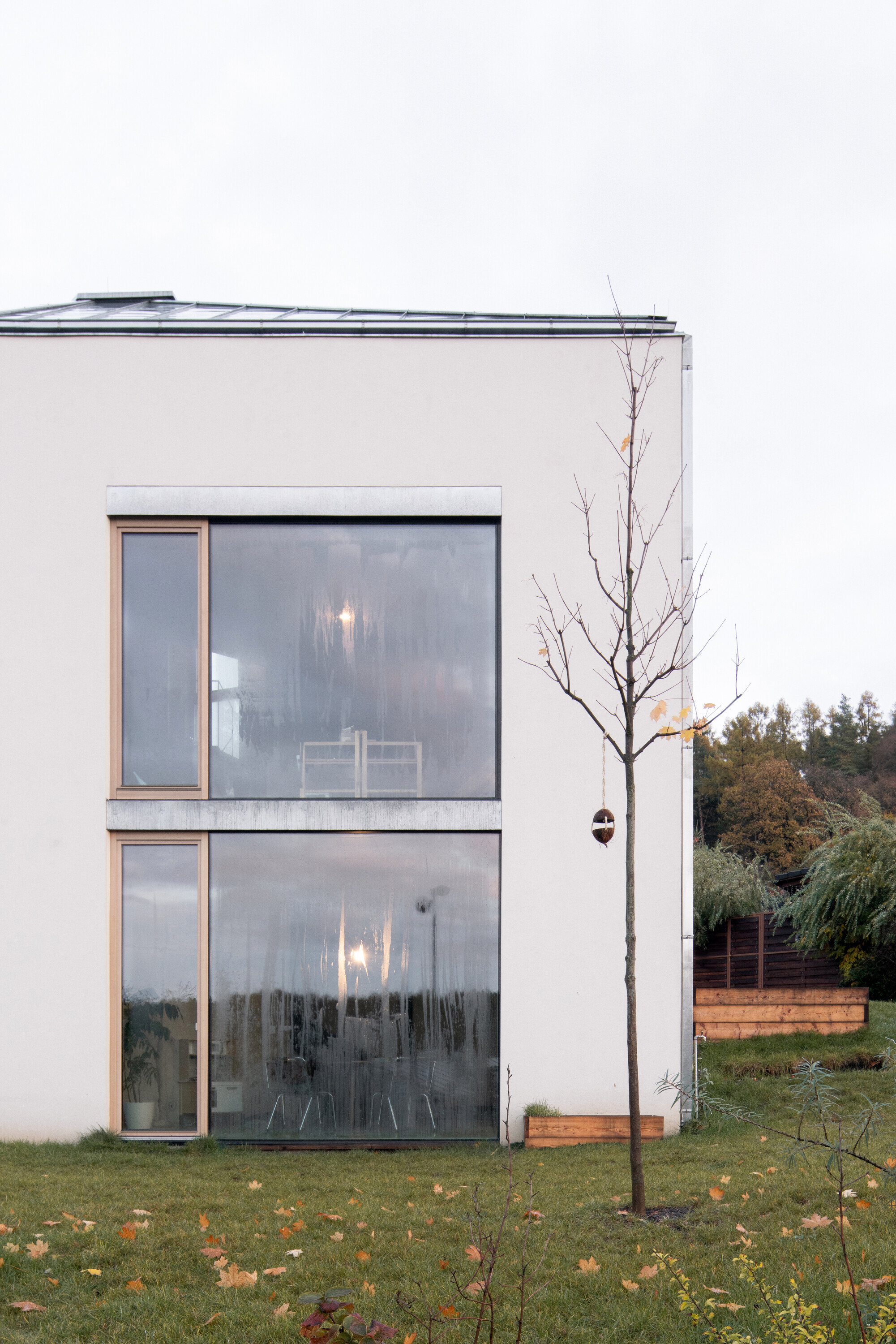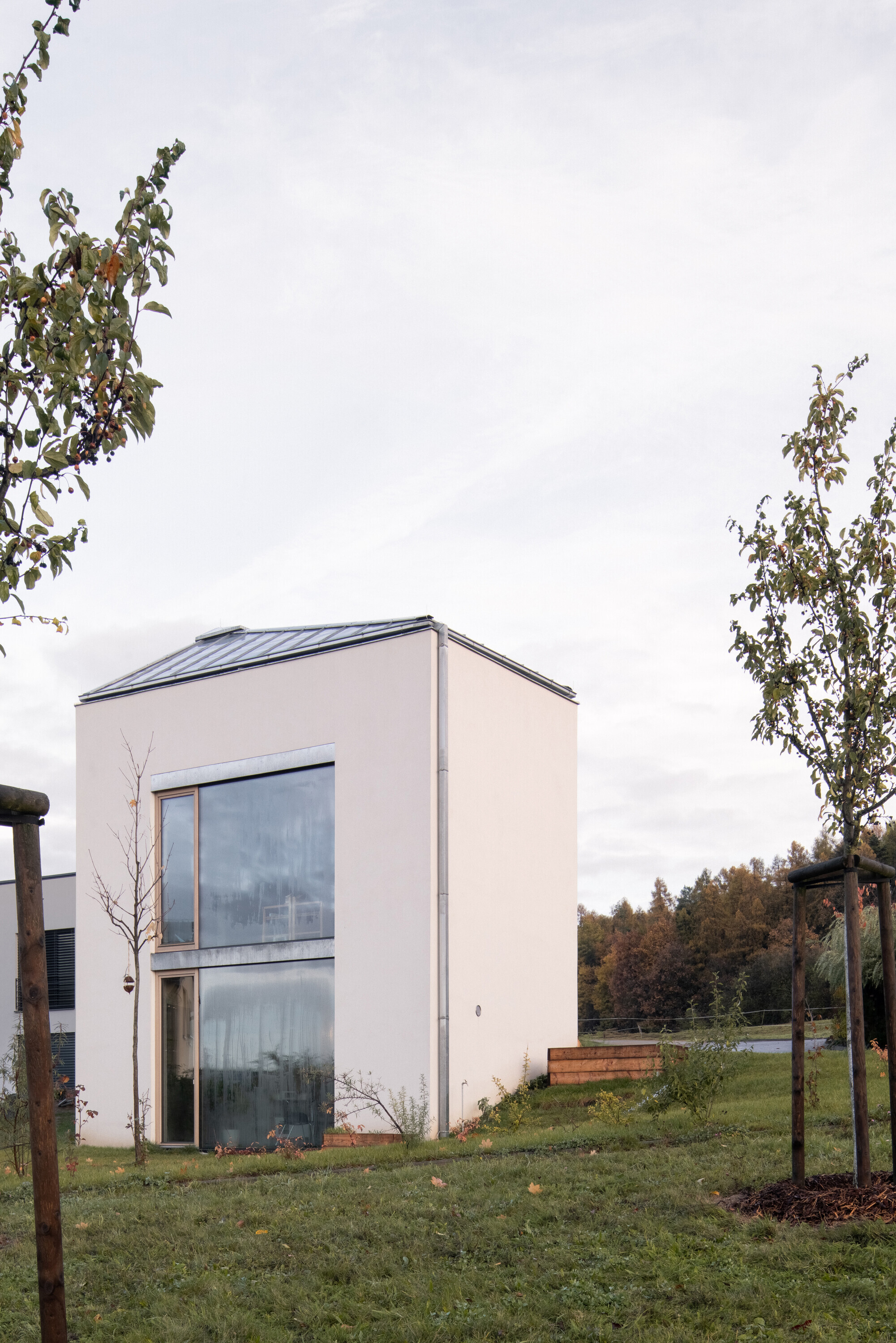 Dom sa nachádza na svahovitom pozemku s výhľadmi do okolitej krajiny. Nepravidelný päťuholníkový pôdorys so zastavanou plochou približne 63 m² umožňuje efektívne využitie menšej parcely a necháva voľný priestor pre záhradu. Vonkajšie architektonické stvárnenie vychádza najmä z vnútorného priestorového konceptu. “Přístup spočívá v rozdělení prostoru na různé úrovně, z nichž každá nabízí odlišné světelné podmínky, výhledy a úroveň intimity. Díky tomu je vytvořen pocit prostornosti a neustálého pohybu - každý roh nebo průchod v domě přináší nový pohled na vnější prostředí nebo do dalších částí interiéru. Použití závěsů umožňuje variabilně měnit světelné podmínky a intimitu jednotlivých místností, což vytváří atmosféru, kterou lze snadno přizpůsobit různým momentům dne,” vysvetľujú svoj zámer architekti.