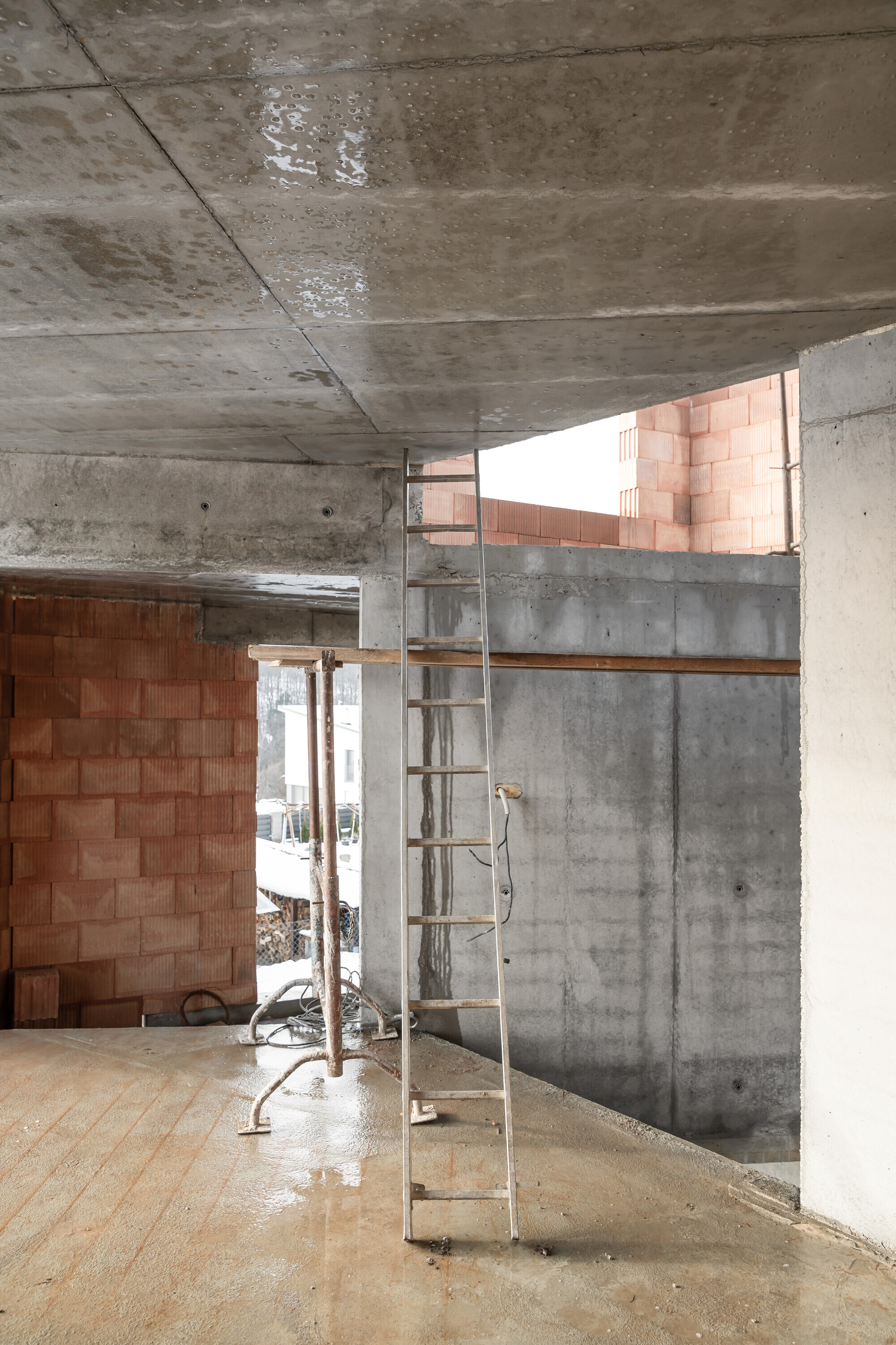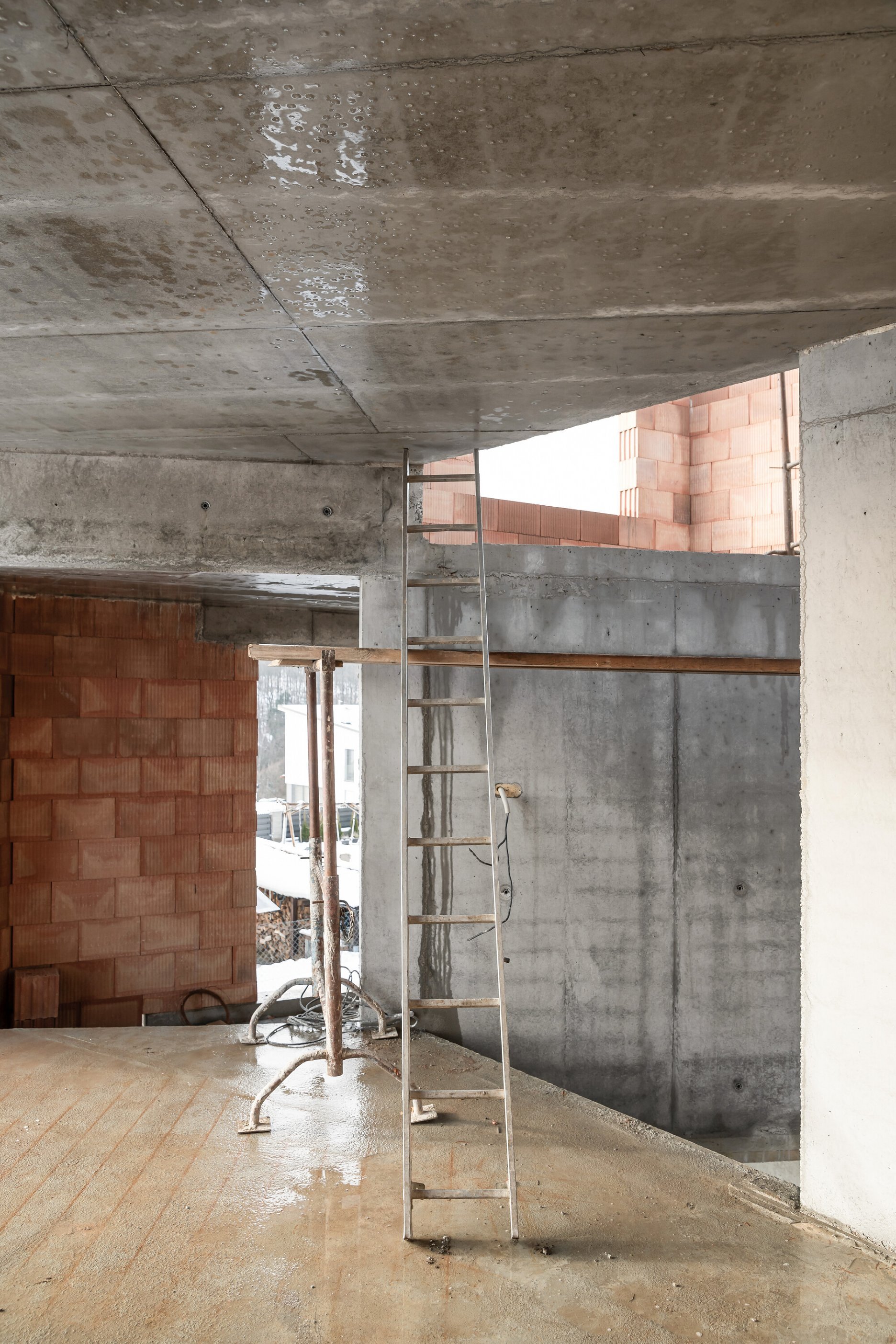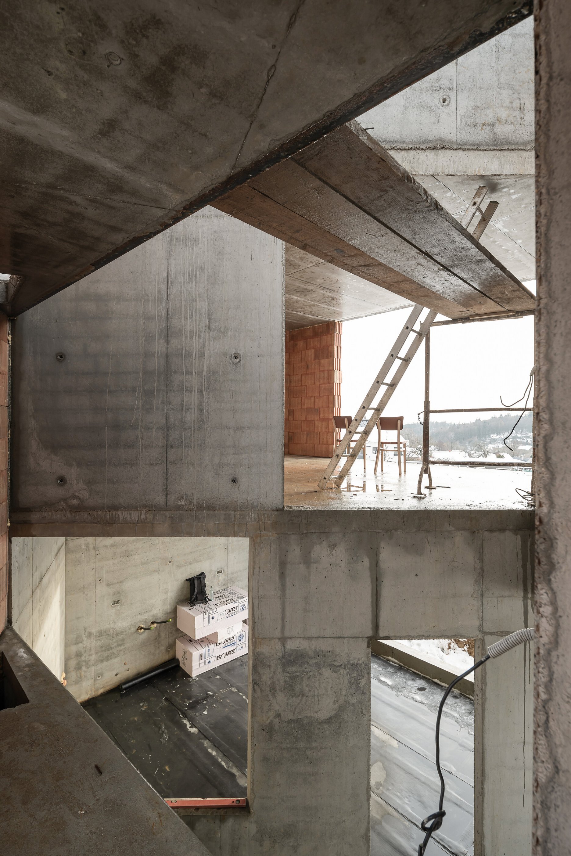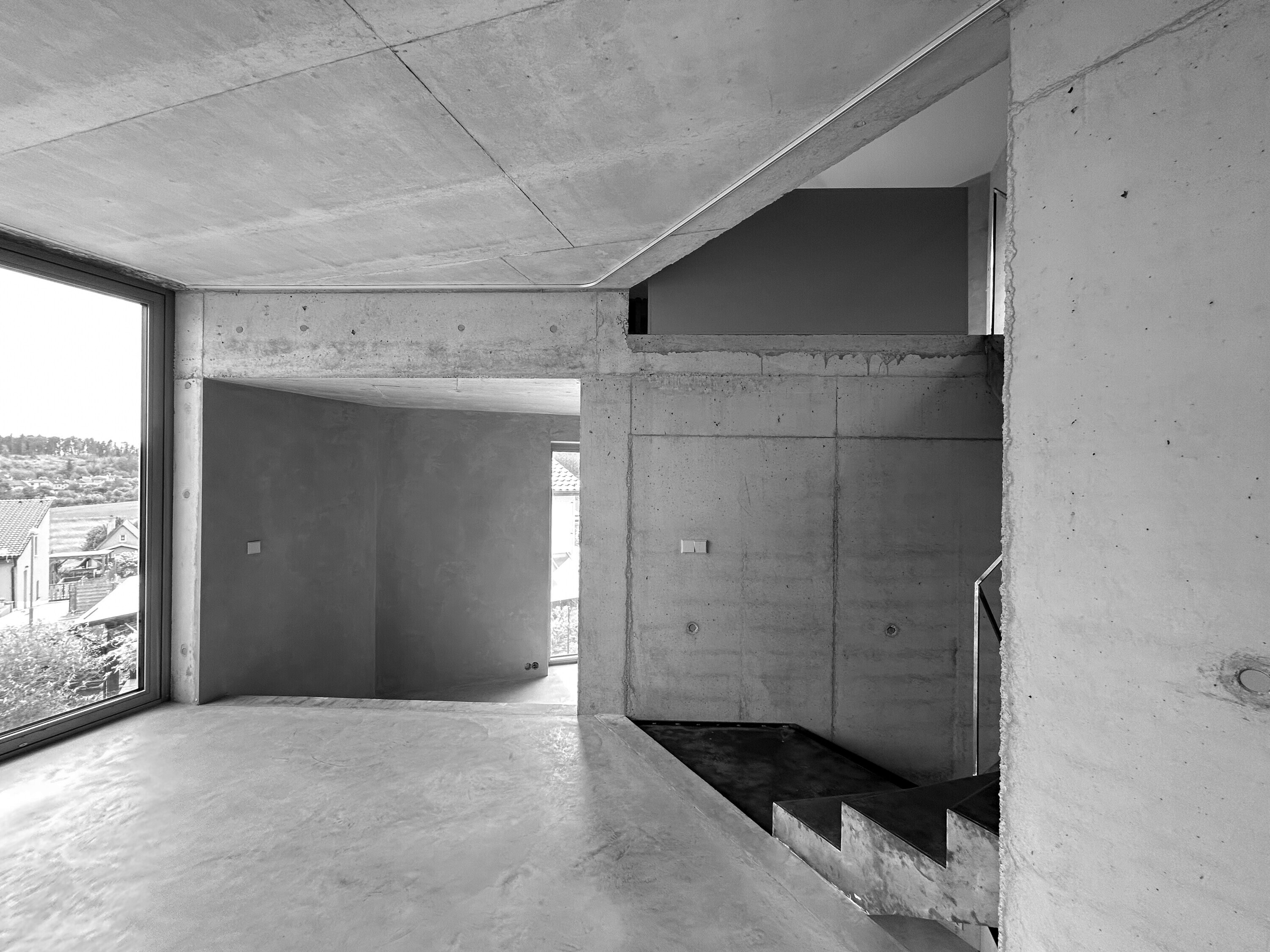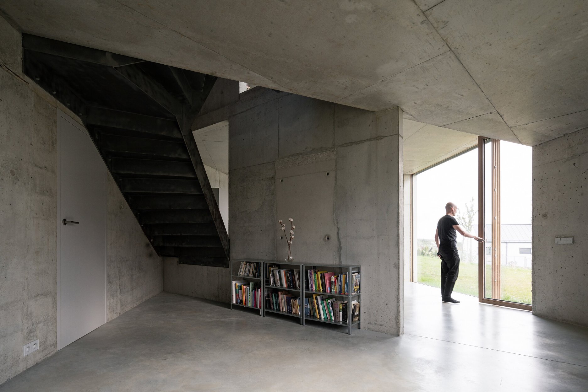 Odhalené betónové steny a konštrukčné prvky nie sú len funkčnými nosnými prvkami, ale tvoria tiež dominantný estetický prvok. Surové povrchy v kombinácii s premenlivým denným svetlom vytvárajú dynamickú hru tieňov, ktorá dodáva interiéru hĺbku a živý charakter. “Domníváme se, že beton v kombinaci s velkými okny a kvalitním prostorem působí jako příjemný, pobytový a útulný. Podoba interiéru byl proces a do jisté míry experiment, kdy se finální podoba ladila souběžně se stavbou - hrubá stavba hodně napověděla, jak by měly interiéry nakonec vypadat. Naštěstí se nám tak i díky trpělivosti klientů podařilo ještě více akcentovat prostorově – materiálové řešení hrubé stavby ve finální podobě interiéru,” dopĺňajú autori.
