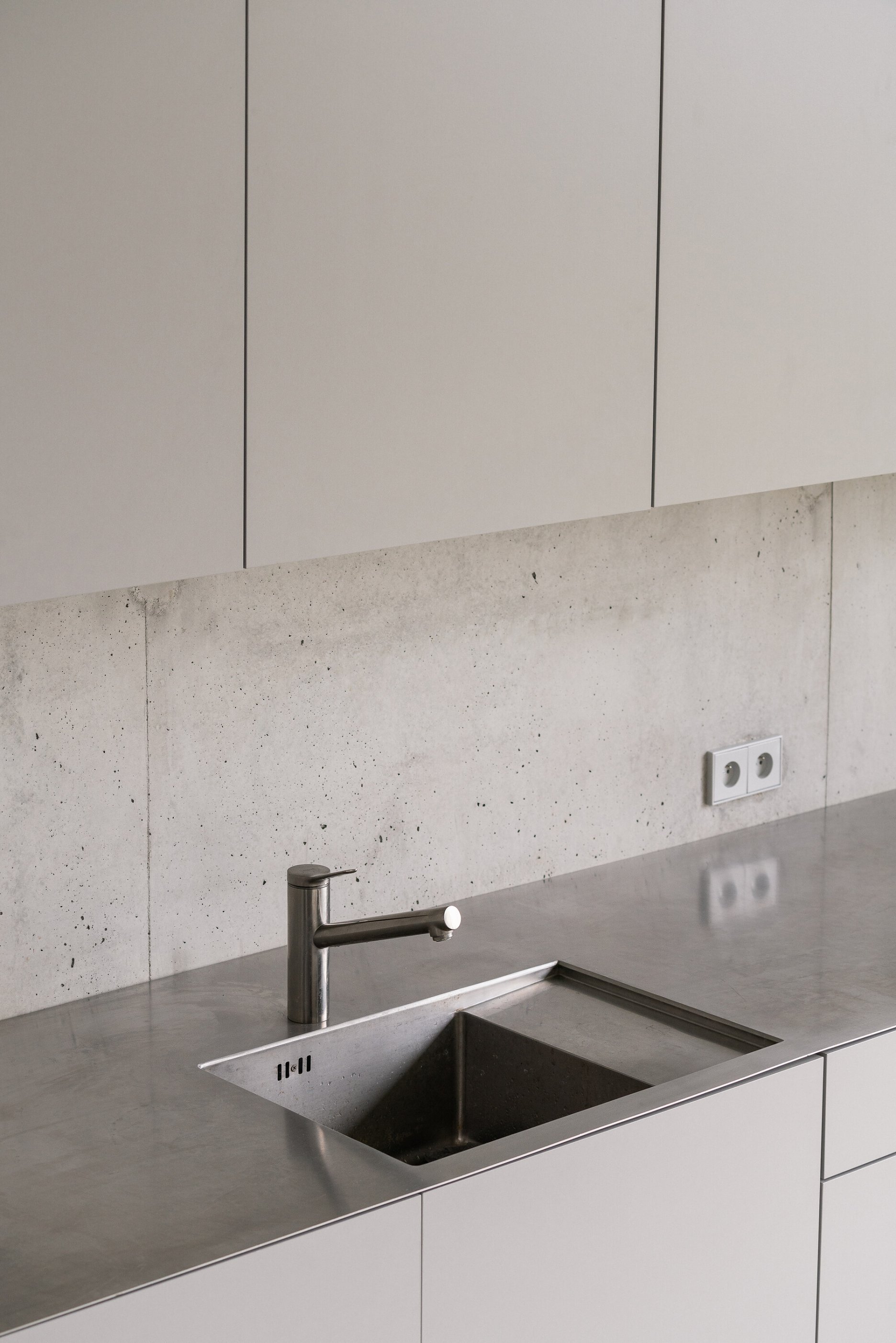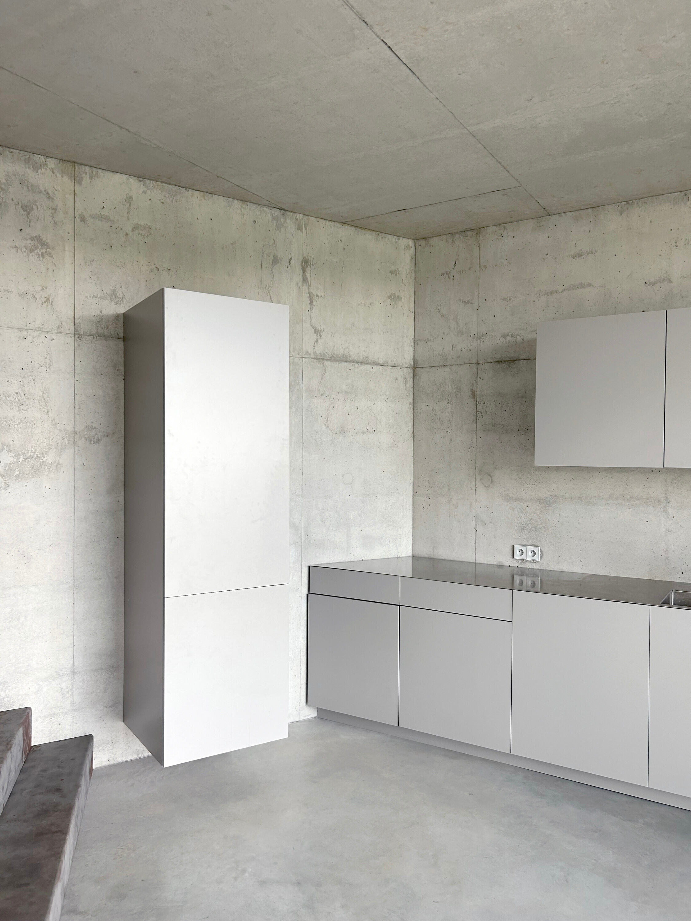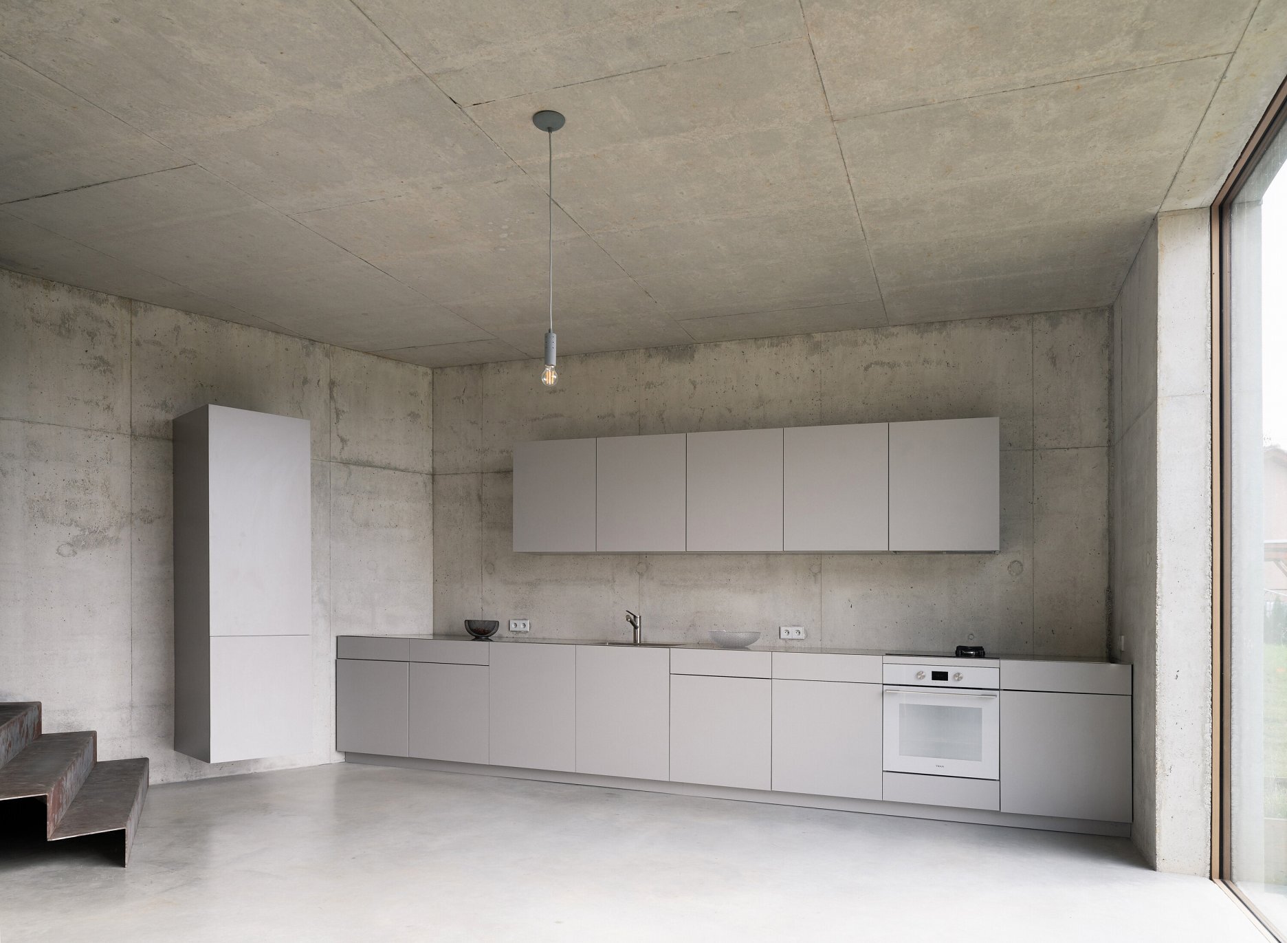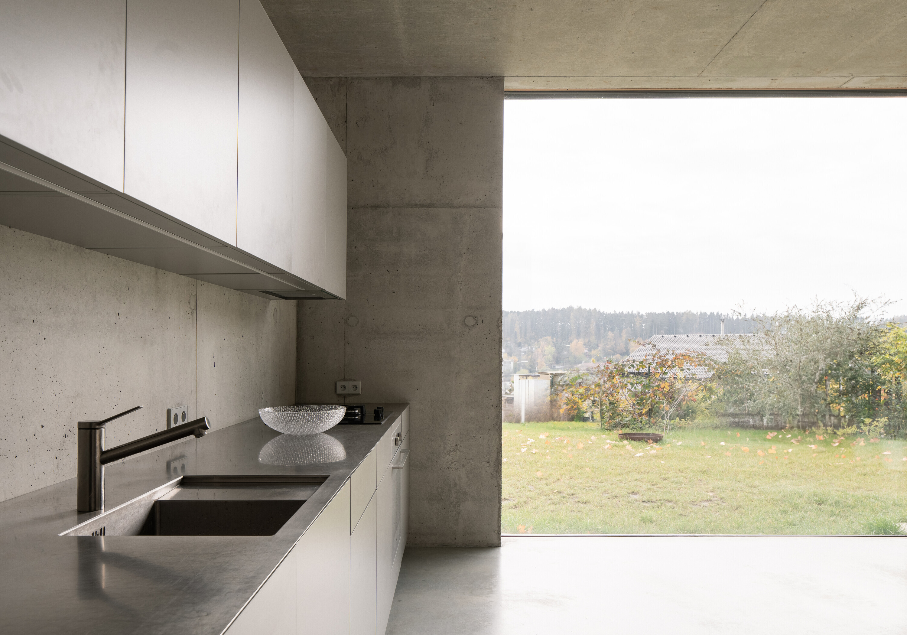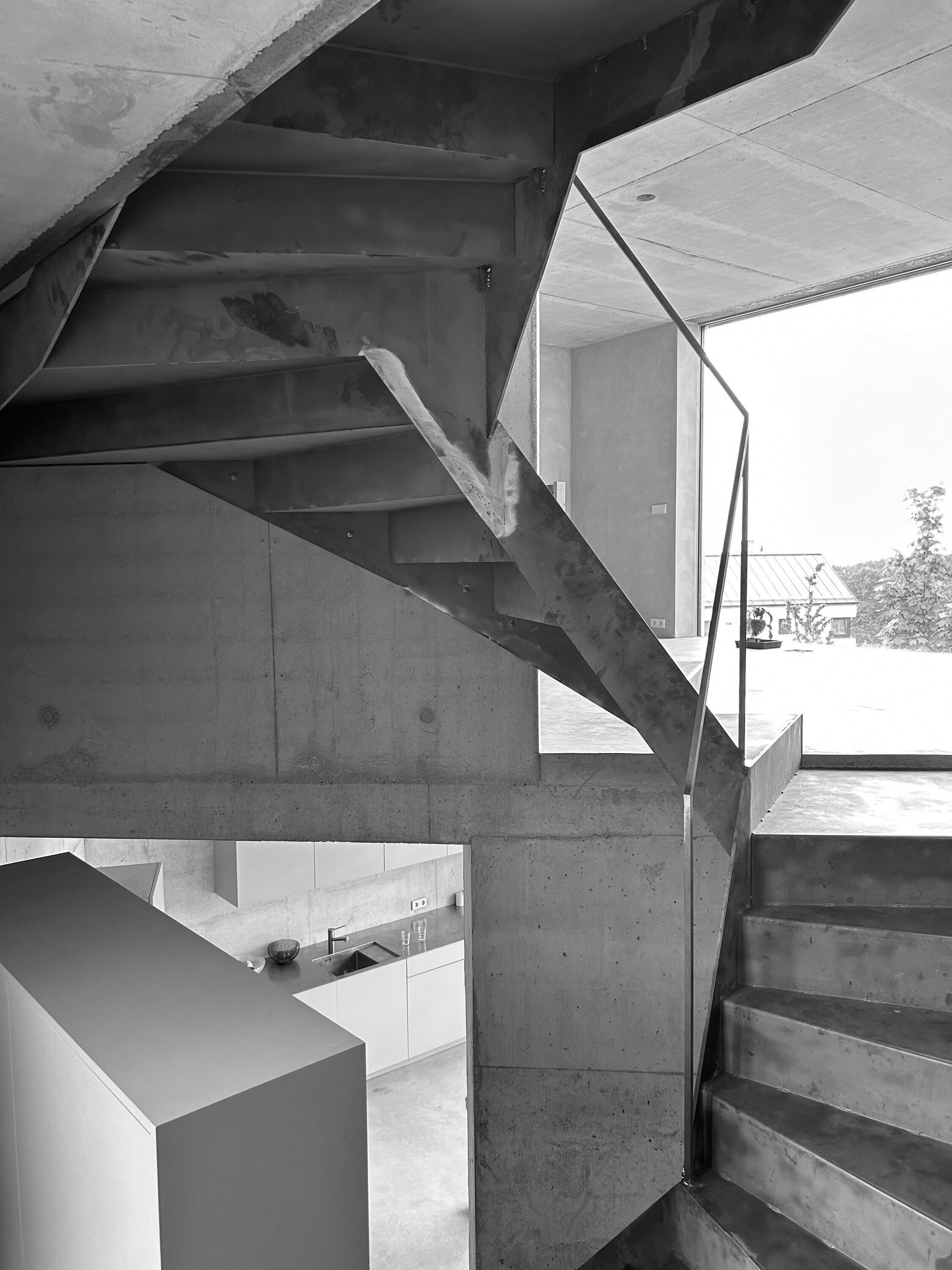 Odhalené betónové steny a konštrukčné prvky nie sú len funkčnými nosnými prvkami, ale tvoria tiež dominantný estetický prvok. Surové povrchy v kombinácii s premenlivým denným svetlom vytvárajú dynamickú hru tieňov, ktorá dodáva interiéru hĺbku a živý charakter. “Domníváme se, že beton v kombinaci s velkými okny a kvalitním prostorem působí jako příjemný, pobytový a útulný. Podoba interiéru byl proces a do jisté míry experiment, kdy se finální podoba ladila souběžně se stavbou - hrubá stavba hodně napověděla, jak by měly interiéry nakonec vypadat. Naštěstí se nám tak i díky trpělivosti klientů podařilo ještě více akcentovat prostorově – materiálové řešení hrubé stavby ve finální podobě interiéru,” dopĺňajú autori.