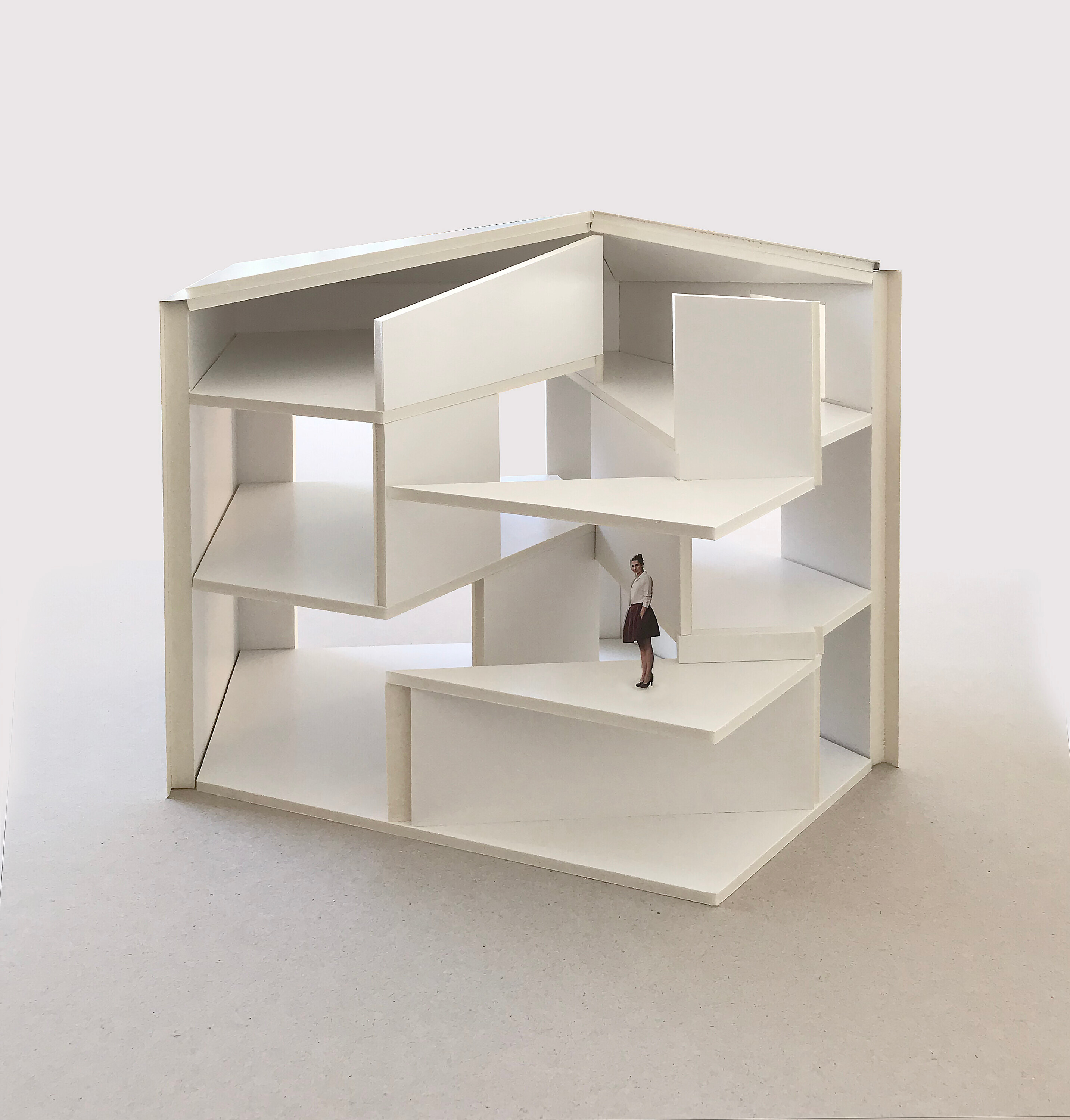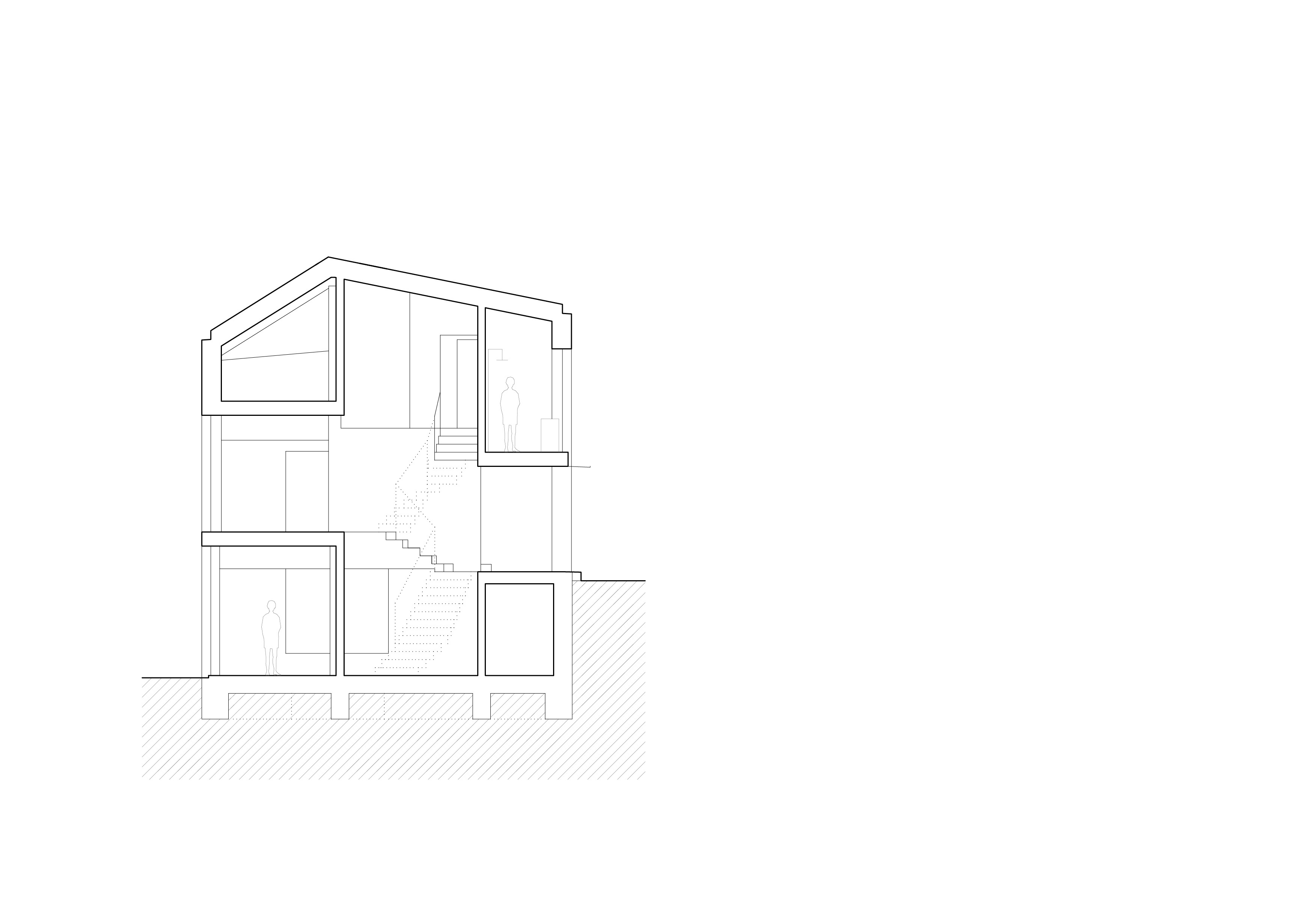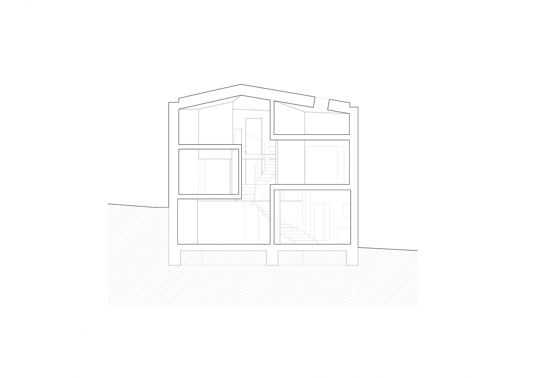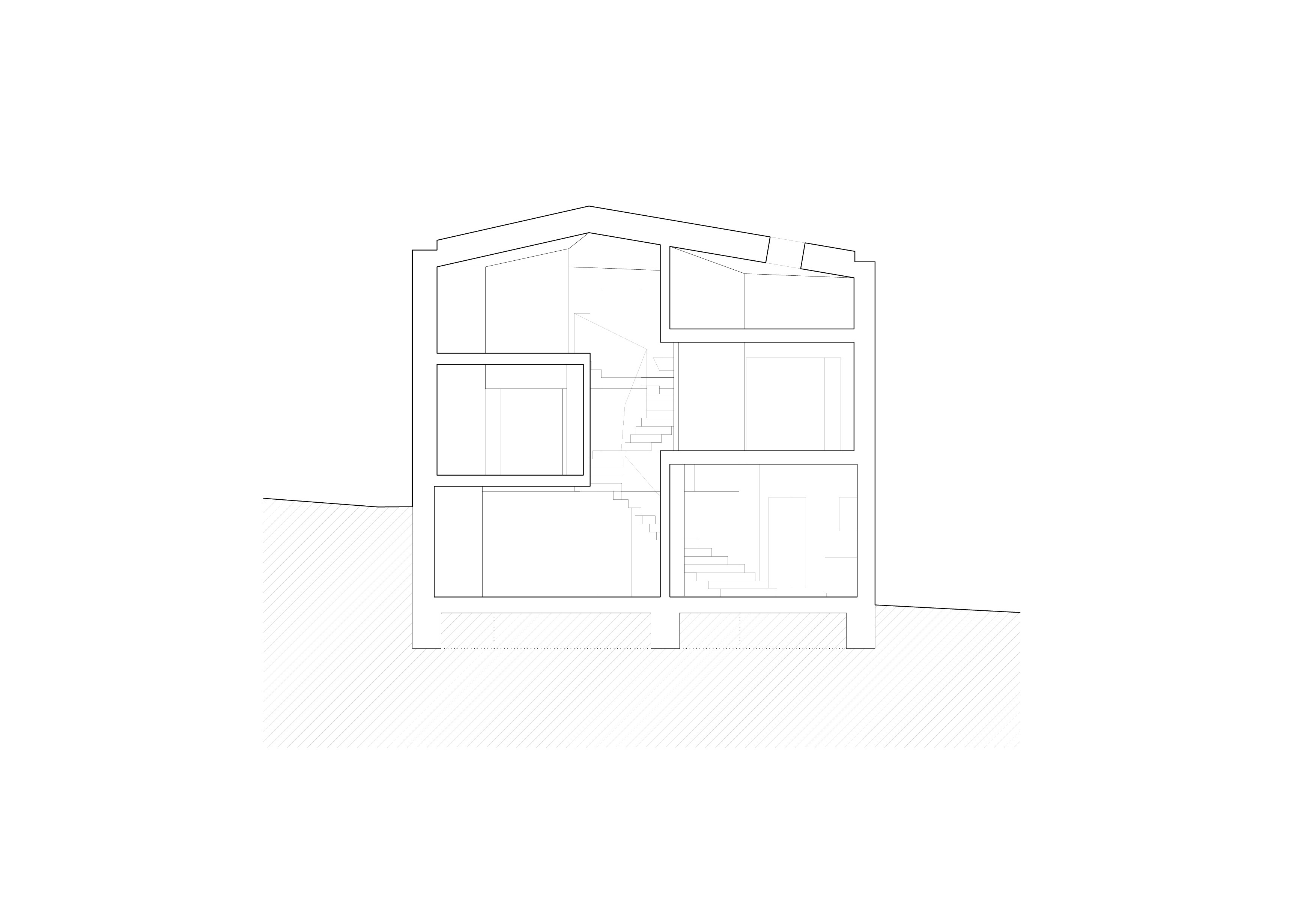 Dom je rozčlenený na sedem výškových úrovní. Prízemie zastrešuje spoločenský priestor, ktorý zahŕňa kuchyňu, jedáleň a obývaciu izbu, kde sa rodina stretáva a trávi väčšinu spoločného času. Na druhej úrovni sa nachádza hlavný vstup do domu. Detské izby sú situované na tretej a štvrtej úrovni. Na piatej úrovni sa nachádza kúpeľňa, na šiestej pracovňa a na najvyššej - siedmej úrovni - je situovaná hlavná spálňa rodičov s maximálnym súkromím a výhľadmi do krajiny. Všetky miestnosti sú prepojené centrálnym kvázi-vretenovým schodiskom s trojuholníkovým pôdorysom. Miestnosti postupne stúpajú vo vzťahu k morfológii terénu, architektonickému zámeru prepojenia priestorov domu a umiestneniu miestností podľa ich funkcie a orientácie voči svetovým stranám. Schodisko nahrádza chodby, ktoré v dome absentujú.