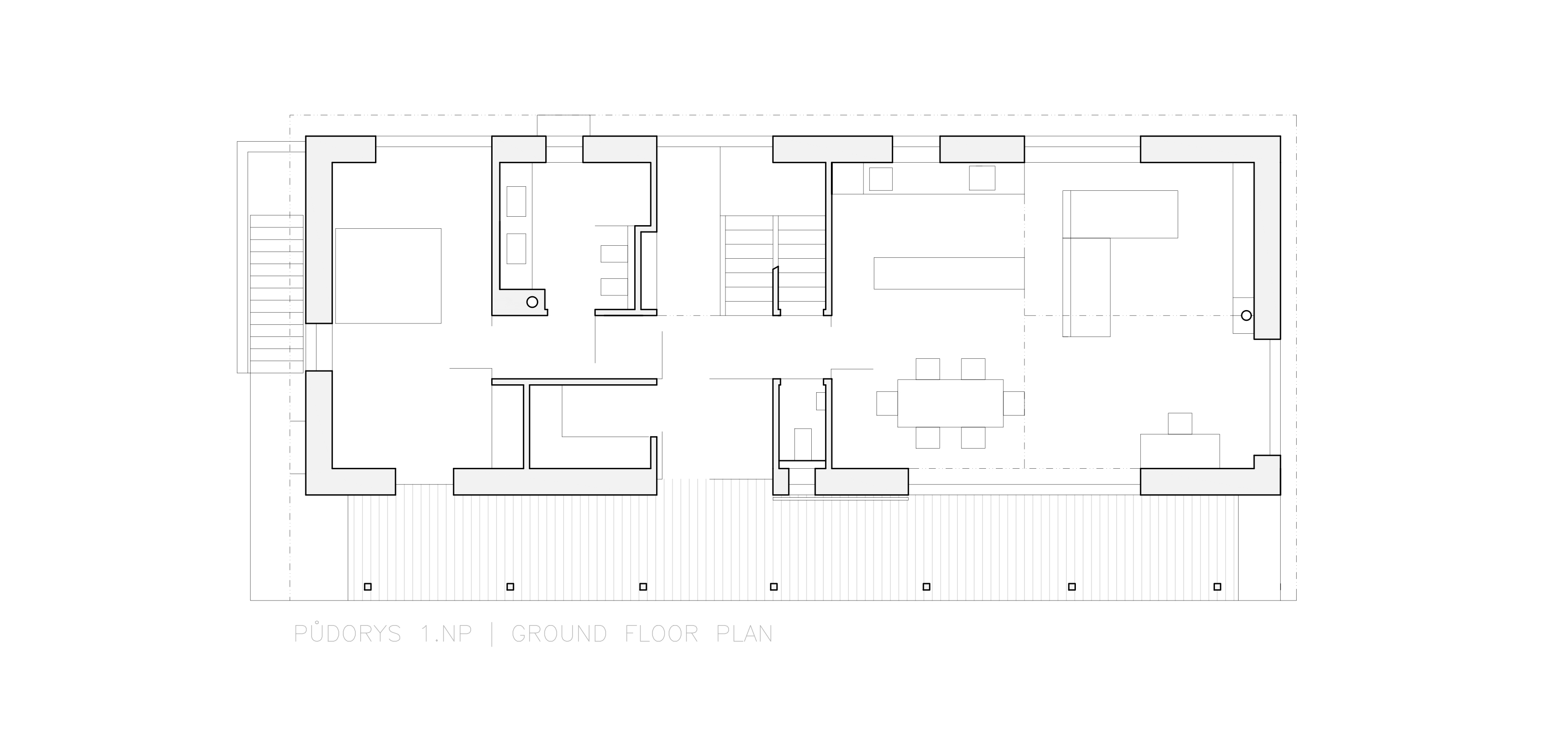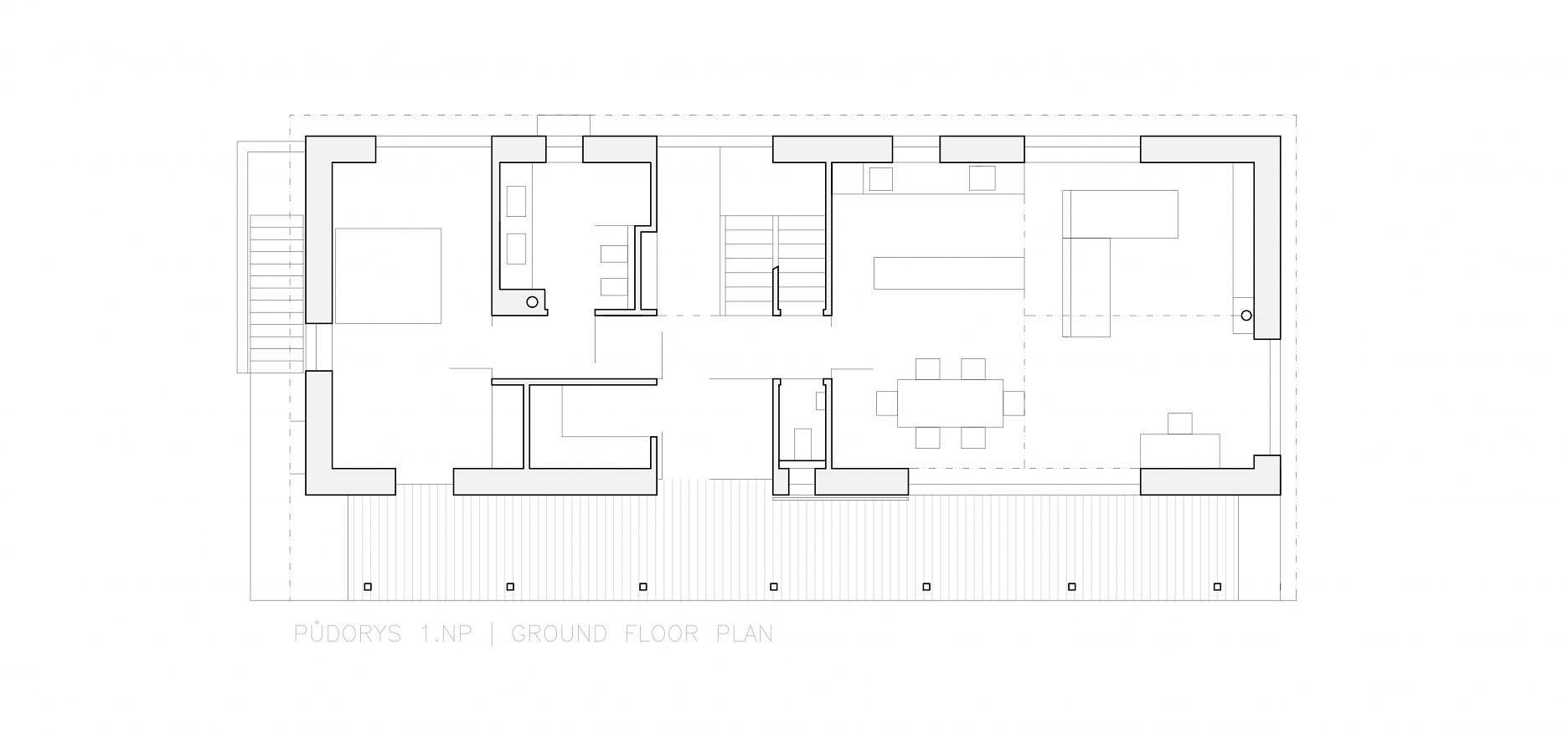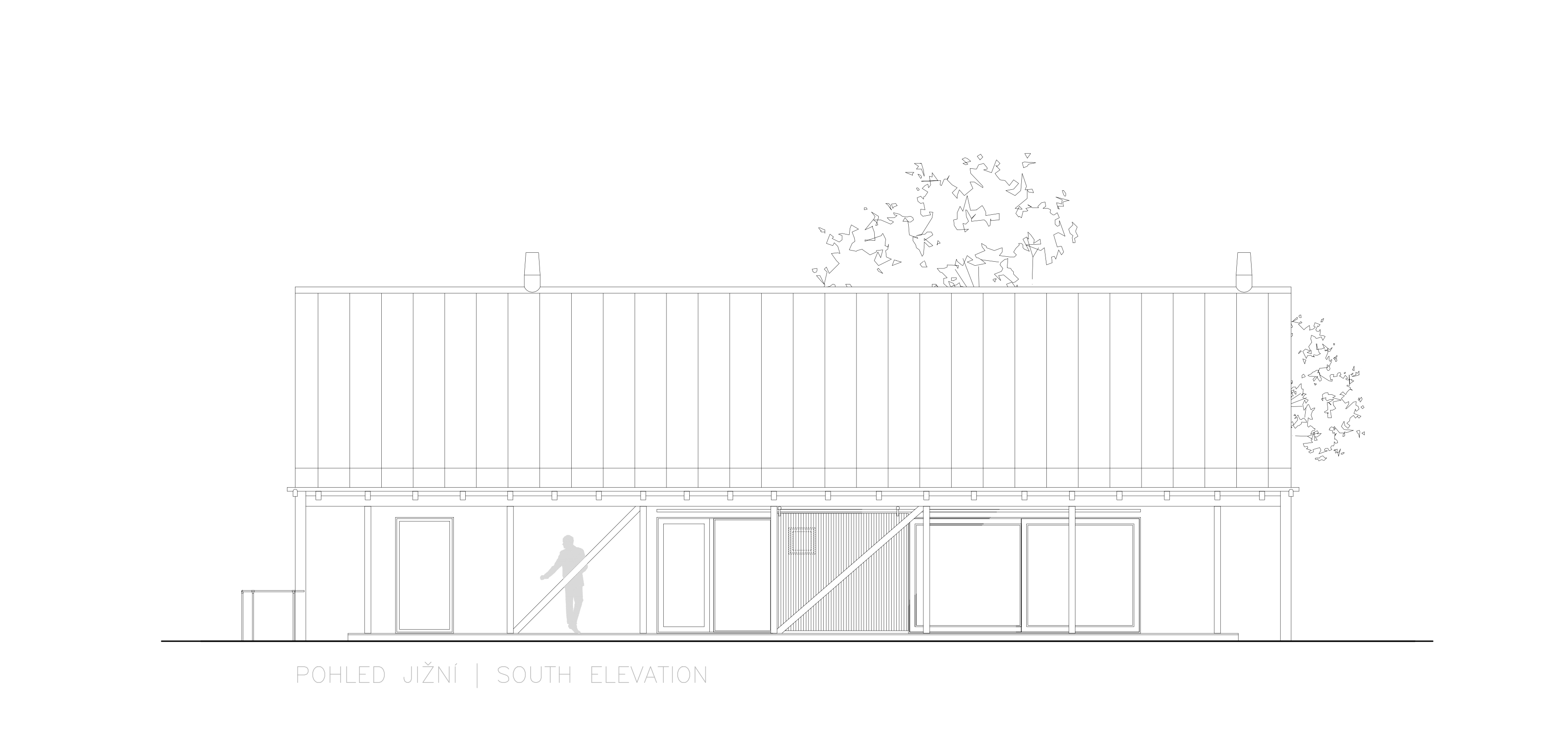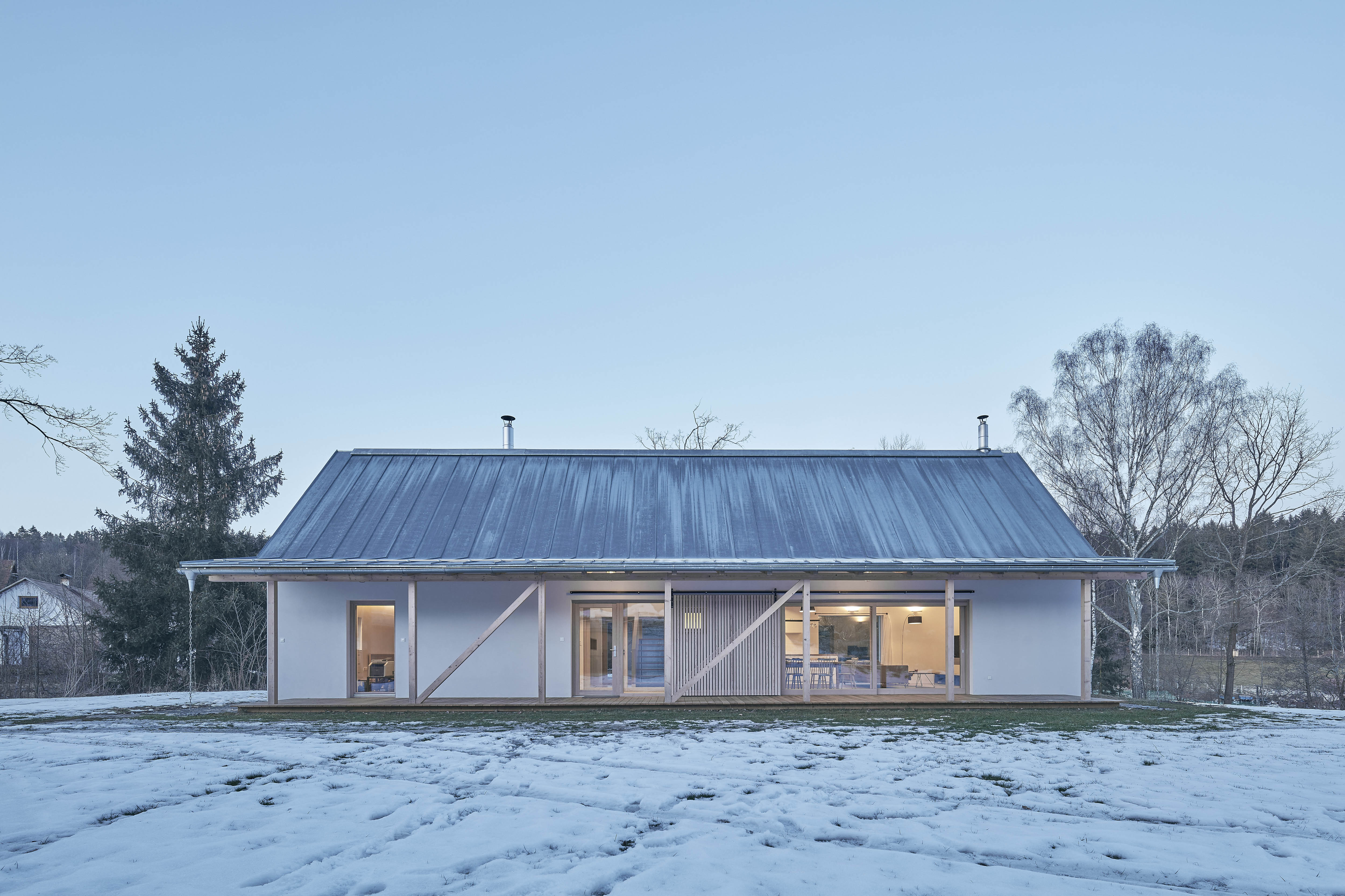 Jednoduchý murovaný dom má pozdĺž juhozápadnej fasády kryté priedomie. Presah strechy chráni vstup situovaný približne v strede dispozície. Presklený vstupný trakt, s priehľadom na rybník, rozdeľuje prízemie na dennú a nočnú časť. Hlavný obytný priestor s kuchyňou je čiastočne otvorený do krovu. Dominantným prvkom v obývačke je rozmerný krb. Veľkými nedelenými oknami "vstupujú" do interiéru výseky okolitej krajiny.