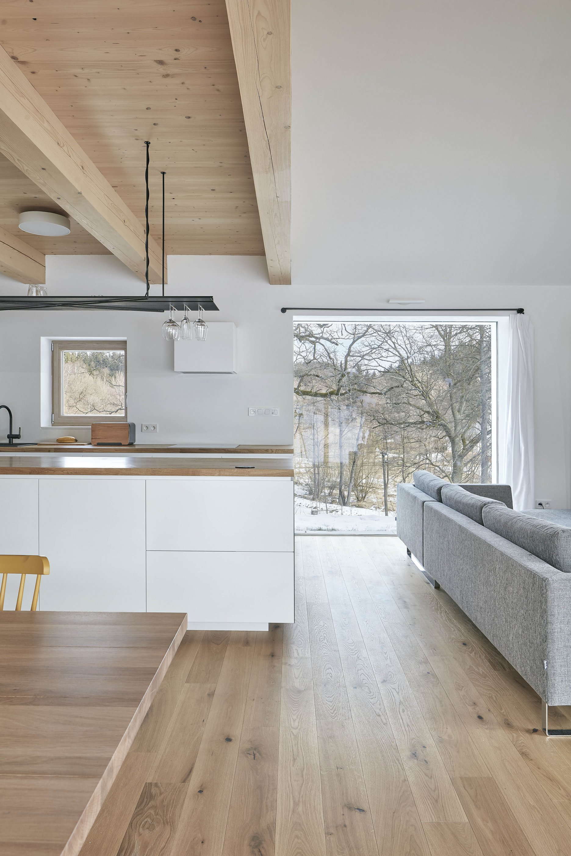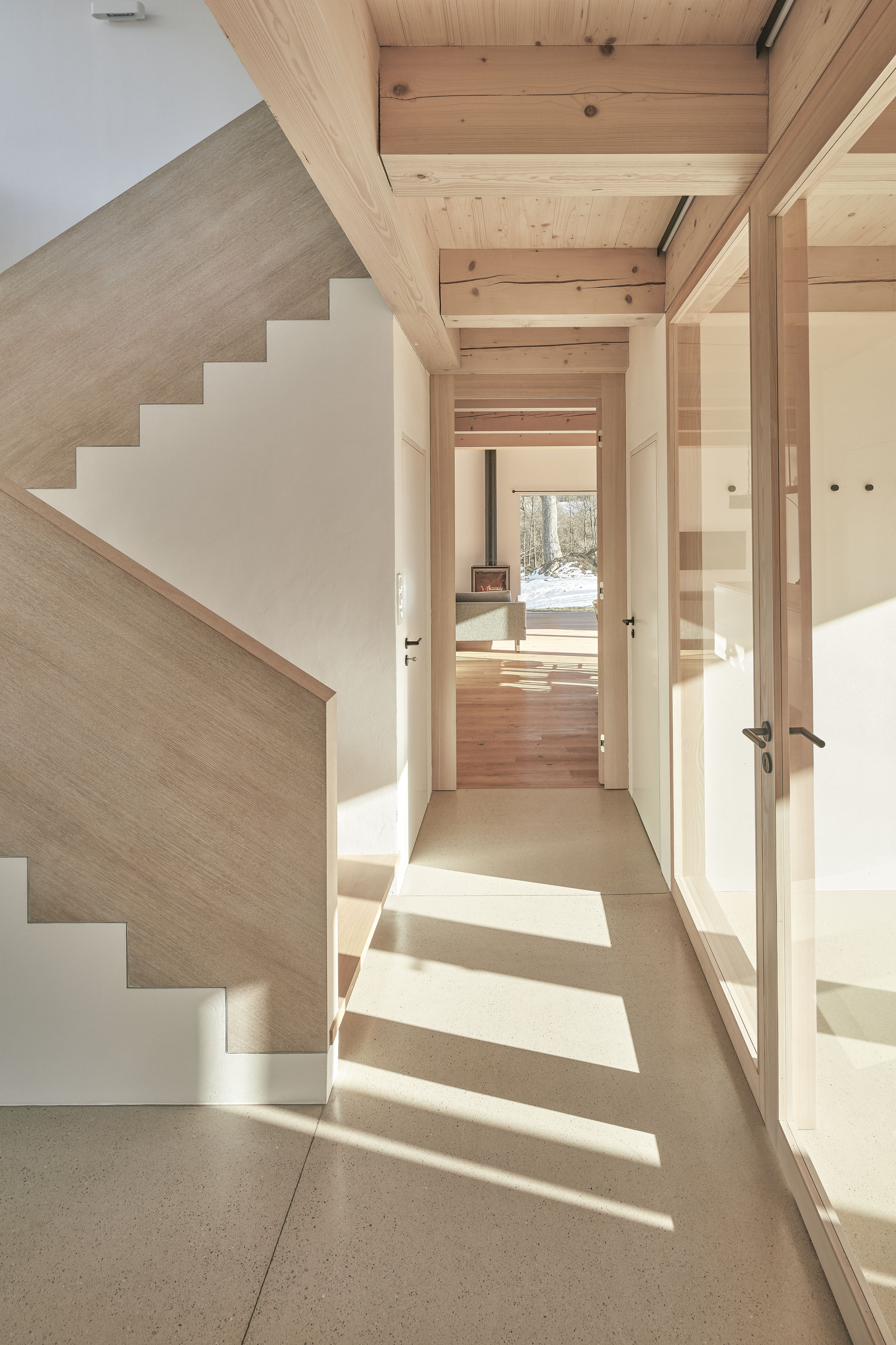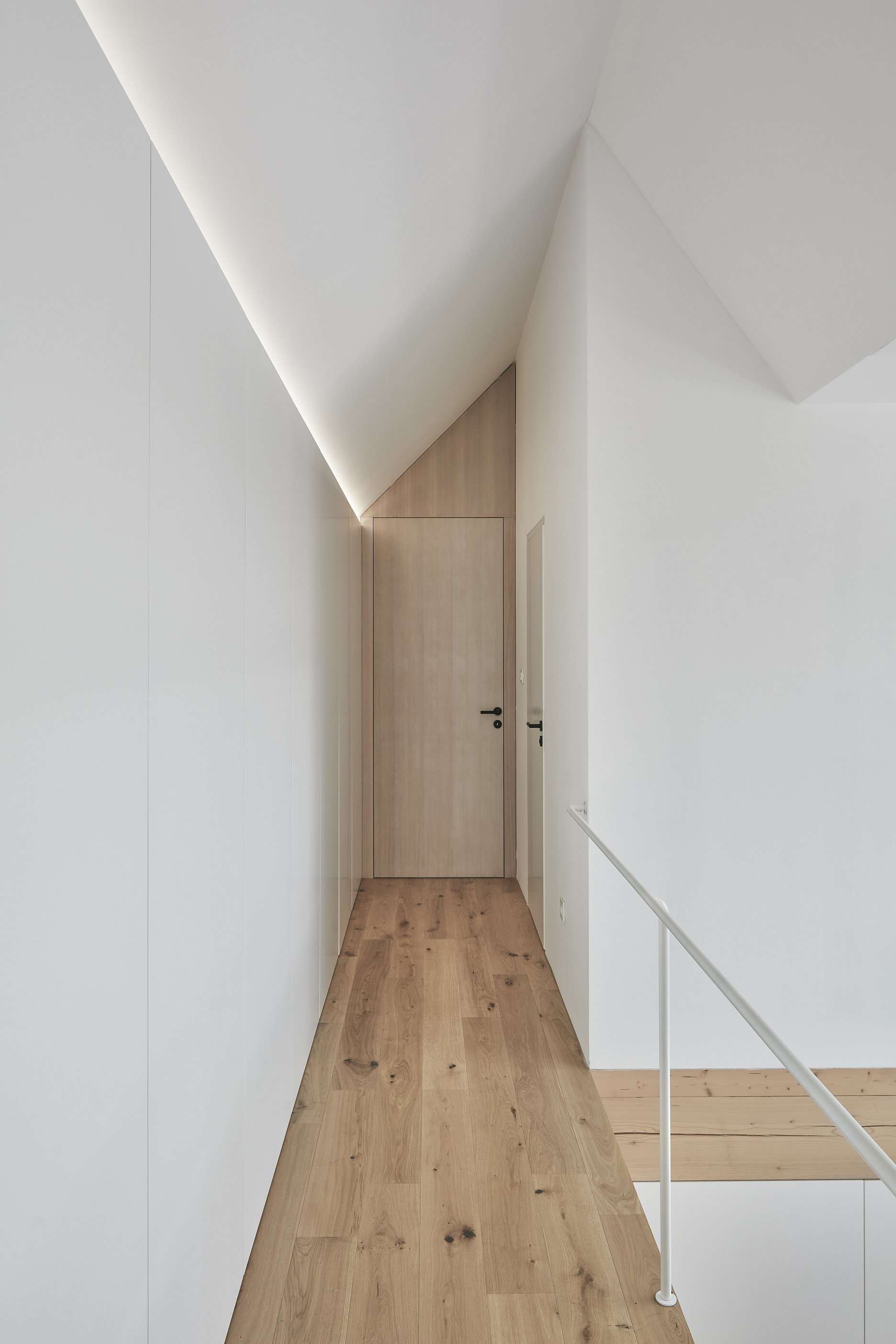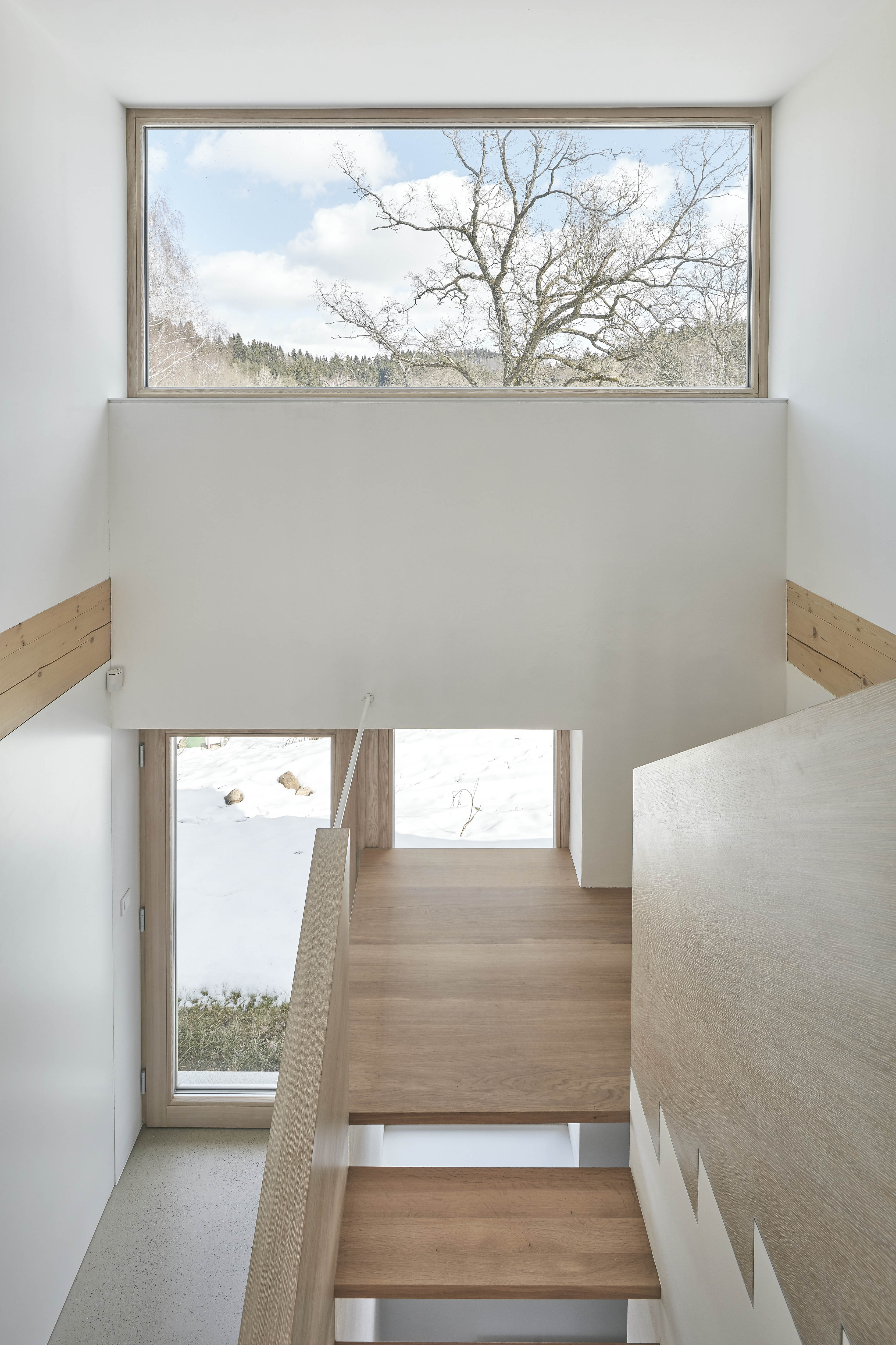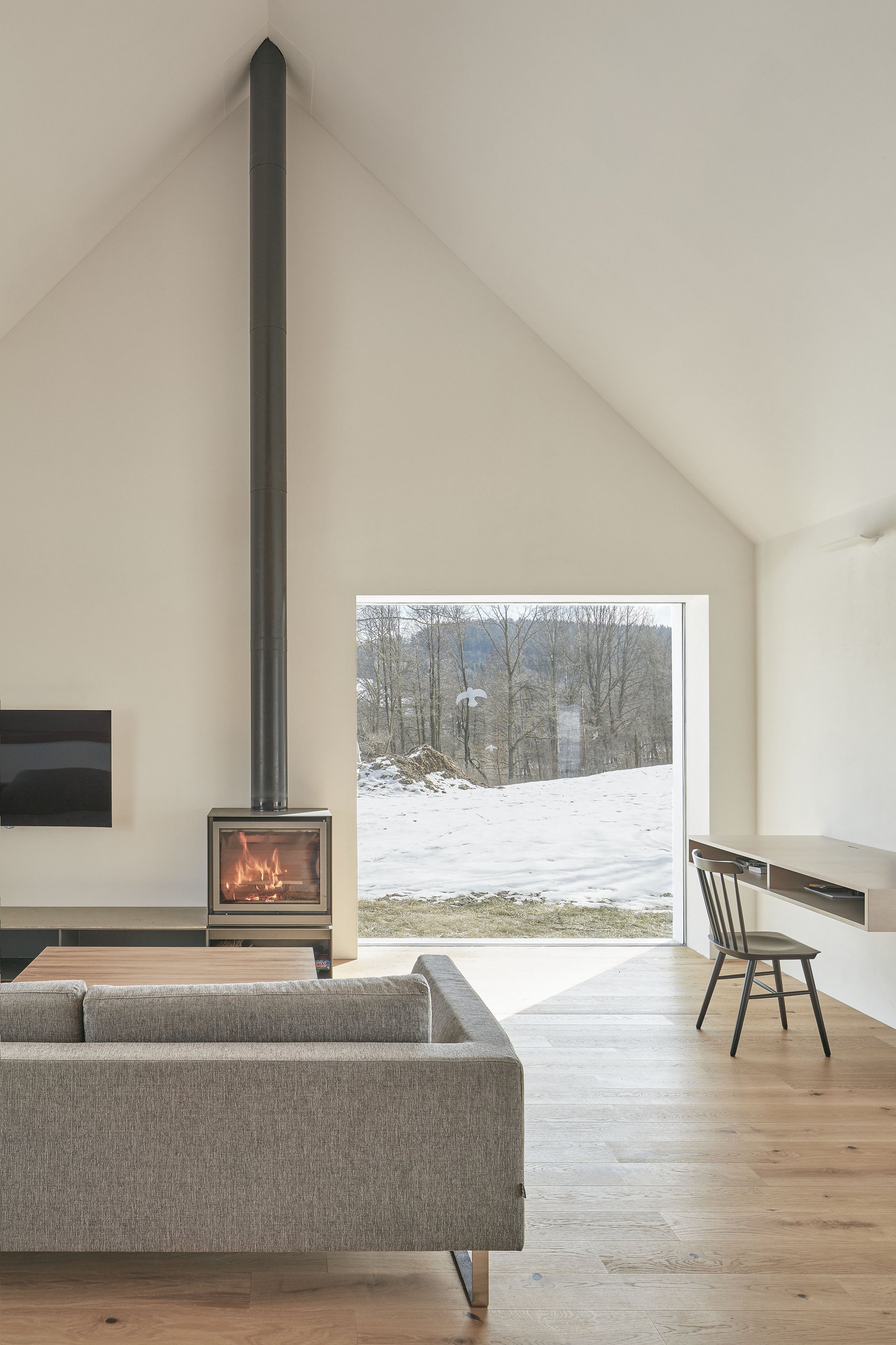 Zariadenie na mieru realizoval príbuzný majiteľa. V interiéri, takisto ako v exteriéri, architekti kombinujú biele omietky so smrekovcovým a dubovým drevom. "Vizuální klid nekonkuruje krajině," vysvetľujú.