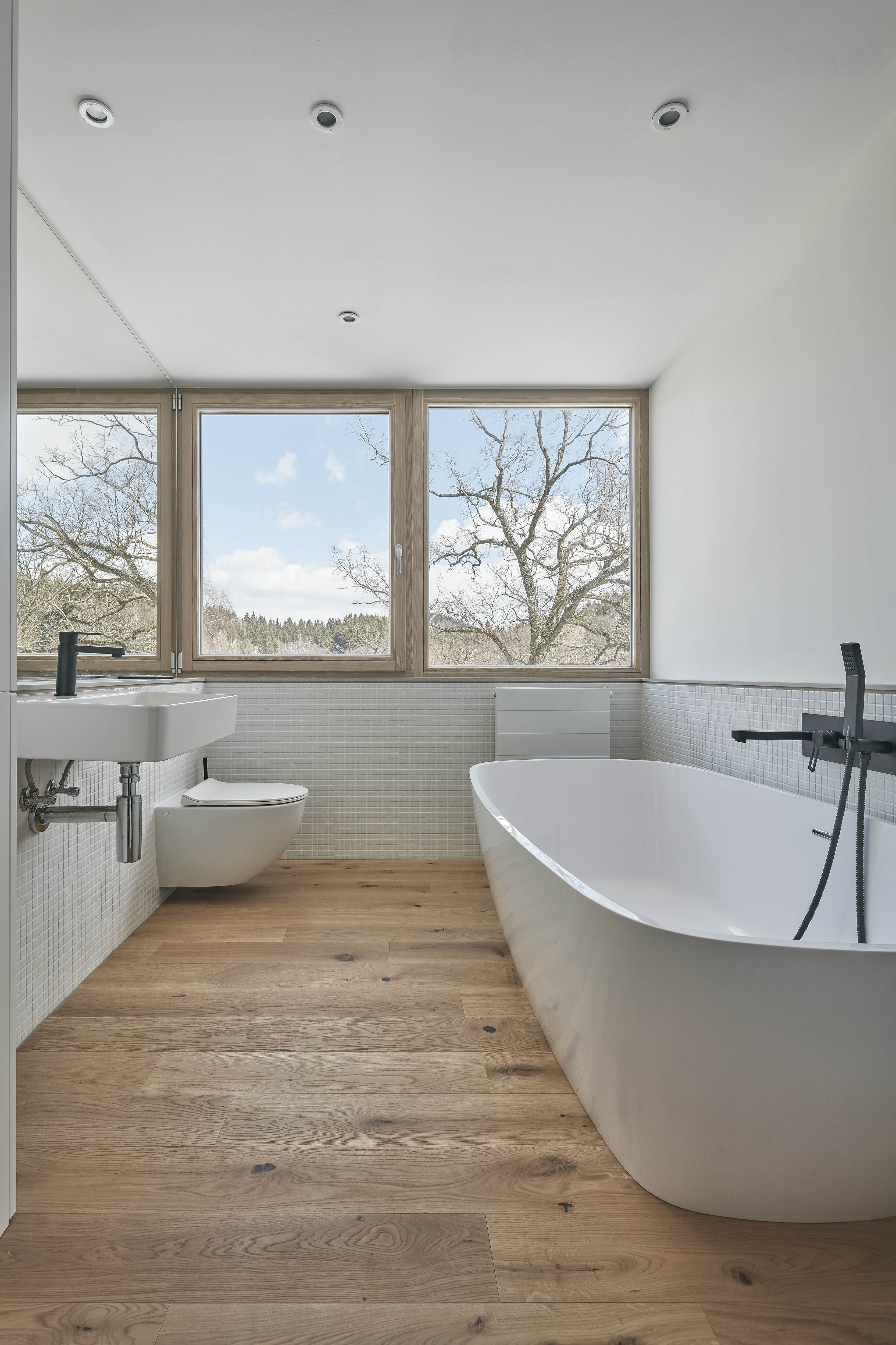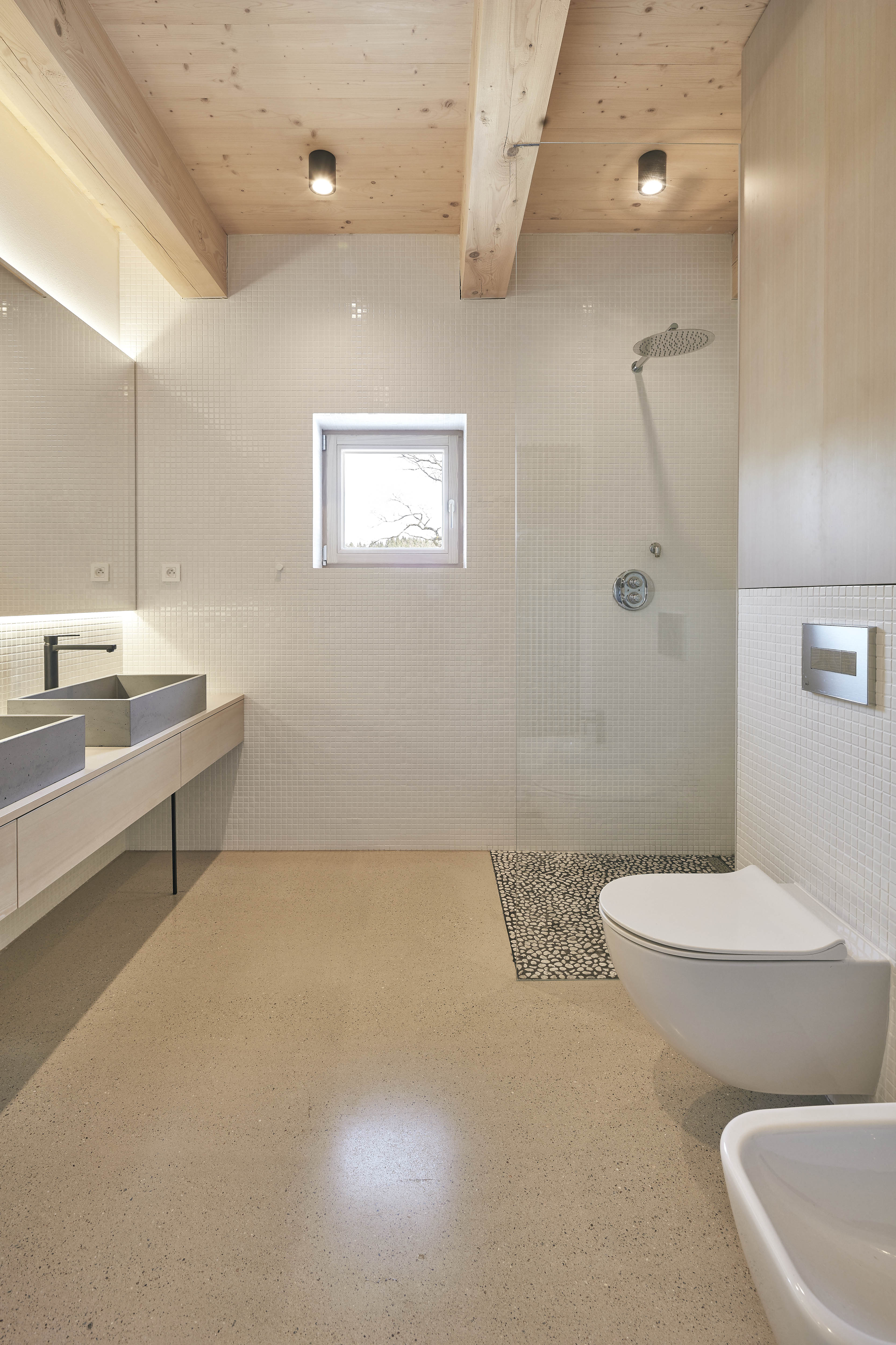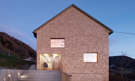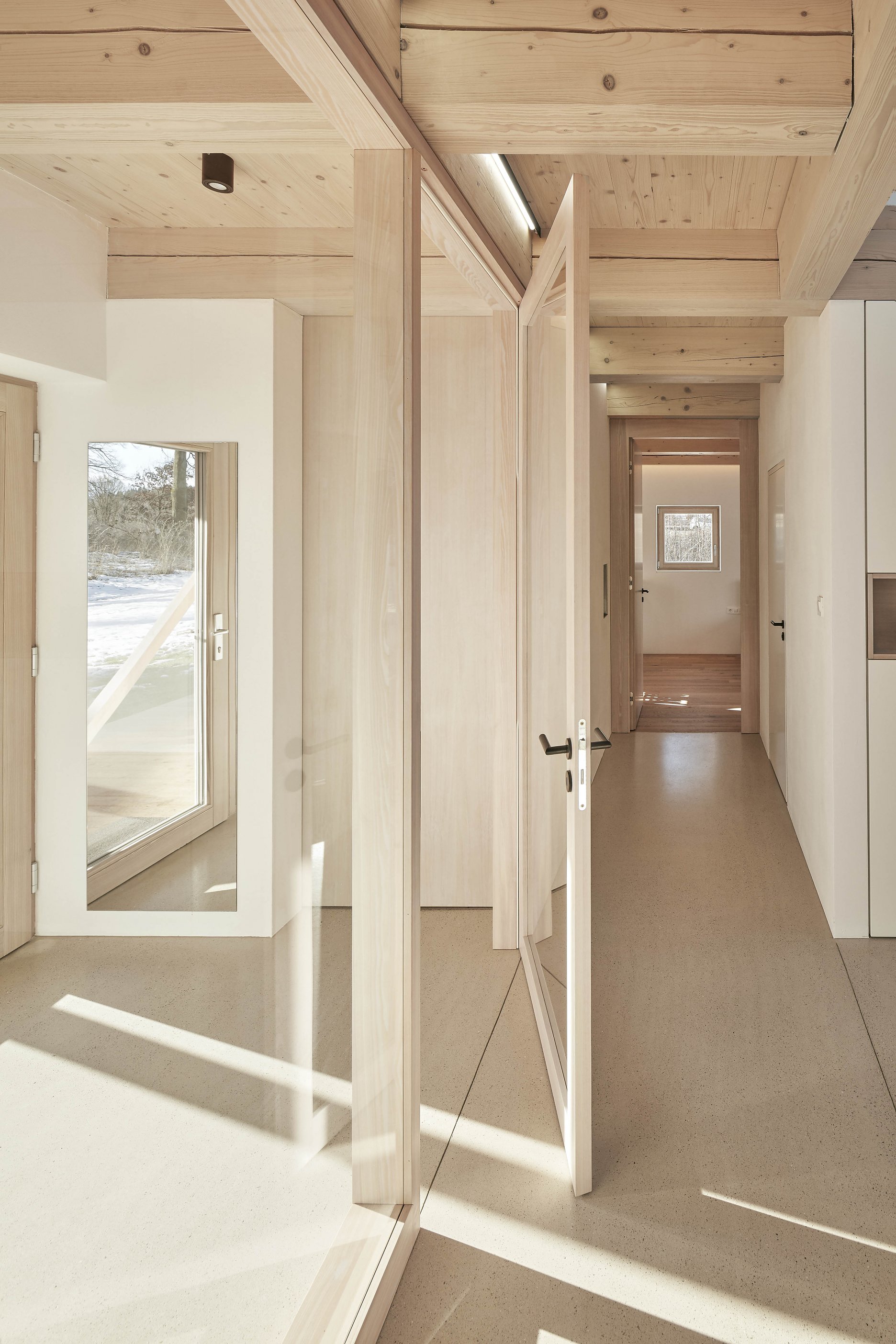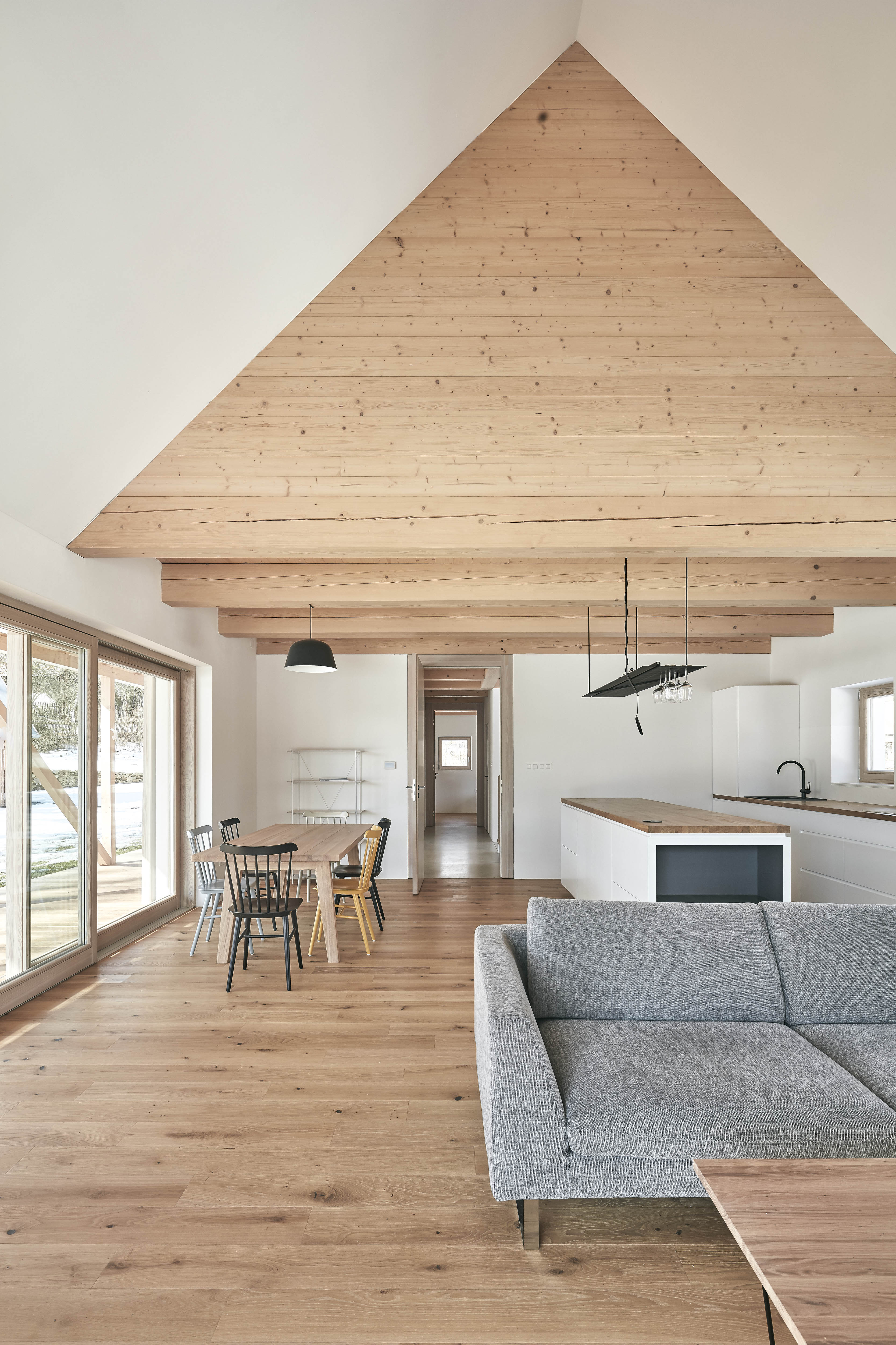 Zariadenie na mieru realizoval príbuzný majiteľa. V interiéri, takisto ako v exteriéri, architekti kombinujú biele omietky so smrekovcovým a dubovým drevom. "Vizuální klid nekonkuruje krajině," vysvetľujú.