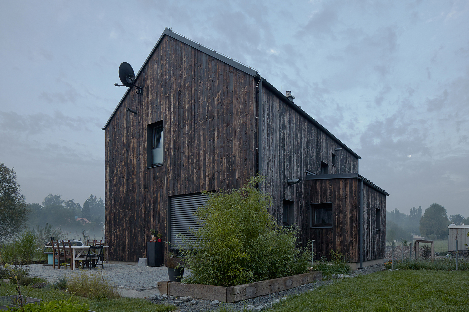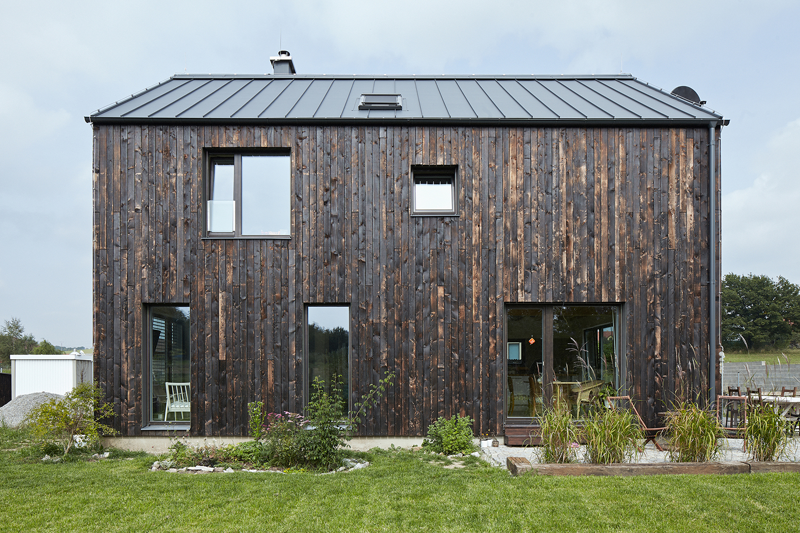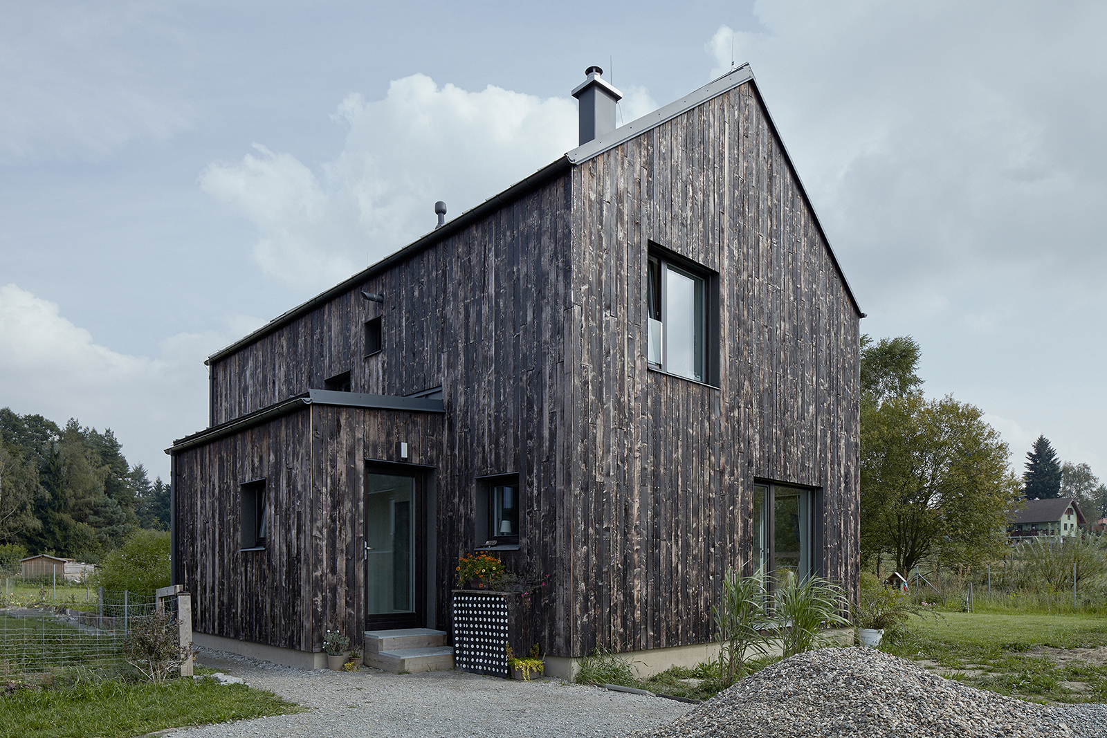 Najvýraznejším prvkom inak tvarovo jednoduchého a čistého domu je fasáda z opaľovaného dreva. "Tento dům měl po celou dobu vzniku svůj pracovní název. Jakmile však dostal fasádu, která je obvyklejší dál na východ, nikdo v okolí mu neřekne jinak než Uhlík.", hovoria architekti. Opálenie zvýrazňuje nielen kresbu dreva, ale v konečnom dôsledku je táto povrchová úprava tiež trvácnejšia a ekologickejšia ak štandardné chemické, alebo olejové úpravy. Chráni fasádu proti ohňu, škodcom i hnilobe. Opaľovanie je veľmi stará metóda úpravy dreva, ktorá však bola u nás v poslednej dobe takmer zabudnutá. Naopak v Japonsku je táto technika obľúbená dodnes, lebo šetrí čas a je tiež šetrnejšia k životnému prostrediu. Vďaka kontrolovanému opáleniu vzniká uhoľný povrch, ktorý drevo zakonzervuje a tak ho prirodzene chráni. Odpadá teda chemická ochrana dreva a každoročné pravidelné natieranie. Podľa tejto tradičnej metódy sa tri dosky spoja do trojuholníkovej rúrky, tak aby medzi nimi vznikol dutý otvor, do ktorého sa vloží zapálený papier, vznikne tak 3 až 4 mm hrubá zuhoľnatená vrstva, ktorá údajne vydrží okolo 40 rokov bez ošetrenia. Ako čisto organický materiál je možné dosky na konci životnosti domu opäť znovu začleniť do prirodzeného kolobehu.