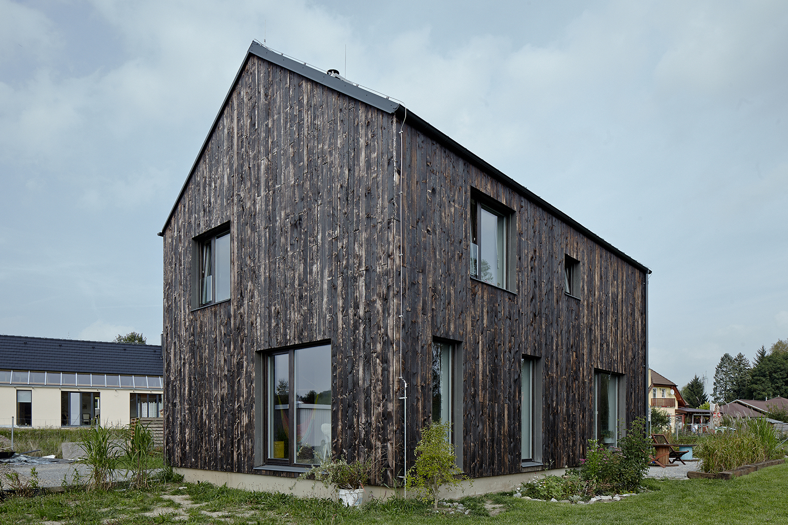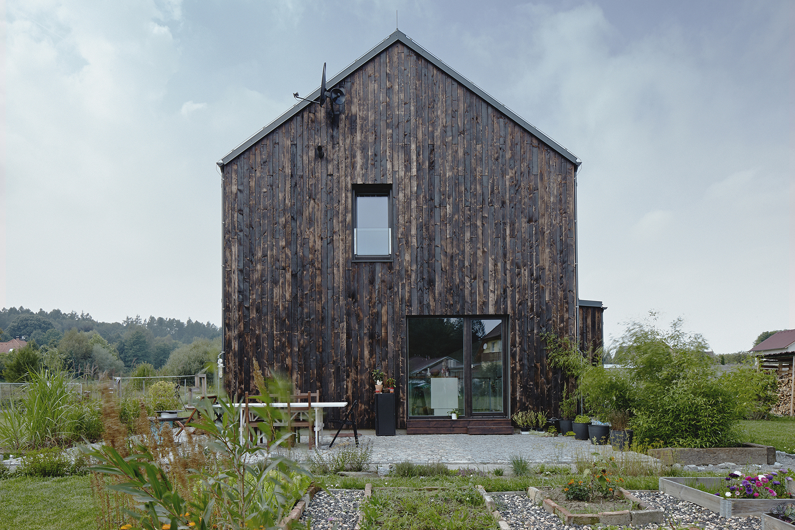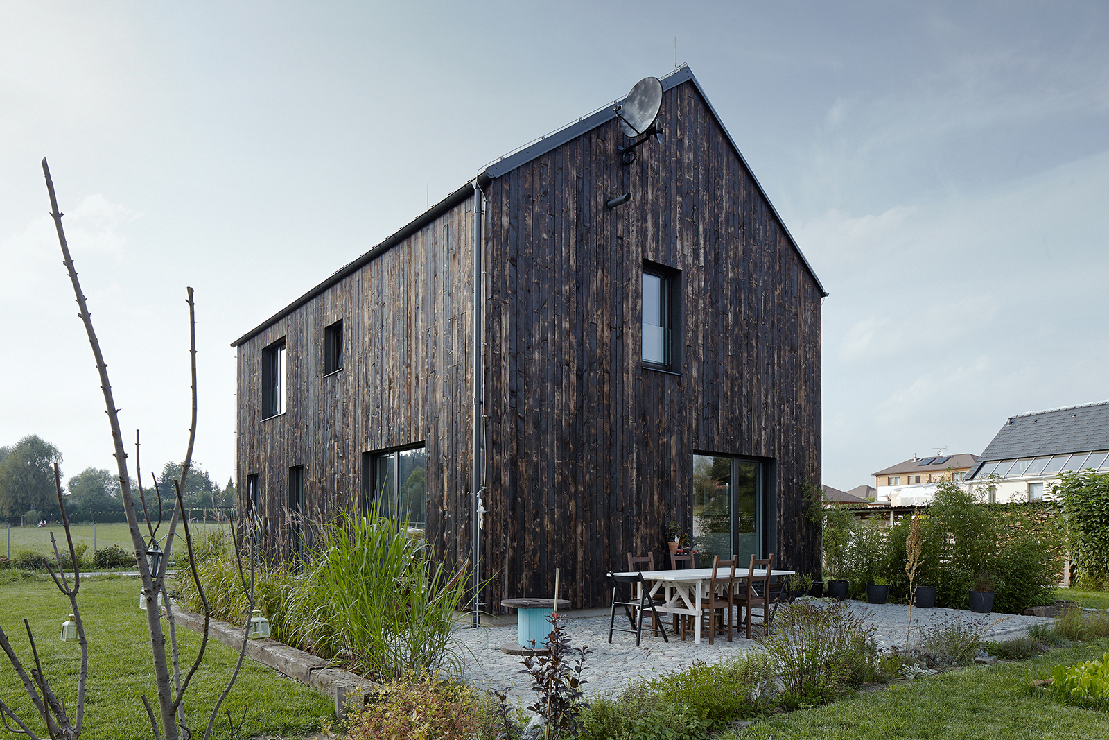 Najvýraznejším prvkom inak tvarovo jednoduchého a čistého domu je fasáda z opaľovaného dreva. "Tento dům měl po celou dobu vzniku svůj pracovní název. Jakmile však dostal fasádu, která je obvyklejší dál na východ, nikdo v okolí mu neřekne jinak než Uhlík.", hovoria architekti. Opálenie zvýrazňuje nielen kresbu dreva, ale v konečnom dôsledku je táto povrchová úprava tiež trvácnejšia a ekologickejšia ak štandardné chemické, alebo olejové úpravy. Chráni fasádu proti ohňu, škodcom i hnilobe. Opaľovanie je veľmi stará metóda úpravy dreva, ktorá však bola u nás v poslednej dobe takmer zabudnutá. Naopak v Japonsku je táto technika obľúbená dodnes, lebo šetrí čas a je tiež šetrnejšia k životnému prostrediu. Vďaka kontrolovanému opáleniu vzniká uhoľný povrch, ktorý drevo zakonzervuje a tak ho prirodzene chráni. Odpadá teda chemická ochrana dreva a každoročné pravidelné natieranie. Podľa tejto tradičnej metódy sa tri dosky spoja do trojuholníkovej rúrky, tak aby medzi nimi vznikol dutý otvor, do ktorého sa vloží zapálený papier, vznikne tak 3 až 4 mm hrubá zuhoľnatená vrstva, ktorá údajne vydrží okolo 40 rokov bez ošetrenia. Ako čisto organický materiál je možné dosky na konci životnosti domu opäť znovu začleniť do prirodzeného kolobehu.