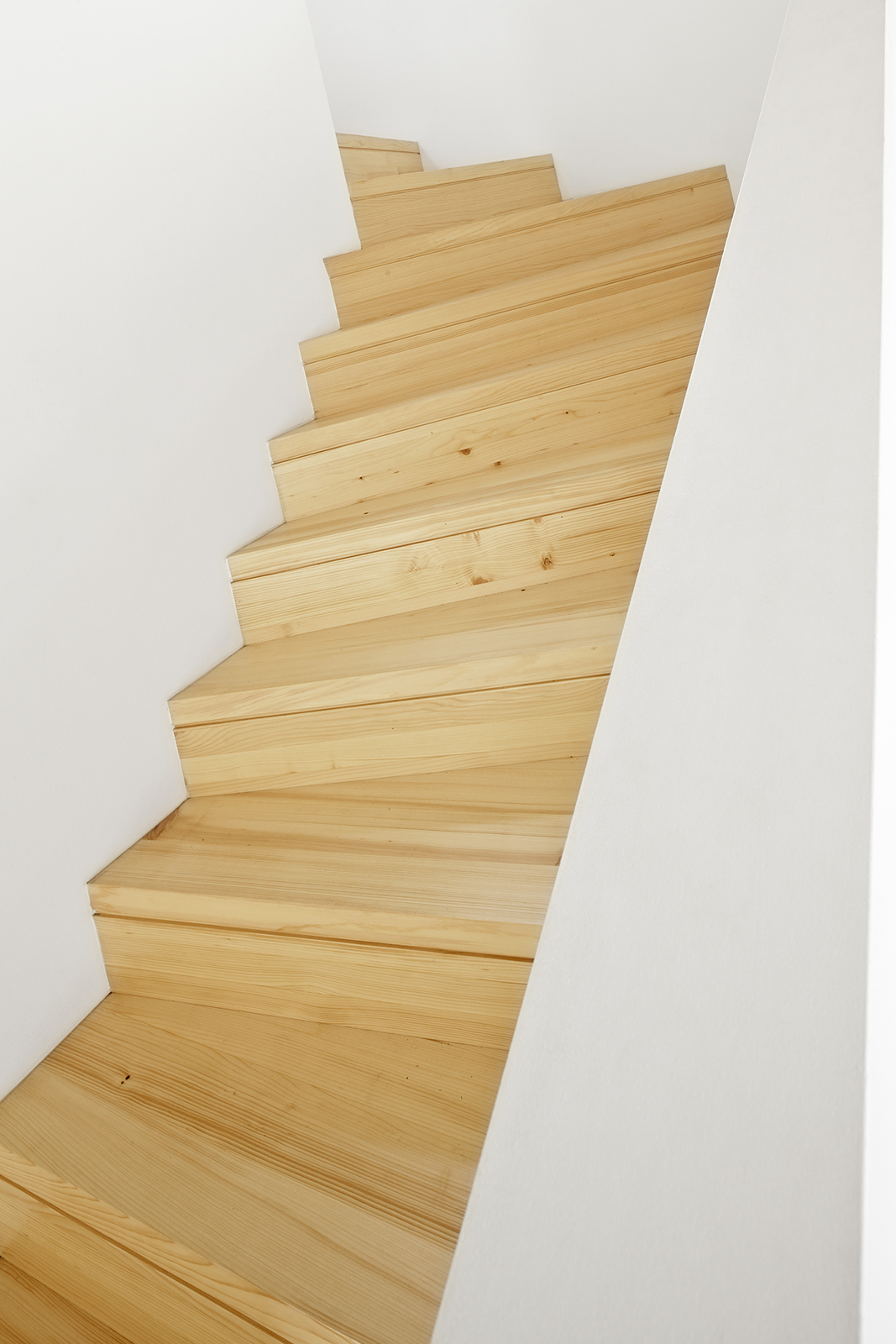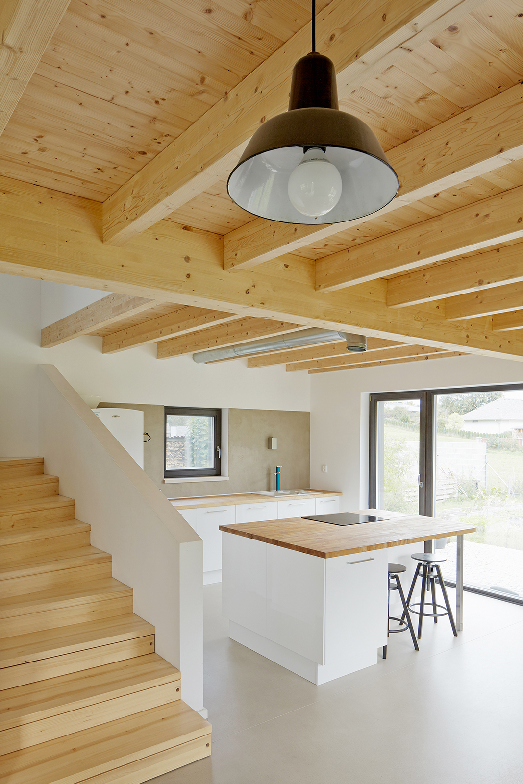 Dispozícia domu sa snaží "objať" vnútorné centrálne schodisko. Toto riešenie tak nielen aby rozčleňuje vnútorné priestory, vytvára zákutia pracovne a kuchyne, ale zároveň ich necháva prepojené. Technické zázemie sa nachádza v časti zádveria, niečo z neho (práčka) sa zmestilo aj pod schody.