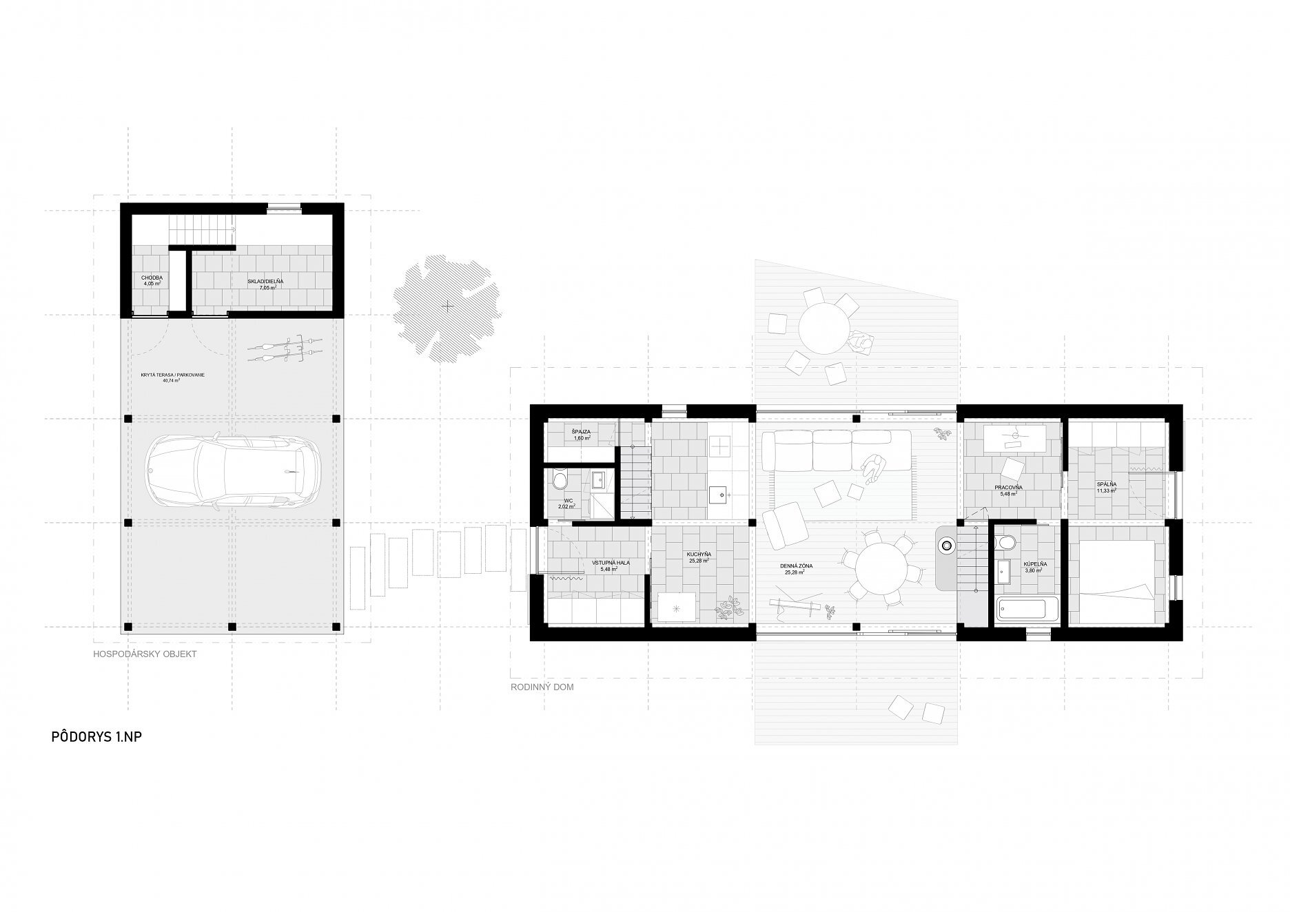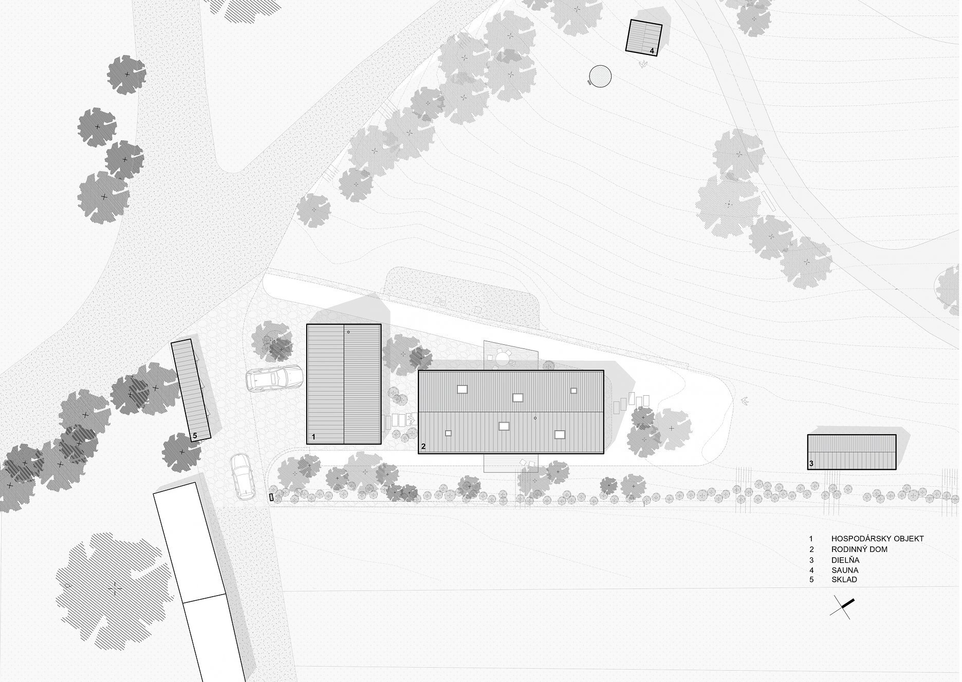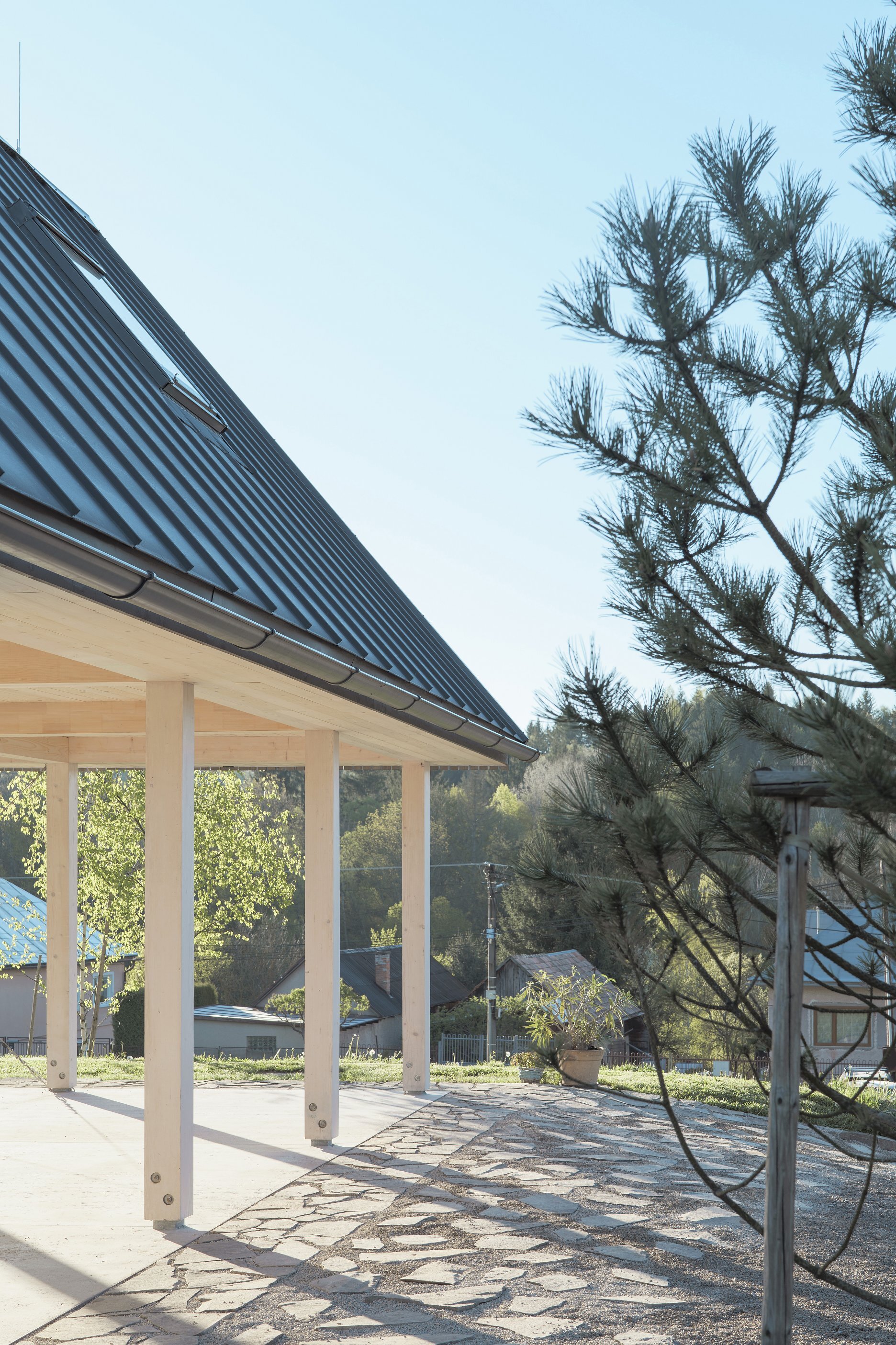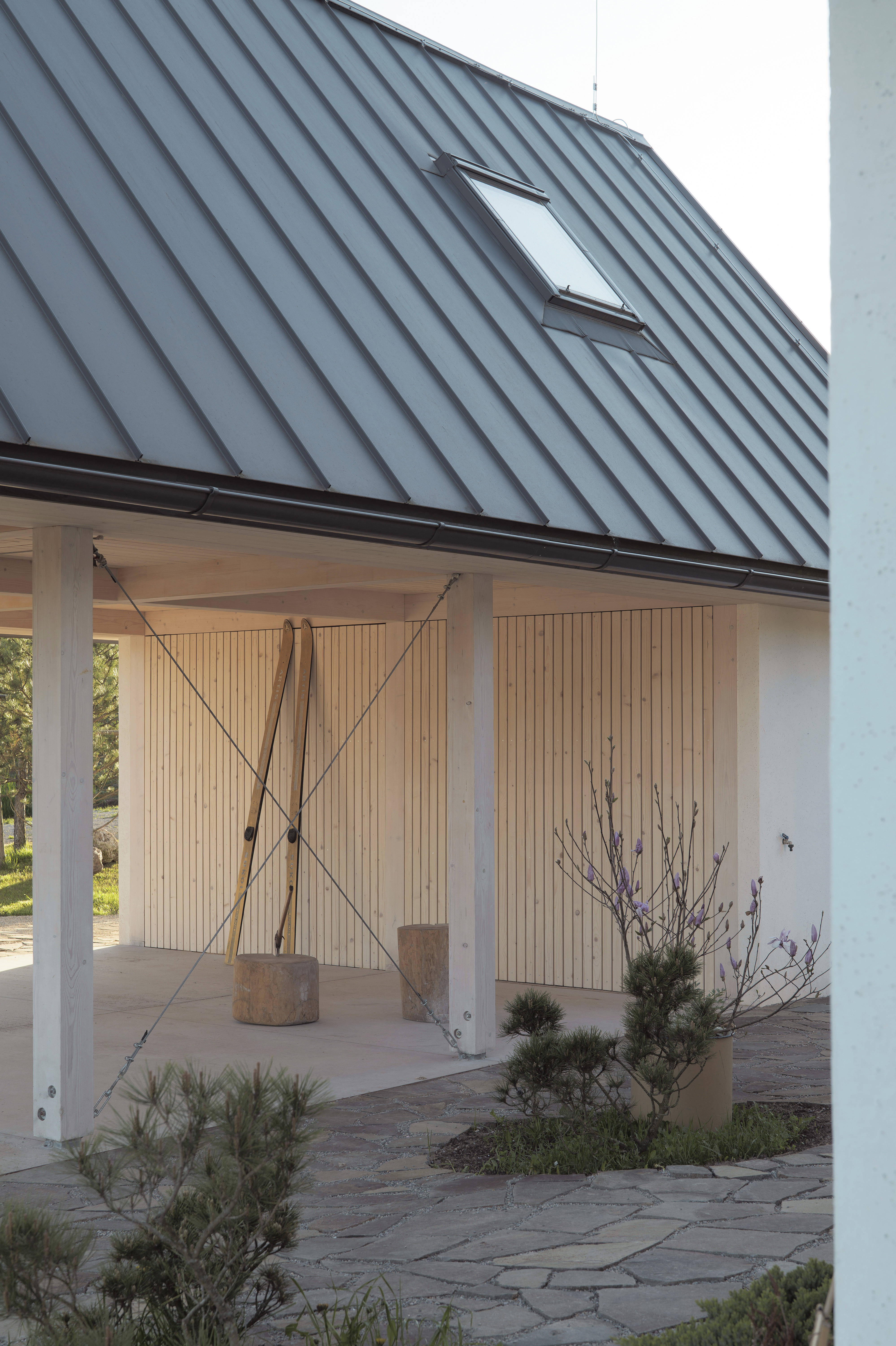 Rovnaký architektonicko‑výtvarný princíp je použitý aj na stavbe parkovacieho prístrešku. Ten je situovaný kolmo na hlavný objekt domu, z urbanistického hľadiska vytvára jeho nástupný priestor a zároveň opticky uzatvára vonkajšie pobytové spevnené plochy na západnej strane pozemku. Takto zvolená kompozícia do budúcnosti počíta s možným rozšírením zástavby o menšie objekty dočasného bývania založené na rovnakých architektonicko‑stavebných princípoch. Cieľom návrhu tak bolo vytvoriť priestorovo racionálnu, no zároveň nadčasovú a autenticky lokálnu architektúru, ktorá má ambíciu kultivovať svoje bezprostredné okolie.