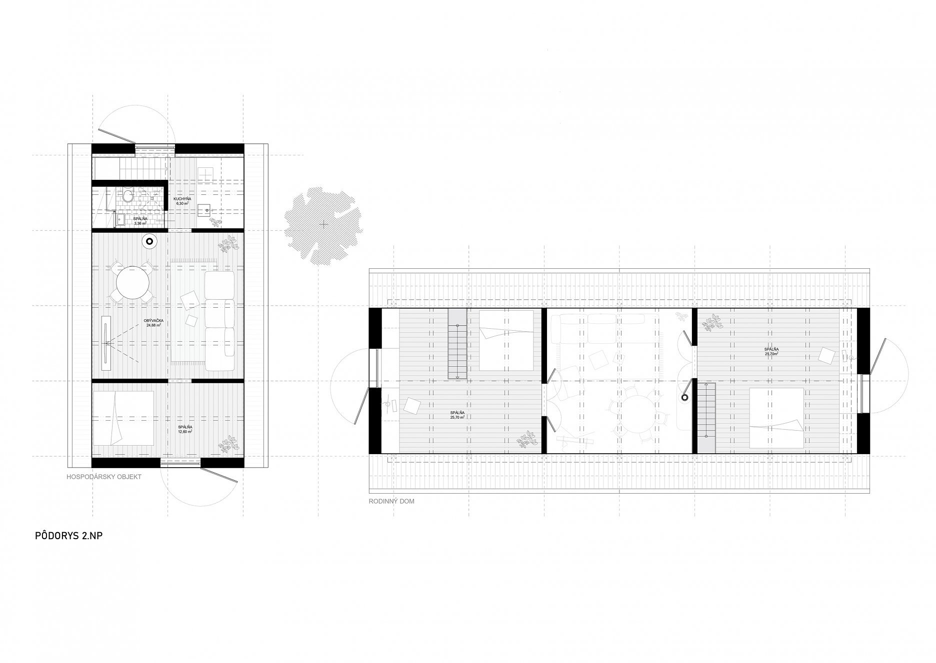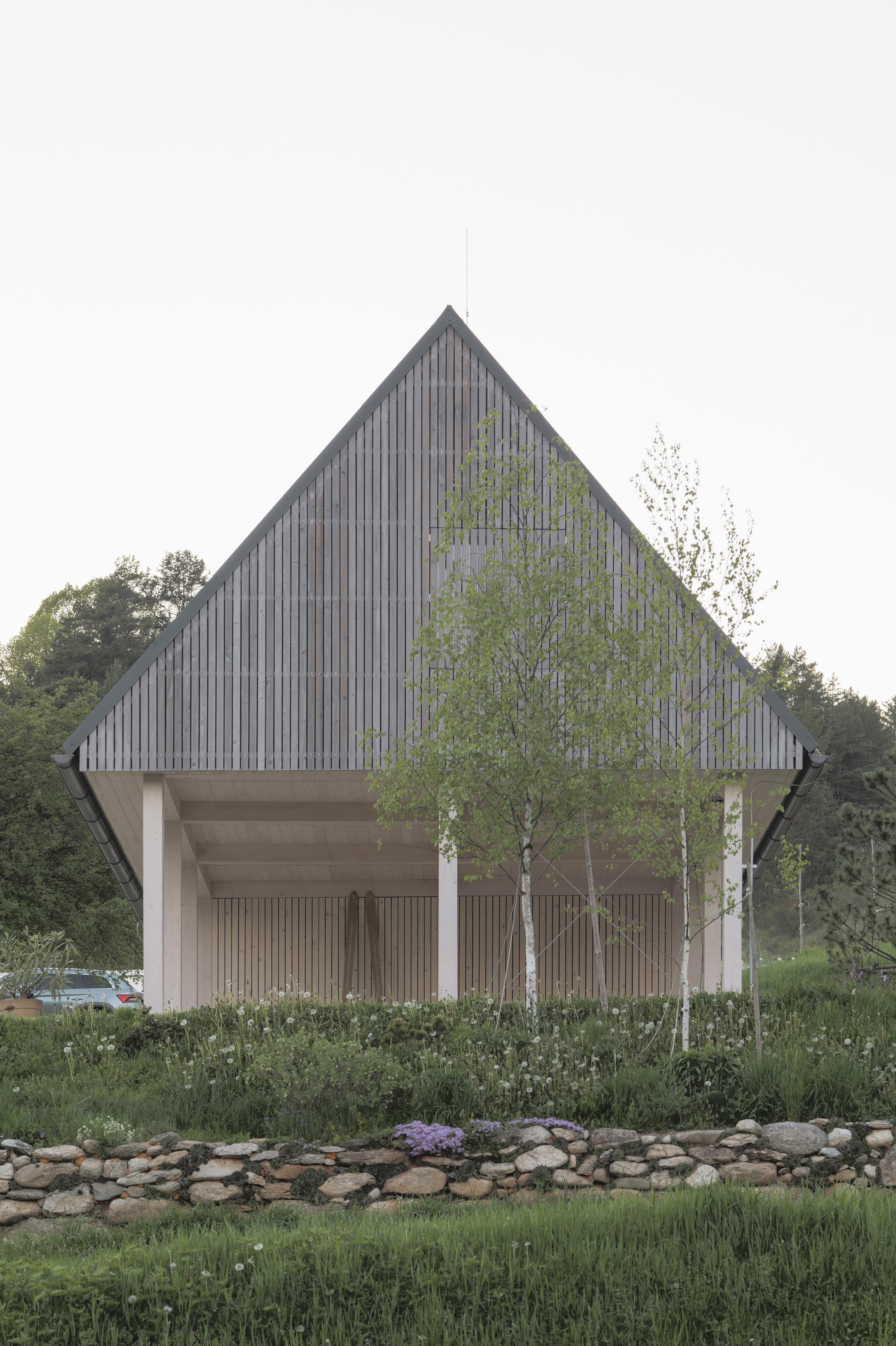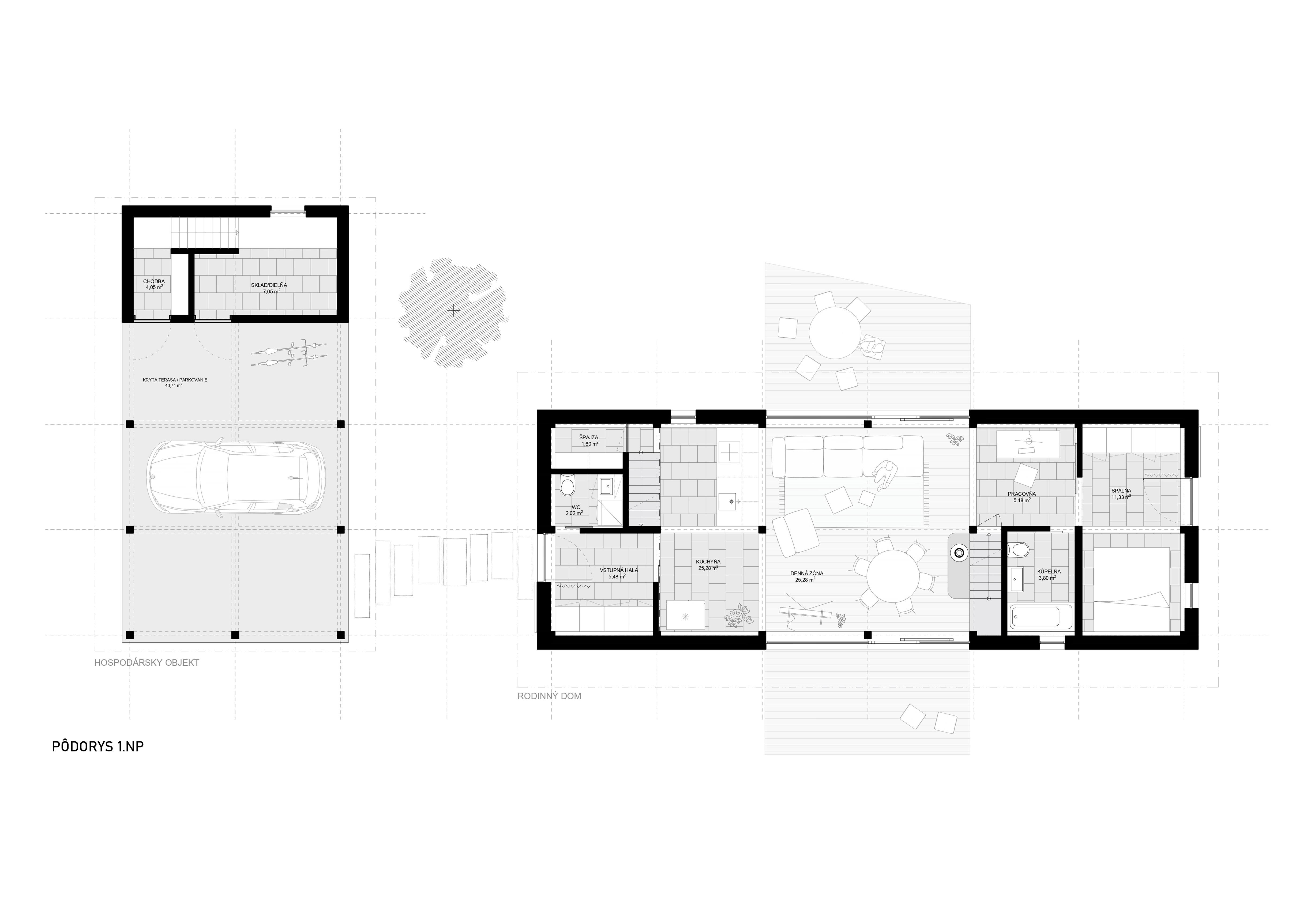 Rovnaký architektonicko‑výtvarný princíp je použitý aj na stavbe parkovacieho prístrešku. Ten je situovaný kolmo na hlavný objekt domu, z urbanistického hľadiska vytvára jeho nástupný priestor a zároveň opticky uzatvára vonkajšie pobytové spevnené plochy na západnej strane pozemku. Takto zvolená kompozícia do budúcnosti počíta s možným rozšírením zástavby o menšie objekty dočasného bývania založené na rovnakých architektonicko‑stavebných princípoch. Cieľom návrhu tak bolo vytvoriť priestorovo racionálnu, no zároveň nadčasovú a autenticky lokálnu architektúru, ktorá má ambíciu kultivovať svoje bezprostredné okolie.