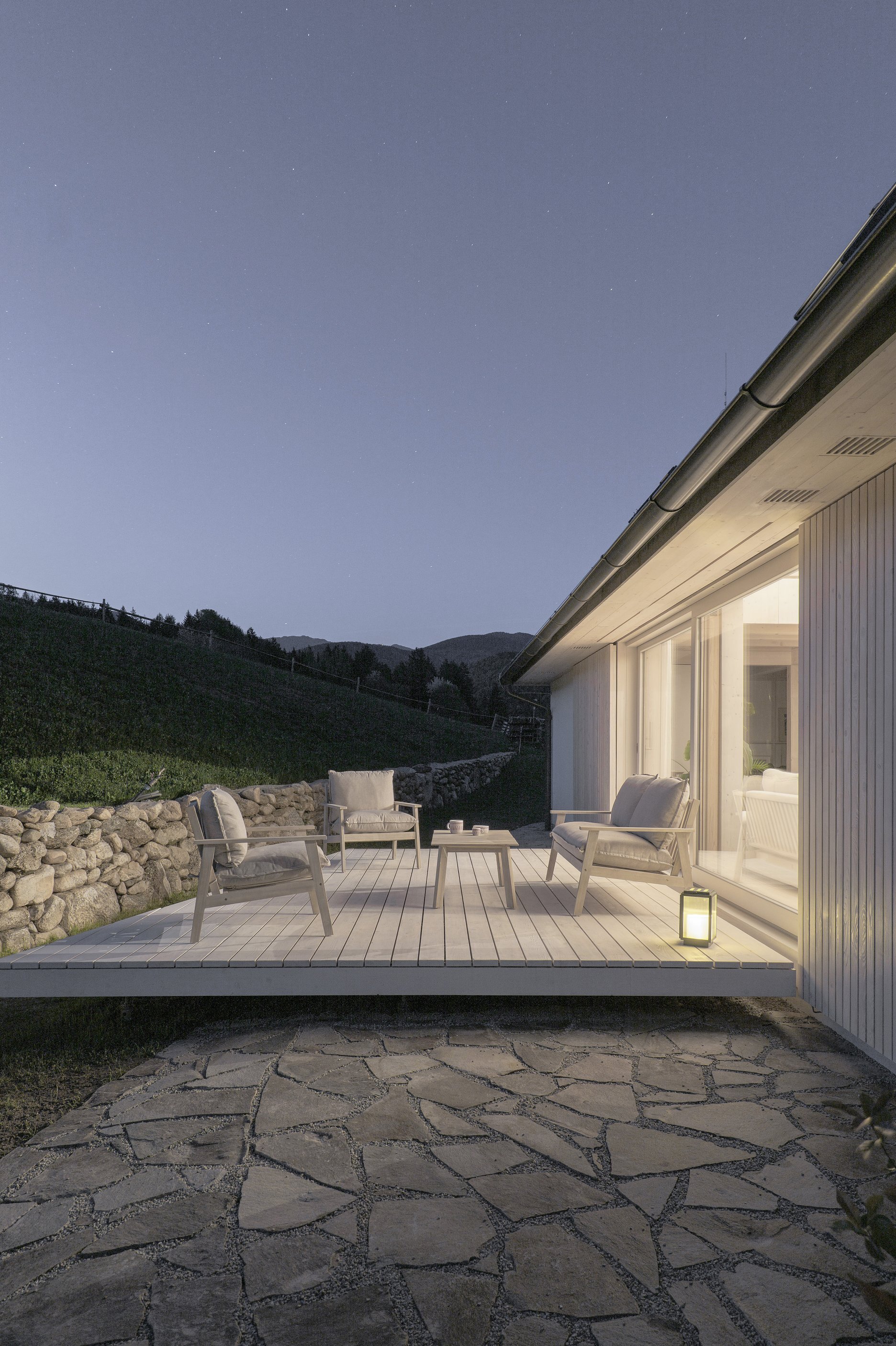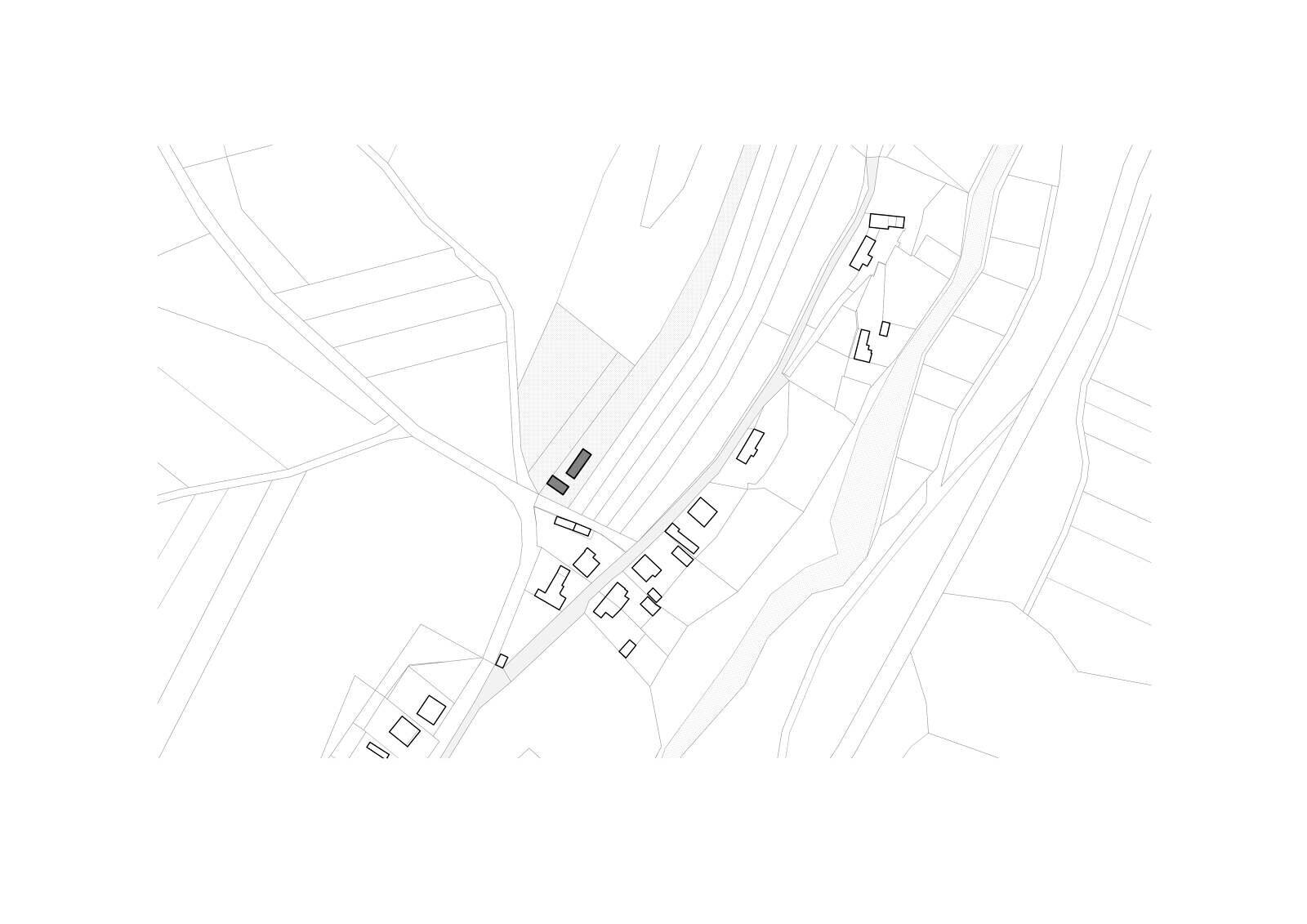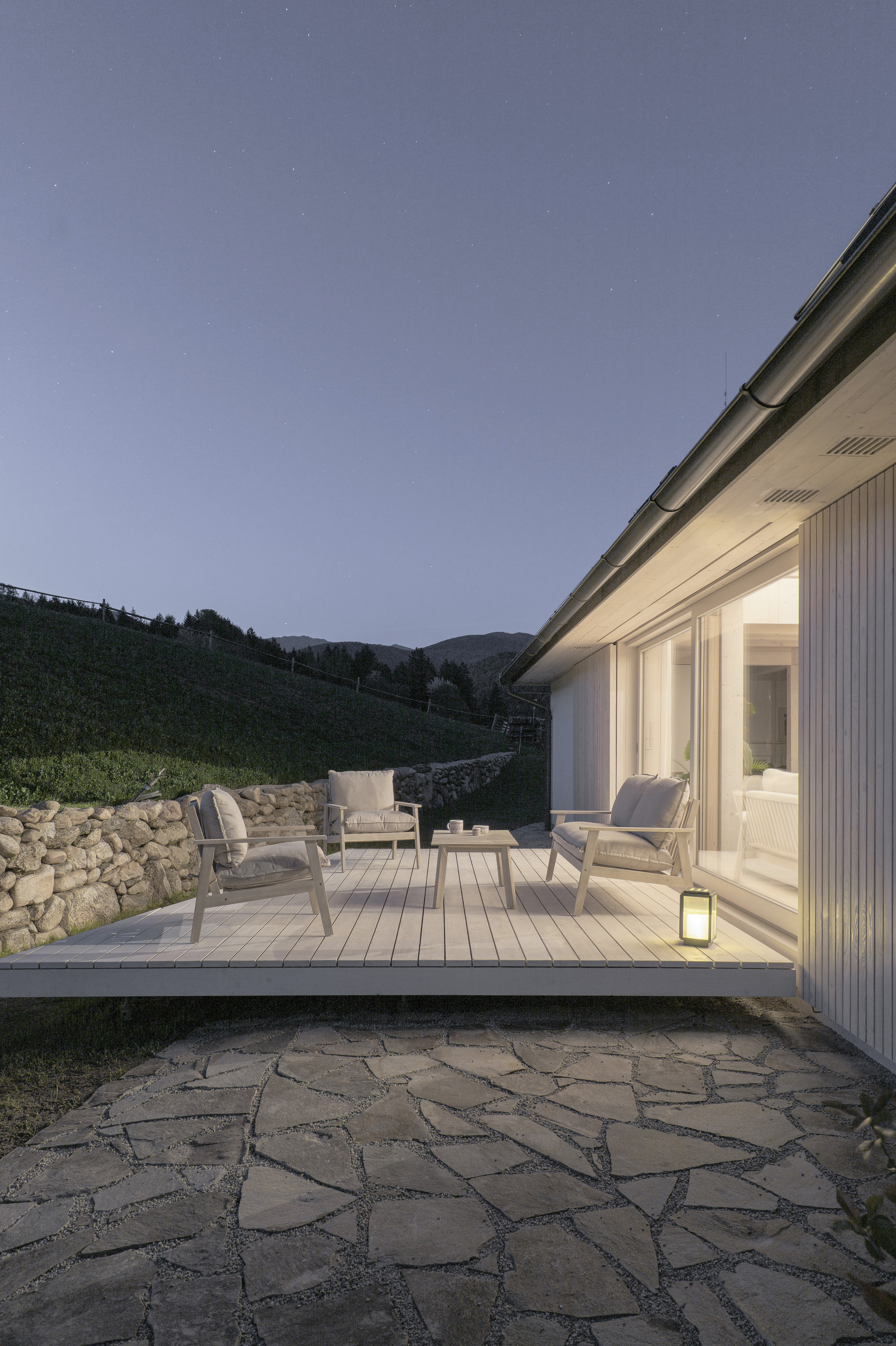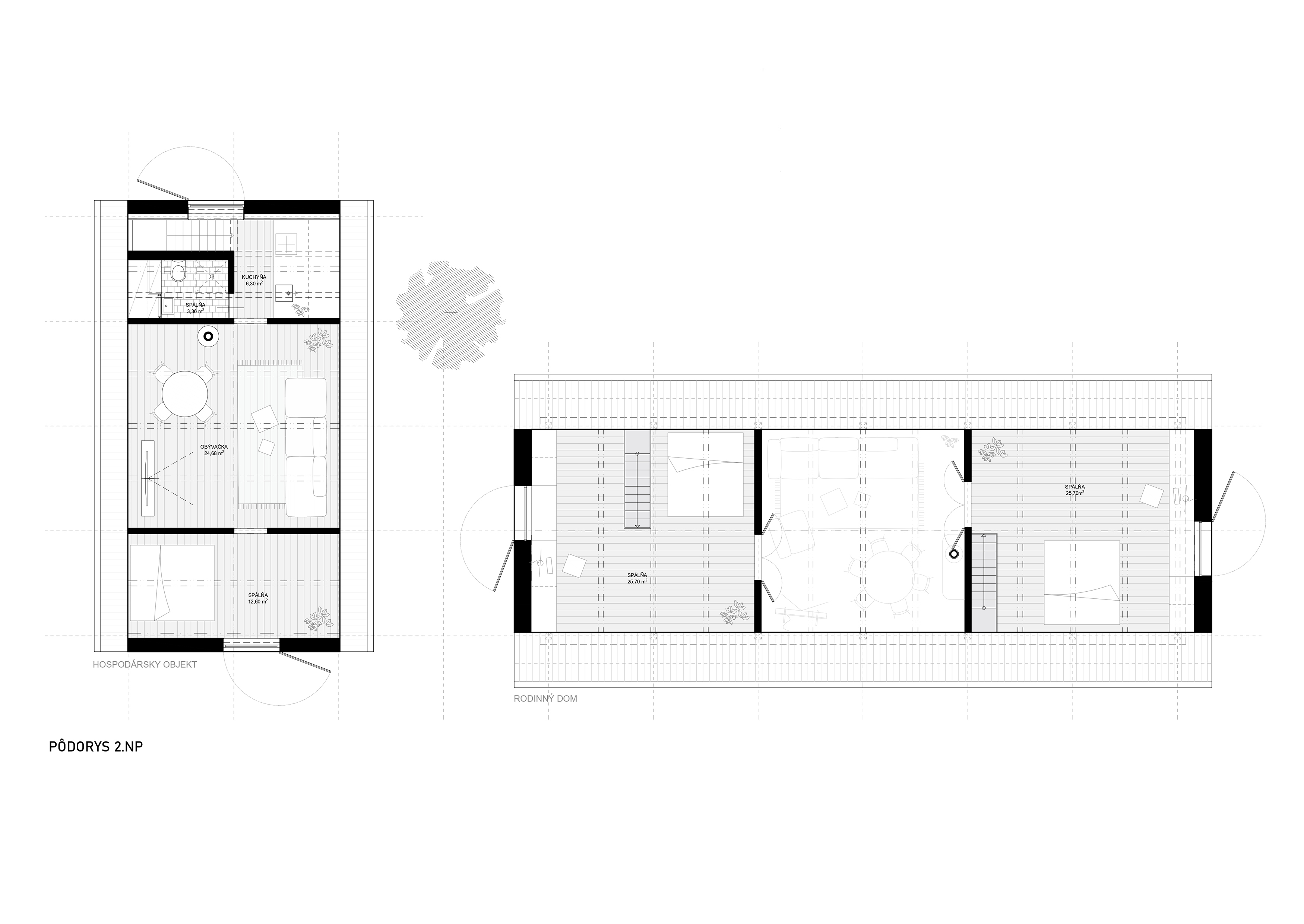 Rovnaký architektonicko‑výtvarný princíp je použitý aj na stavbe parkovacieho prístrešku. Ten je situovaný kolmo na hlavný objekt domu, z urbanistického hľadiska vytvára jeho nástupný priestor a zároveň opticky uzatvára vonkajšie pobytové spevnené plochy na západnej strane pozemku. Takto zvolená kompozícia do budúcnosti počíta s možným rozšírením zástavby o menšie objekty dočasného bývania založené na rovnakých architektonicko‑stavebných princípoch. Cieľom návrhu tak bolo vytvoriť priestorovo racionálnu, no zároveň nadčasovú a autenticky lokálnu architektúru, ktorá má ambíciu kultivovať svoje bezprostredné okolie.