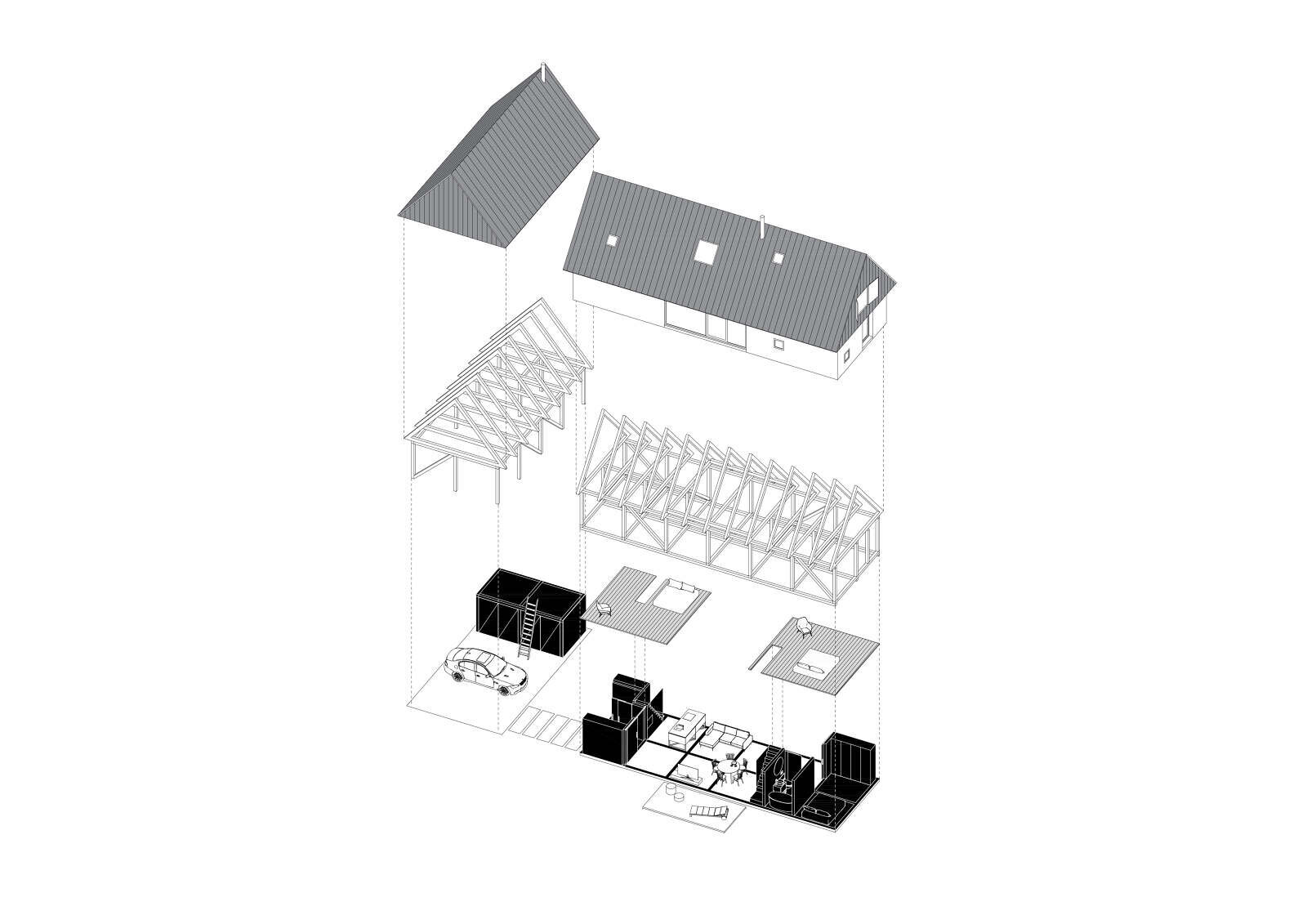 Architektonicko‑stavebný princíp dvoch hlavných objektov je založený na drevenej skeletovej konštrukcii usporiadanej do jednotnej modulovej sústavy 2,5 × 2,5 m. Takéto riešenie bolo zvolené hneď z niekoľkých dôvodov. V prípade samotného rodinného domu umožňuje jeho vnútorný priestor členiť na tri rovnaké polia v závislosti od ich funkcie. Tak ako sa v pôvodných roľníckych dreveniciach vchádzalo do centrálnej siene – pitvora, na ktorú z jednej strany nadväzovala izba a z druhej komora, aj tu sú analogicky vymedzené polia domu na centrálnu obytnú časť, spálňu s kúpeľňou a hospodársku časť v podobe kuchyne, špajze a vstupnej haly. Rovnaká konštrukčná sústava v podobe dvoch modulov bola použitá aj v menšom objekte prístrešku na parkovanie s dielňou. Druhým, nemenej dôležitým faktorom však bola možnosť svojpomocnej výstavby. Odvolávanie sa na tradičné ľudové staviteľstvo tak nie je len formálnym gestom v podobe použitej materiálovej škály či architektonickej hmoty, ale aj prinavrátením ručnej práce, komunitného spôsobu vidieckeho života a technickej zručnosti majiteľov. Po vyprojektovaní a príprave jednotlivých dielov základnej konštrukčnej sústavy prebiehali počas nasledujúcich šiestich rokov takmer všetky práce pod rukami členov rodiny, príbuzných a priateľov. Takýto postup navyše, okrem značného zníženia finančných nákladov, umožnil autorom testovať a v procese výstavby prispôsobovať jednotlivé na mieru navrhnuté detaily.
