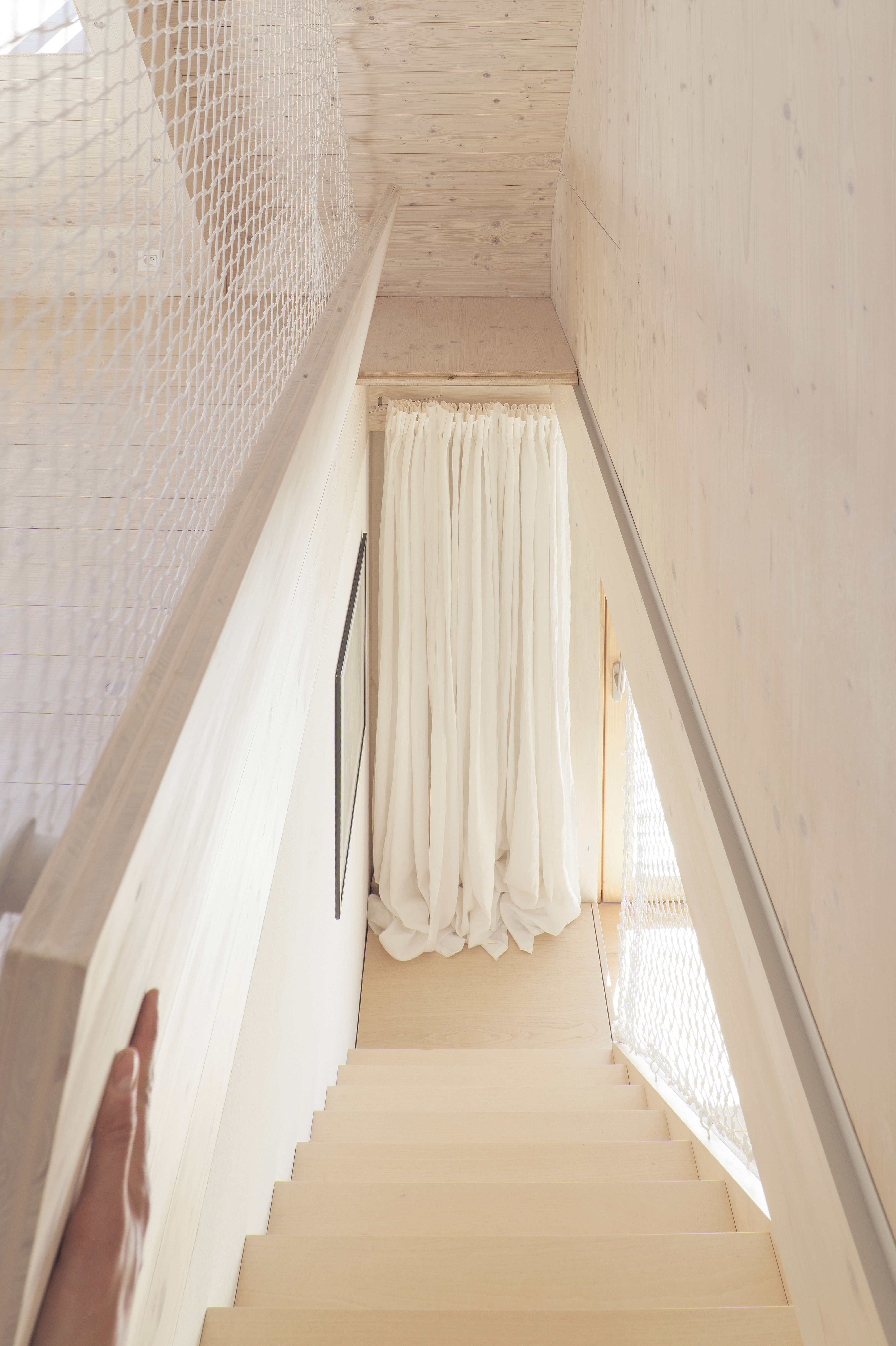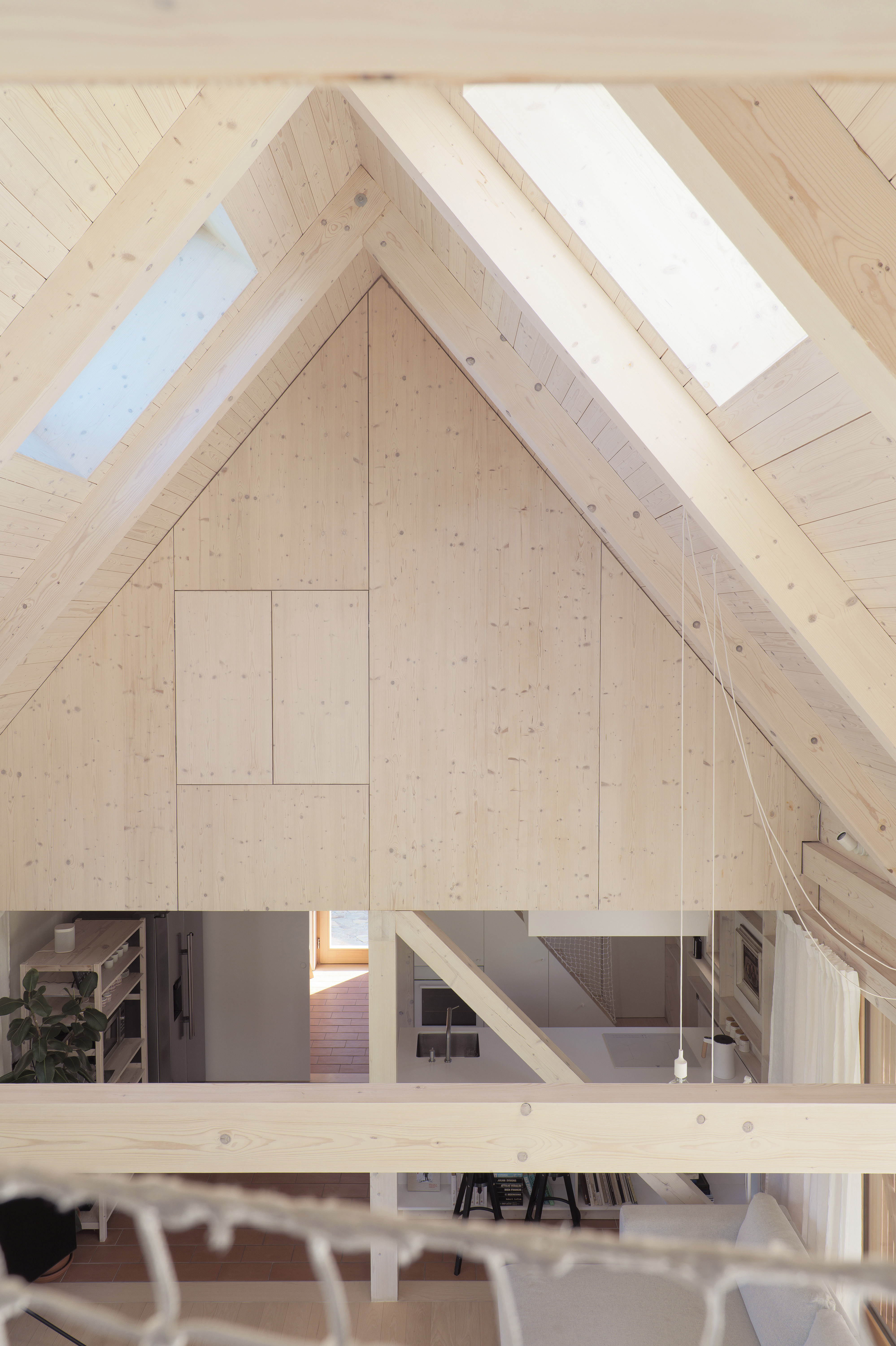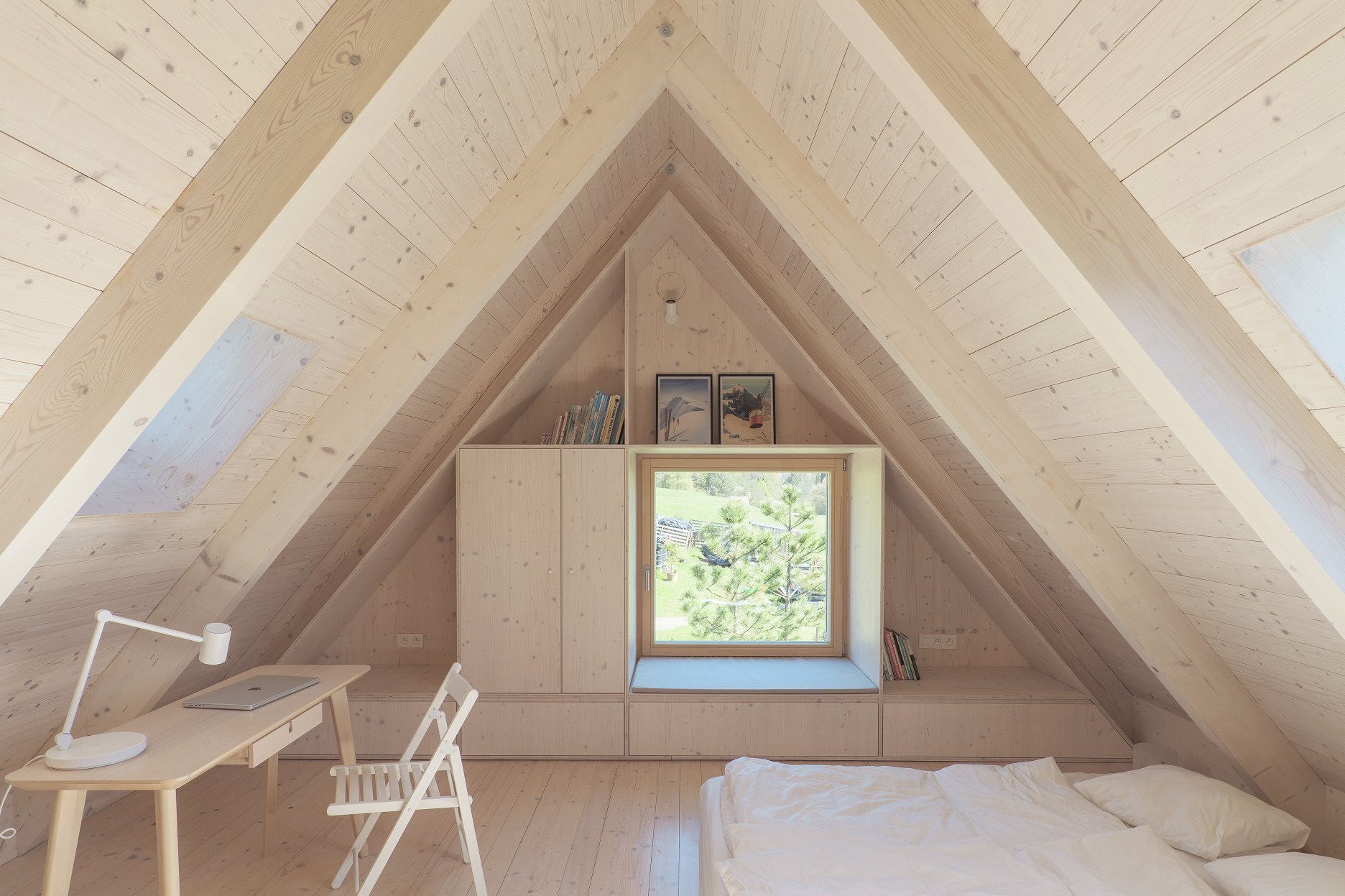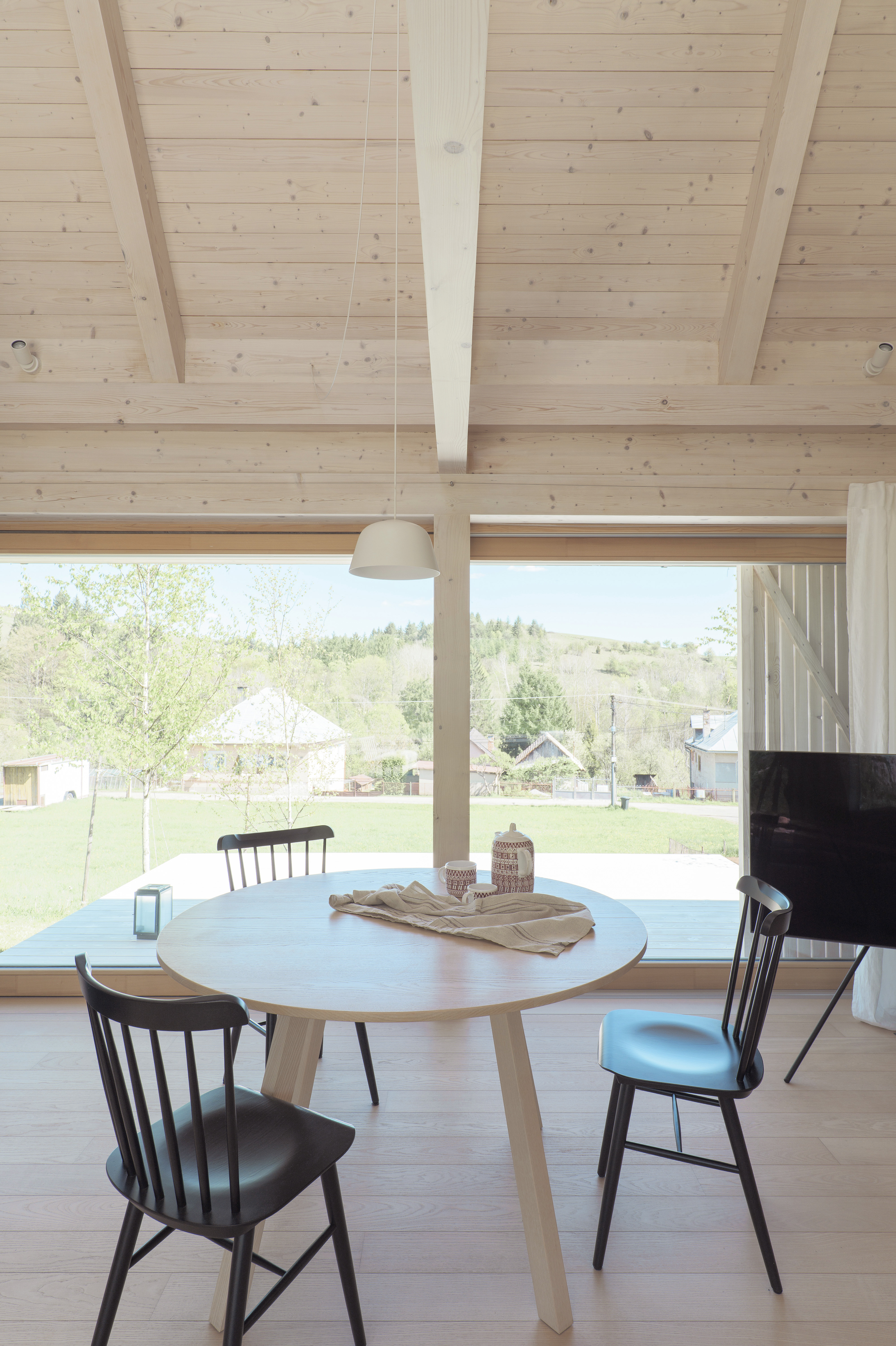 Autori nechávajú vyniknúť odhalené prvky a detaily konštrukcie z dreveného masívu doplnené o vstavaný nábytok od Huliman s.r.o., kroré spoločne vytvárajú jeden harmonický celok s pútavou drevokresbou.
