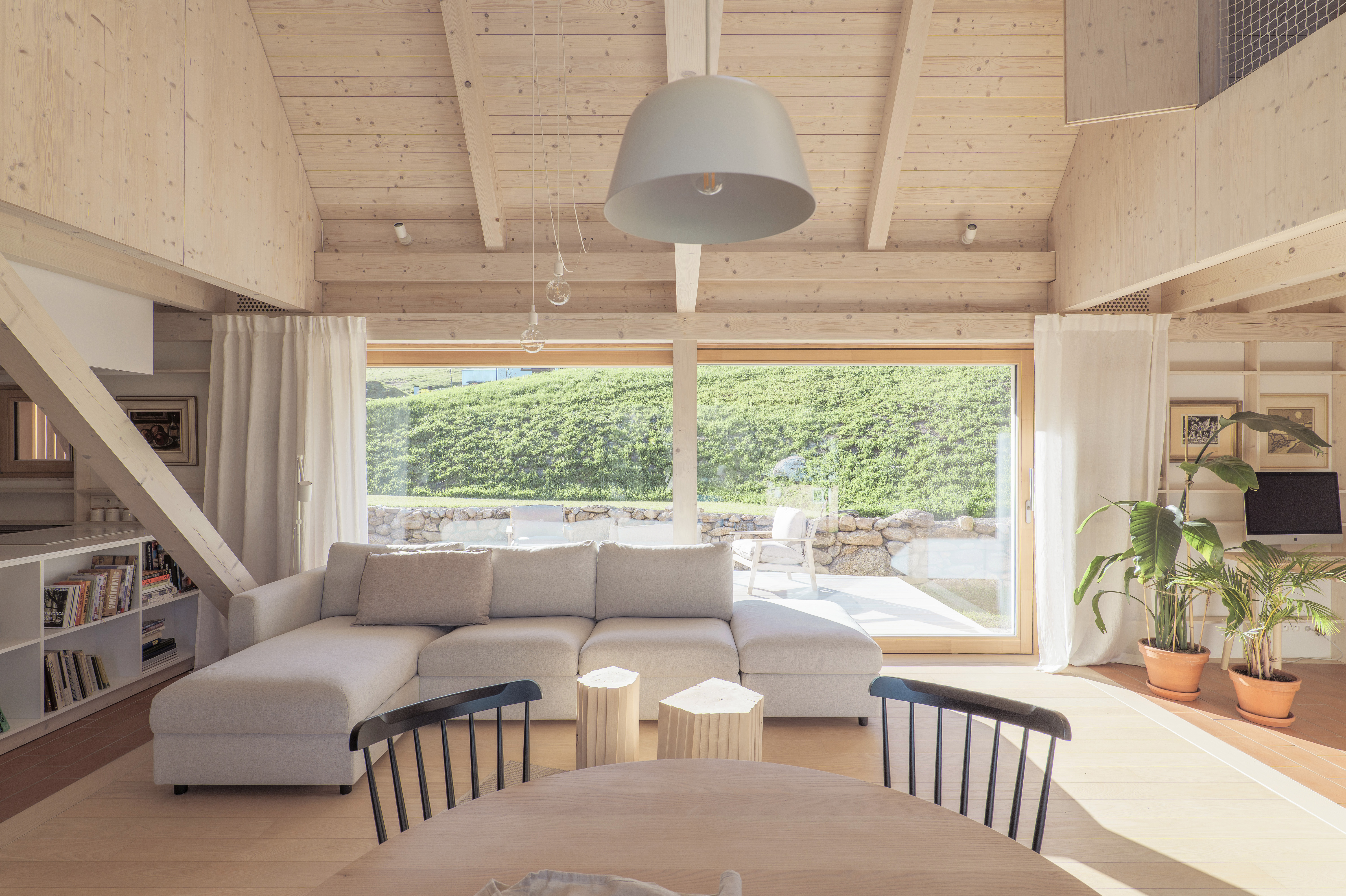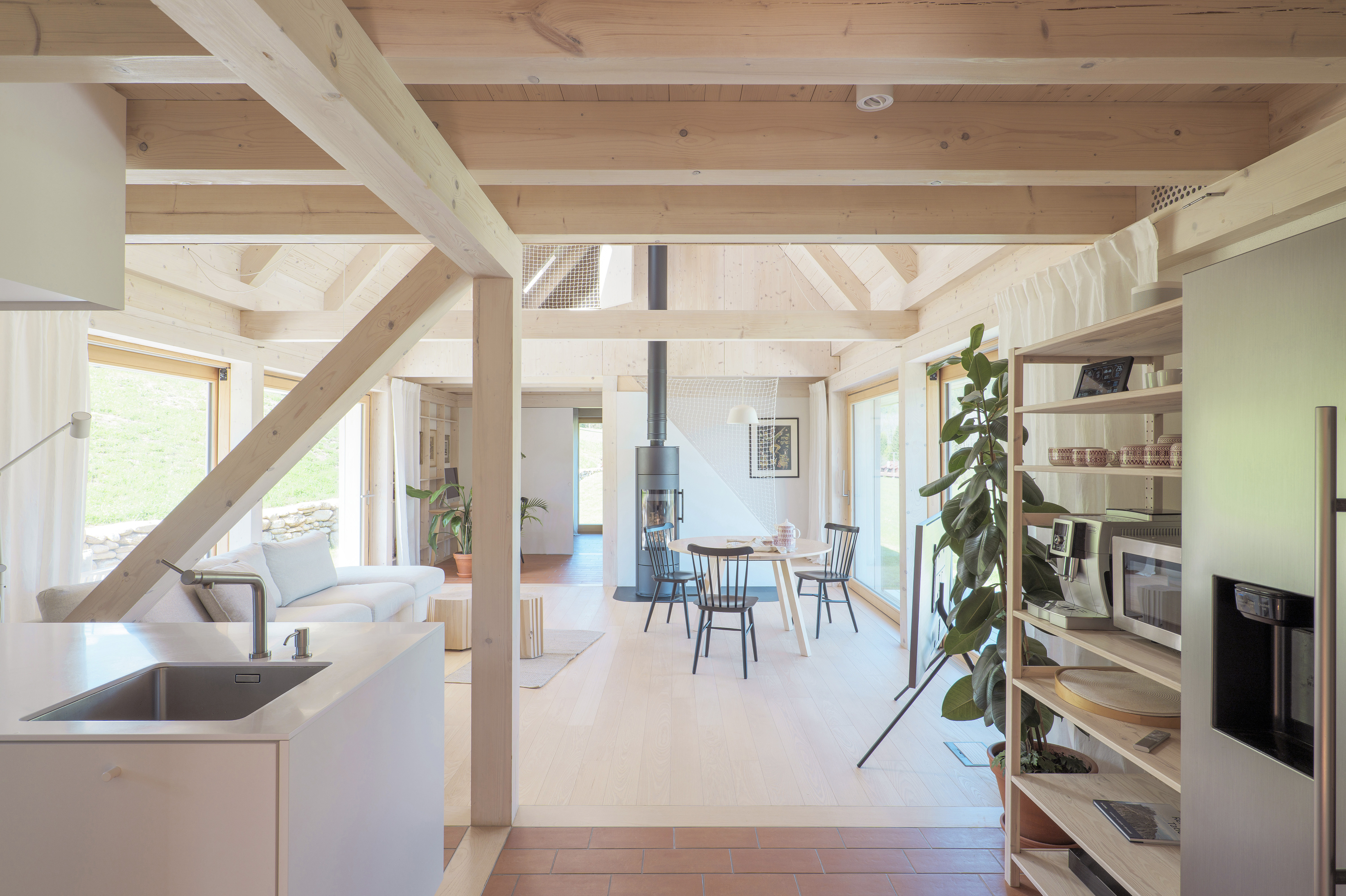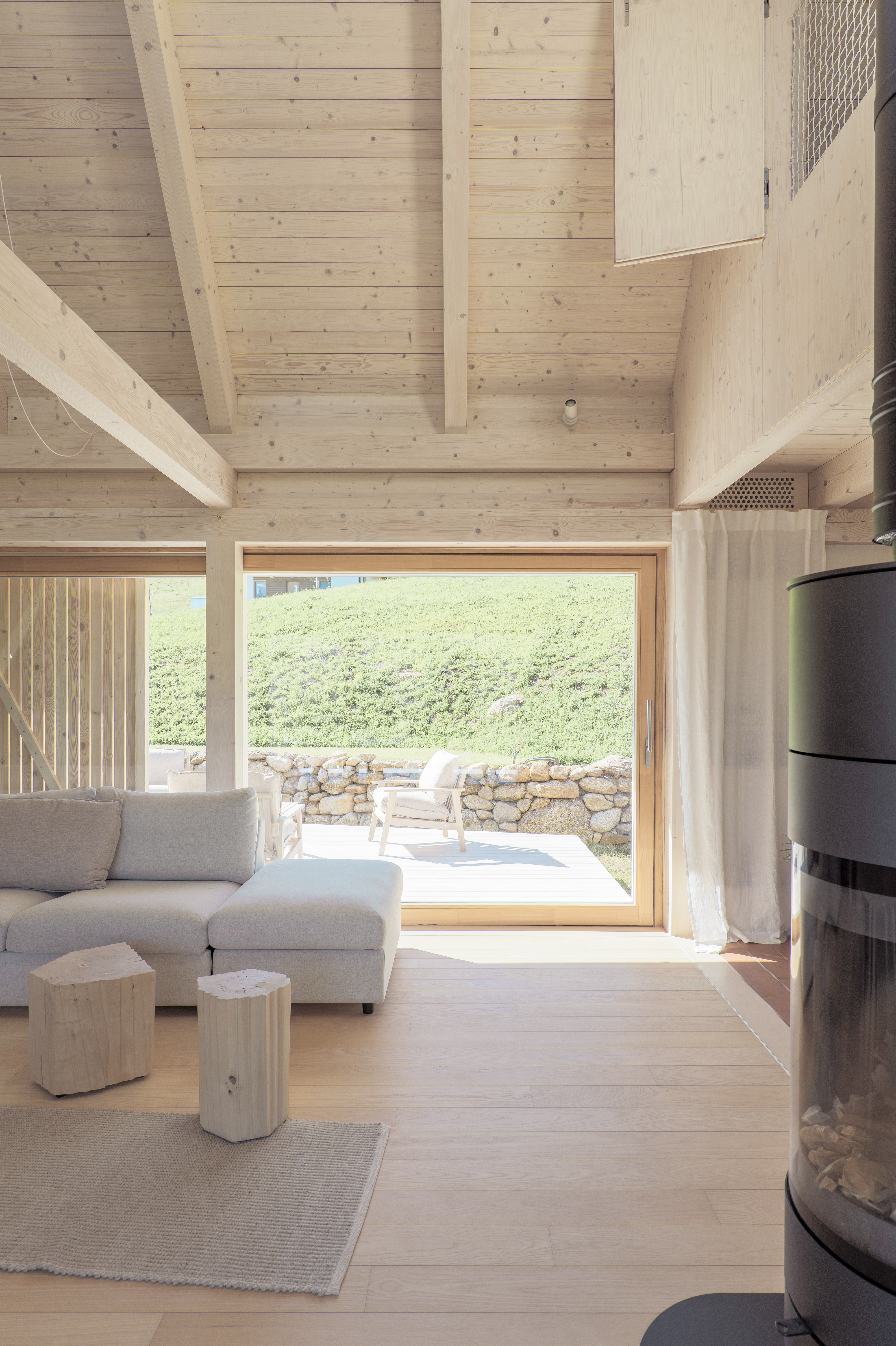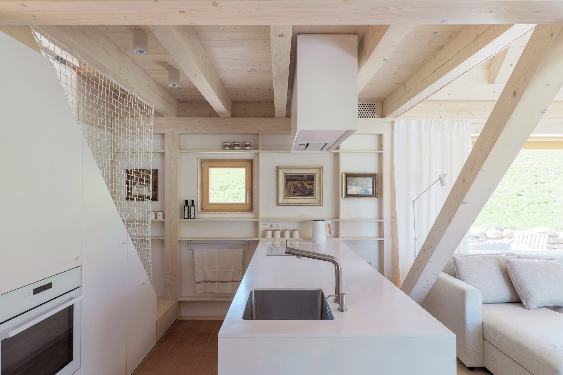 Autori nechávajú vyniknúť odhalené prvky a detaily konštrukcie z dreveného masívu doplnené o vstavaný nábytok od Huliman s.r.o., kroré spoločne vytvárajú jeden harmonický celok s pútavou drevokresbou.