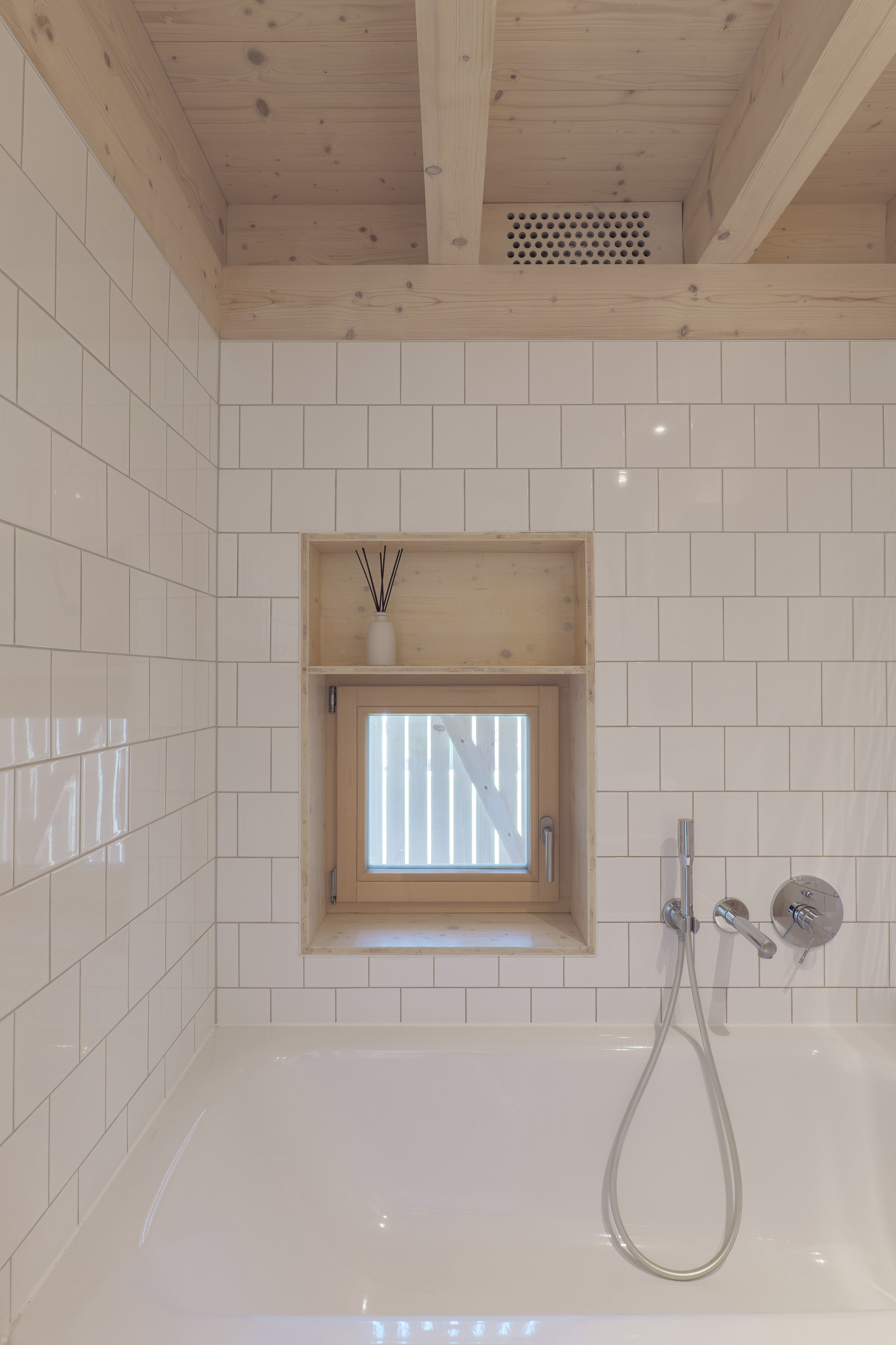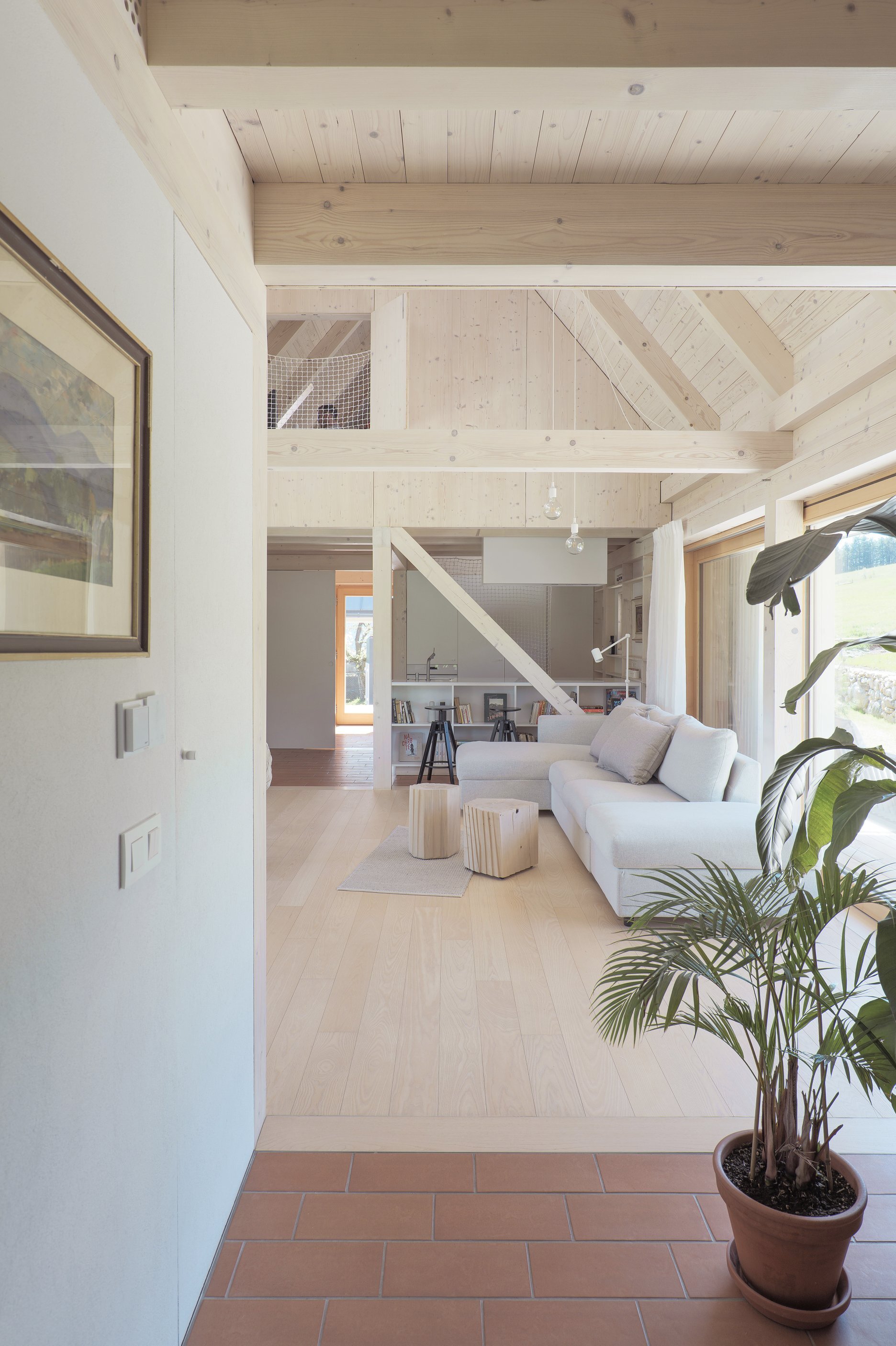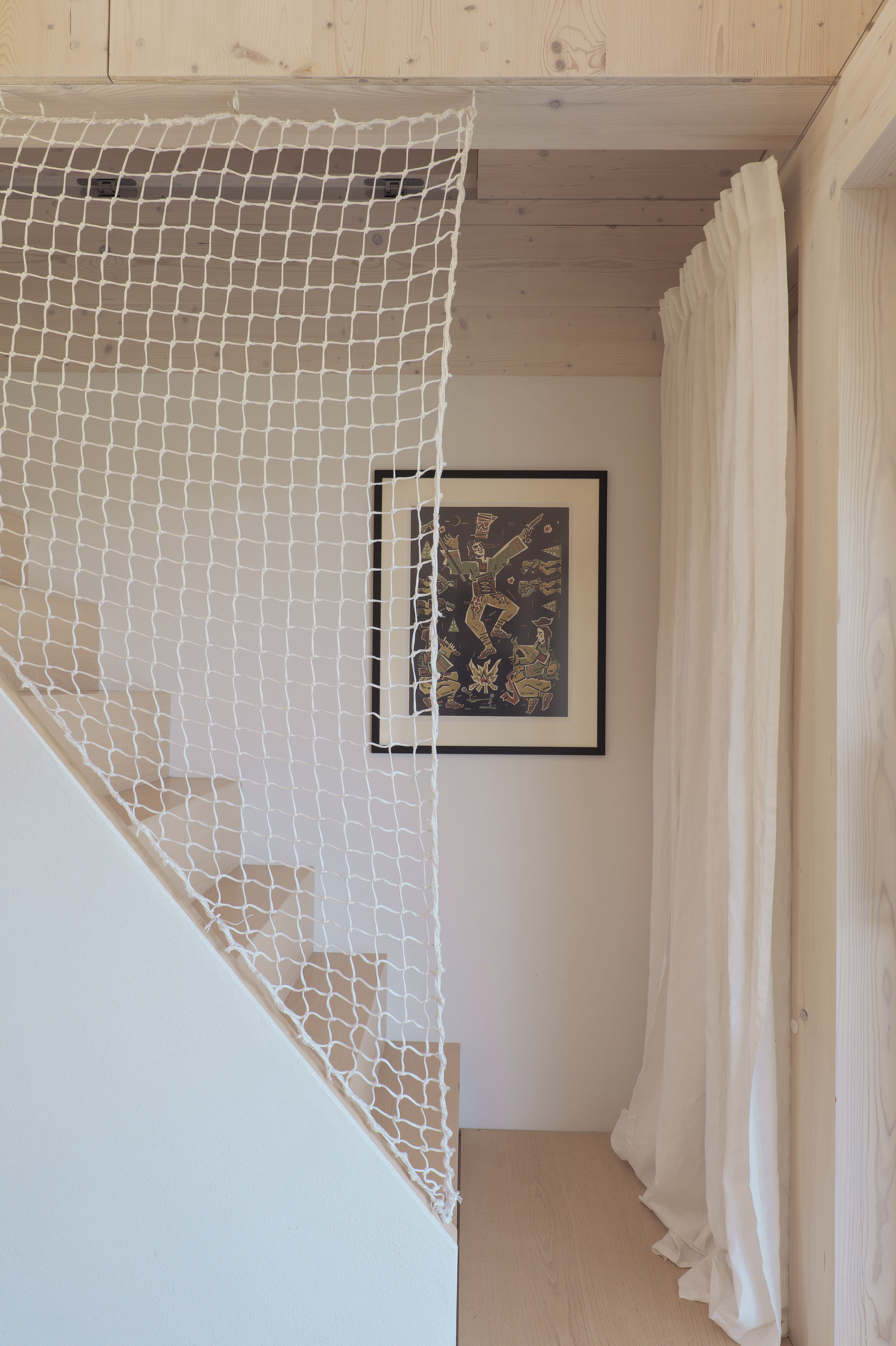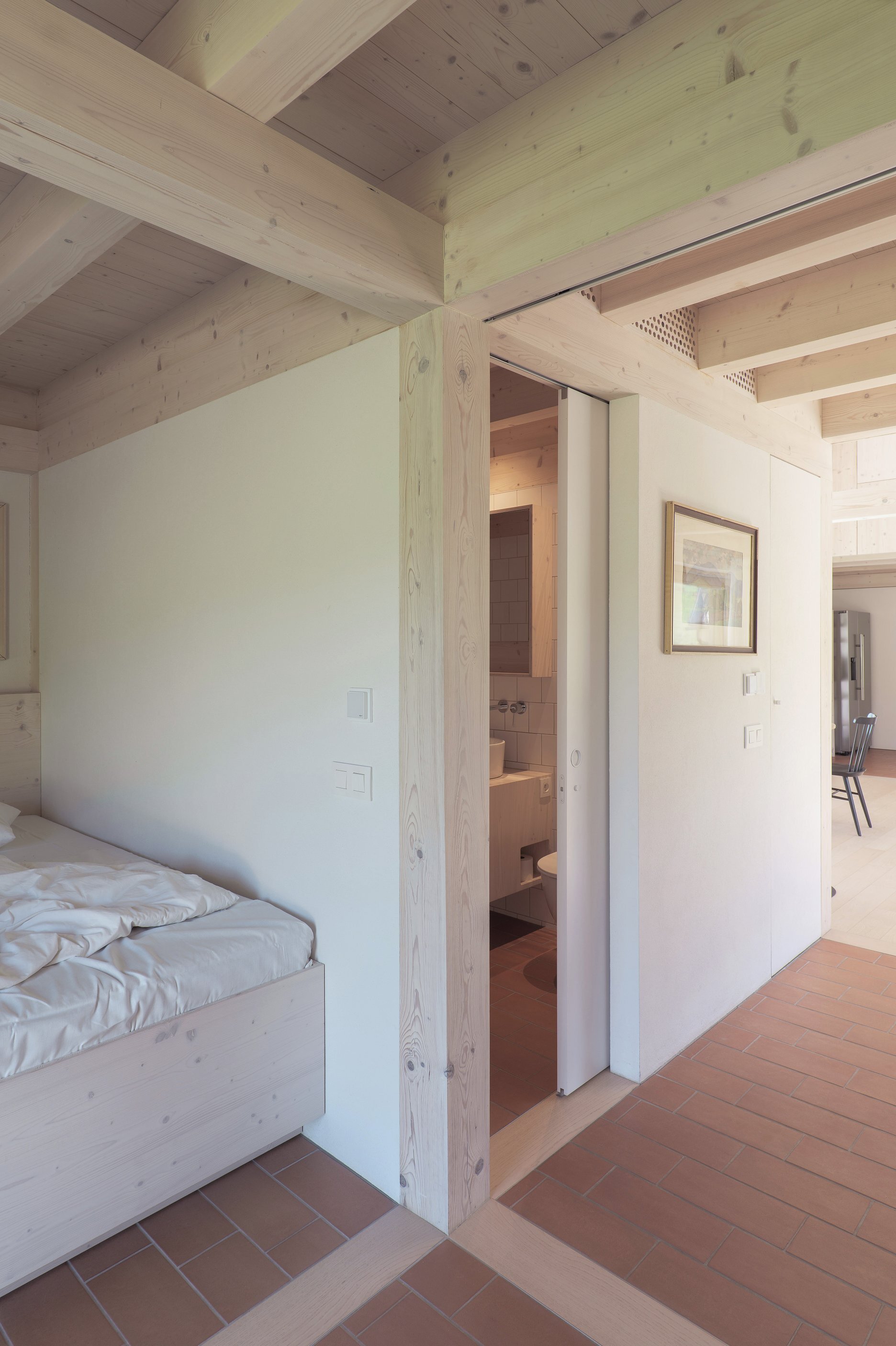 Autori nechávajú vyniknúť odhalené prvky a detaily konštrukcie z dreveného masívu doplnené o vstavaný nábytok od Huliman s.r.o., kroré spoločne vytvárajú jeden harmonický celok s pútavou drevokresbou.