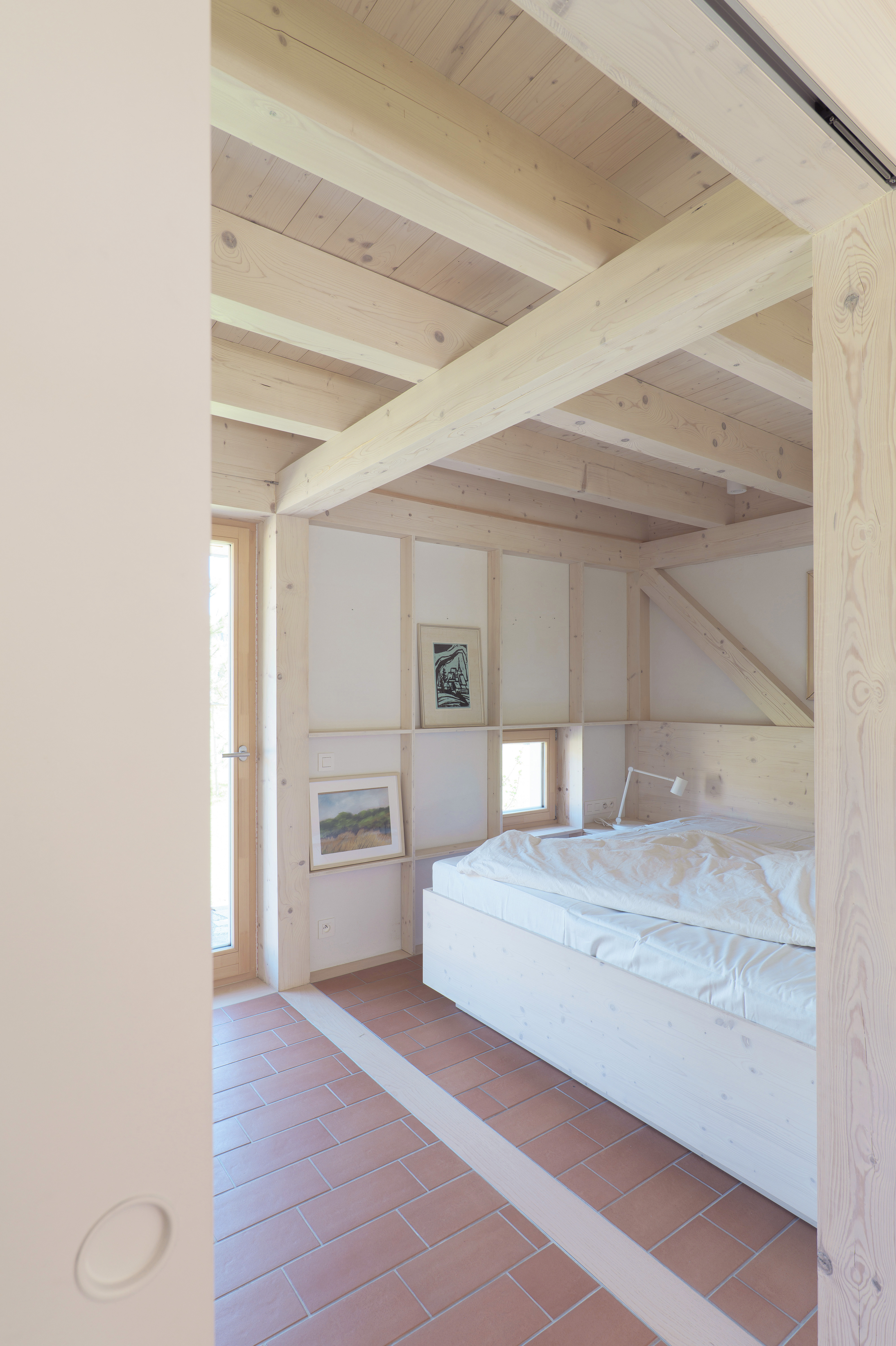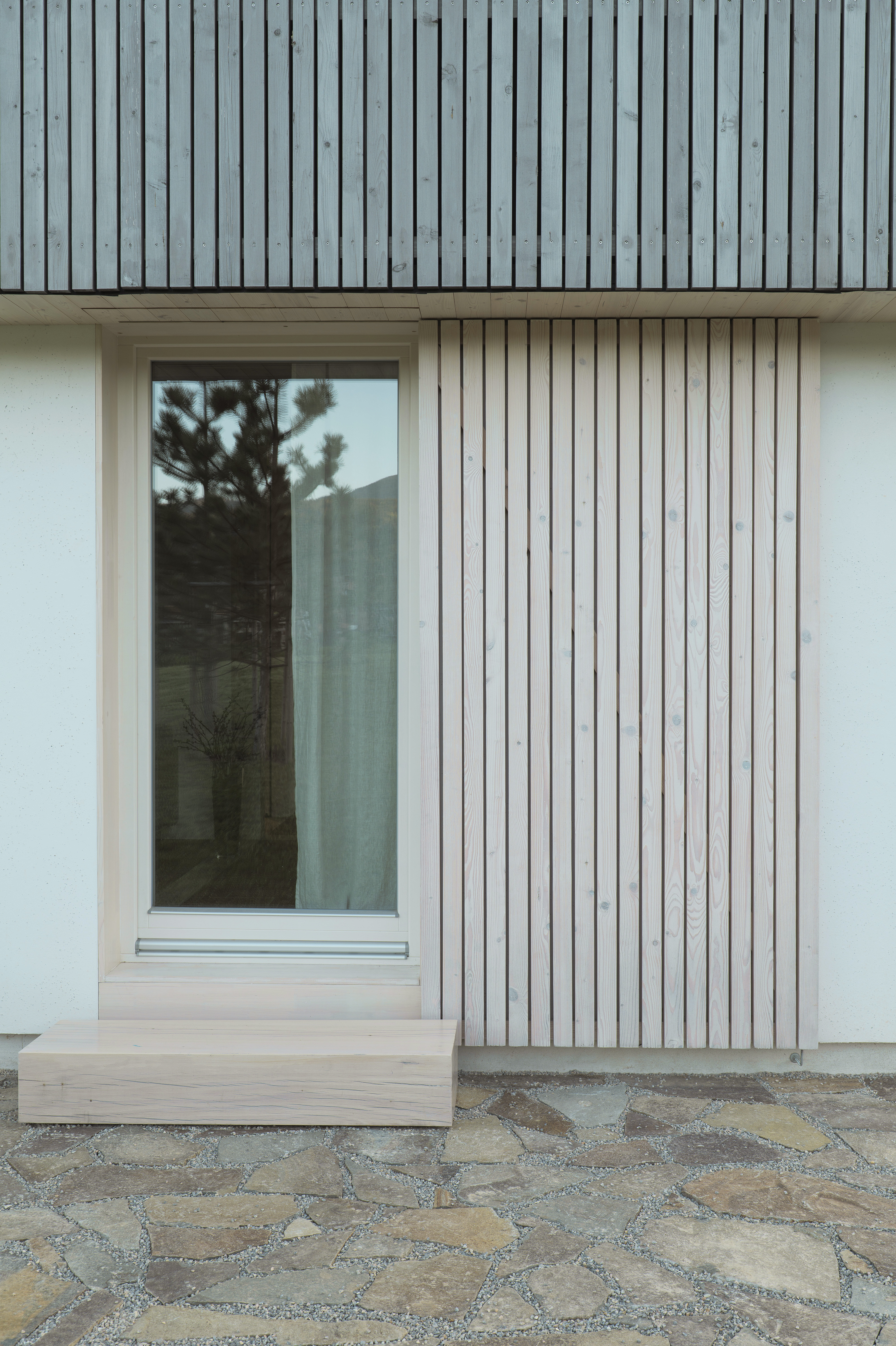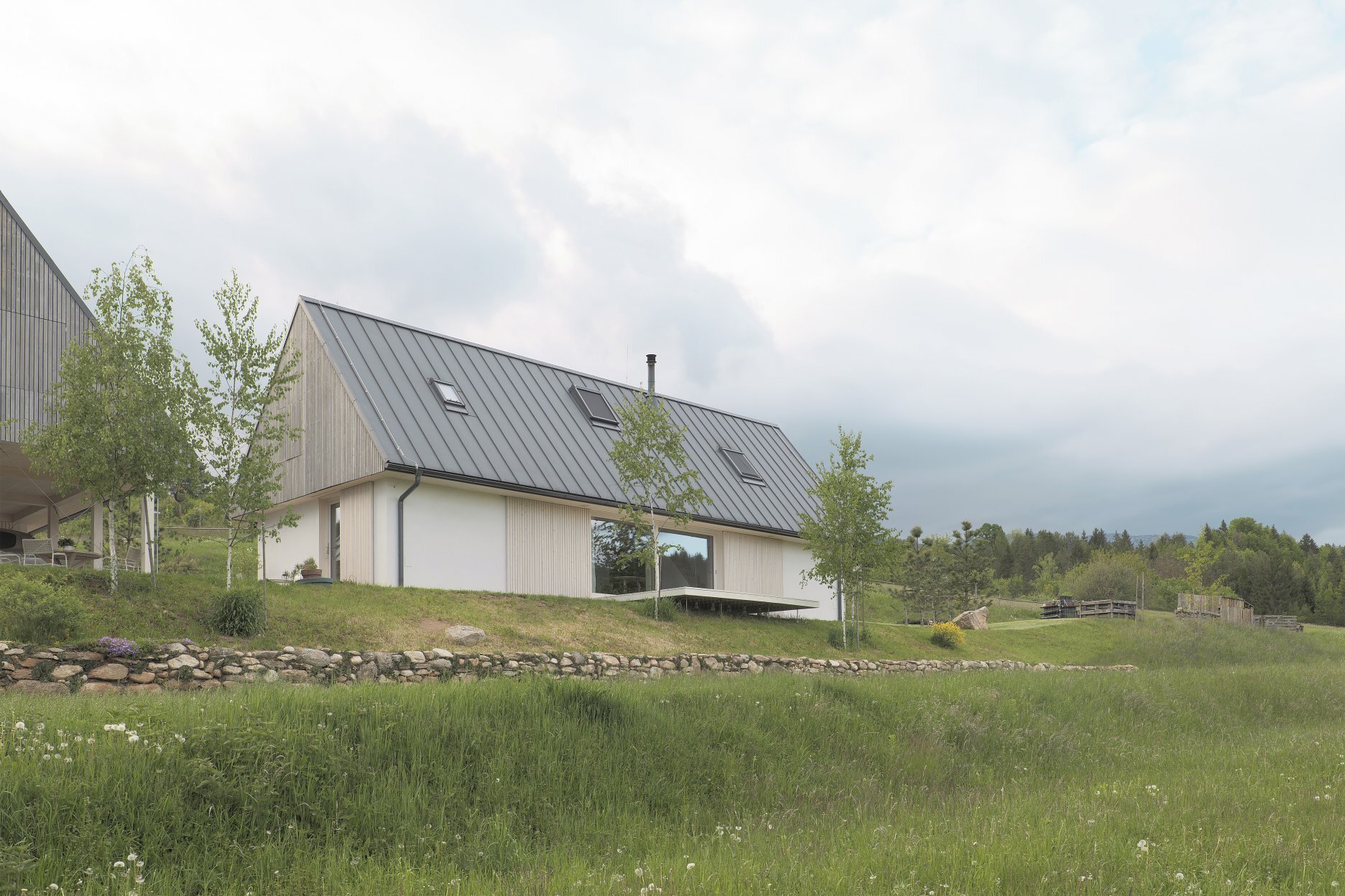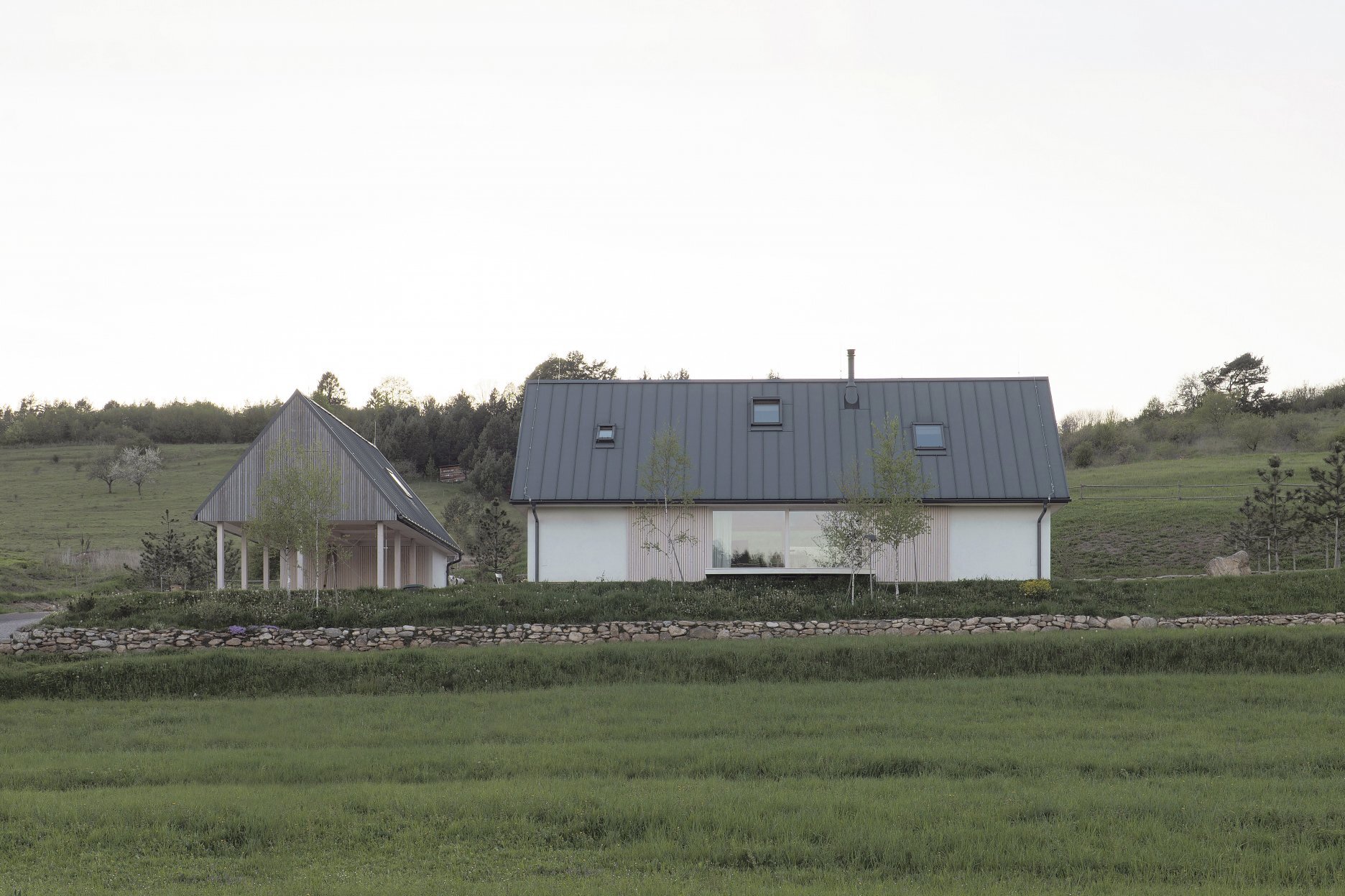 Tomu napokon zodpovedá aj samotná architektúra domu. Jej cieľom bolo pretransformovať tieto tradičné architektonické princípy do novej podoby tak, aby pri zachovaní jednoduchej stavby vznikol vzdušný a presvetlený priestor reflektujúci potreby súčasného bývania s dôrazom na remeselný detail. Všetky obytné priestory sú preto navzájom vizuálne prepojené. Hlavný obytný priestor v strednej časti dispozície je otvorený aj do podkrovia a prepojený s exteriérom pomocou posuvnej presklenej fasády. Podkrovné priestory nad zónou kuchyne a spálne sú naopak využité ako hosťovské izby. Konštrukcia dreveného skeletu je v interiéri priznaná a tvorí dôležitý výtvarný prvok. Farebne ju dopĺňajú tradičná hlinená podlaha v okrajových poliach dispozície a jednoduchá biela omietka deliacich stien na prízemí. Z vonkajšej strany domu sa biela omietka mení na štruktúrovanú hrubozrnnú. Štítové steny domu sú obložené sivým dreveným latovaním, ktoré spolu s plechovou strechou zvýrazňuje jednoduchú geometriu stavby.