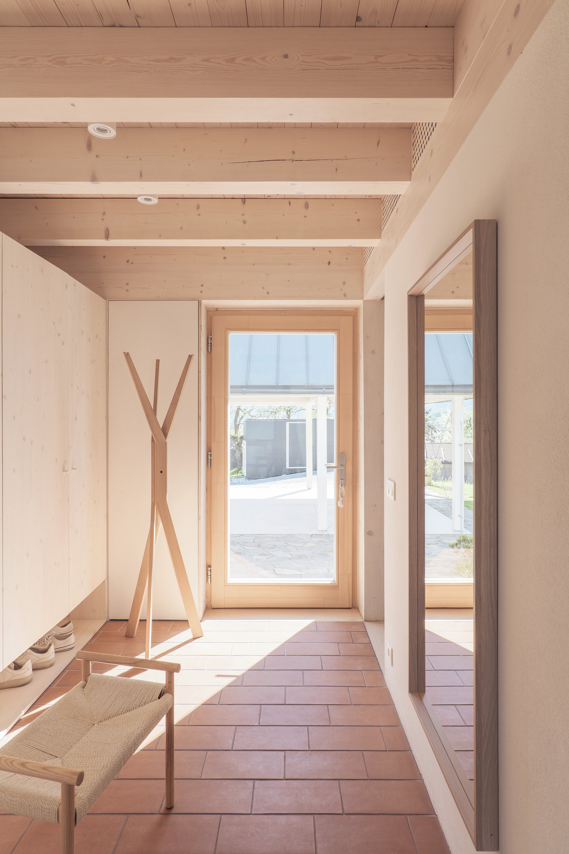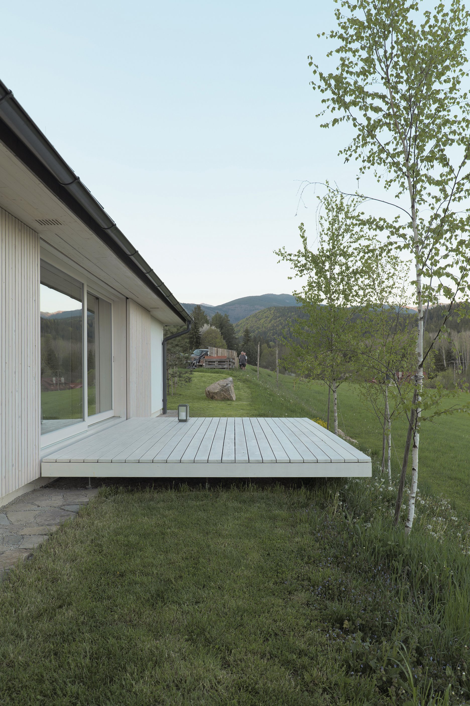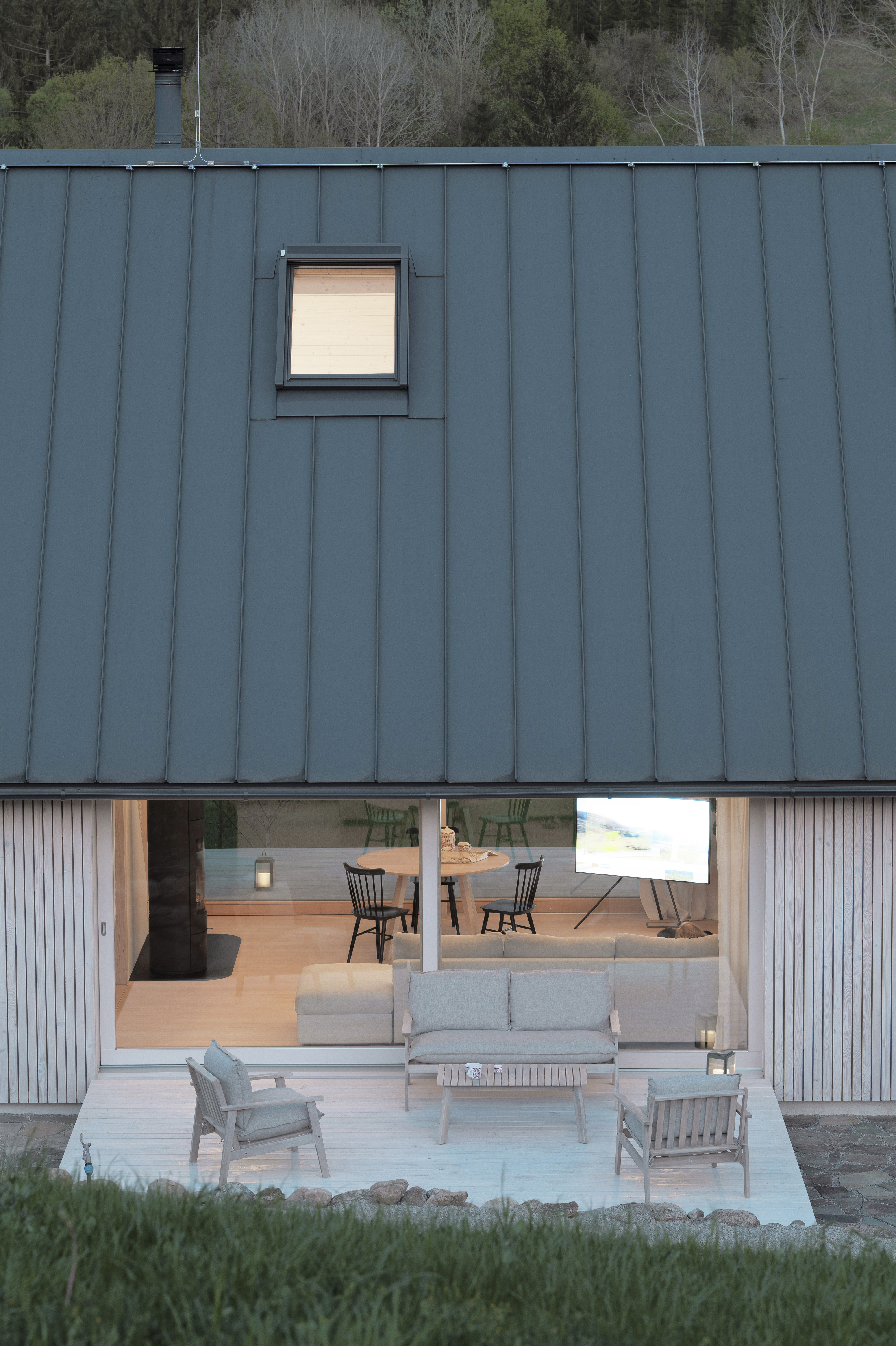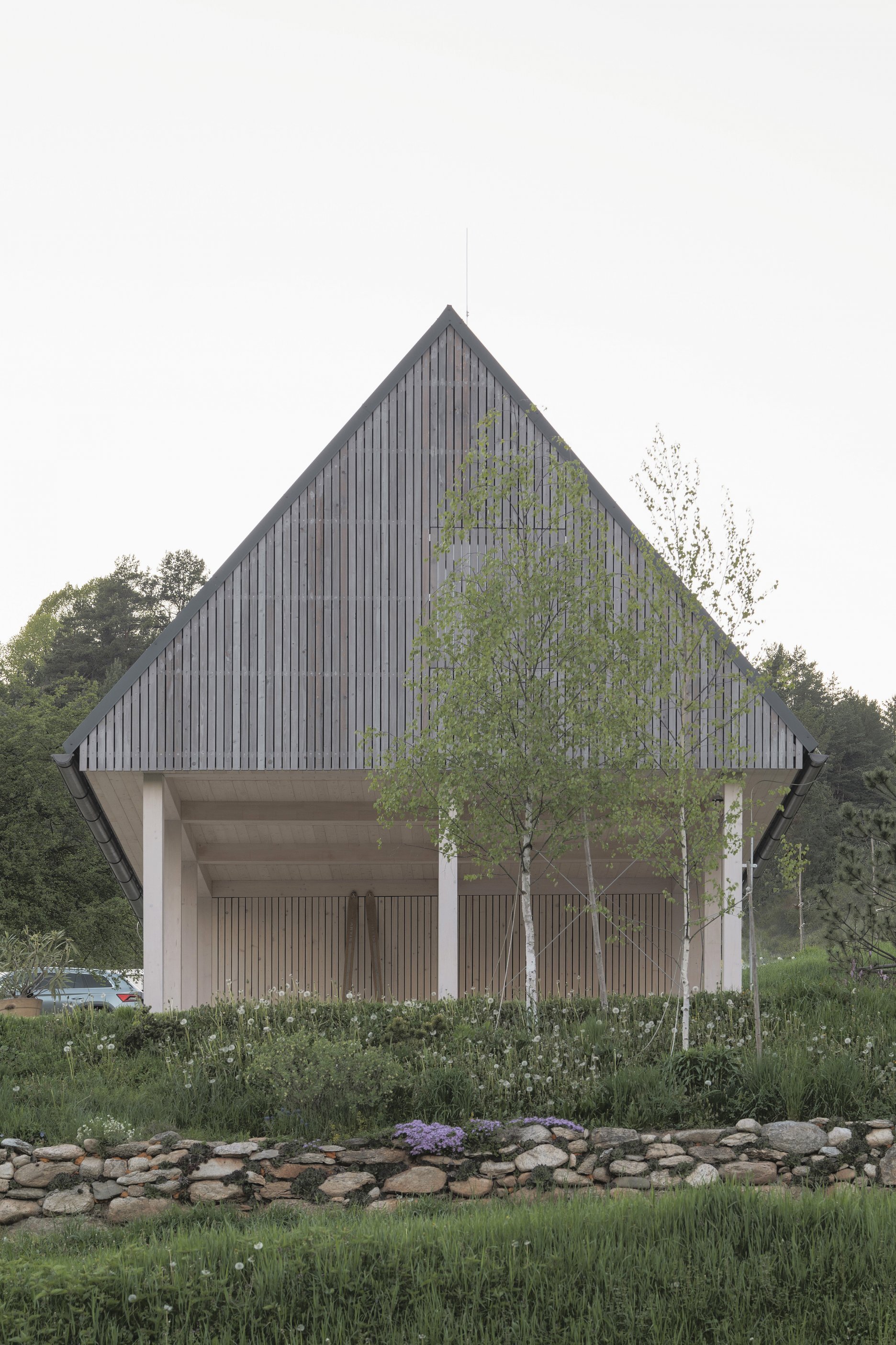 Tomu napokon zodpovedá aj samotná architektúra domu. Jej cieľom bolo pretransformovať tieto tradičné architektonické princípy do novej podoby tak, aby pri zachovaní jednoduchej stavby vznikol vzdušný a presvetlený priestor reflektujúci potreby súčasného bývania s dôrazom na remeselný detail. Všetky obytné priestory sú preto navzájom vizuálne prepojené. Hlavný obytný priestor v strednej časti dispozície je otvorený aj do podkrovia a prepojený s exteriérom pomocou posuvnej presklenej fasády. Podkrovné priestory nad zónou kuchyne a spálne sú naopak využité ako hosťovské izby. Konštrukcia dreveného skeletu je v interiéri priznaná a tvorí dôležitý výtvarný prvok. Farebne ju dopĺňajú tradičná hlinená podlaha v okrajových poliach dispozície a jednoduchá biela omietka deliacich stien na prízemí. Z vonkajšej strany domu sa biela omietka mení na štruktúrovanú hrubozrnnú. Štítové steny domu sú obložené sivým dreveným latovaním, ktoré spolu s plechovou strechou zvýrazňuje jednoduchú geometriu stavby.