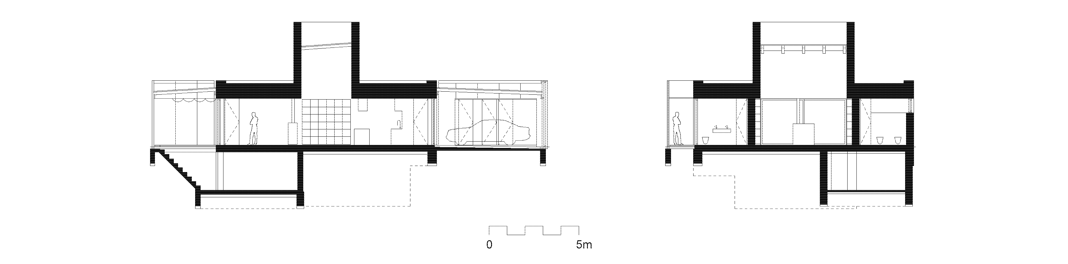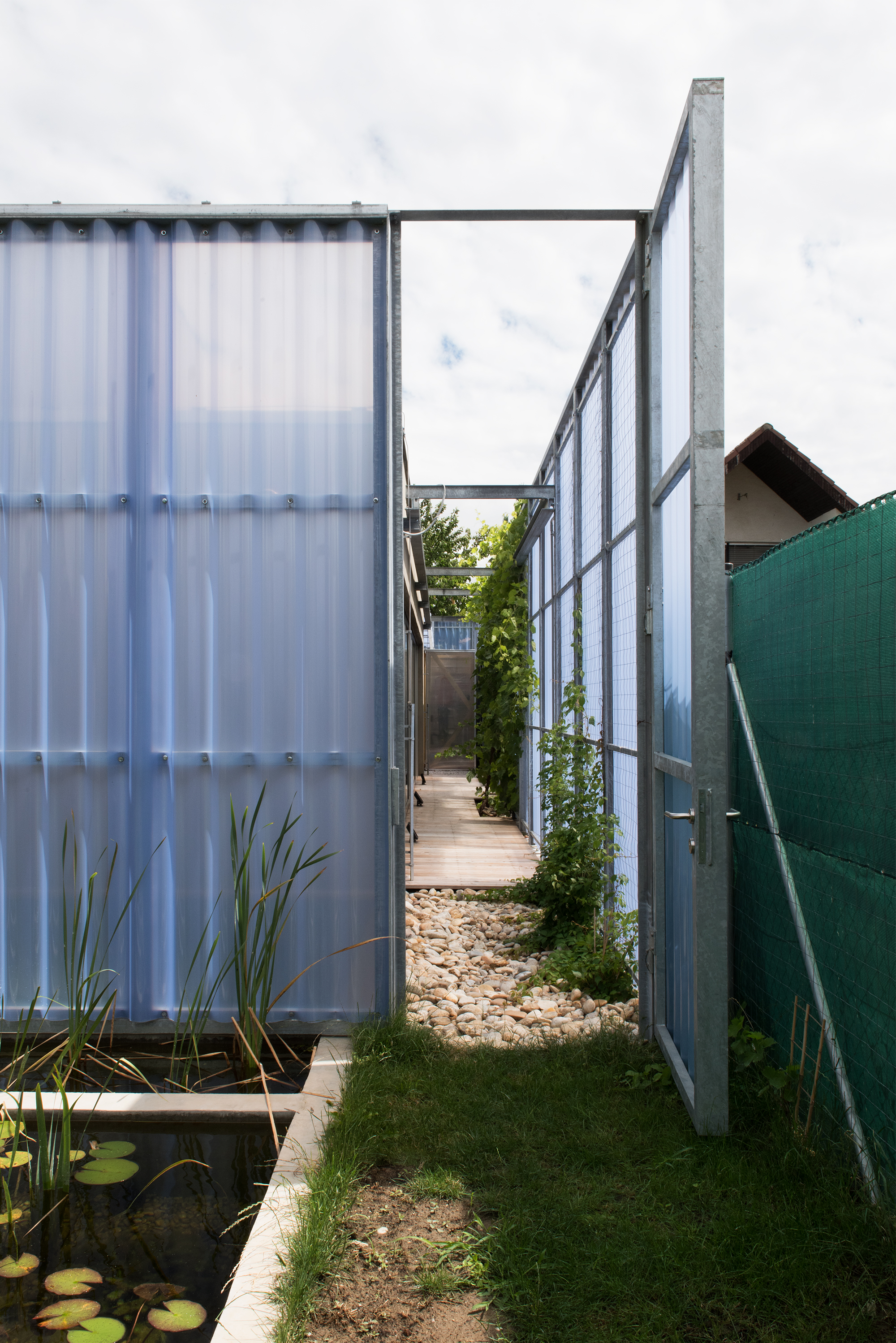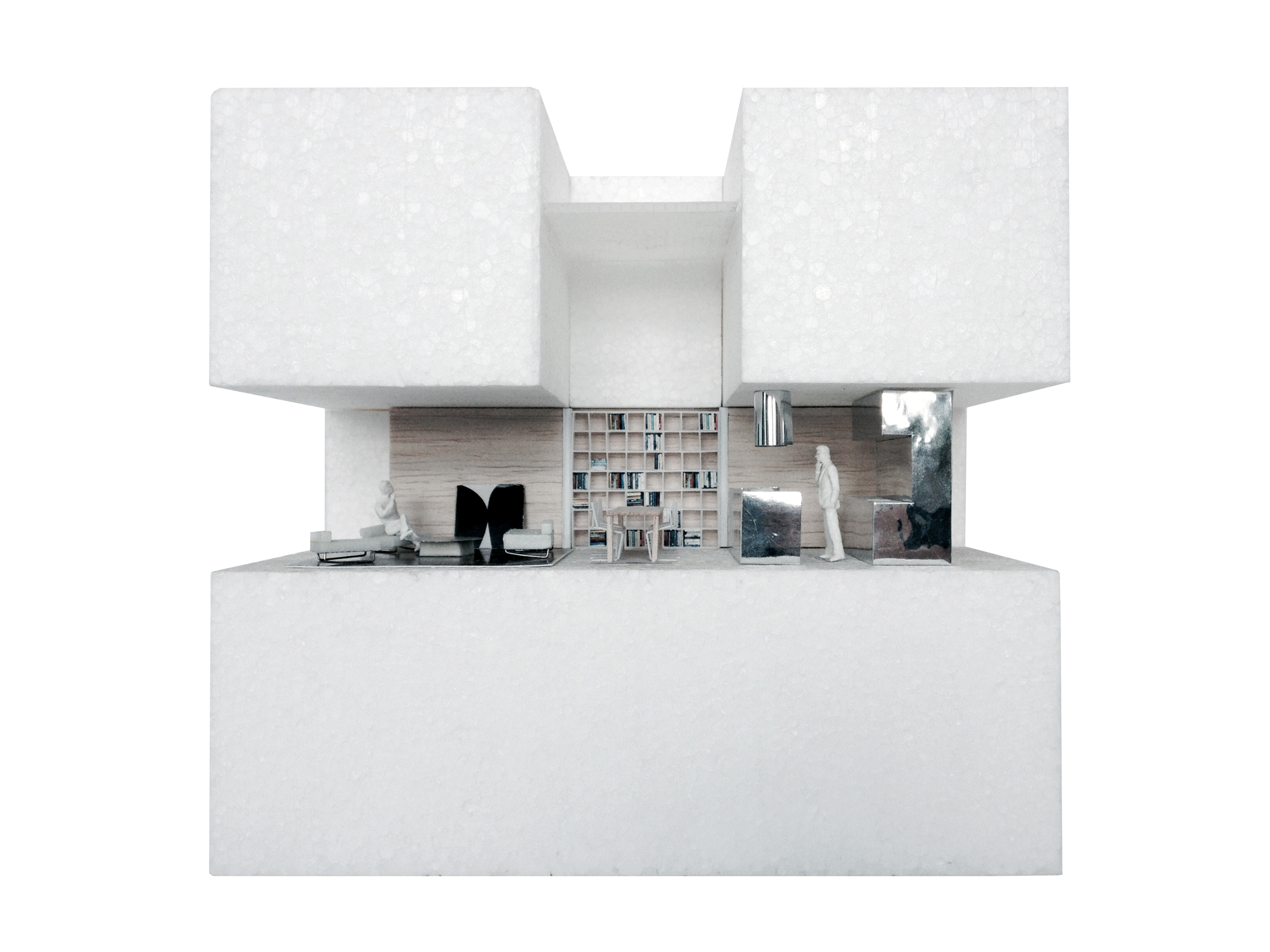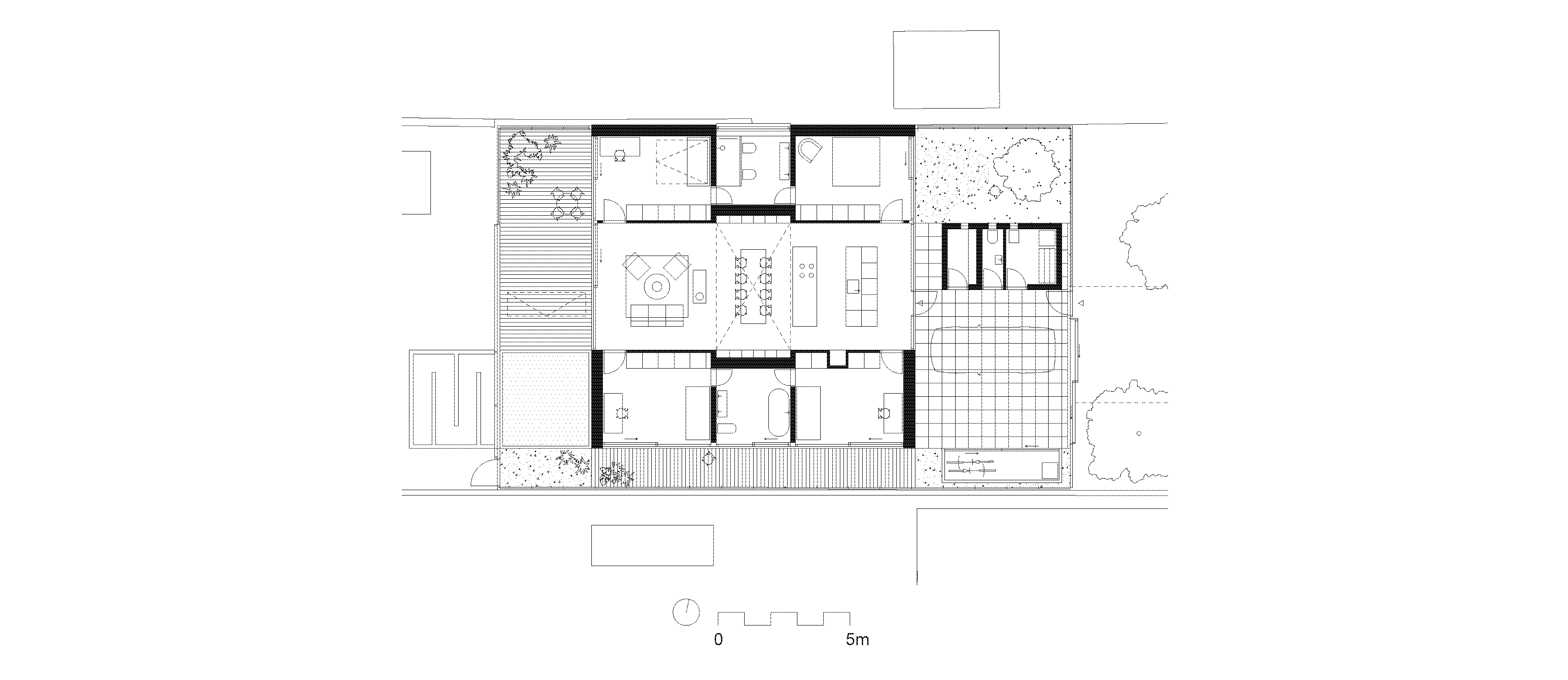 Samotný dom je rozdelený do dvoch sústredných častí – vnútornej a vonkajšej. Vnútorná pozostáva z nevyhnutných obytných miestností v pôdoryse Palladiánskej mriežky 3x3 polia s vertikálne akcentovanou jedálňou v jej centre. Vonkajšiu časť domu vypĺňujú doplnkové funkcie, ktoré nevyžadujú celoročné alebo permanentné využitie – pátiá rôznych veľkostí a proporcií, garáž, bazén a skladové priestory. Táto časť je akýmsi medzipriestorom, nie je ani domom, ani záhradou. Je ich mediátorom.