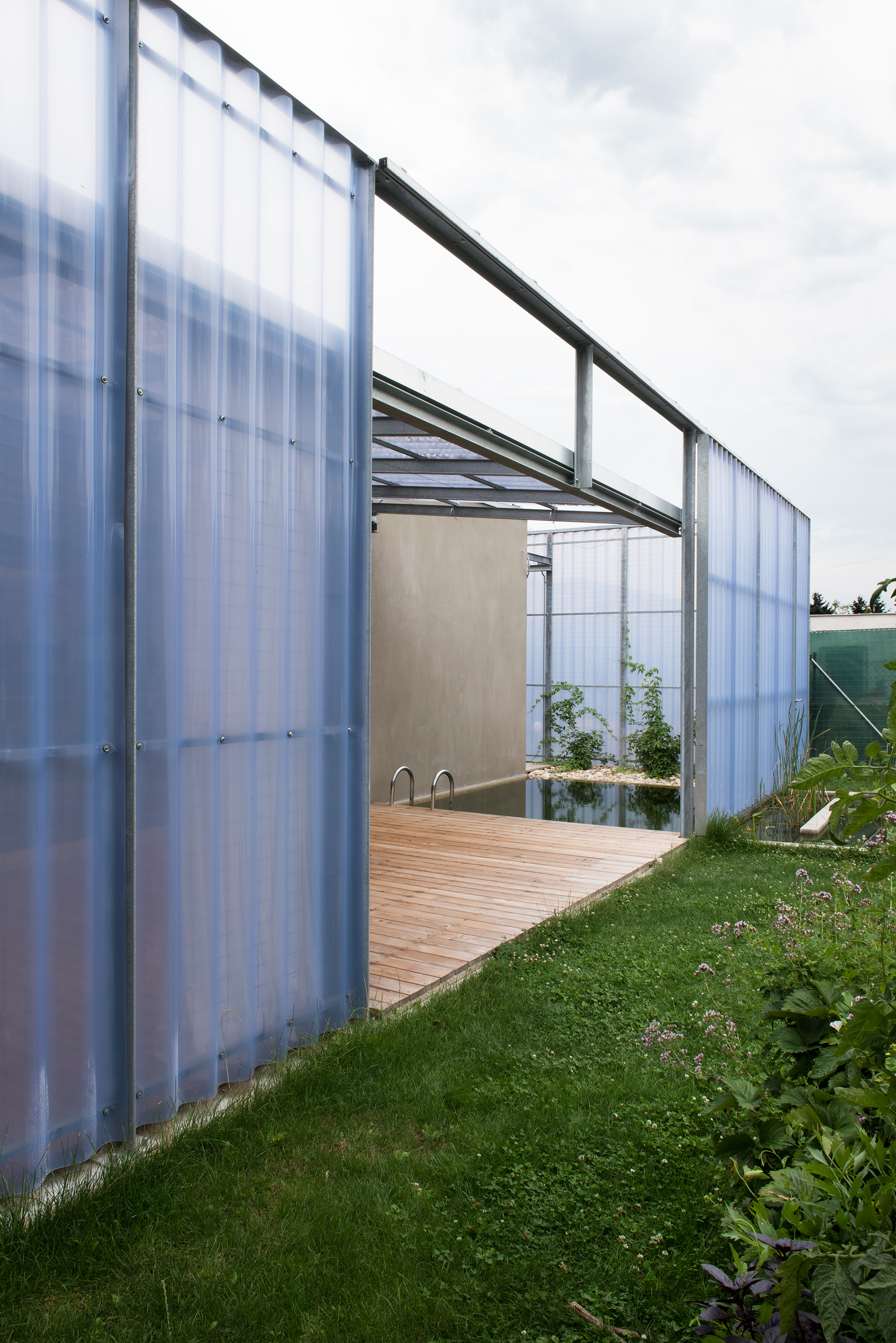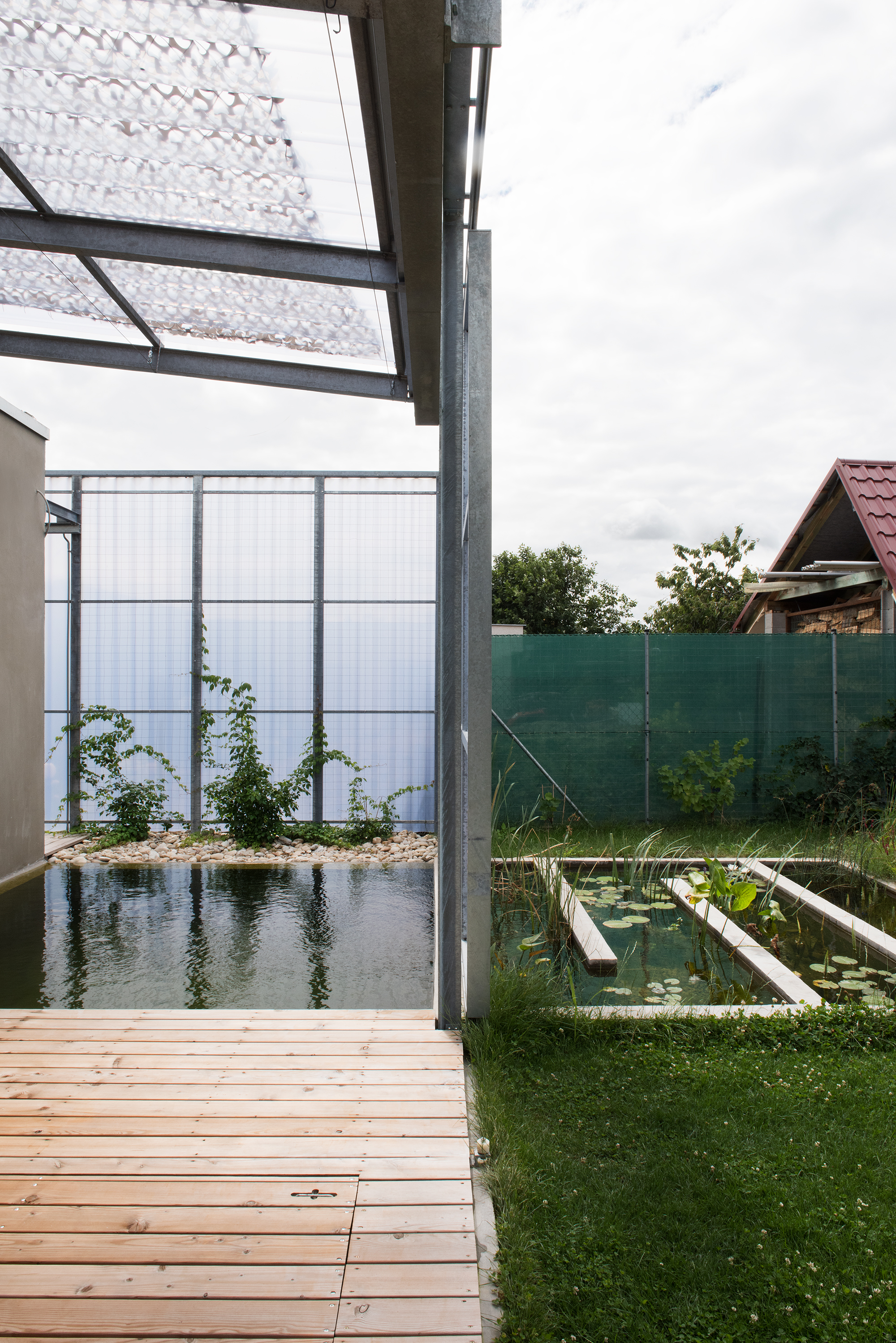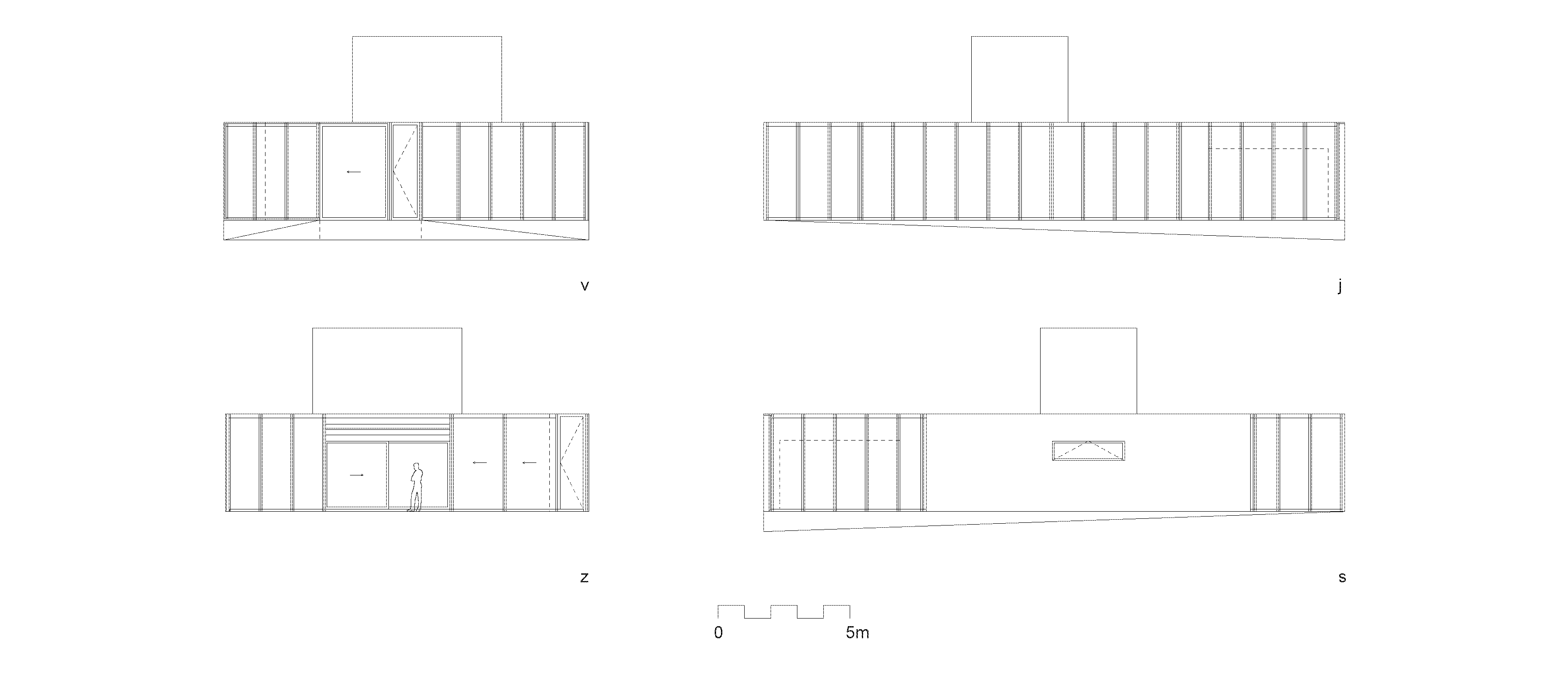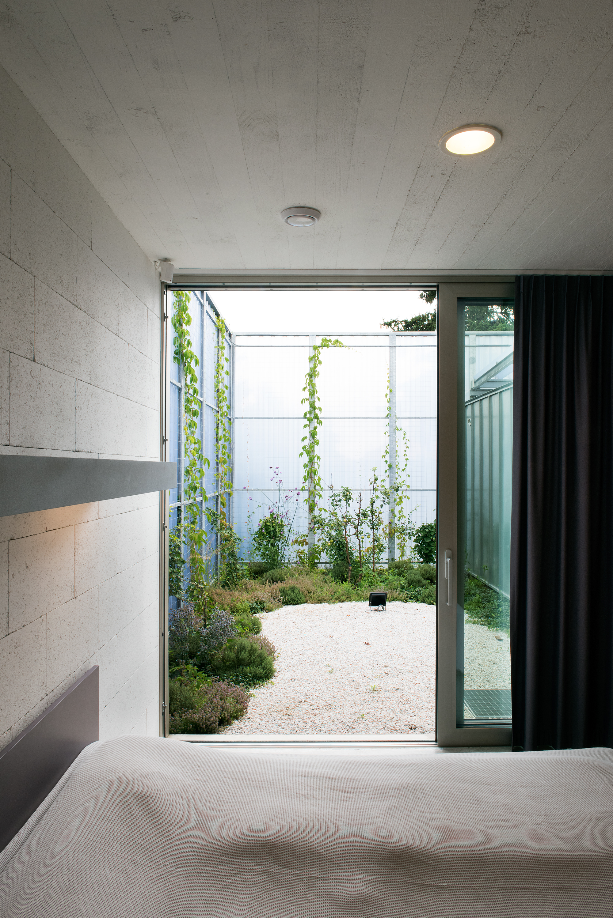 Samotný dom je rozdelený do dvoch sústredných častí – vnútornej a vonkajšej. Vnútorná pozostáva z nevyhnutných obytných miestností v pôdoryse Palladiánskej mriežky 3x3 polia s vertikálne akcentovanou jedálňou v jej centre. Vonkajšiu časť domu vypĺňujú doplnkové funkcie, ktoré nevyžadujú celoročné alebo permanentné využitie – pátiá rôznych veľkostí a proporcií, garáž, bazén a skladové priestory. Táto časť je akýmsi medzipriestorom, nie je ani domom, ani záhradou. Je ich mediátorom.