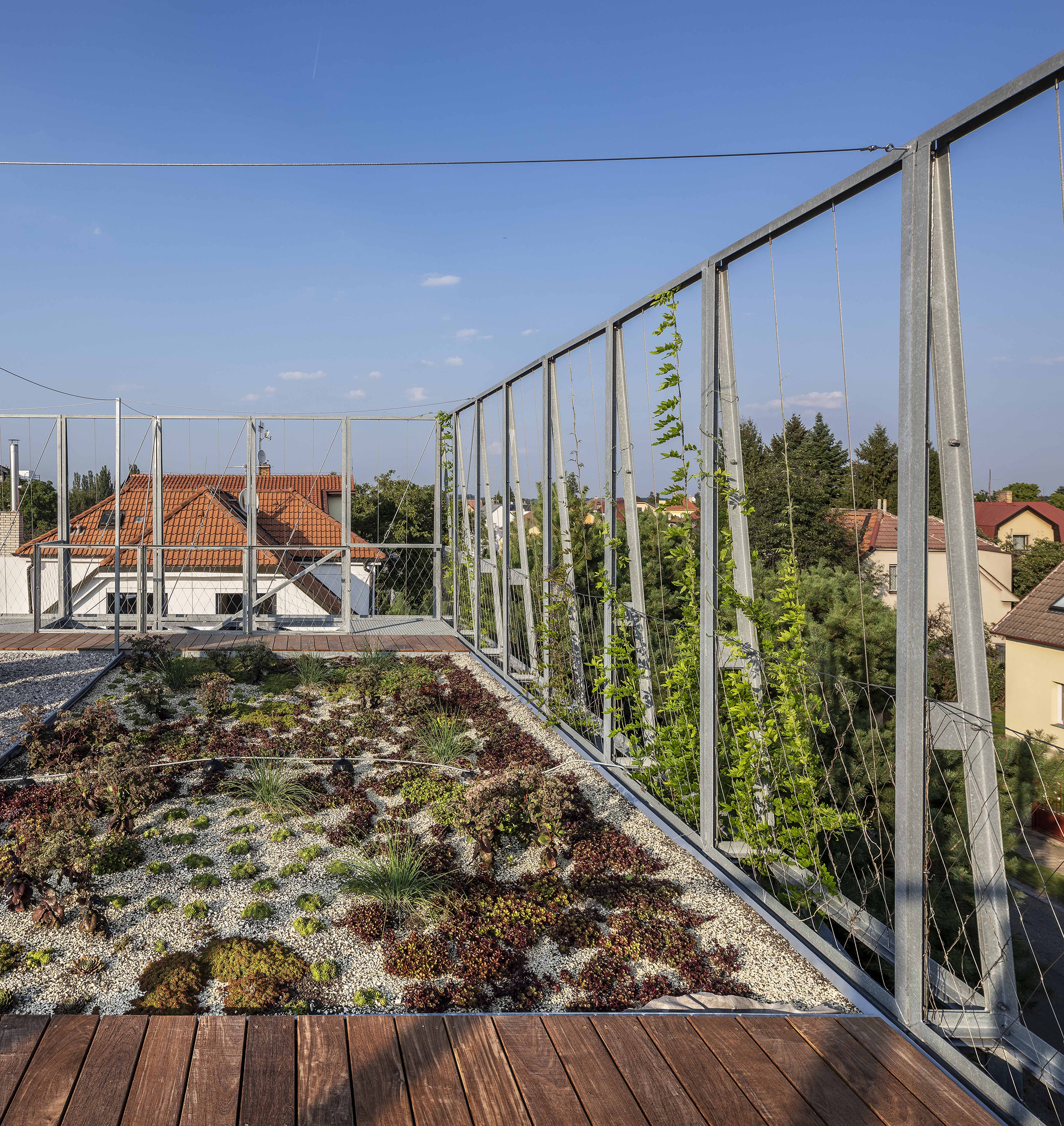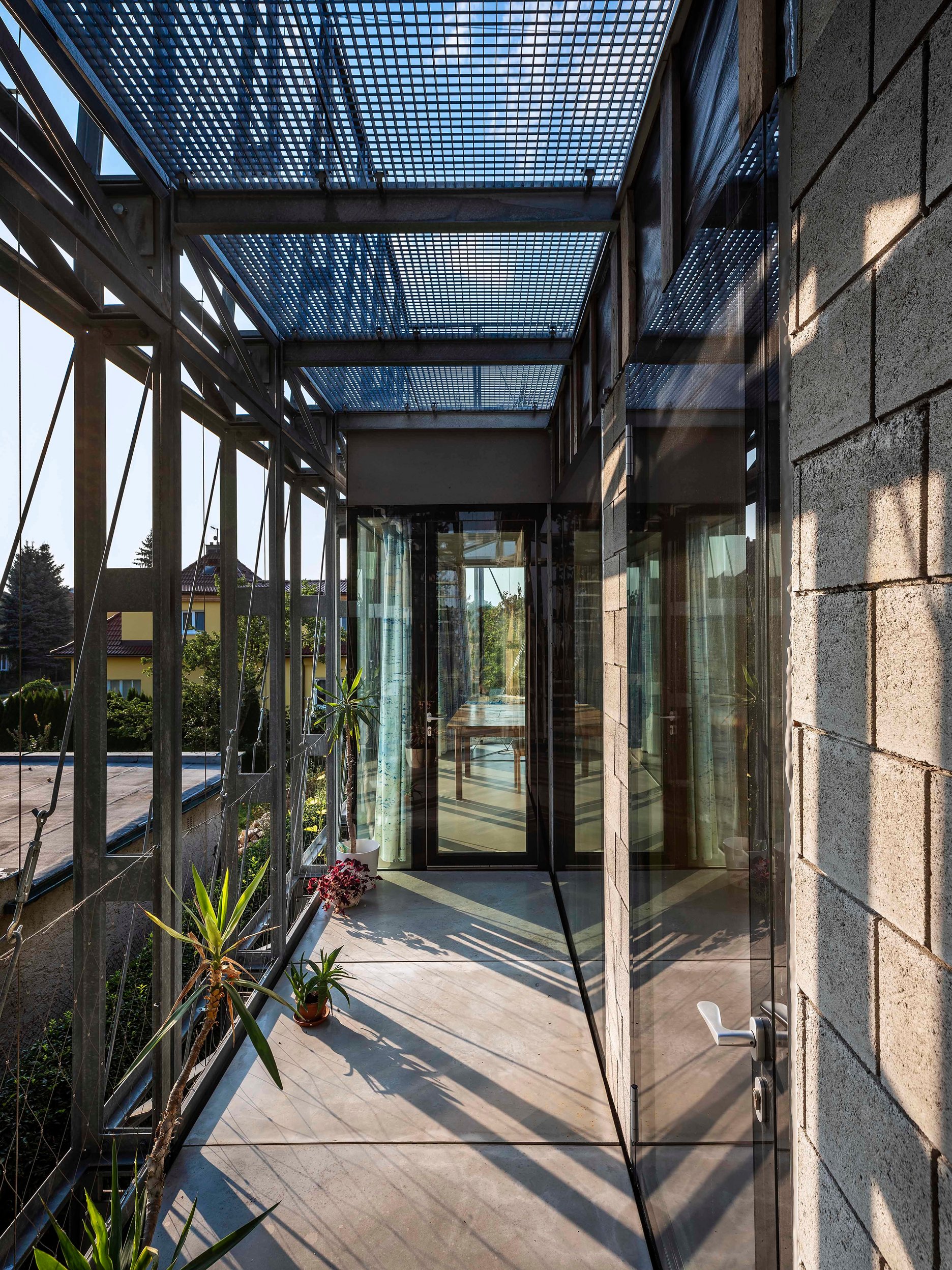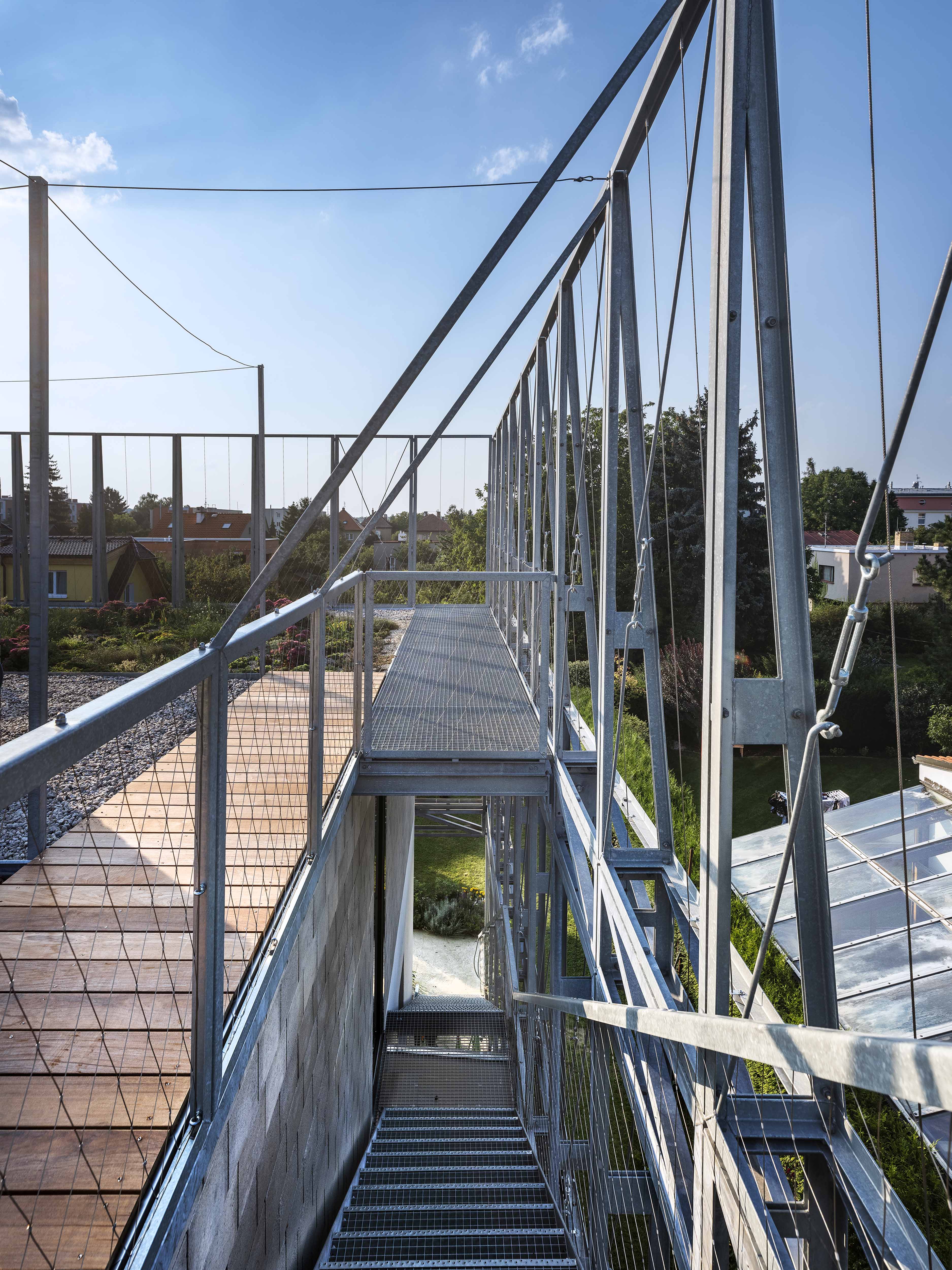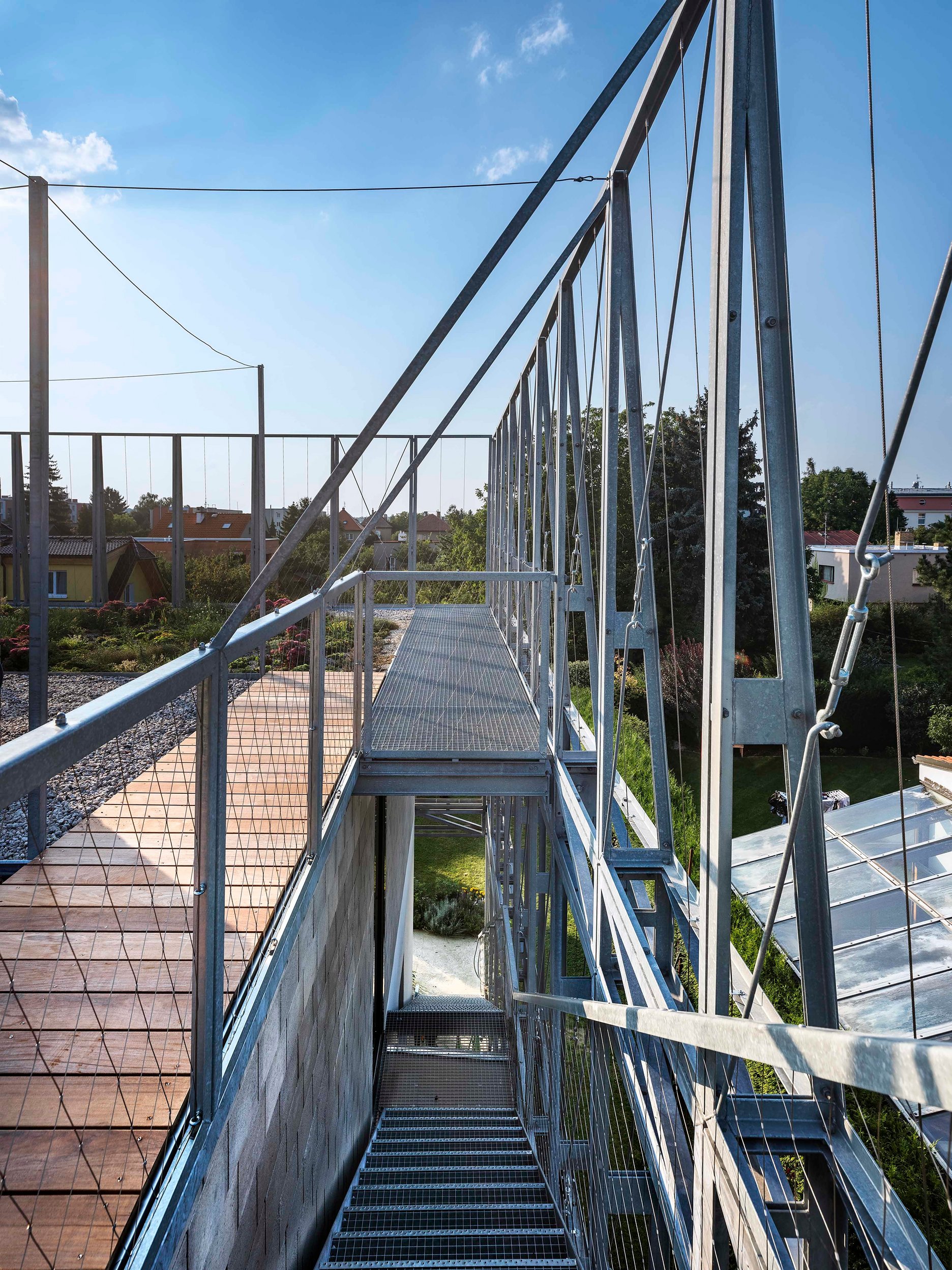 Zděná konstrukce druhého patra z lehkých betonových tvárnic doplňuje nosnou ocelovou část a pomáhá vynést novou střešní železobetonovou desku, která slouží jako pochozí terasa se zahradní úpravou. Přístup na střechu rovnou ze zahrady umožňuje obslužné schodiště, které je navrženo z boční strany objektu v rámci ocelové konstrukce.