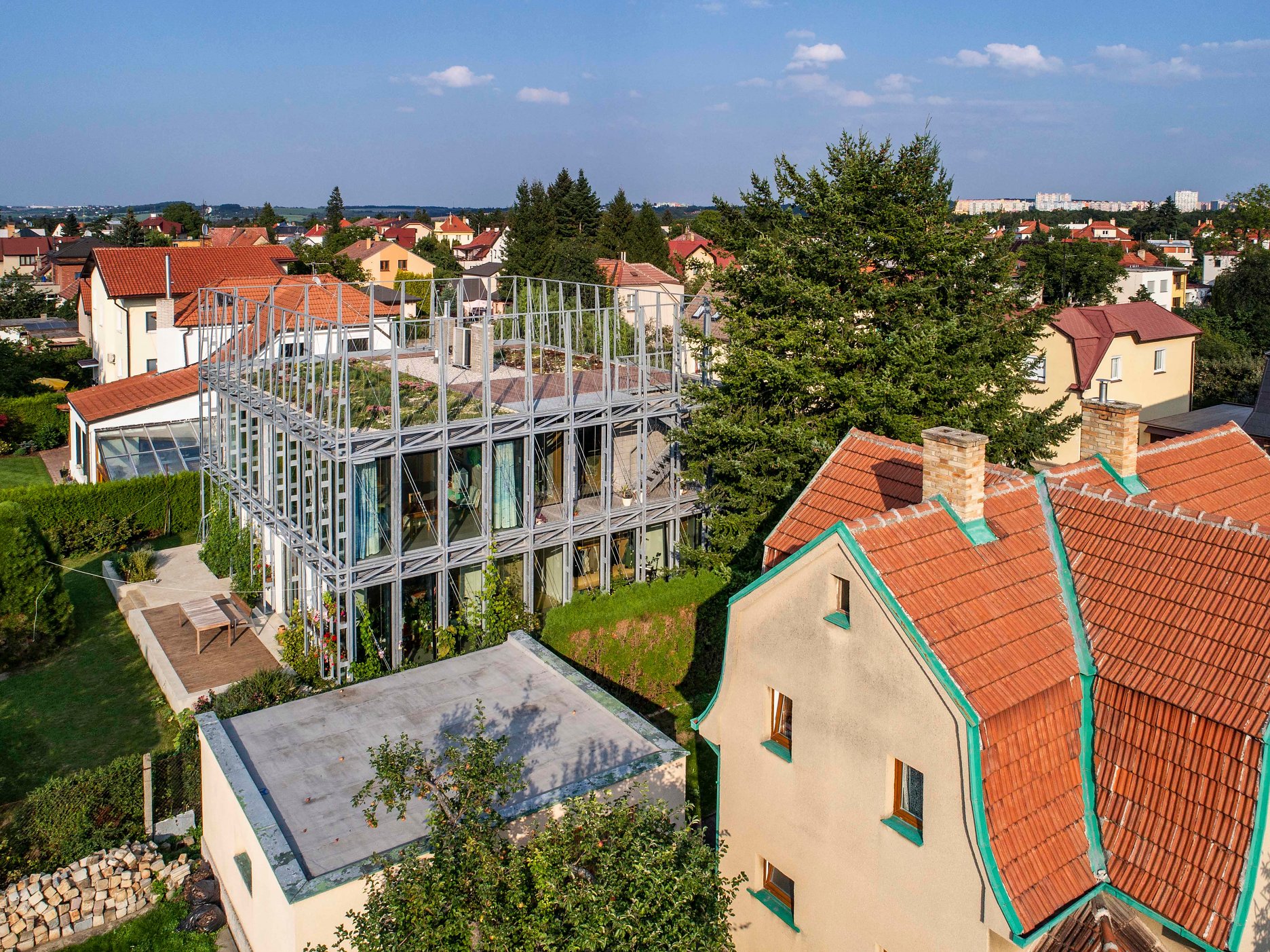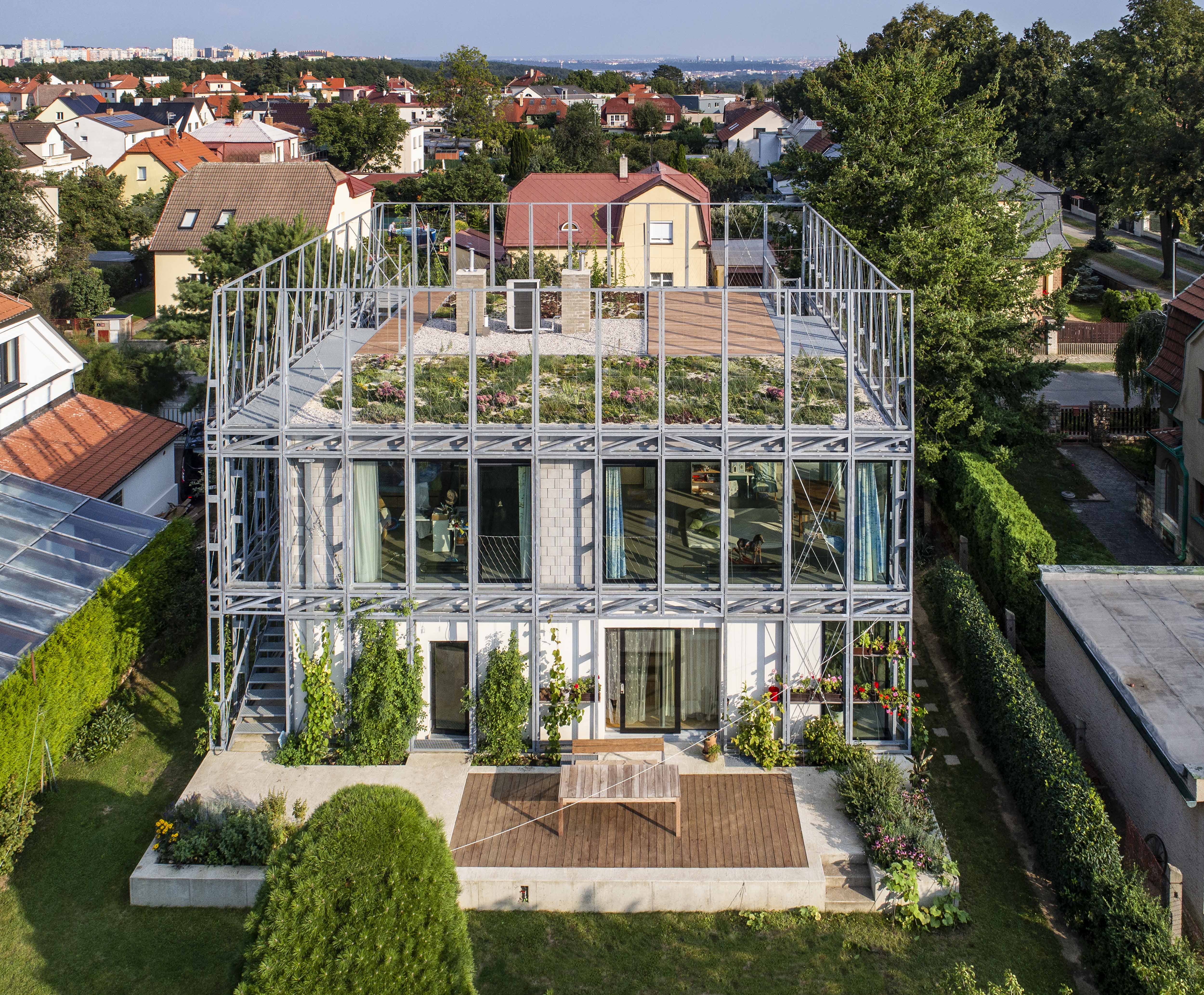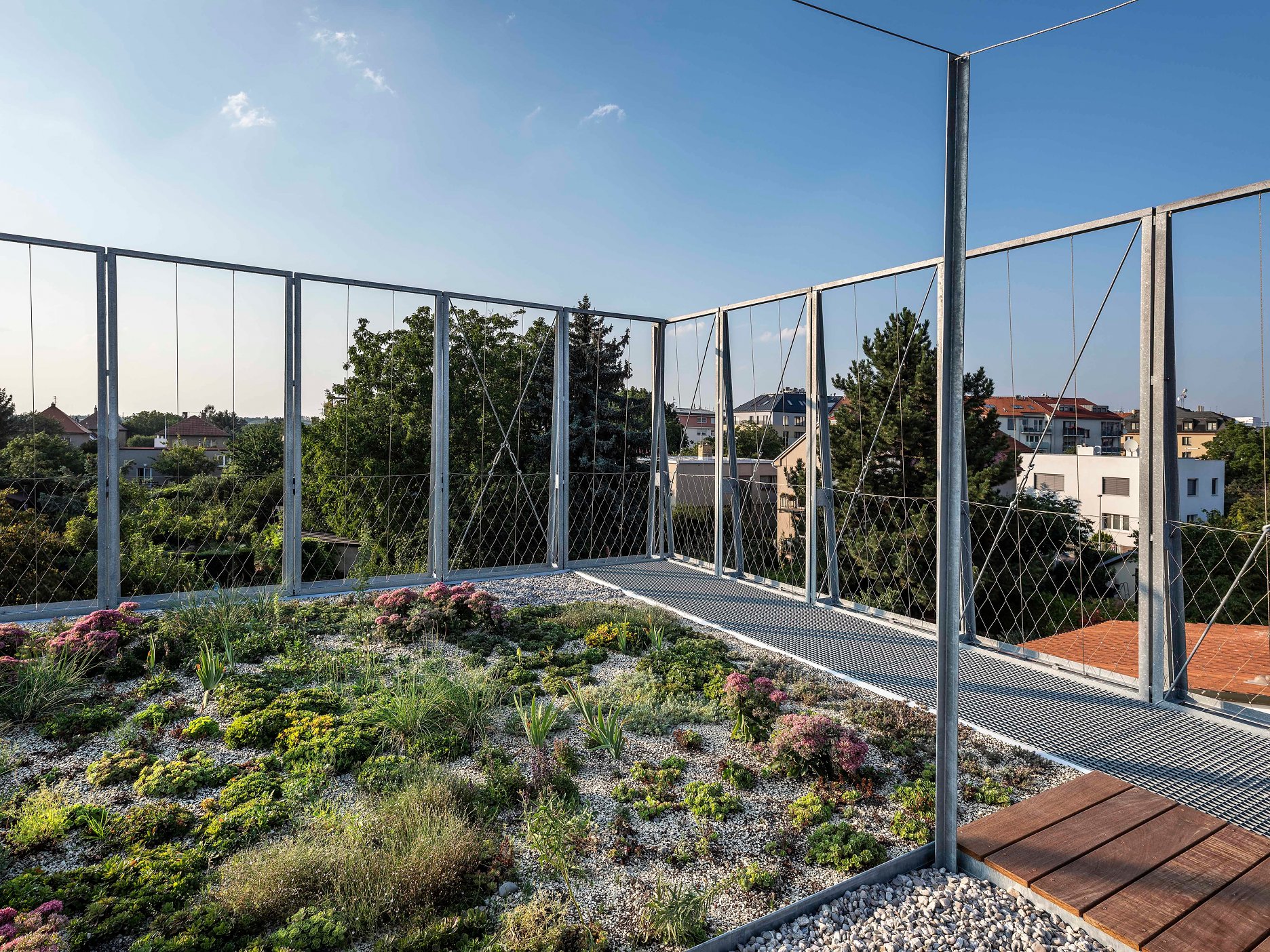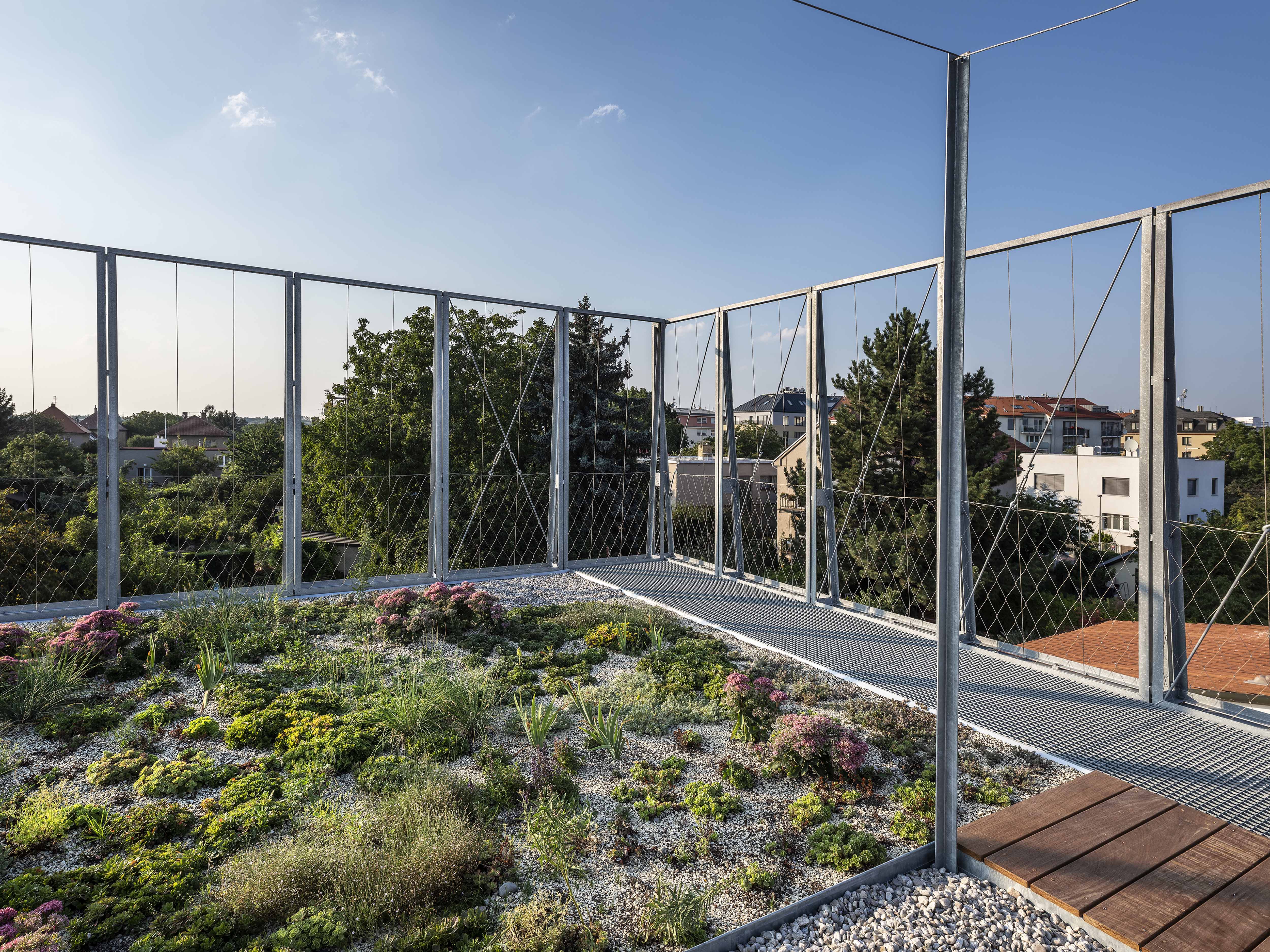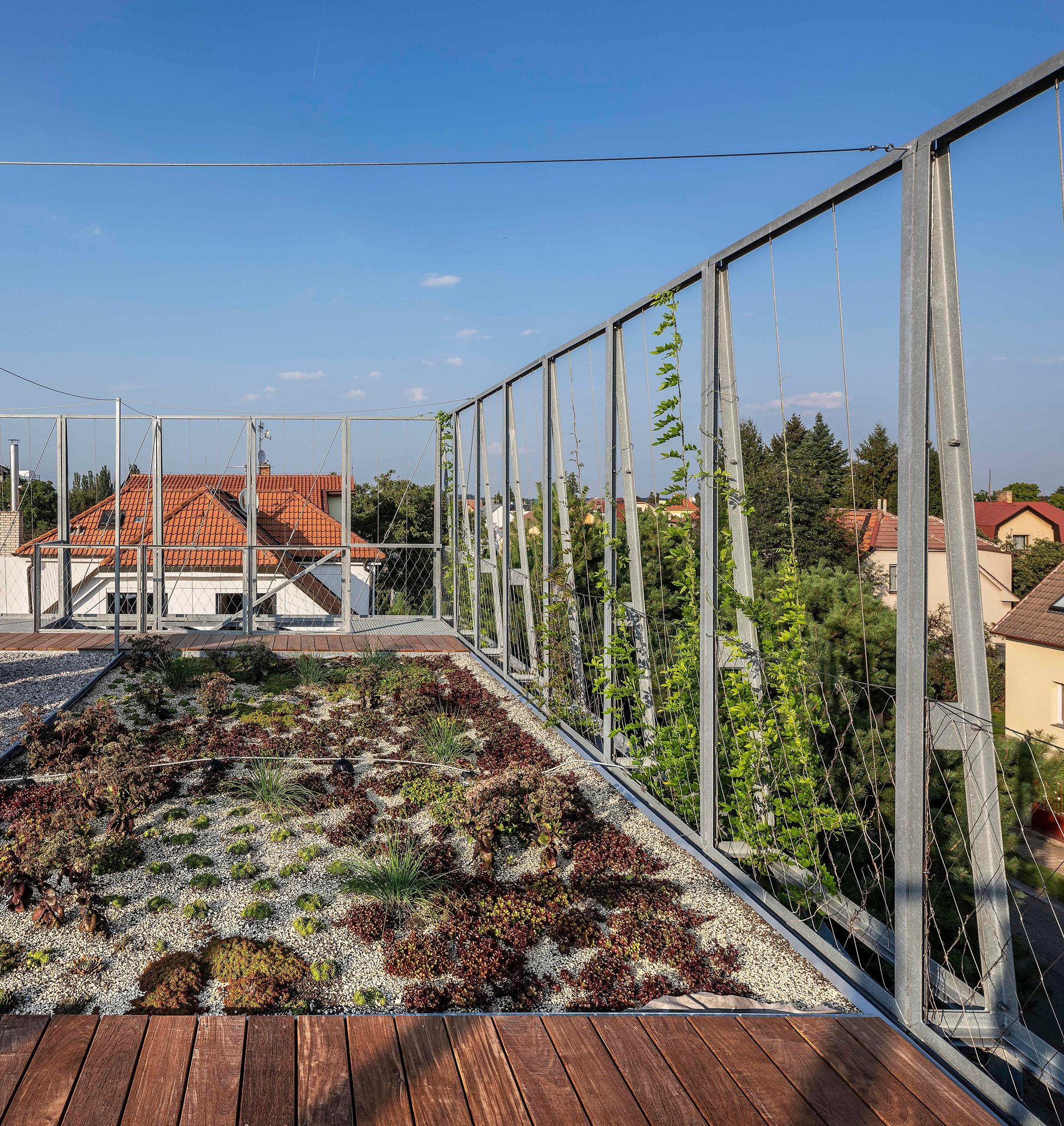 Zděná konstrukce druhého patra z lehkých betonových tvárnic doplňuje nosnou ocelovou část a pomáhá vynést novou střešní železobetonovou desku, která slouží jako pochozí terasa se zahradní úpravou. Přístup na střechu rovnou ze zahrady umožňuje obslužné schodiště, které je navrženo z boční strany objektu v rámci ocelové konstrukce.