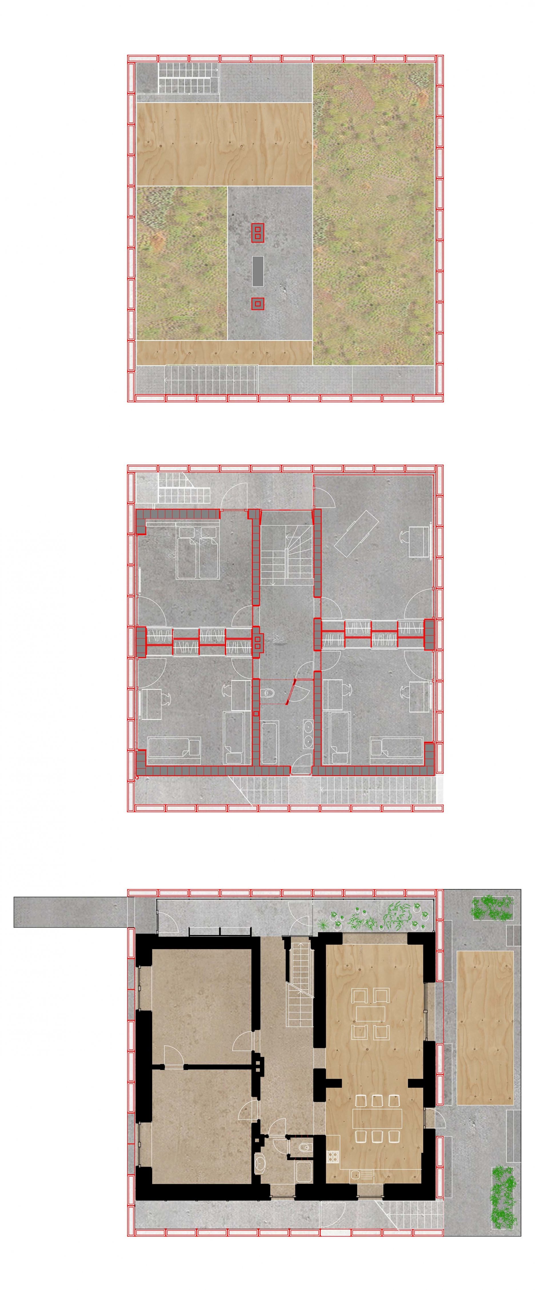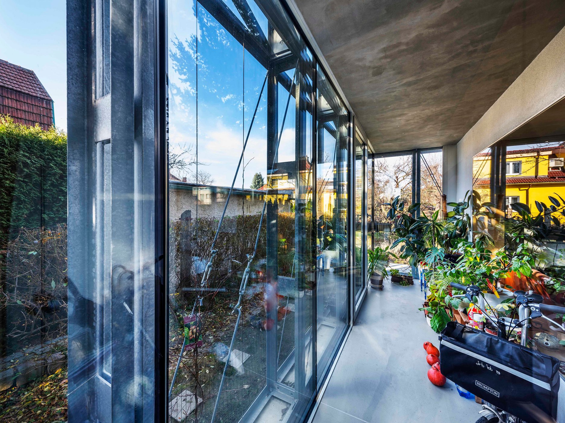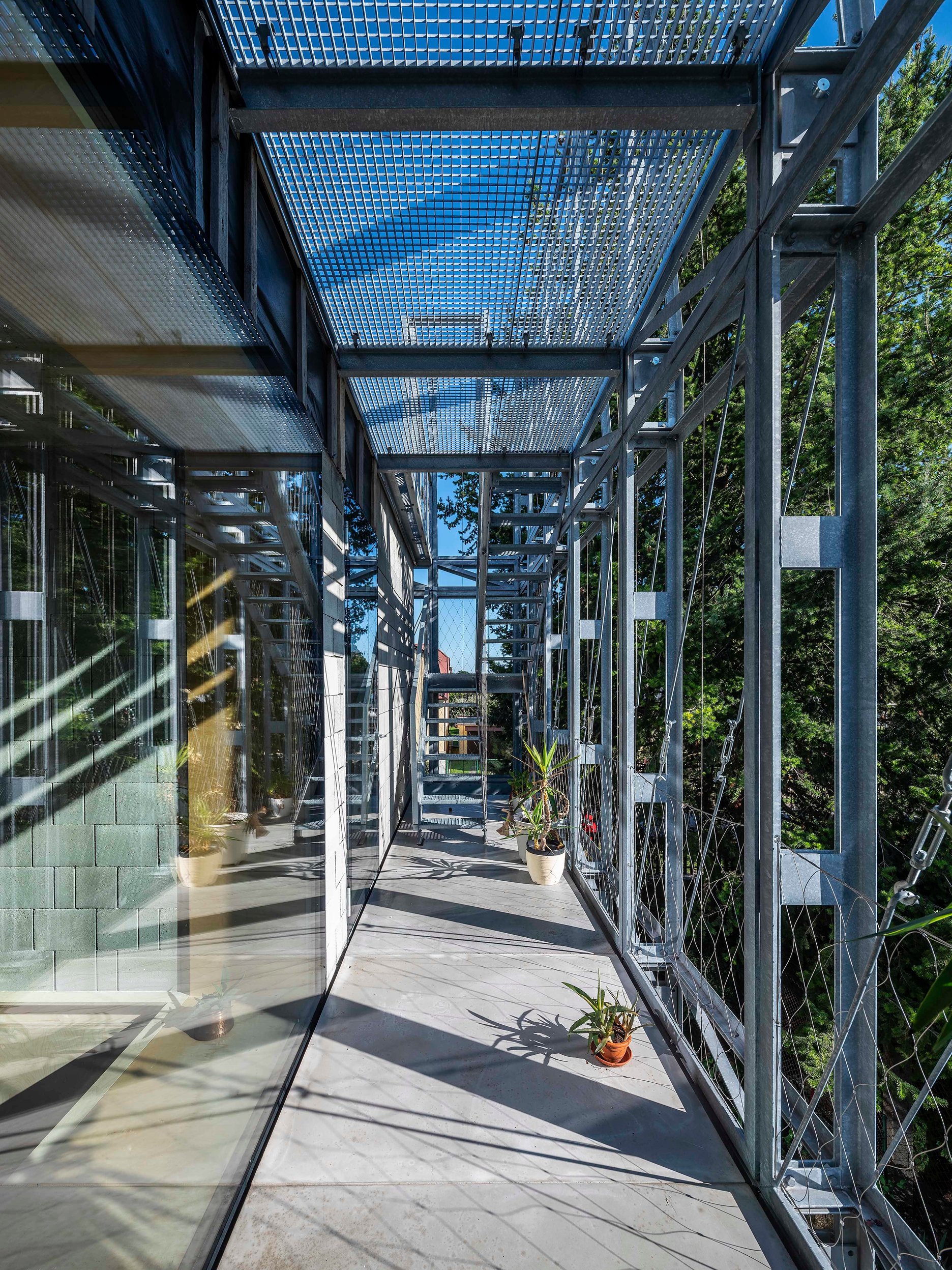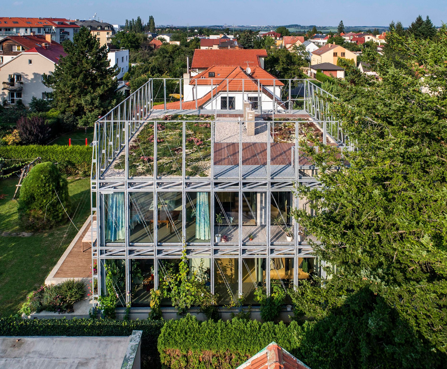 Zděná konstrukce druhého patra z lehkých betonových tvárnic doplňuje nosnou ocelovou část a pomáhá vynést novou střešní železobetonovou desku, která slouží jako pochozí terasa se zahradní úpravou. Přístup na střechu rovnou ze zahrady umožňuje obslužné schodiště, které je navrženo z boční strany objektu v rámci ocelové konstrukce.
