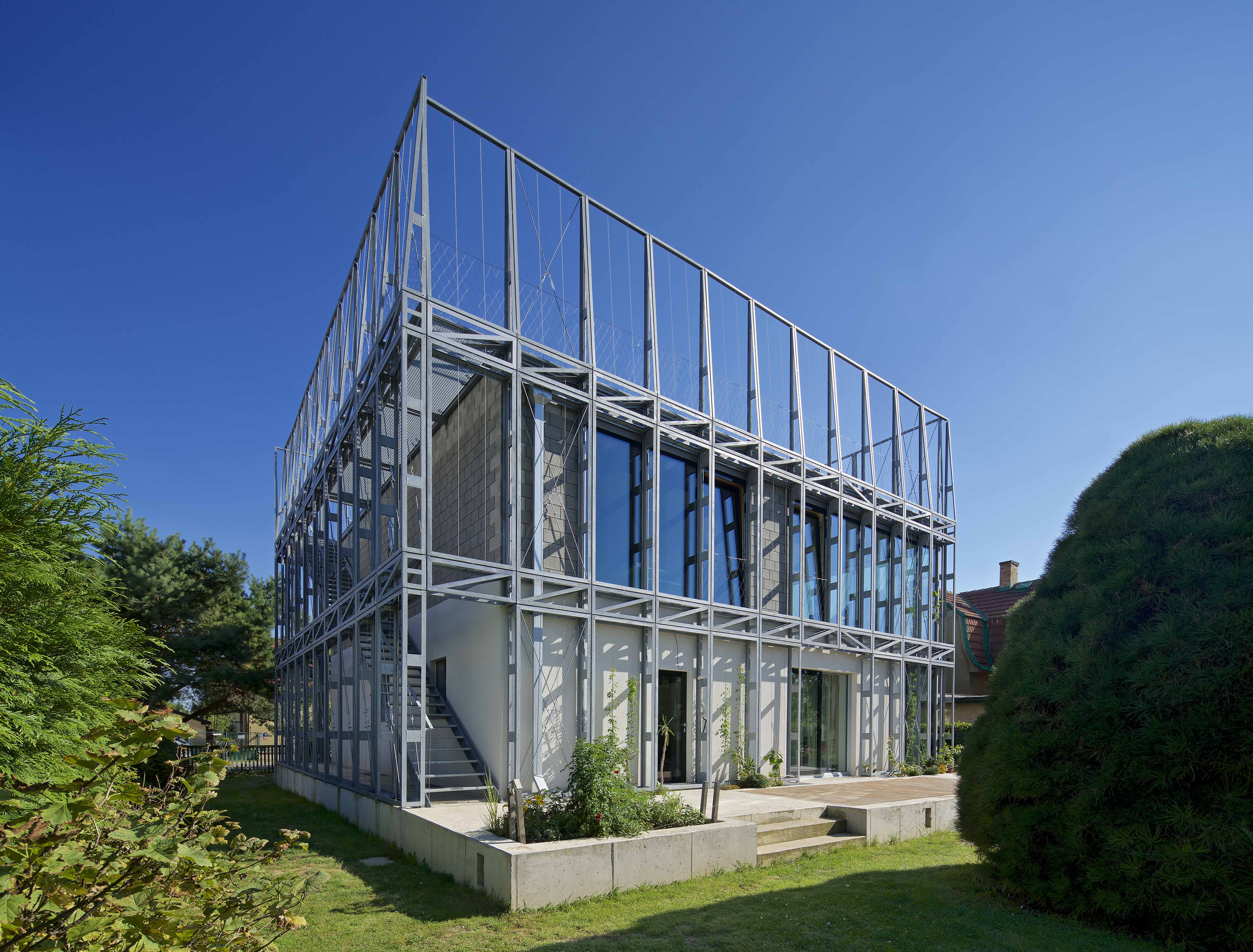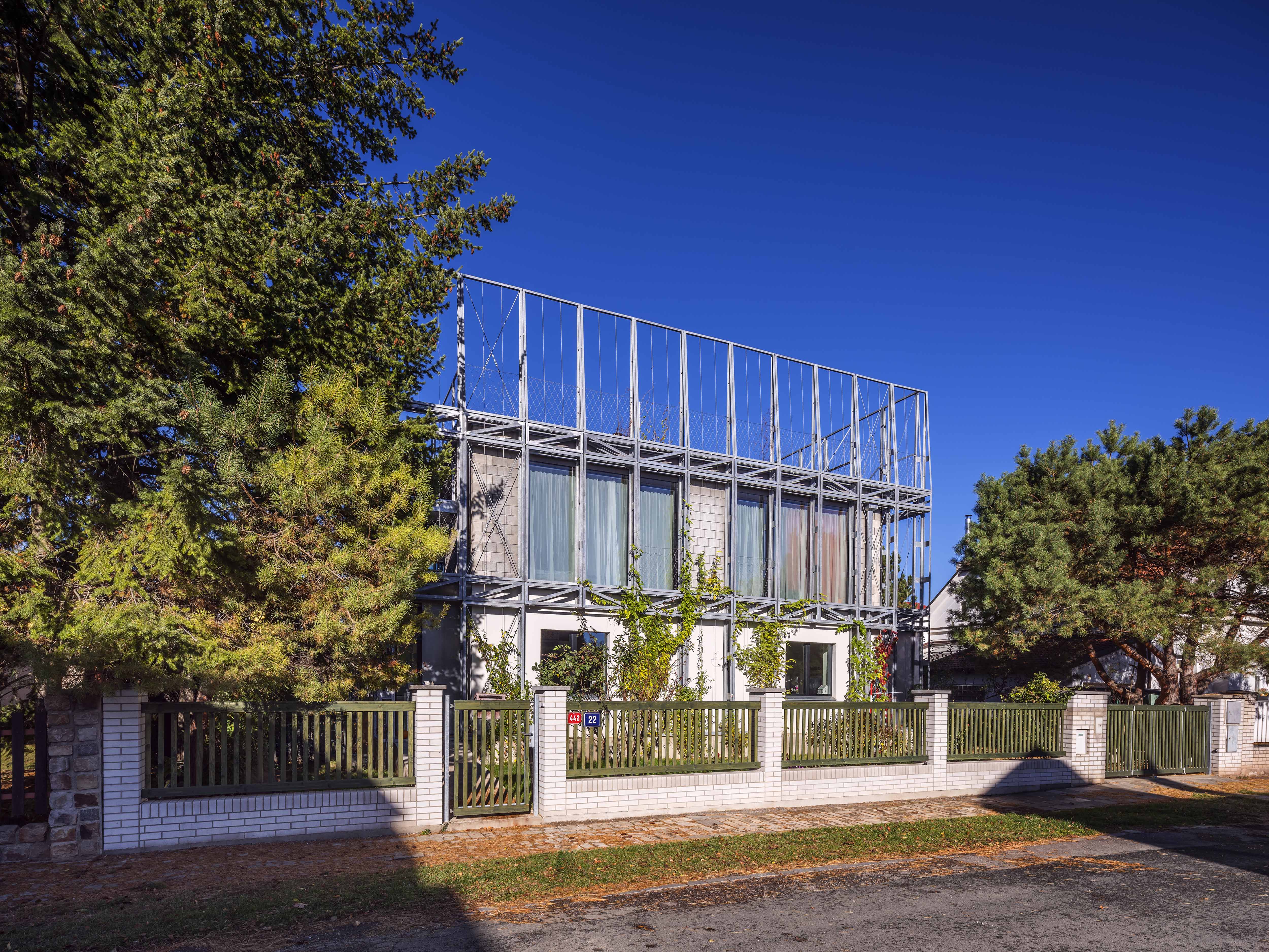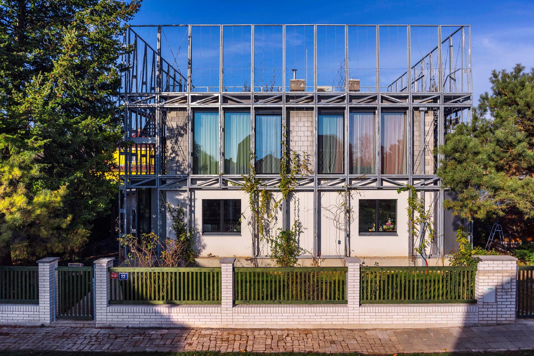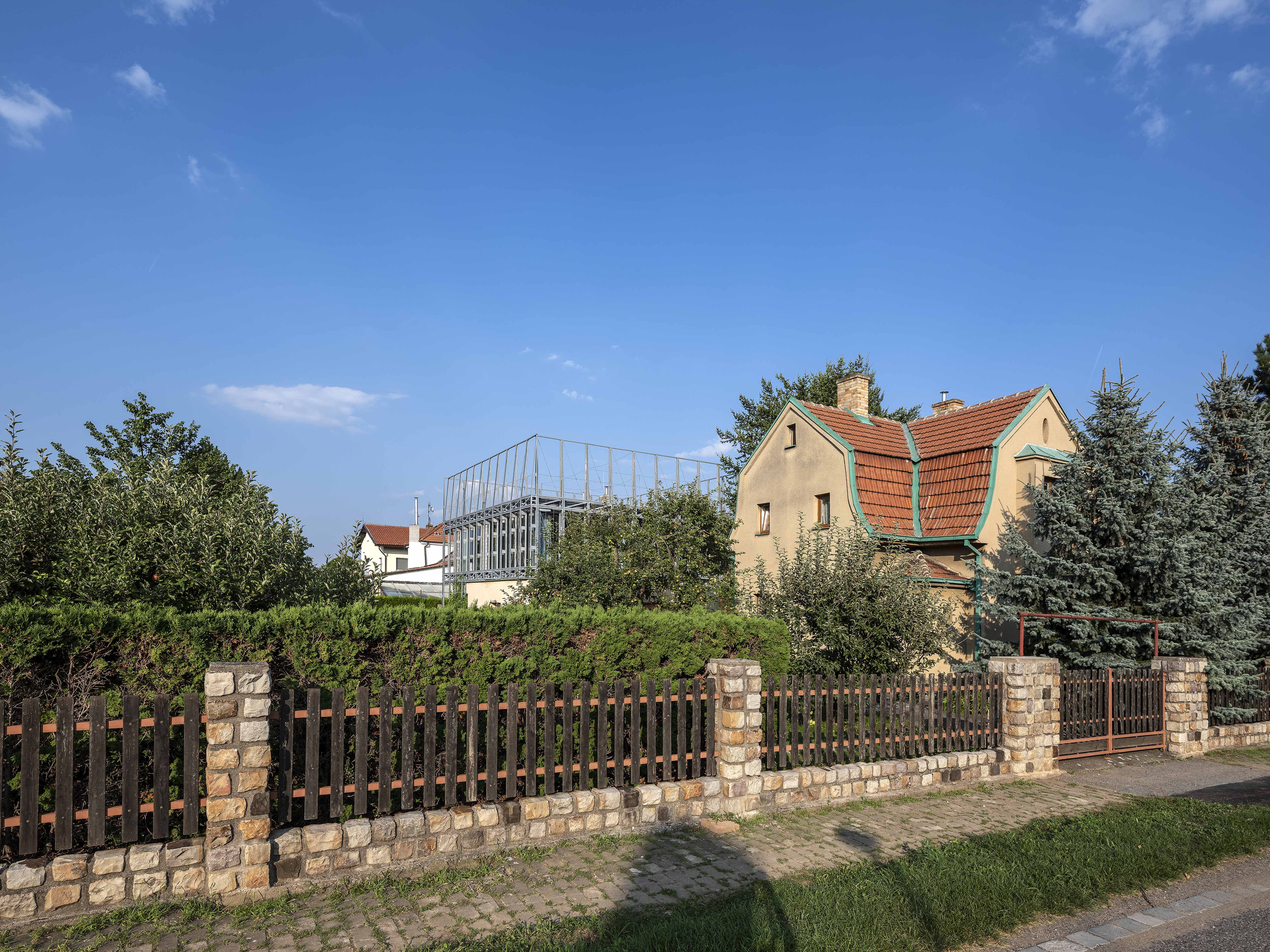 Prvorepublikový víkendový dom bol zbavený neskoršej nadstavby, ktorá spôsobovala statické problémy. Nový, oceľový exoskelet nepôsobí iba ako dodatočný ztužujúci prvok. Predsadená konštrukcia pomáha niesť stropnú dosku a rozsiahlu strešnú terasu. Integruje obslužné schodisko, zjednocuje exteriér, slúži ako treláž pre popínavé rastliny.
