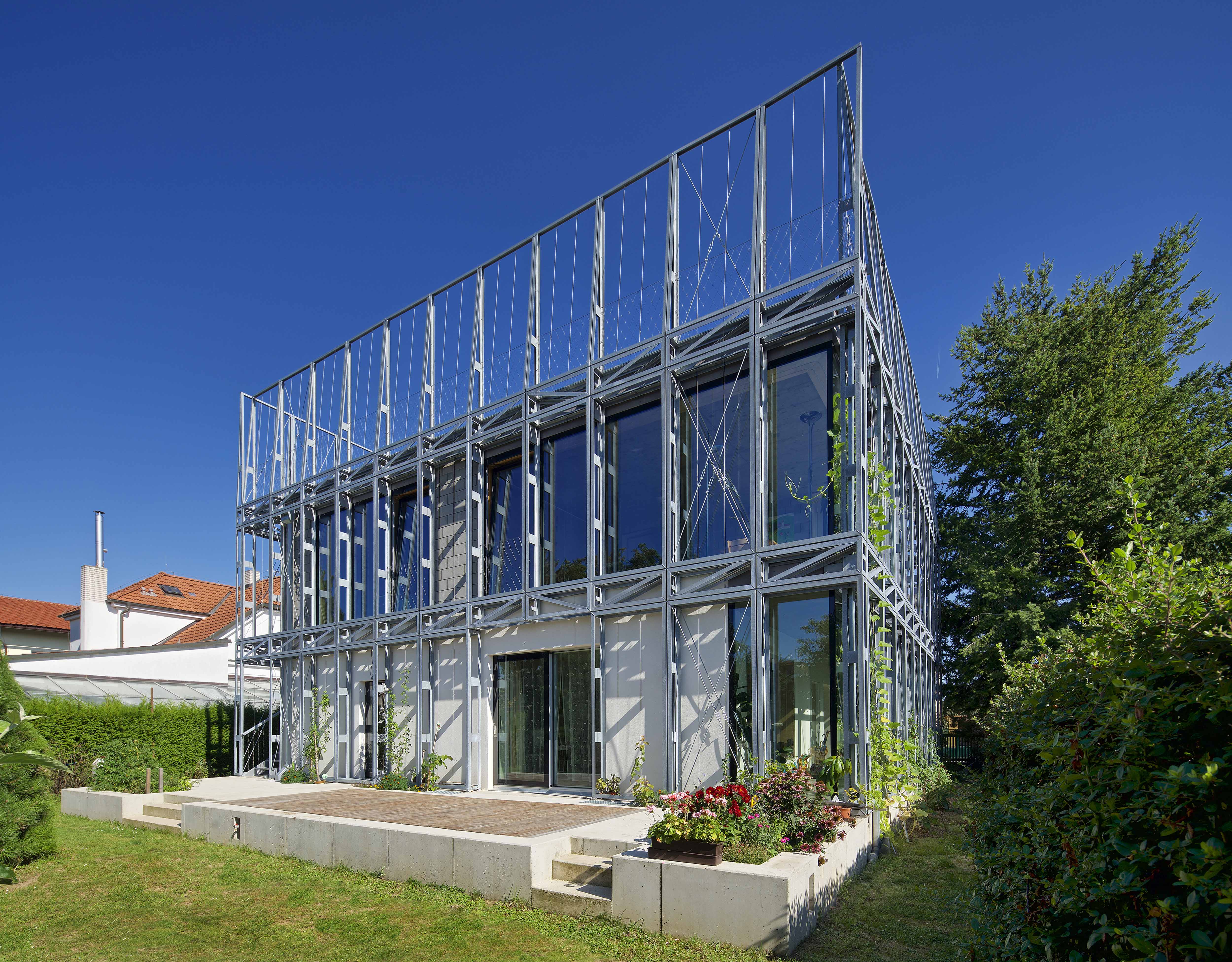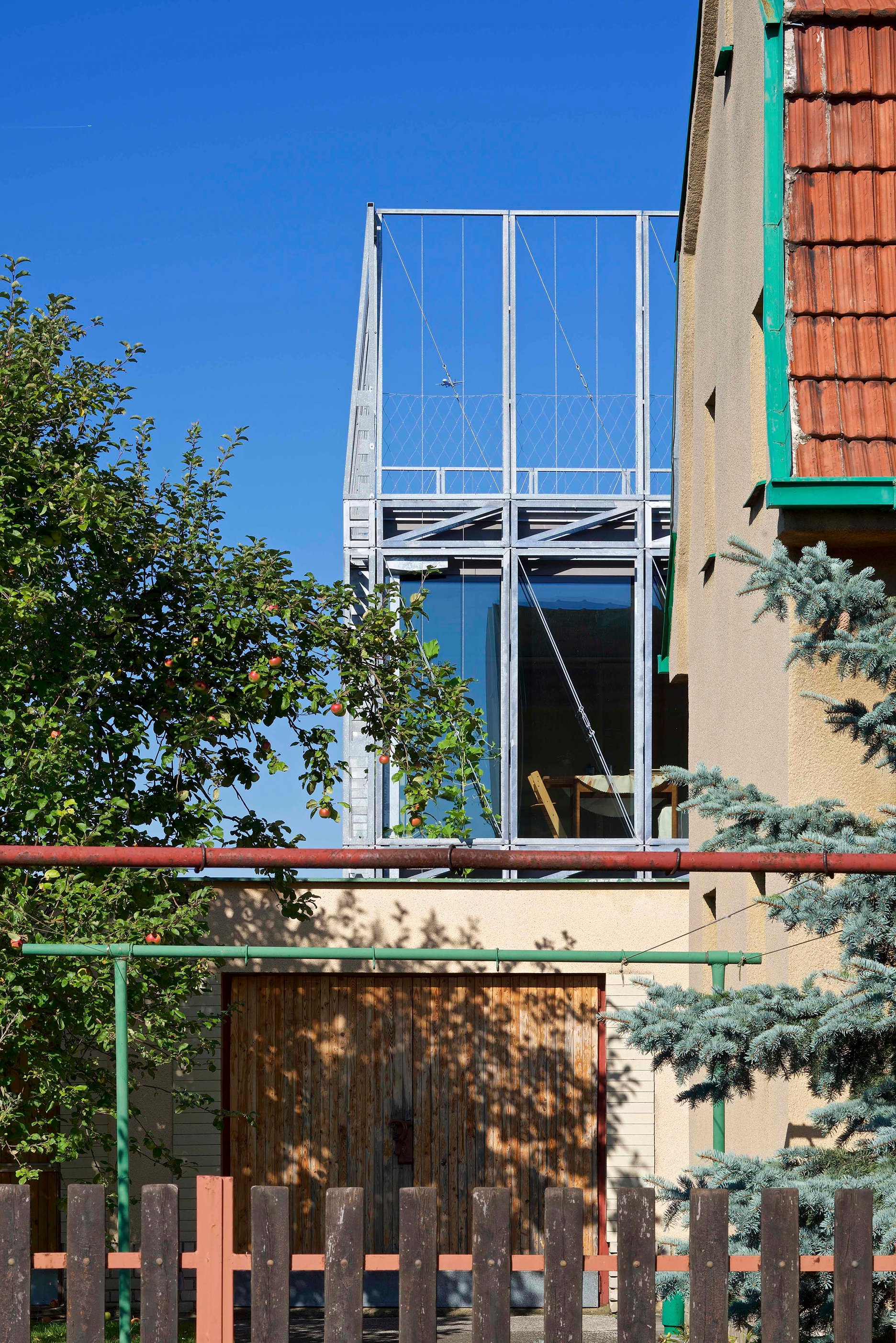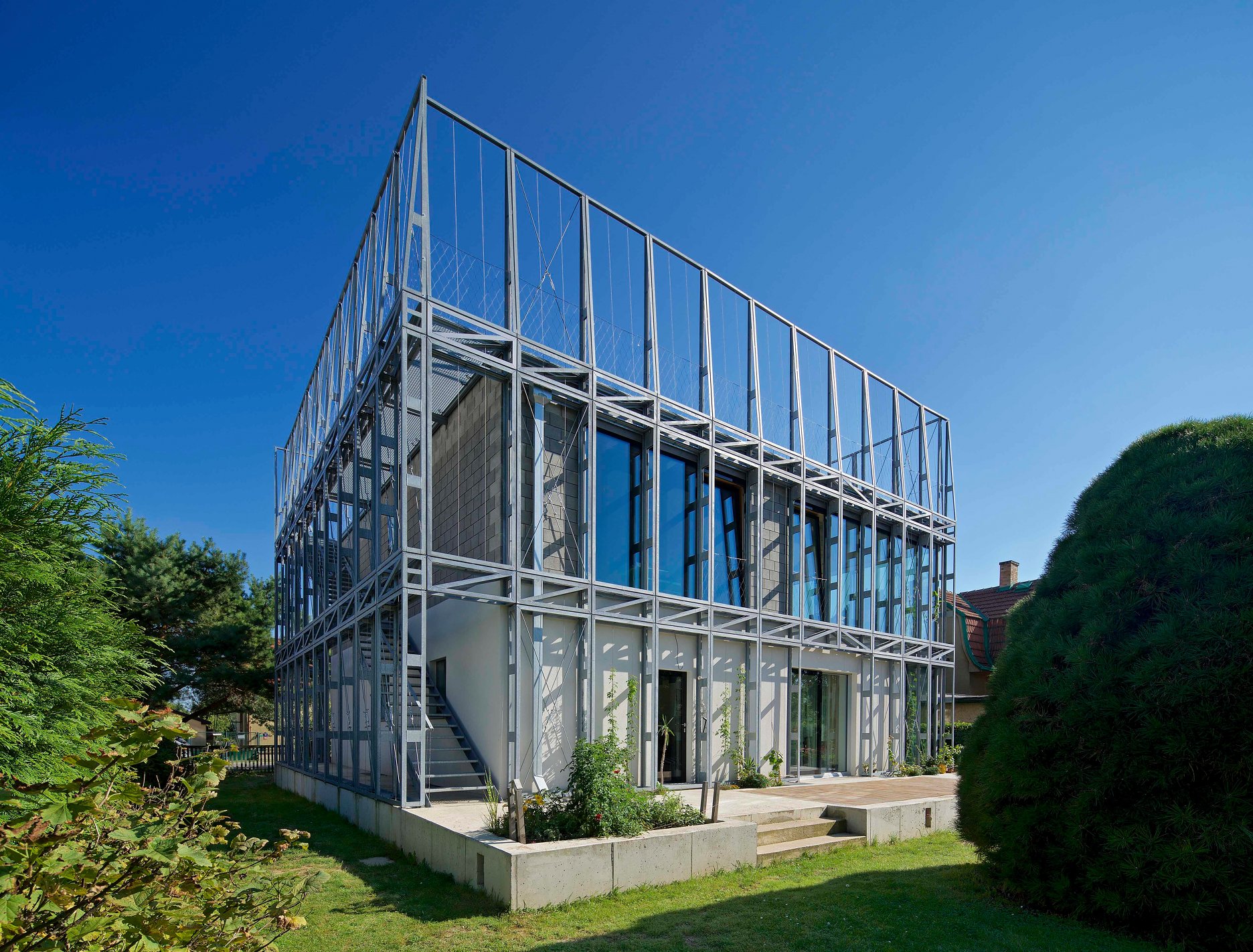 Prvorepublikový víkendový dom bol zbavený neskoršej nadstavby, ktorá spôsobovala statické problémy. Nový, oceľový exoskelet nepôsobí iba ako dodatočný ztužujúci prvok. Predsadená konštrukcia pomáha niesť stropnú dosku a rozsiahlu strešnú terasu. Integruje obslužné schodisko, zjednocuje exteriér, slúži ako treláž pre popínavé rastliny.
