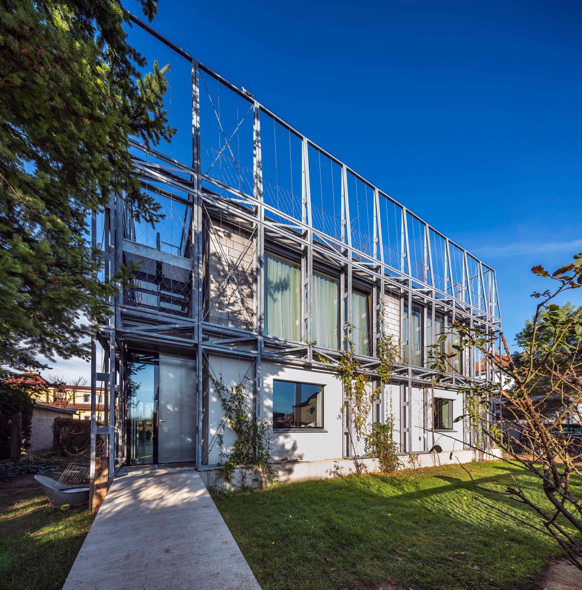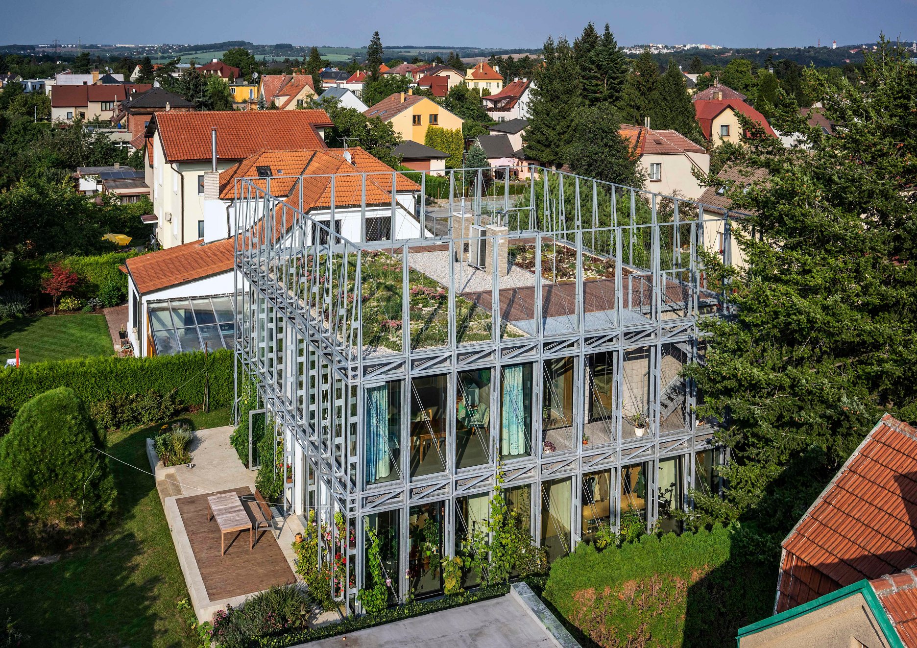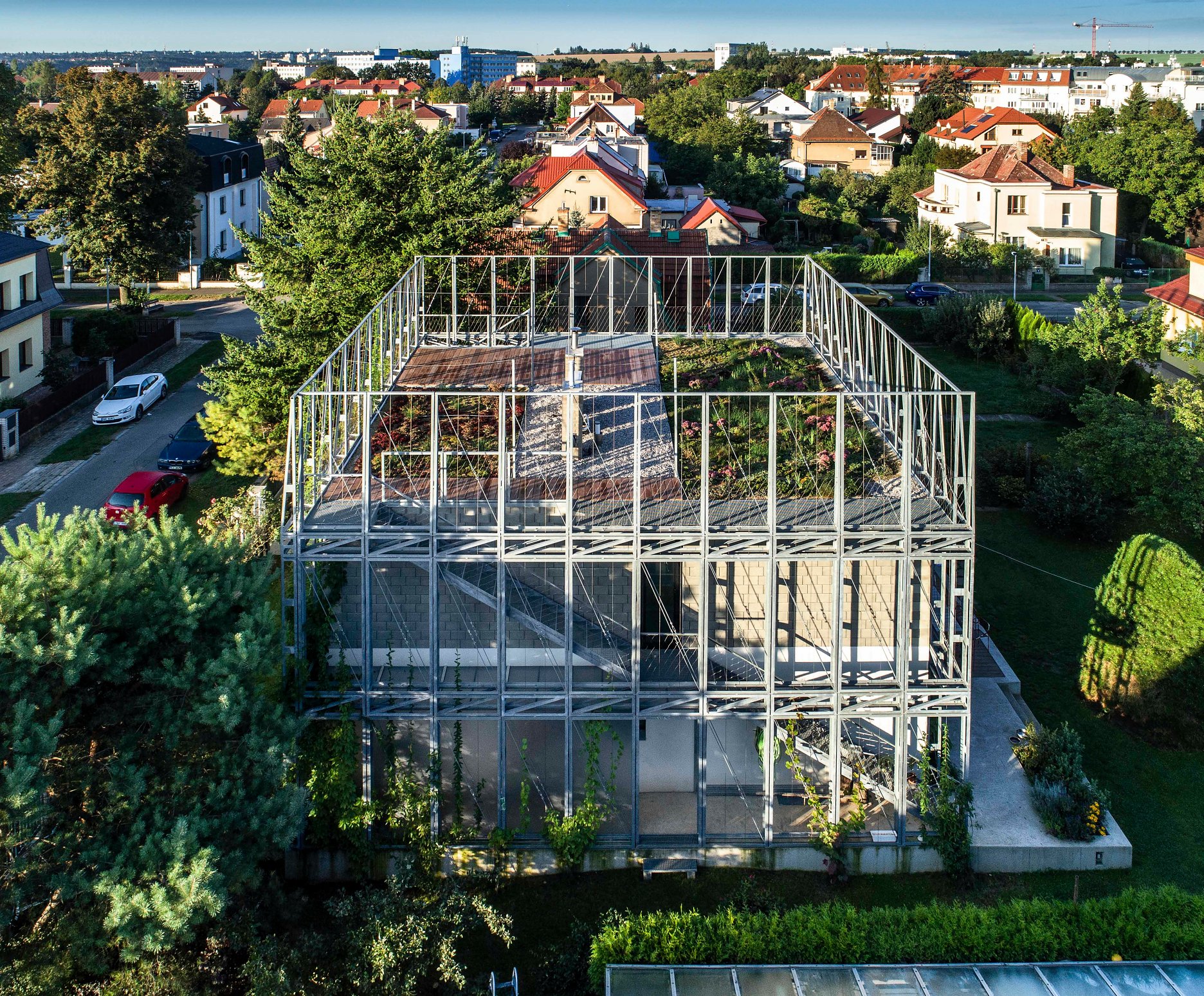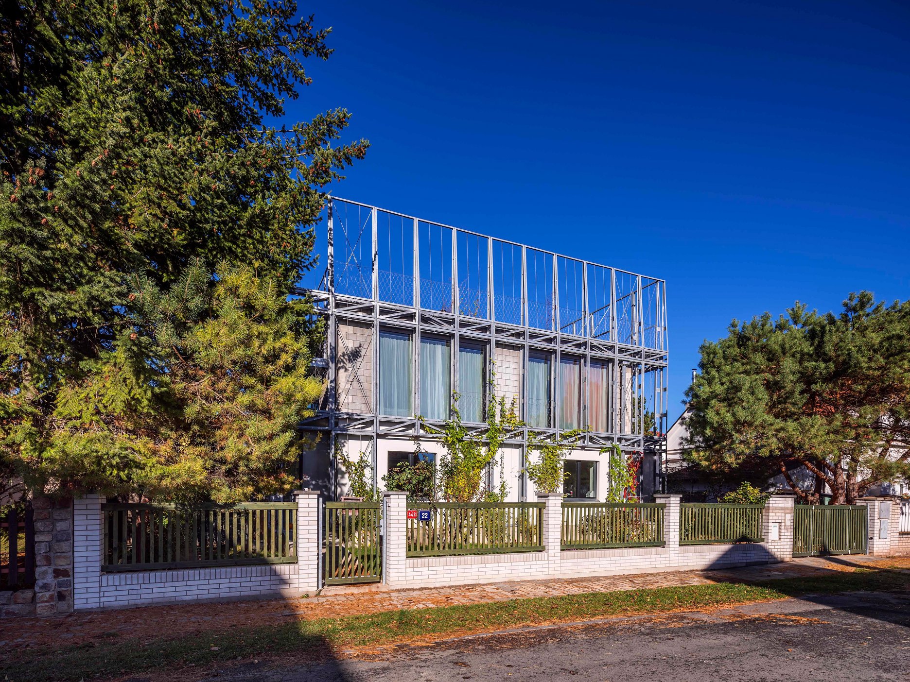 Prvorepublikový víkendový dom bol zbavený neskoršej nadstavby, ktorá spôsobovala statické problémy. Nový, oceľový exoskelet nepôsobí iba ako dodatočný ztužujúci prvok. Predsadená konštrukcia pomáha niesť stropnú dosku a rozsiahlu strešnú terasu. Integruje obslužné schodisko, zjednocuje exteriér, slúži ako treláž pre popínavé rastliny.