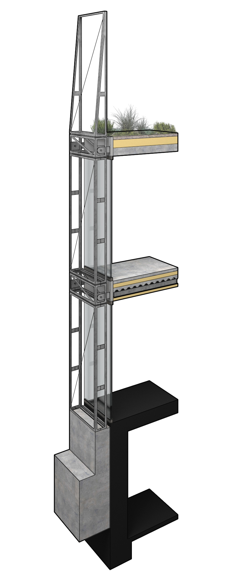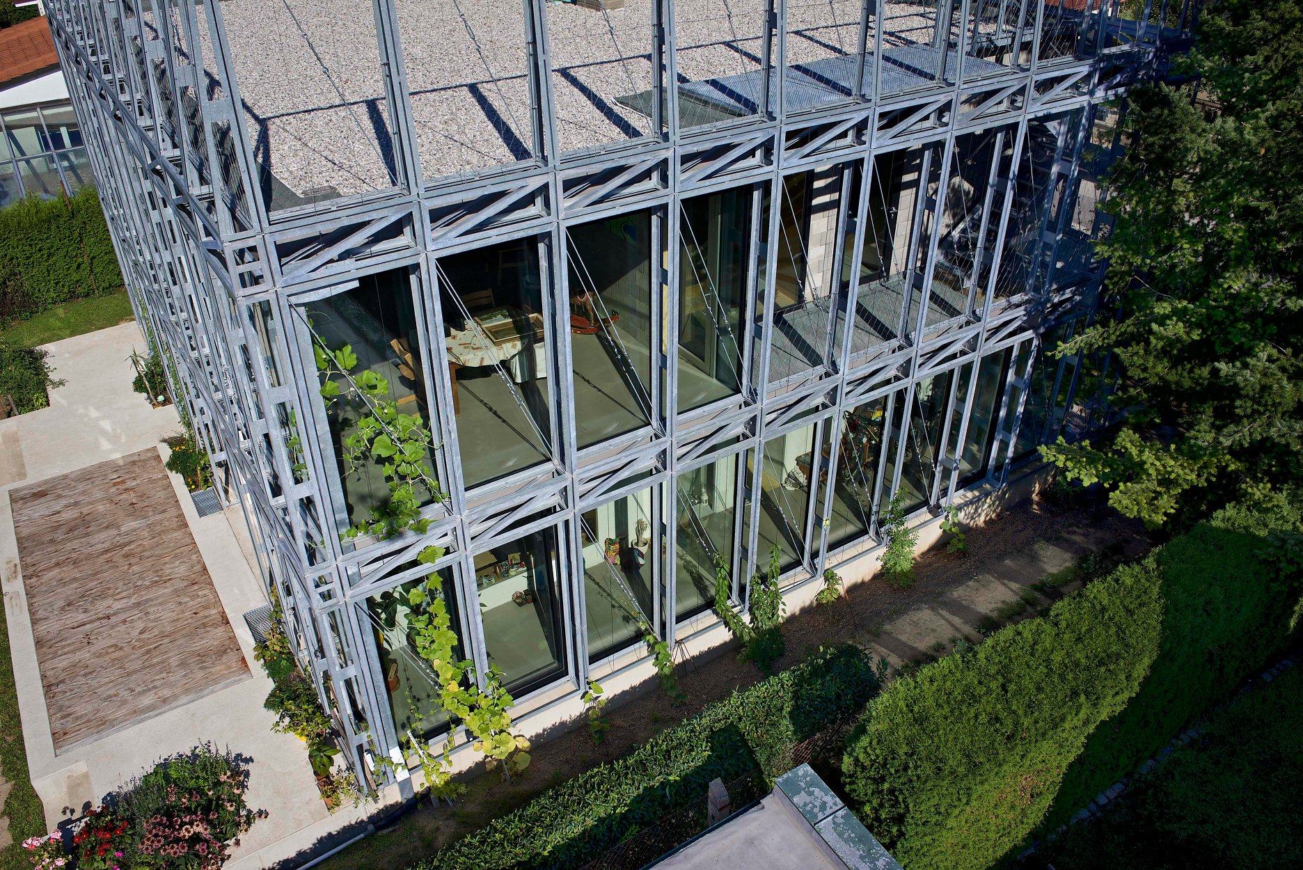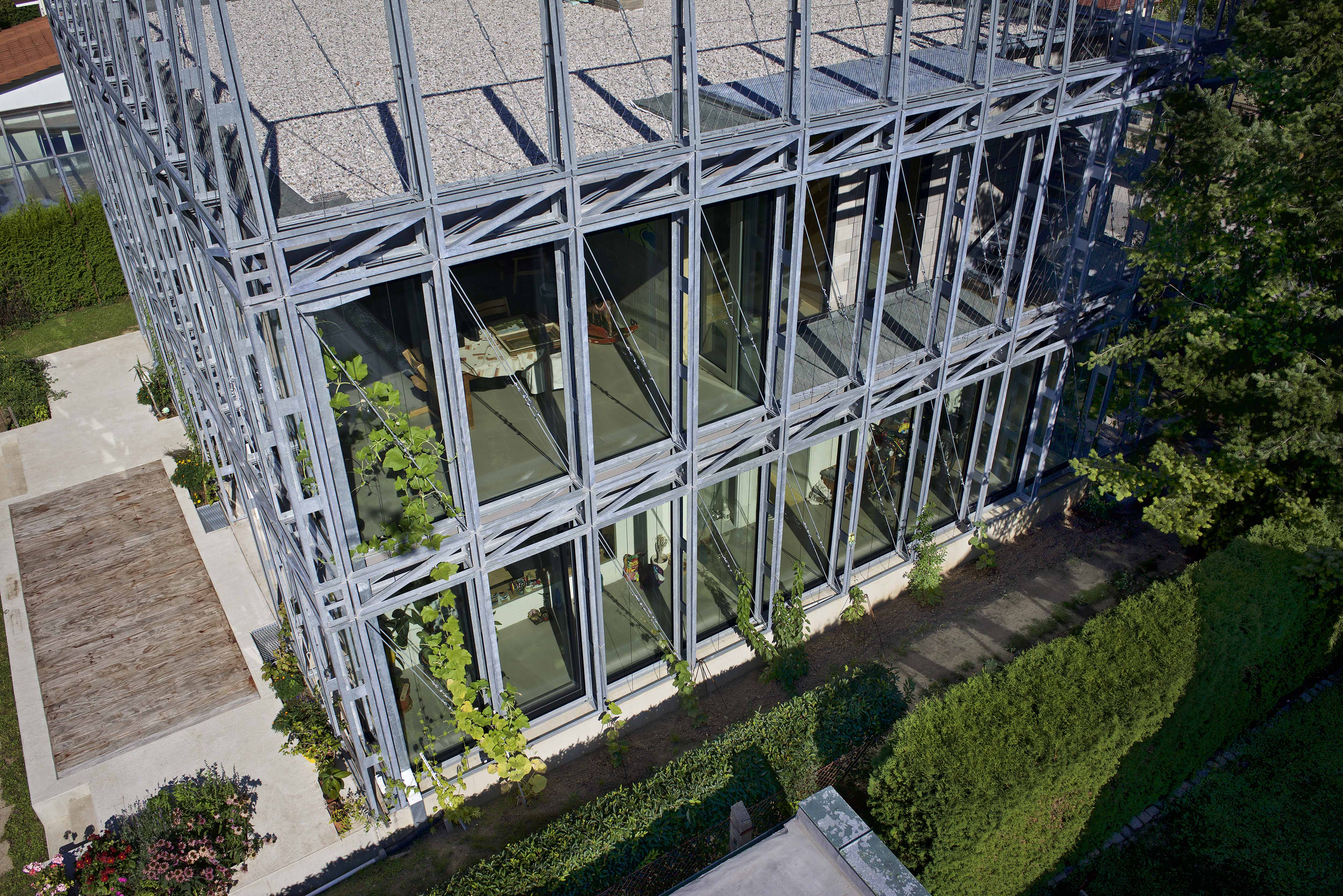 Ocelový korzet není pouze technickým prvkem, je zamýšlen i jako treláž pro popínání rostlin, a po architektonické stránce sceluje celý objekt. Celý korzet je sestaven ze stejných ocelových hranolů svařených z L profilů v modulu 1280 mm. Tento modul umožnil ideálně zachovat stávající otvory ponechané části stavby.