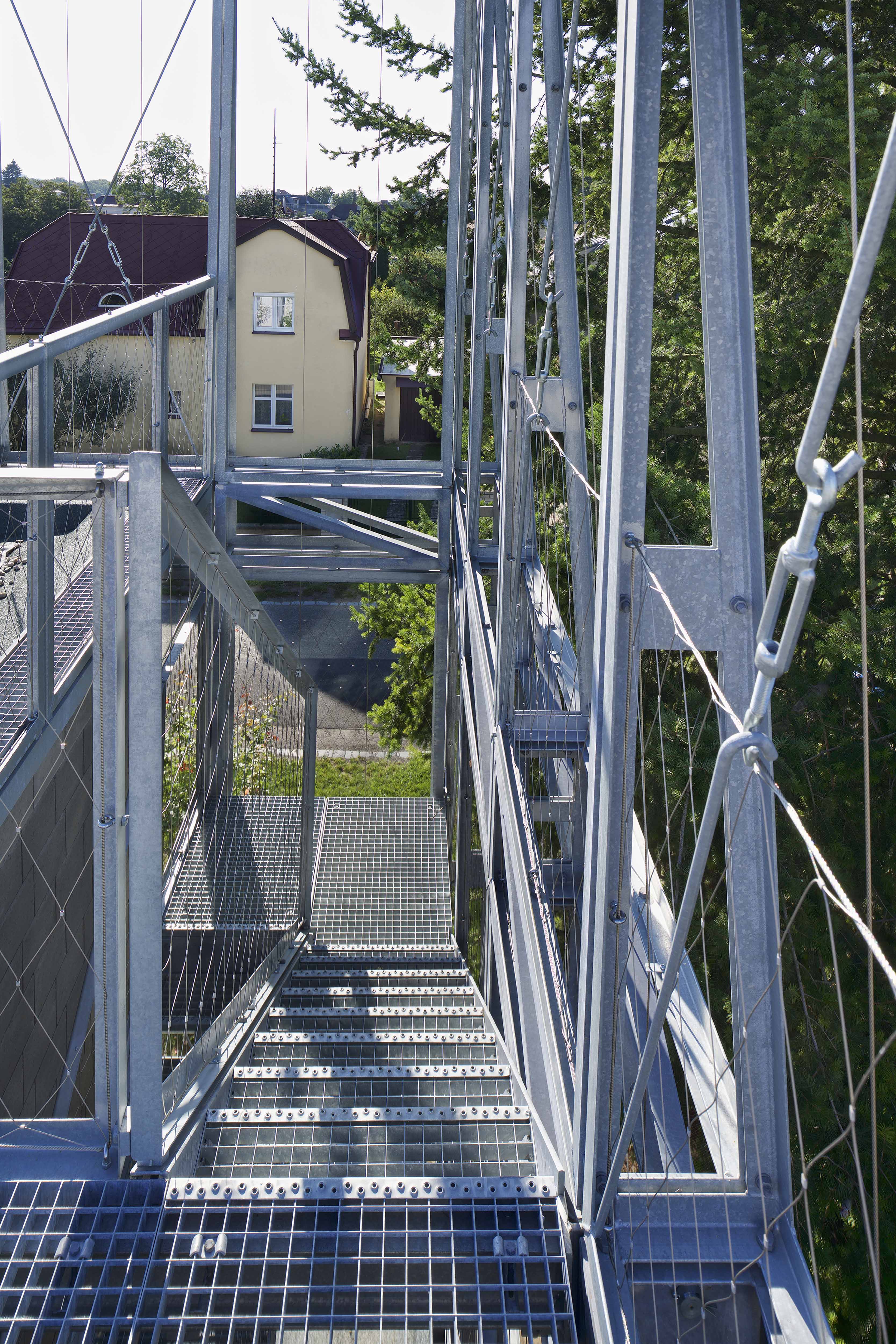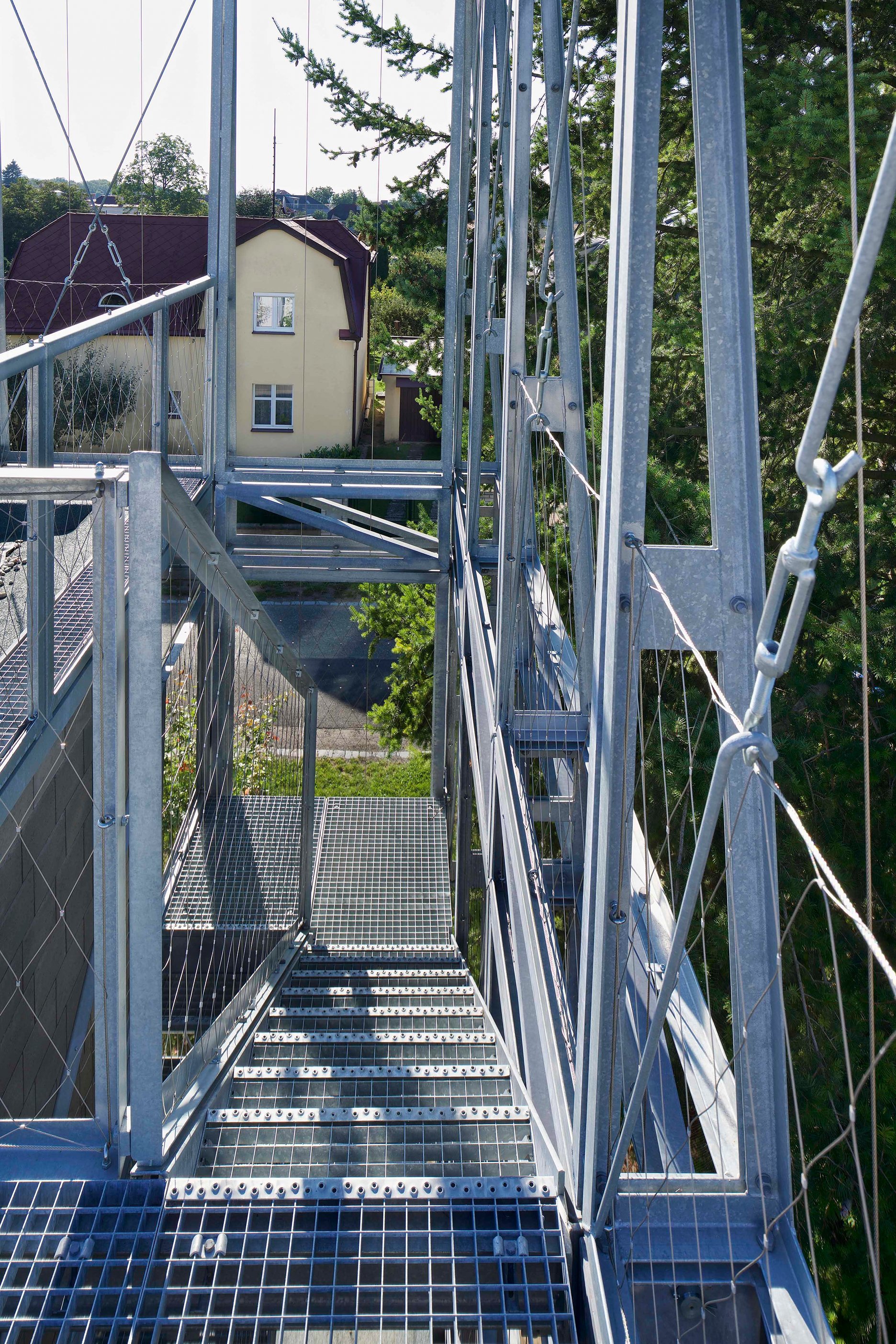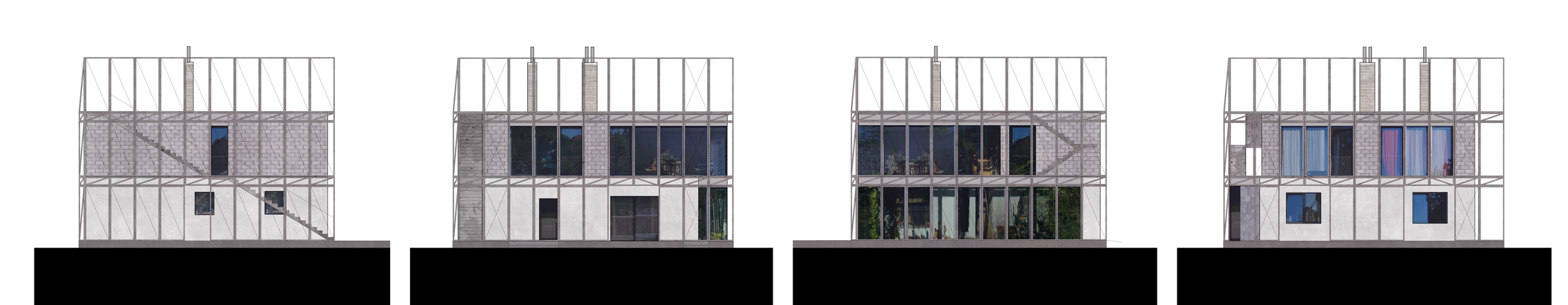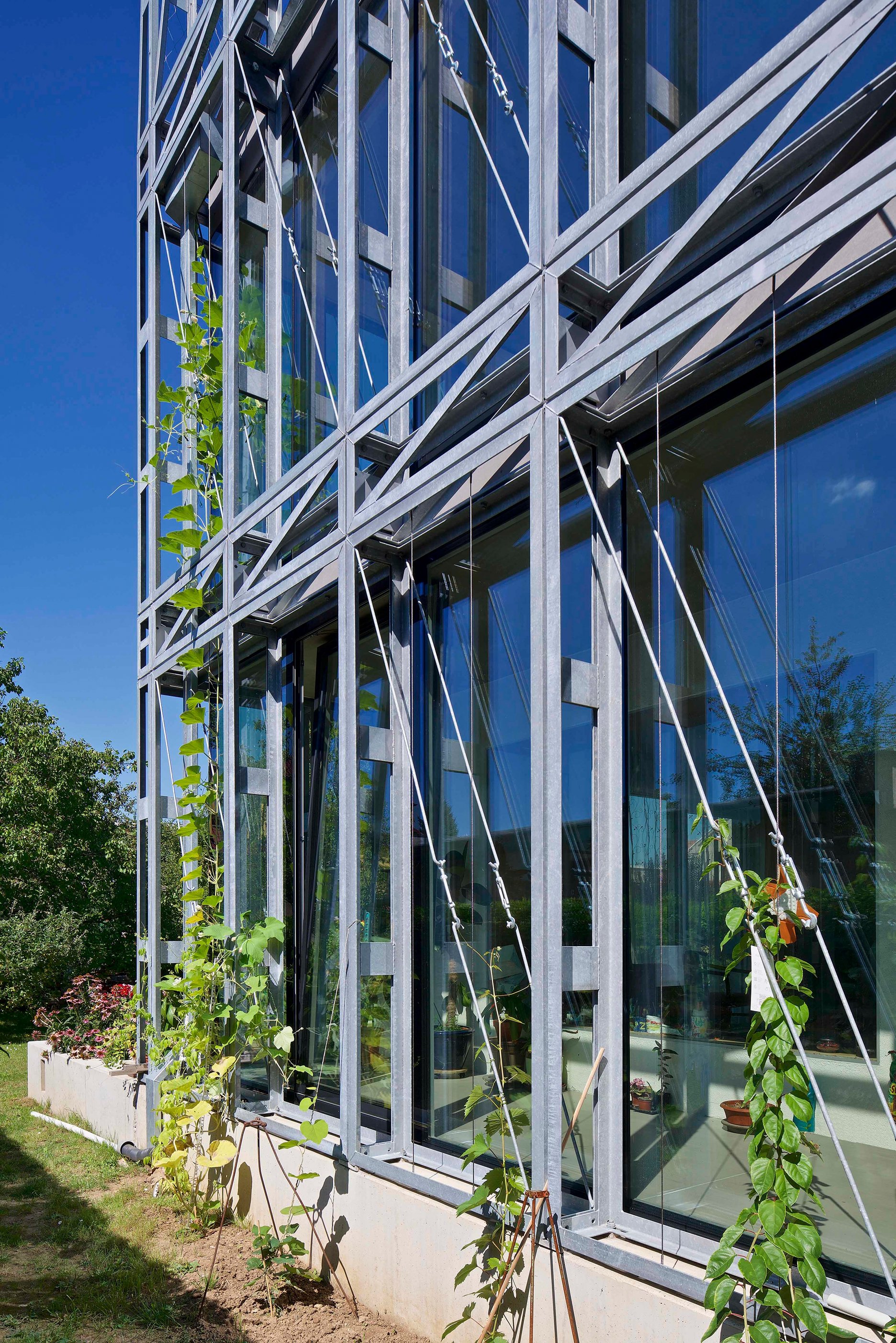 Ocelový korzet není pouze technickým prvkem, je zamýšlen i jako treláž pro popínání rostlin, a po architektonické stránce sceluje celý objekt. Celý korzet je sestaven ze stejných ocelových hranolů svařených z L profilů v modulu 1280 mm. Tento modul umožnil ideálně zachovat stávající otvory ponechané části stavby.