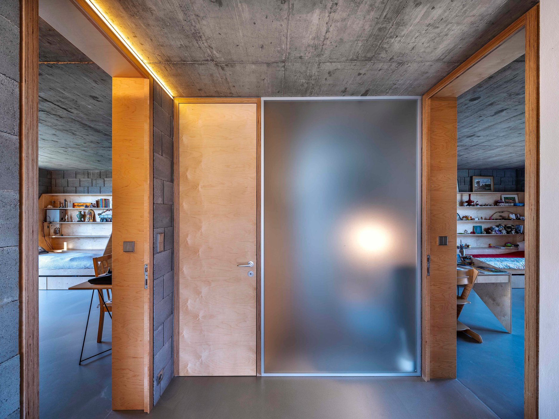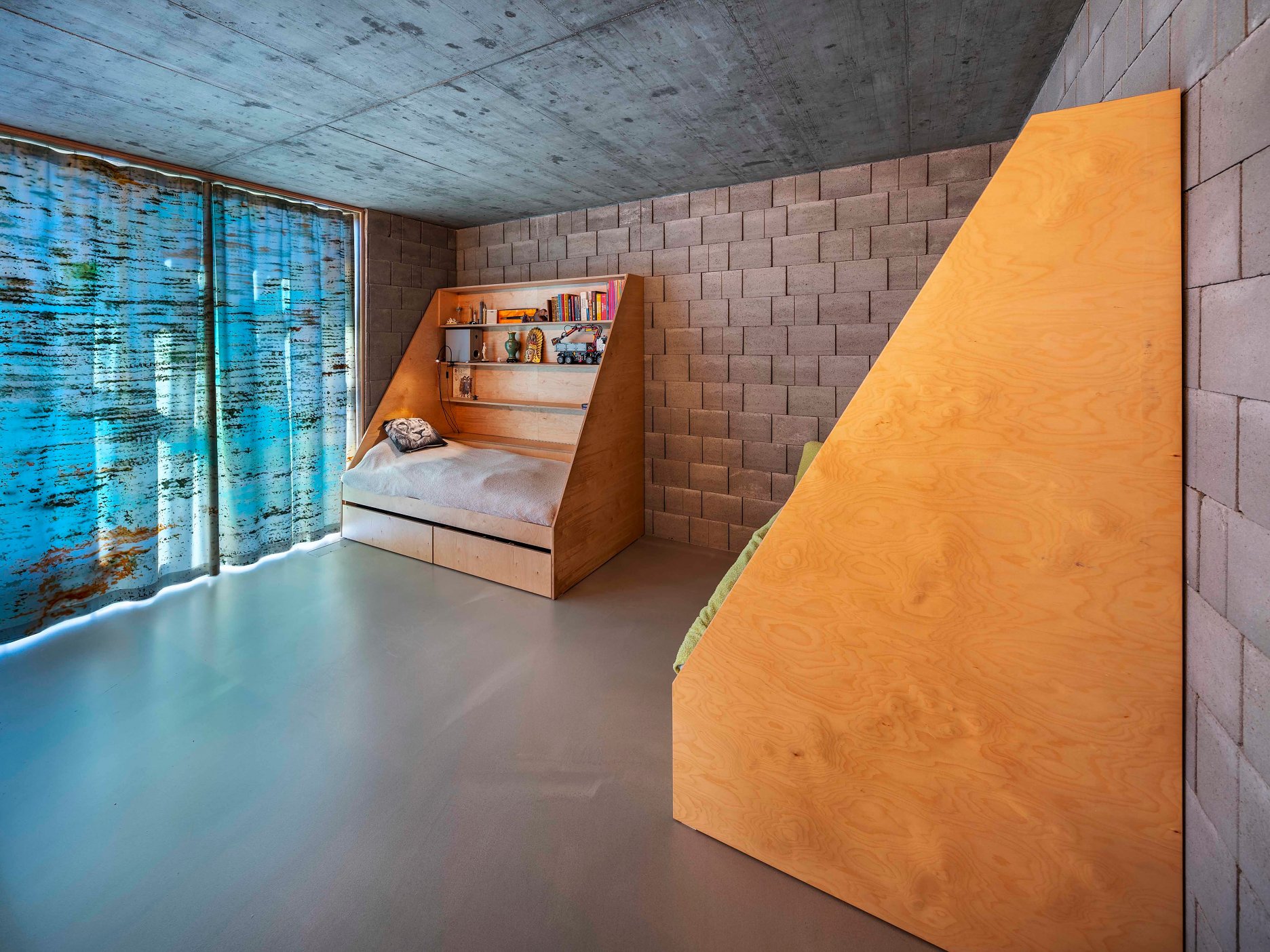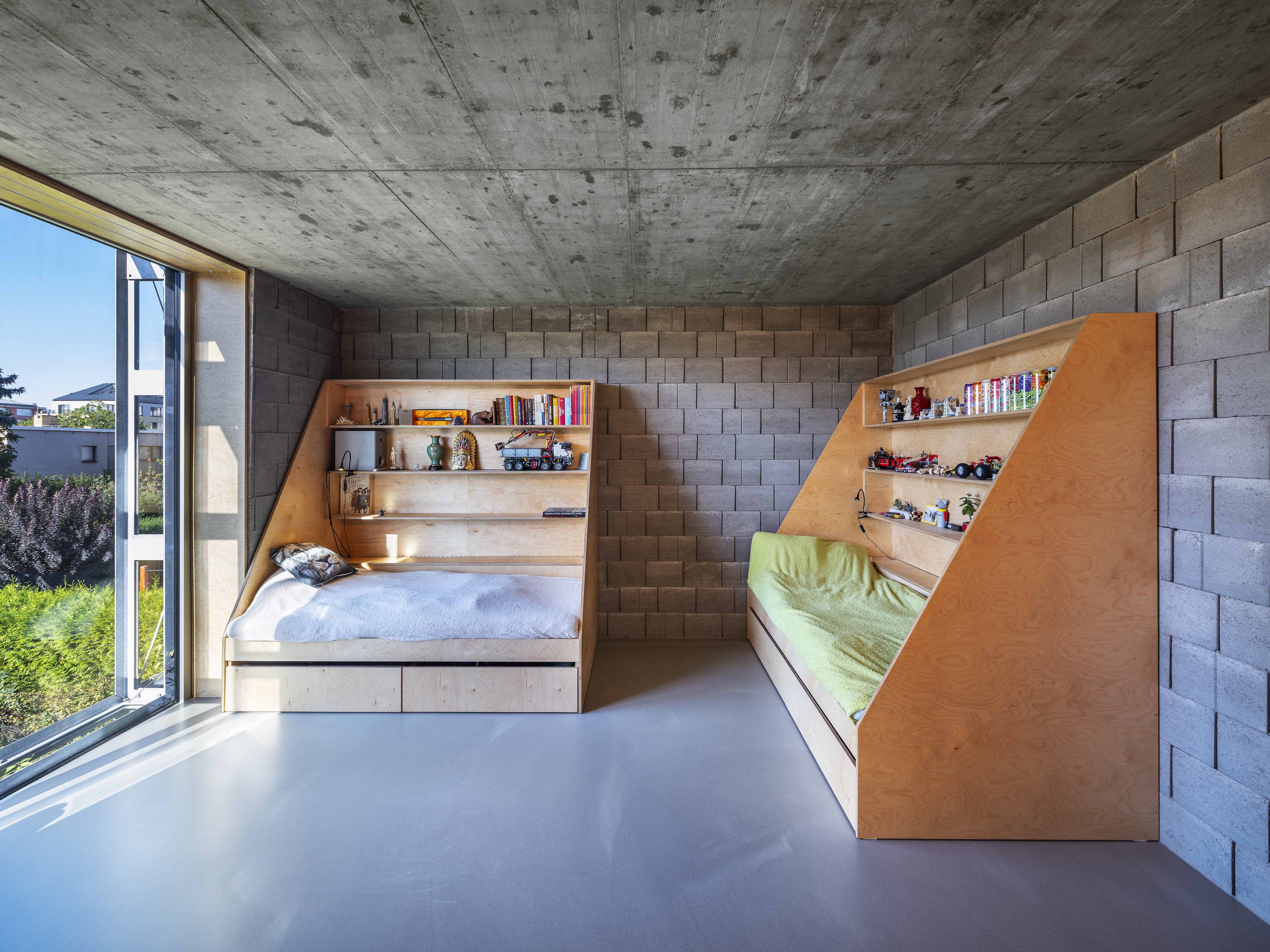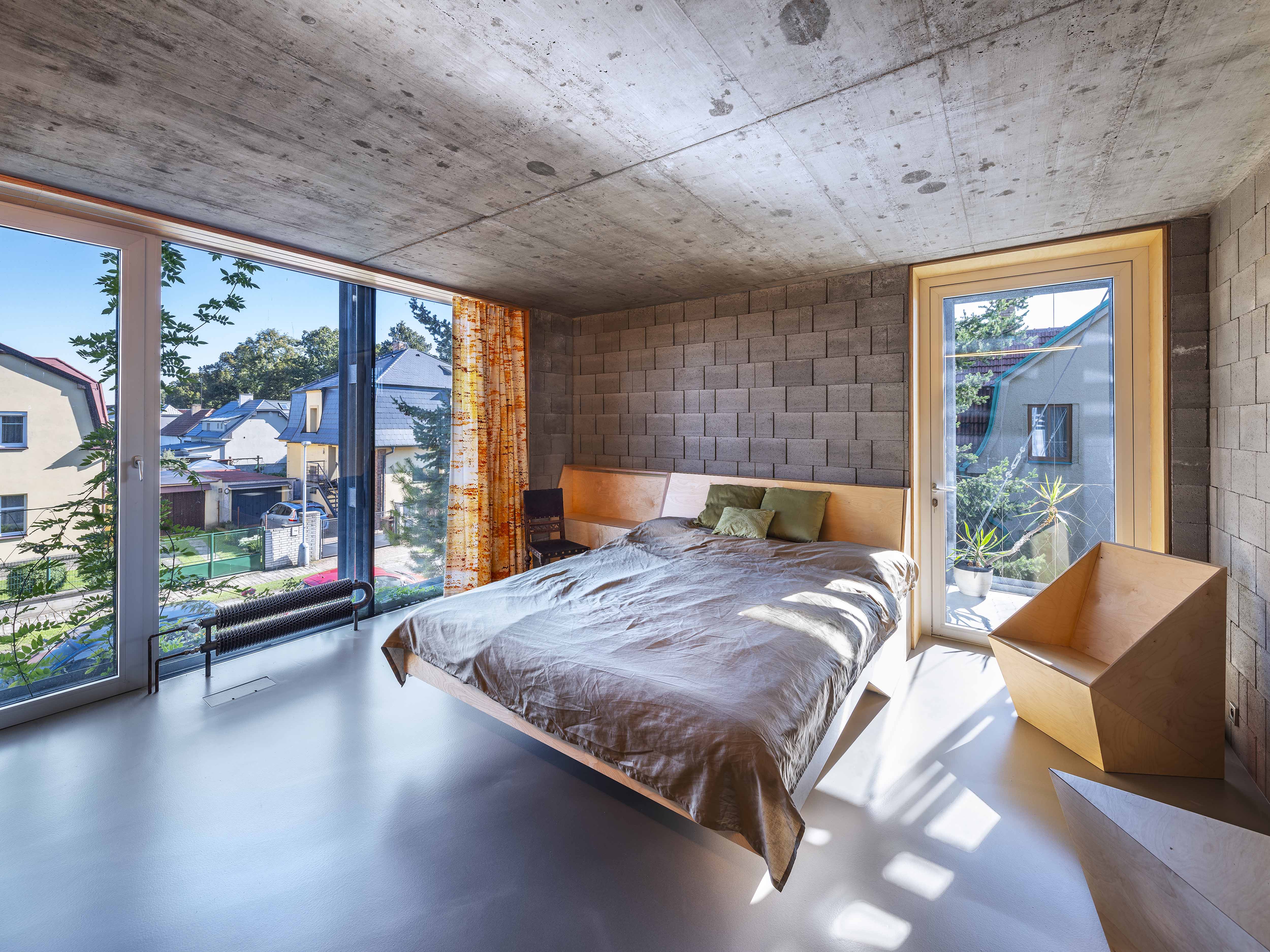 Interiér druhého patra ponechává viditelné betonové tvárnice i betonový strop. Společně s nosnou ocelovou konstrukcí jsou tedy všechny materiály přiznány ve své přirozené podobě. Tento hrubý interiér je doplněn o mobilní nábytek z březové překližky v podobě spacích buněk, skříní, které rozdělují místnosti i solitérního nábytku. Nedílnou součástí každého pokoje bylo řešení závěsů. Na stejně zvolený motiv si každý člen rodiny vybral své barevné řešení. Interiér i exteriér stavby vytváří platformu, která se bude v čase proměňovat," opisuje projekt Jan Šépka.