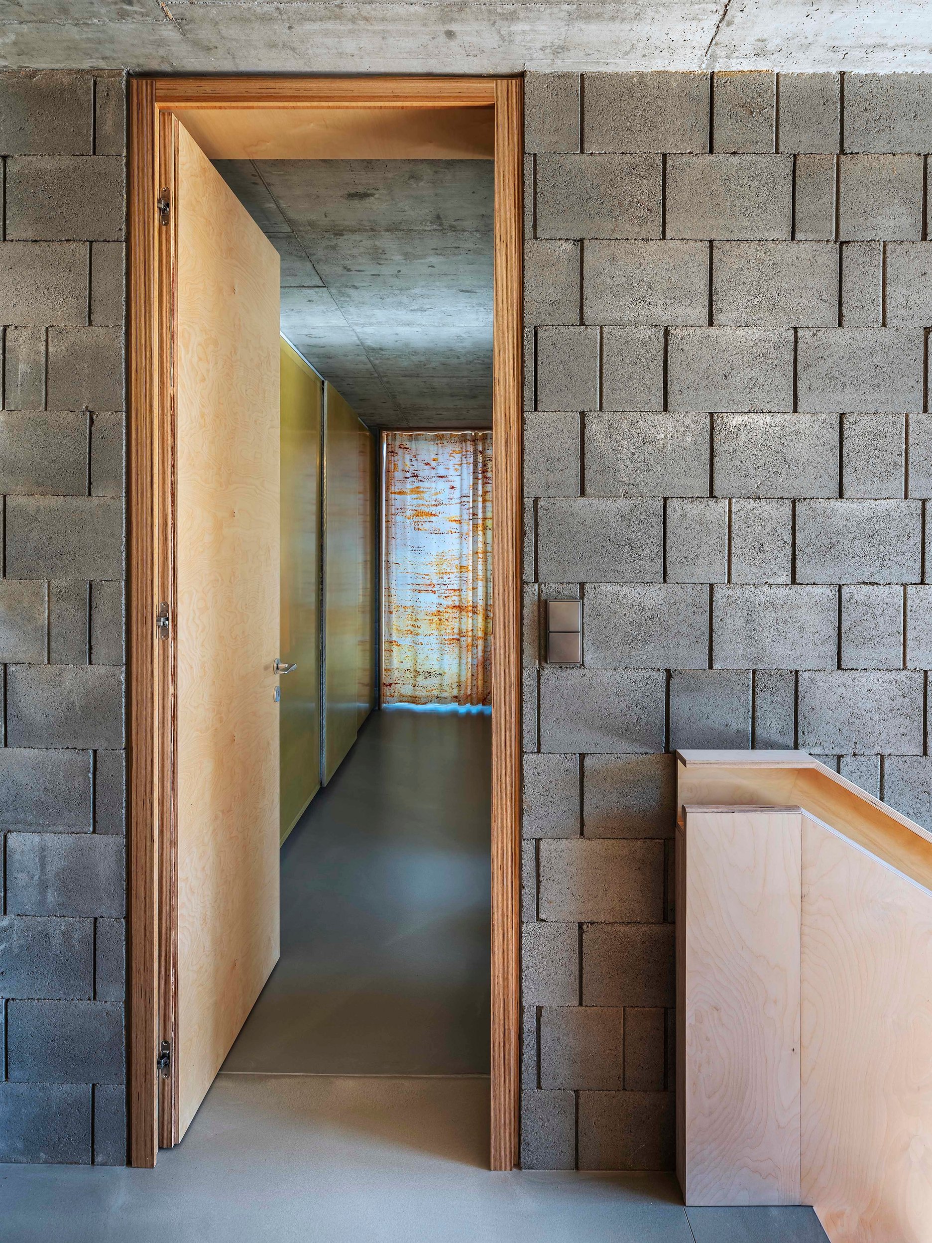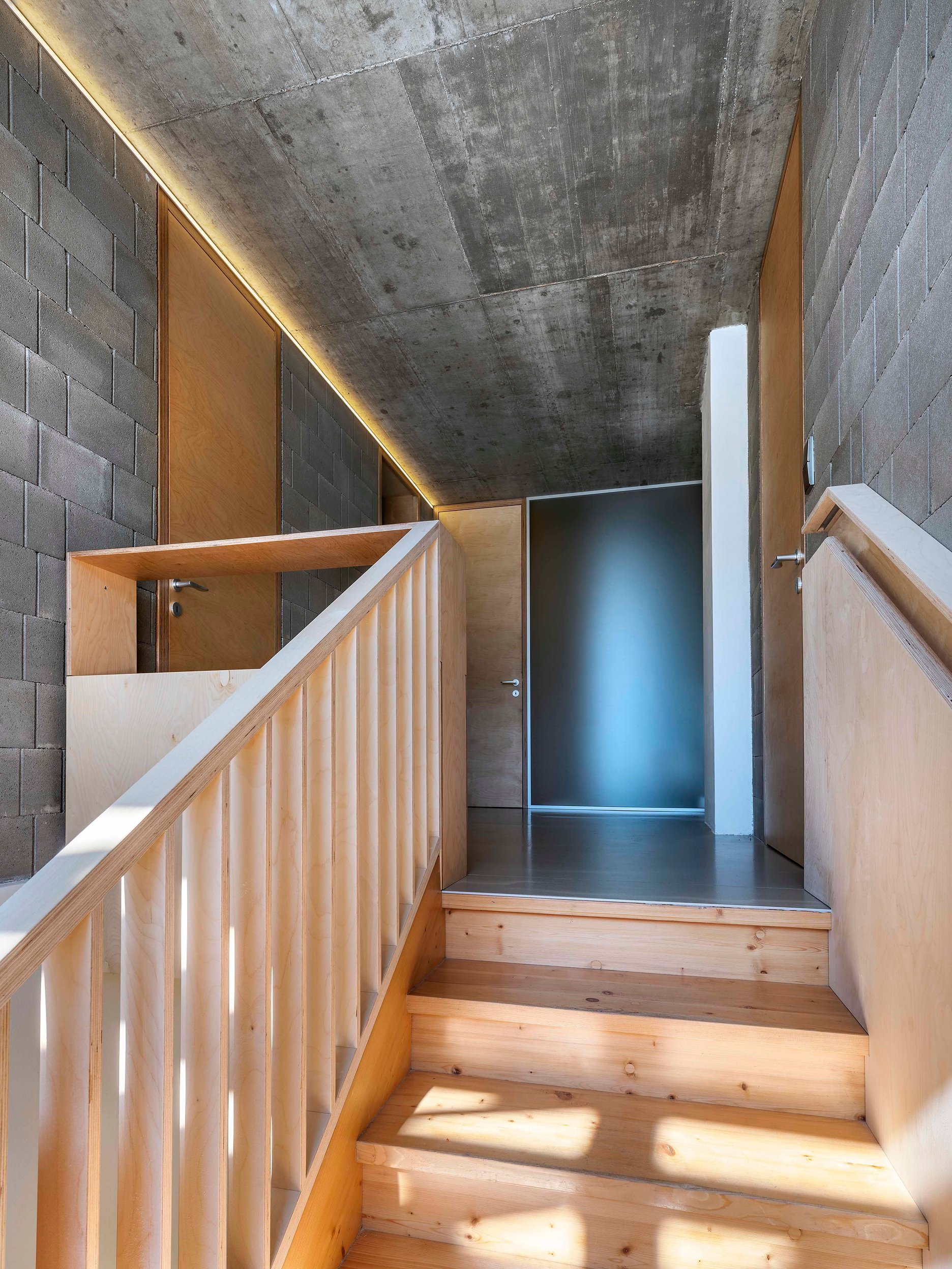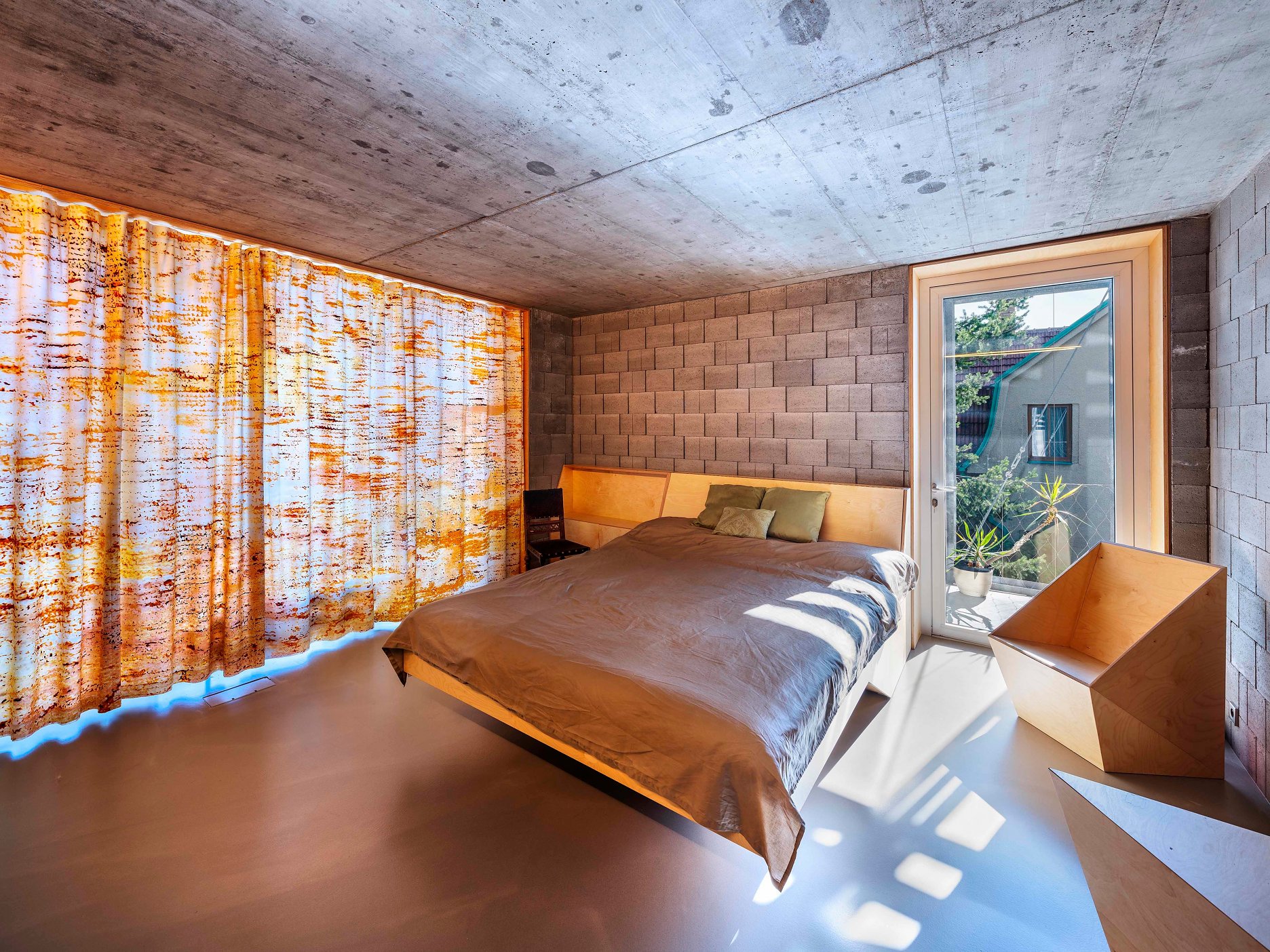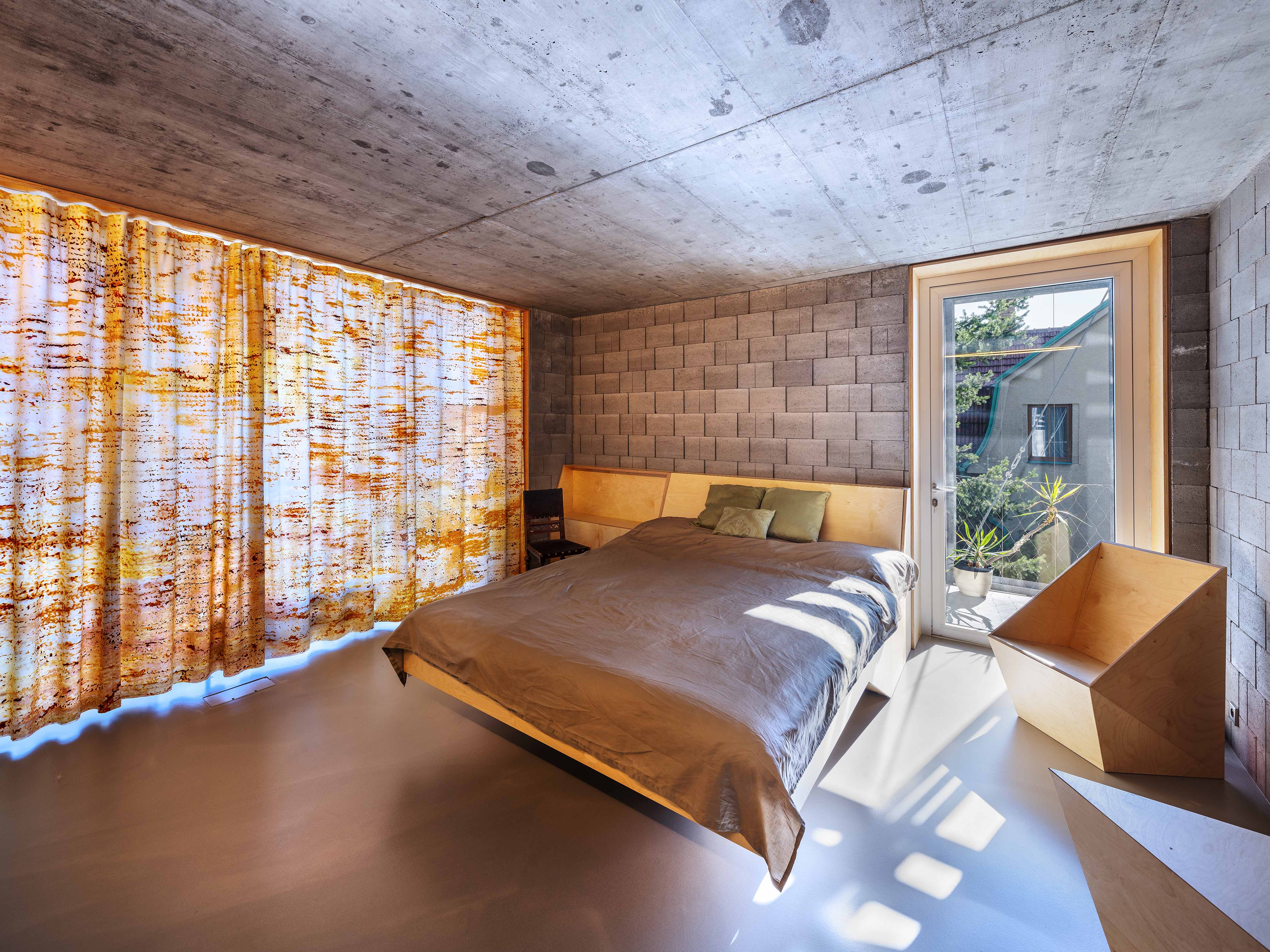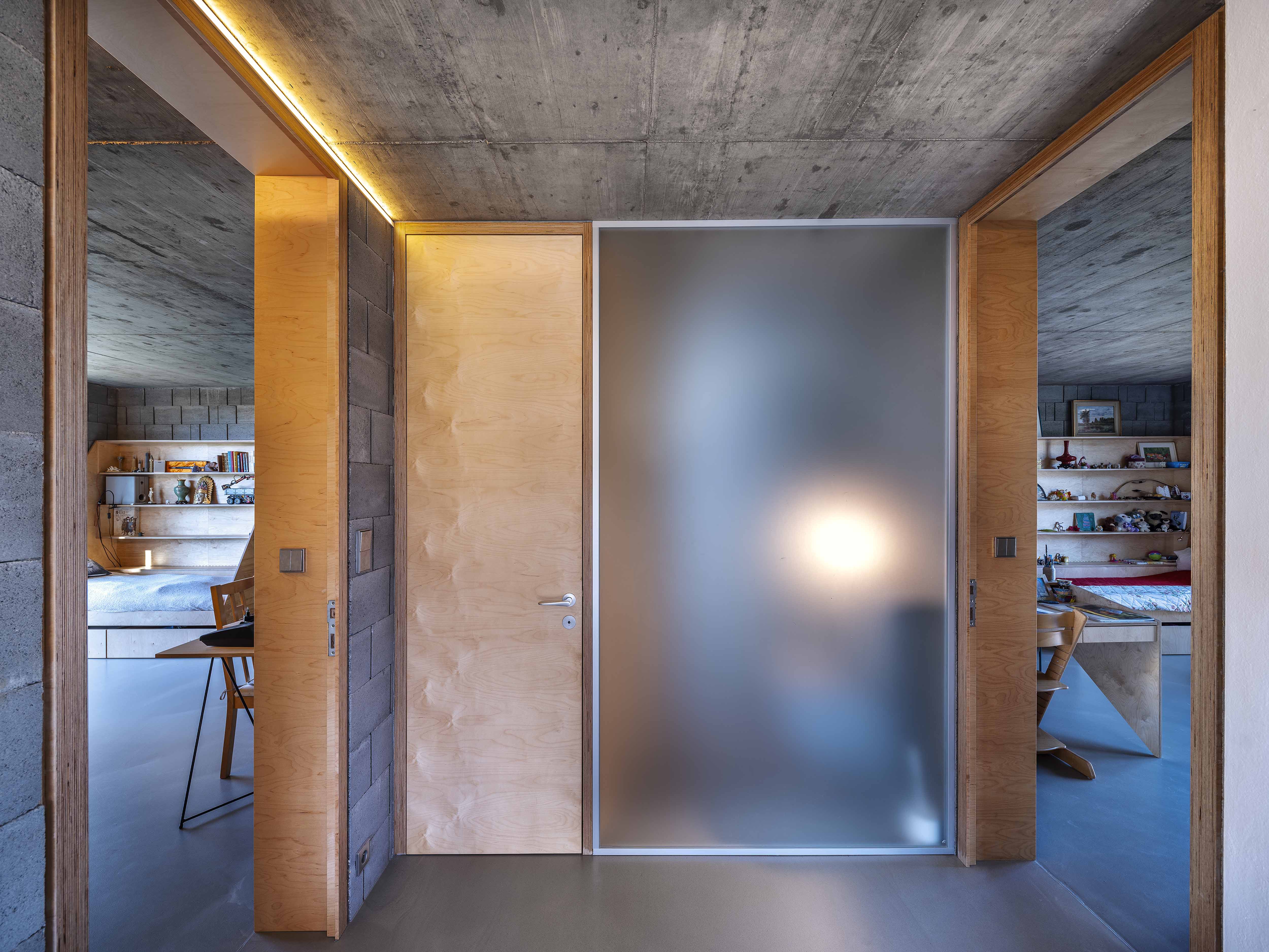 Interiér druhého patra ponechává viditelné betonové tvárnice i betonový strop. Společně s nosnou ocelovou konstrukcí jsou tedy všechny materiály přiznány ve své přirozené podobě. Tento hrubý interiér je doplněn o mobilní nábytek z březové překližky v podobě spacích buněk, skříní, které rozdělují místnosti i solitérního nábytku. Nedílnou součástí každého pokoje bylo řešení závěsů. Na stejně zvolený motiv si každý člen rodiny vybral své barevné řešení. Interiér i exteriér stavby vytváří platformu, která se bude v čase proměňovat," opisuje projekt Jan Šépka.