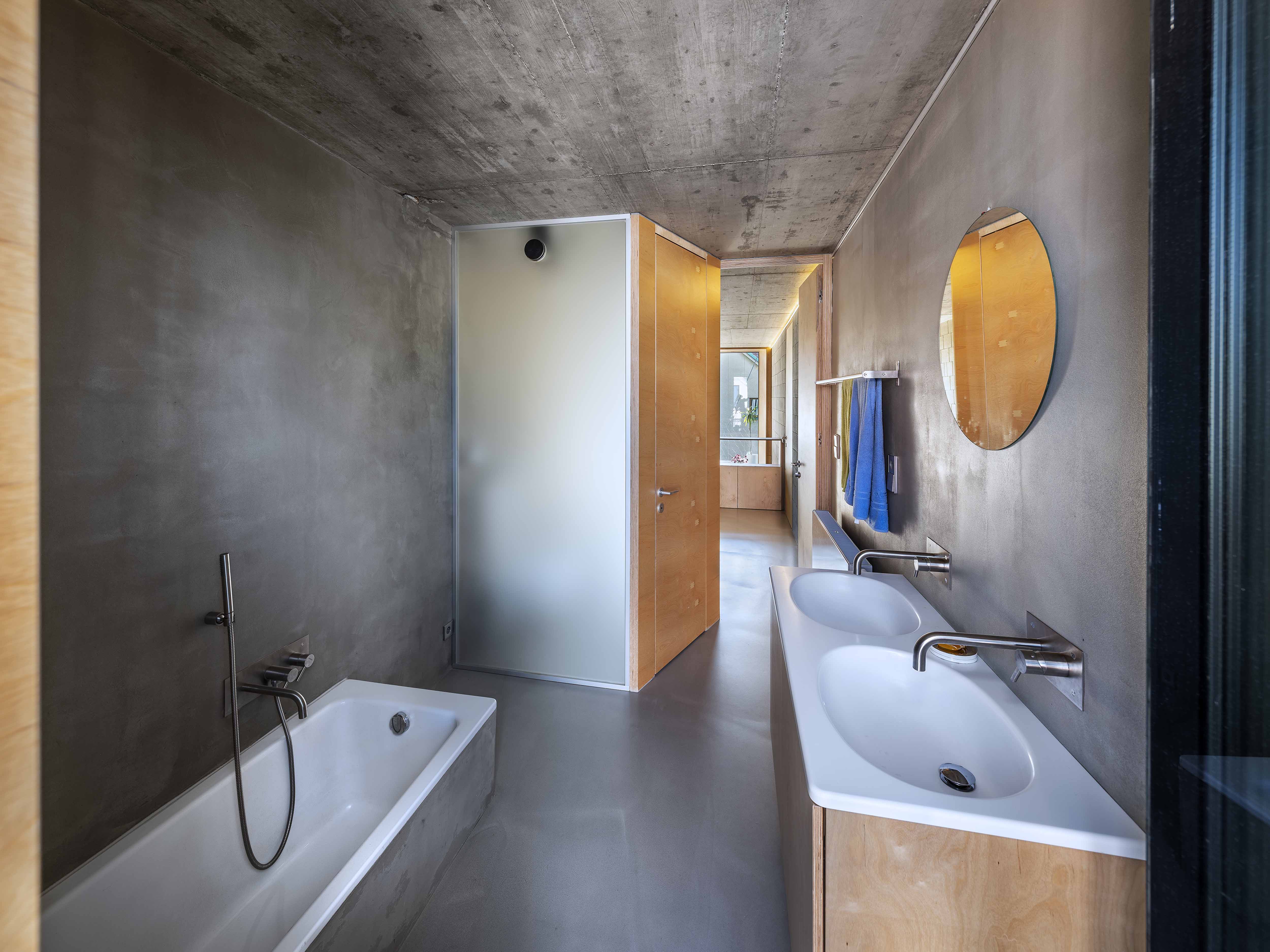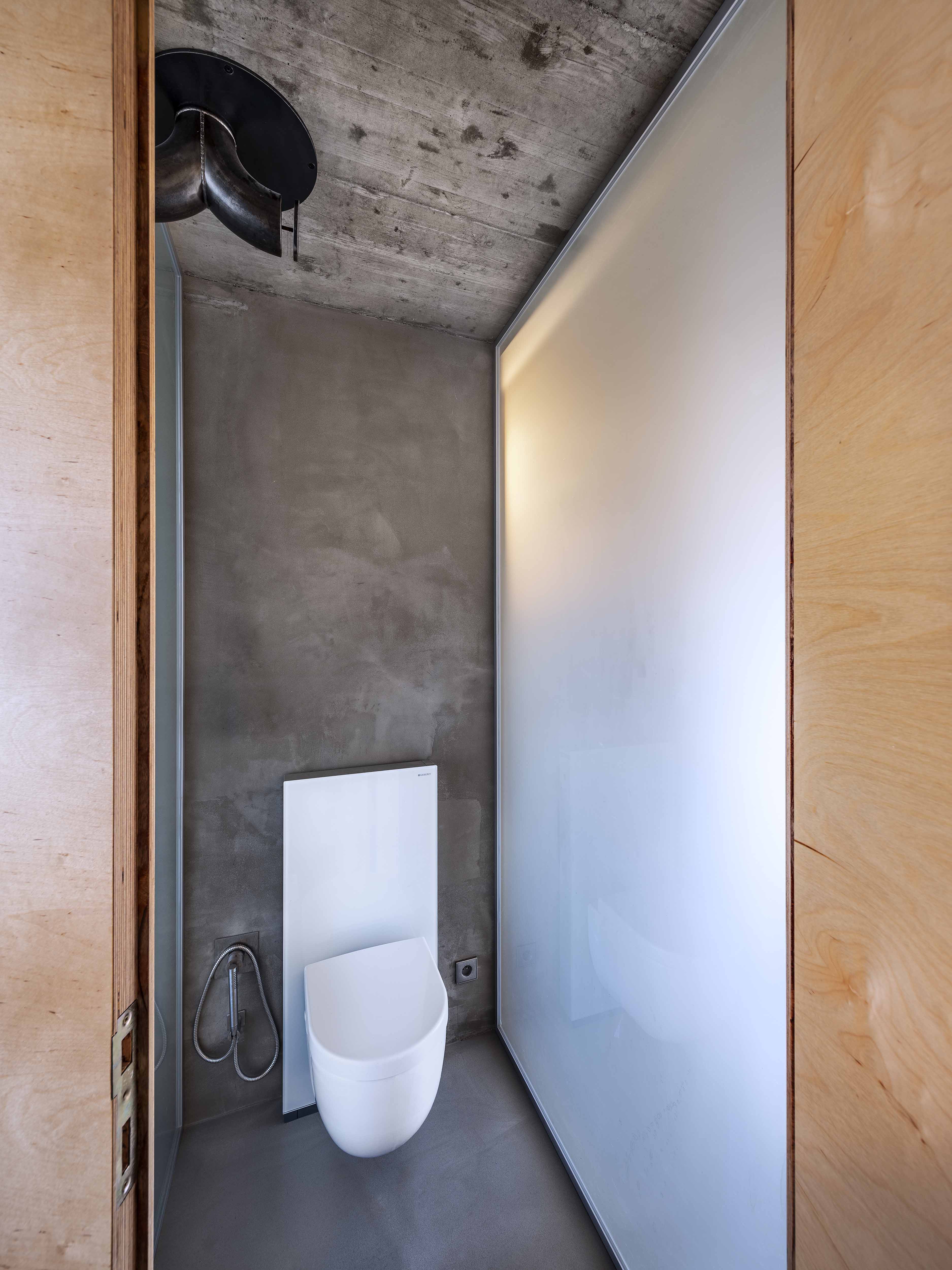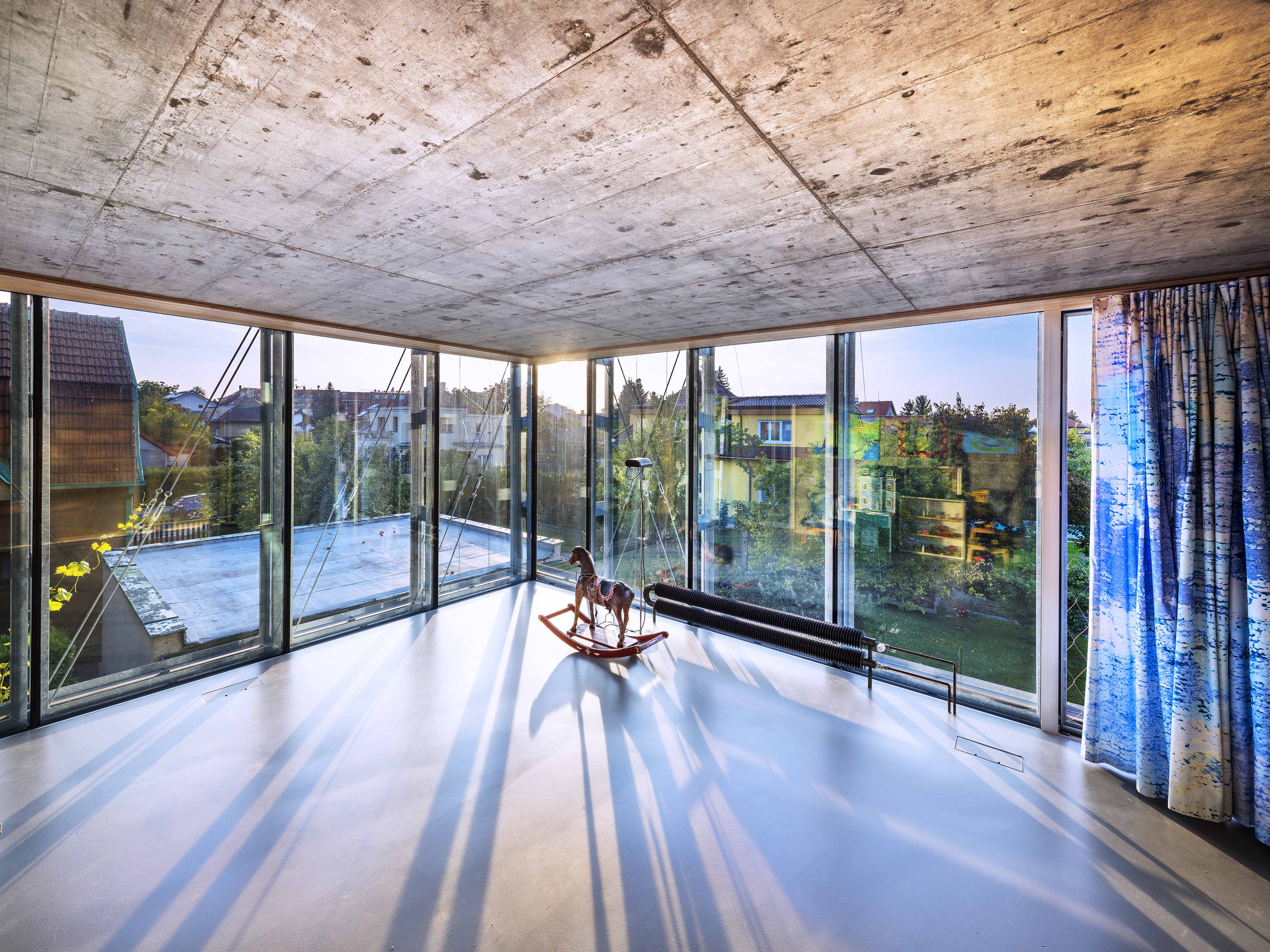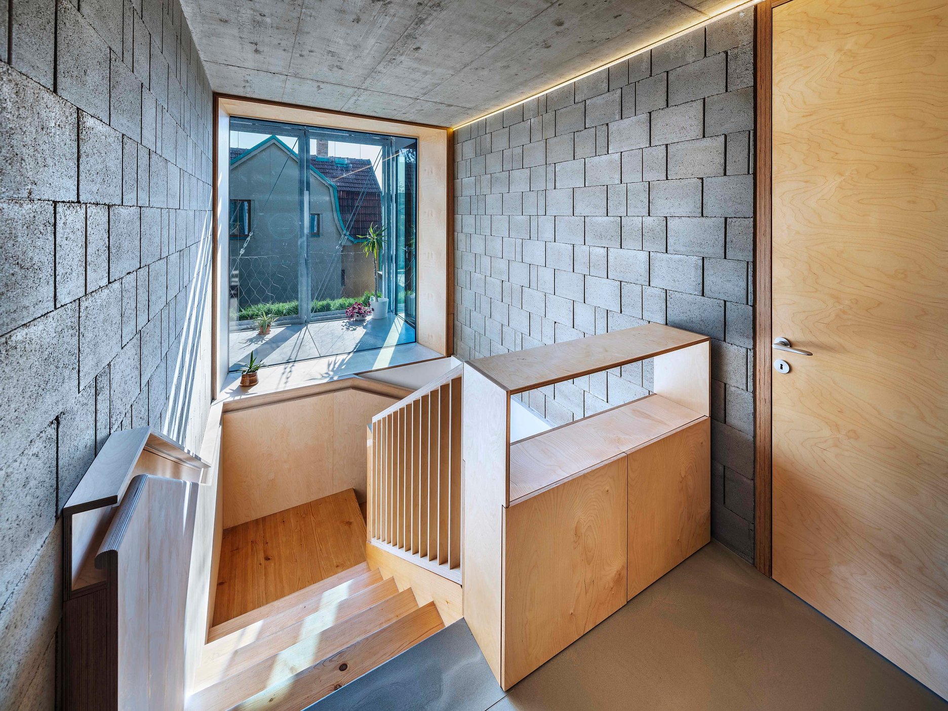 Interiér druhého patra ponechává viditelné betonové tvárnice i betonový strop. Společně s nosnou ocelovou konstrukcí jsou tedy všechny materiály přiznány ve své přirozené podobě. Tento hrubý interiér je doplněn o mobilní nábytek z březové překližky v podobě spacích buněk, skříní, které rozdělují místnosti i solitérního nábytku. Nedílnou součástí každého pokoje bylo řešení závěsů. Na stejně zvolený motiv si každý člen rodiny vybral své barevné řešení. Interiér i exteriér stavby vytváří platformu, která se bude v čase proměňovat," opisuje projekt Jan Šépka.