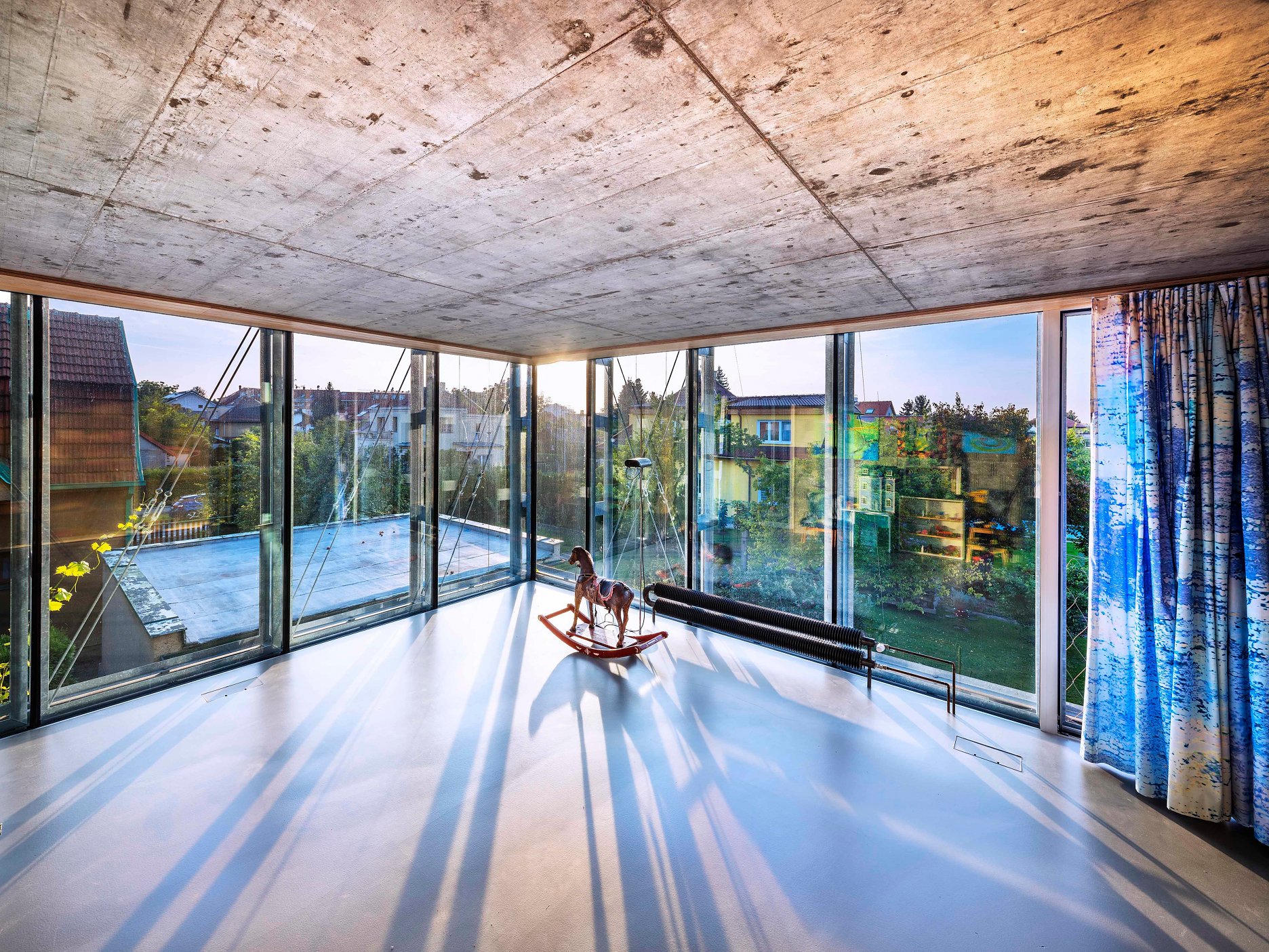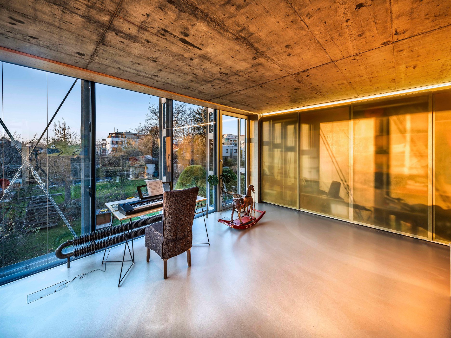 “Rodinný dům v Praze, byl jako původně rekreační objekt z třicátých let 20. století několikrát dostavován a přestavován k trvalému bydlení. Vzhledem k těmto zásahům přestala být jeho stabilita dostatečná. Základním rozhodnutím tedy bylo doplnit a celkově ztužit konstrukci ocelovým korzetem. Dalším problémem byla původní mansardová střecha, jež měla tloušťku pouhých 15 cm. Odstranění celé střechy, ke kterému jsme se nakonec rozhodli, umožnilo nejen efektivněji vyřešit problém zateplení, ale i úpravu dispozice ve druhém nadzemním podlaží tak, aby vyhovovala požadavkům investora. Druhé nadzemní podlaží je zároveň v místě bývalé terasy rozšířeno o nový pokoj.
