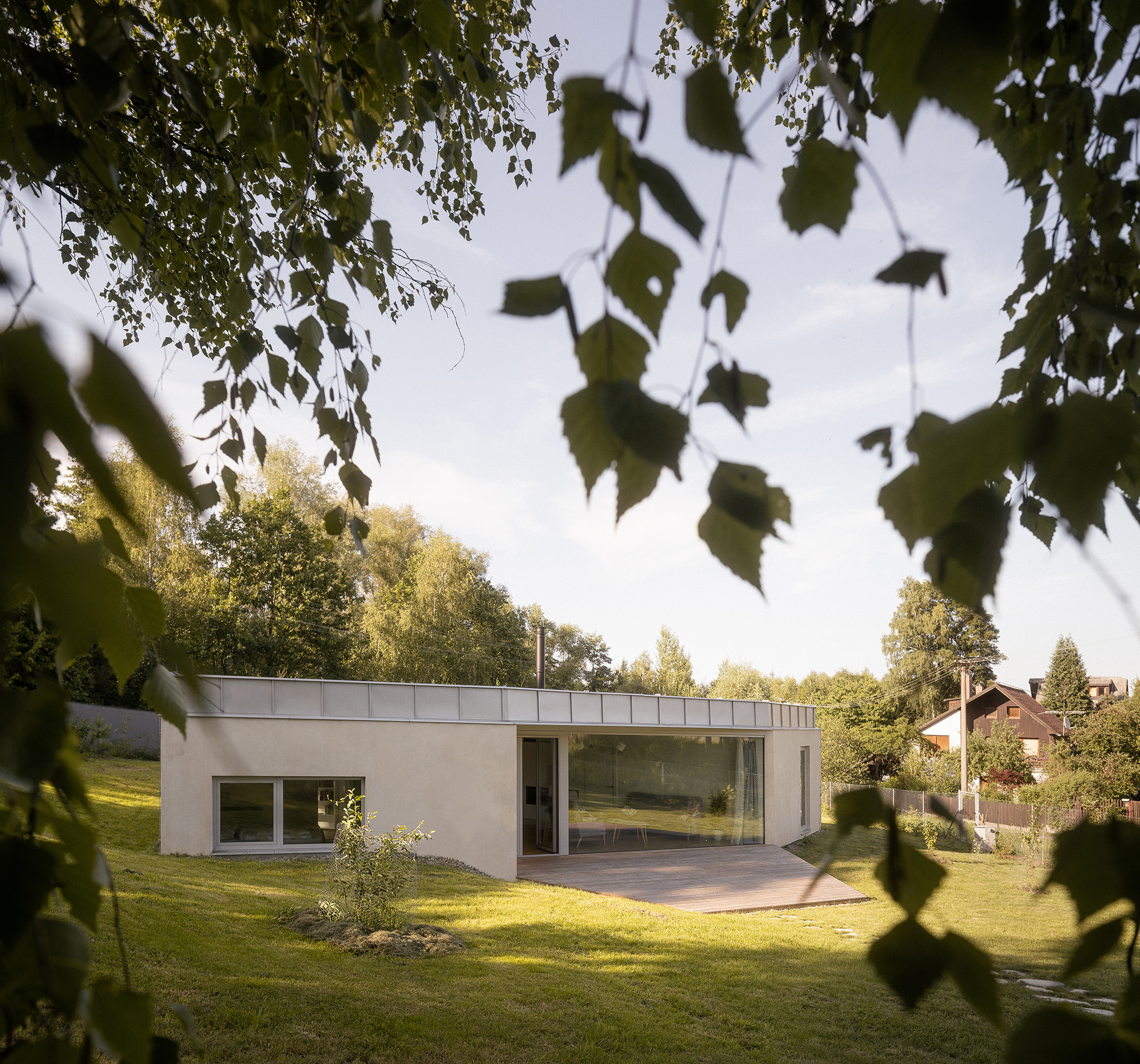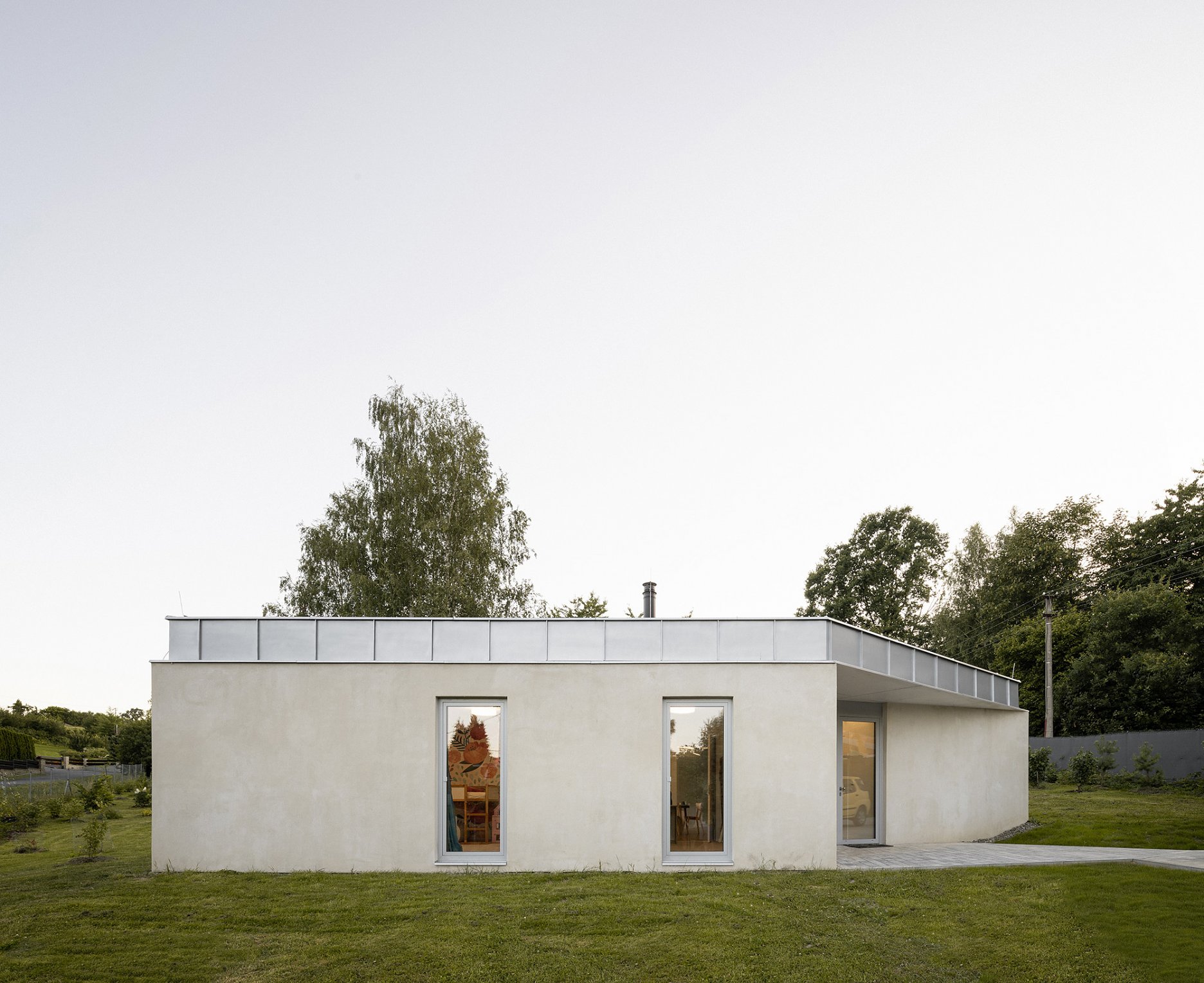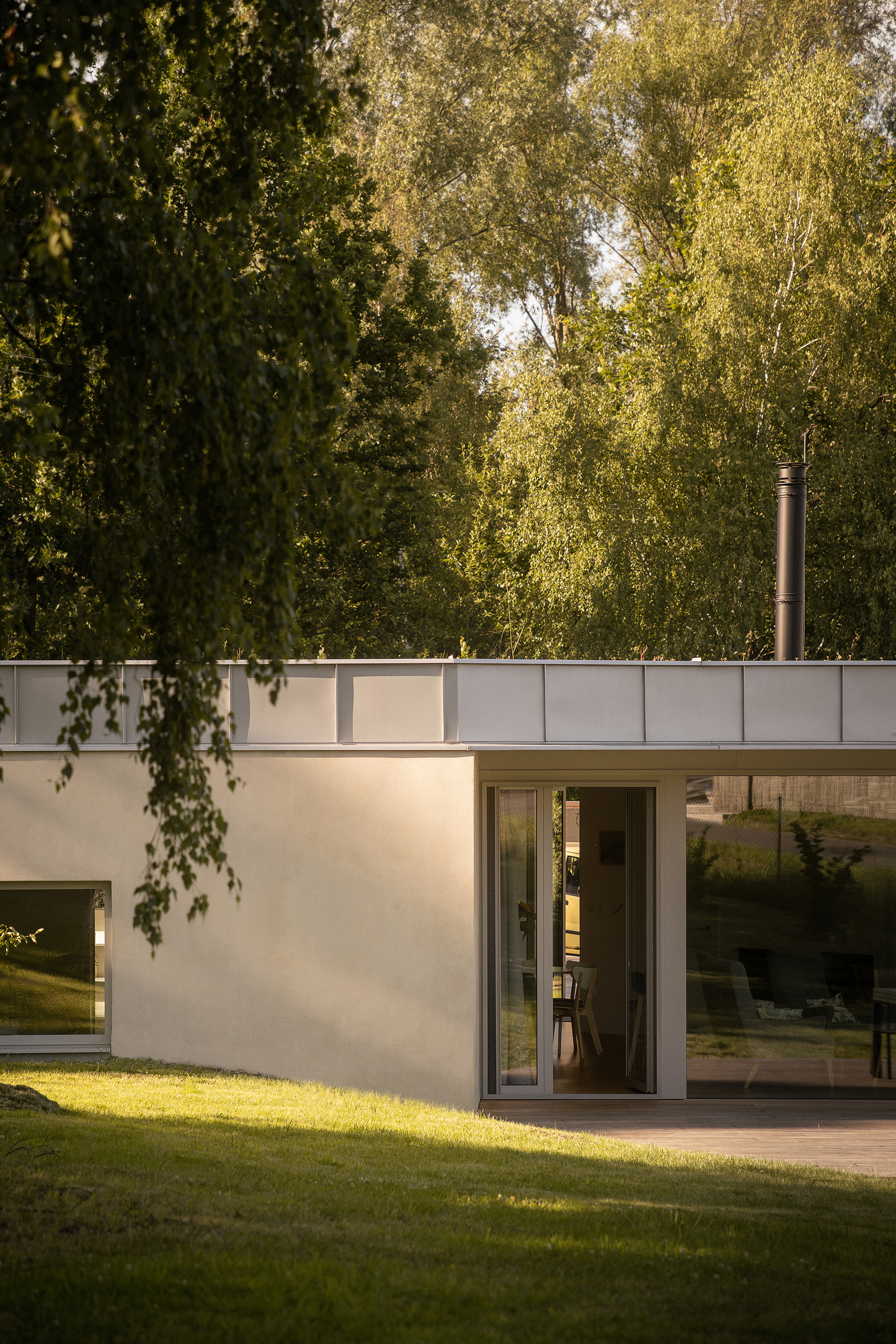 Jeden z autorov Šimon Bierhanzl dopĺňa: “Dům je částečně zapuštěn do terénu a svým celkovým tvarem, malou výškou, zvolenou extenzivní zelenou střechou a přírodním charakterem se začleňuje do zahrady, která se tak stává nedílnou součástí domu a naopak.”
