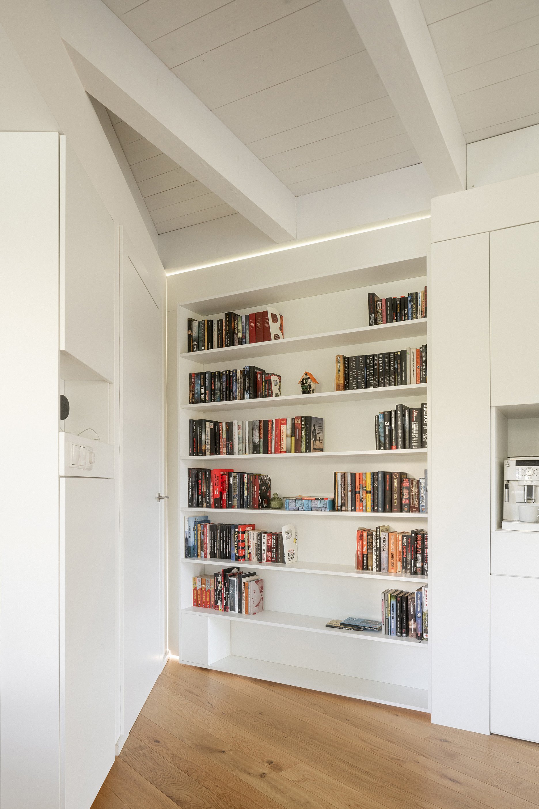 Odpoveďou na zadanie klientov je koncept troch murovaných "kvádrov" pod spoločným trámovým stropom. Tri striktne vymedzené objemy s odlišnými funkciami medzi sebou vytvárajú nepravidelnú dennú zónu s výrazným kuchynským kútom s barovým pultom. Priestor obývacej izby a jedálne dotvárajú vstavané skrine, krbové kachle a zákutia pracovne a predsiene. Interiér je prepojený so záhradou prostredníctvom rozmerných presklených plôch. Jednotlivé zóny je možné vzájomne deliť otočnou knižnicou a posuvnými dverami. Spoločný priestor sa tak dokáže flexibilne prispôsobiť aktuálnym potrebám rodiny.
