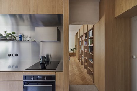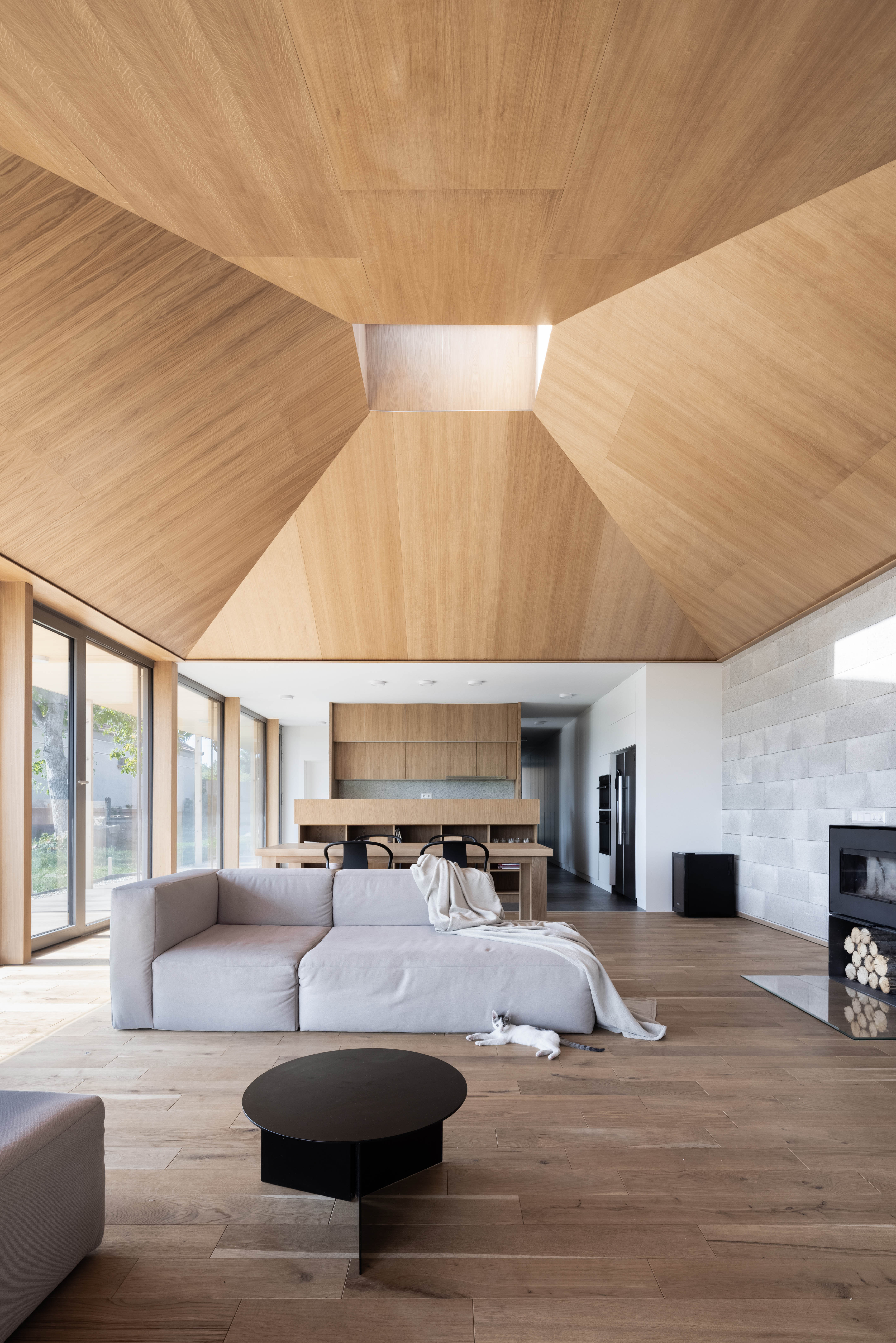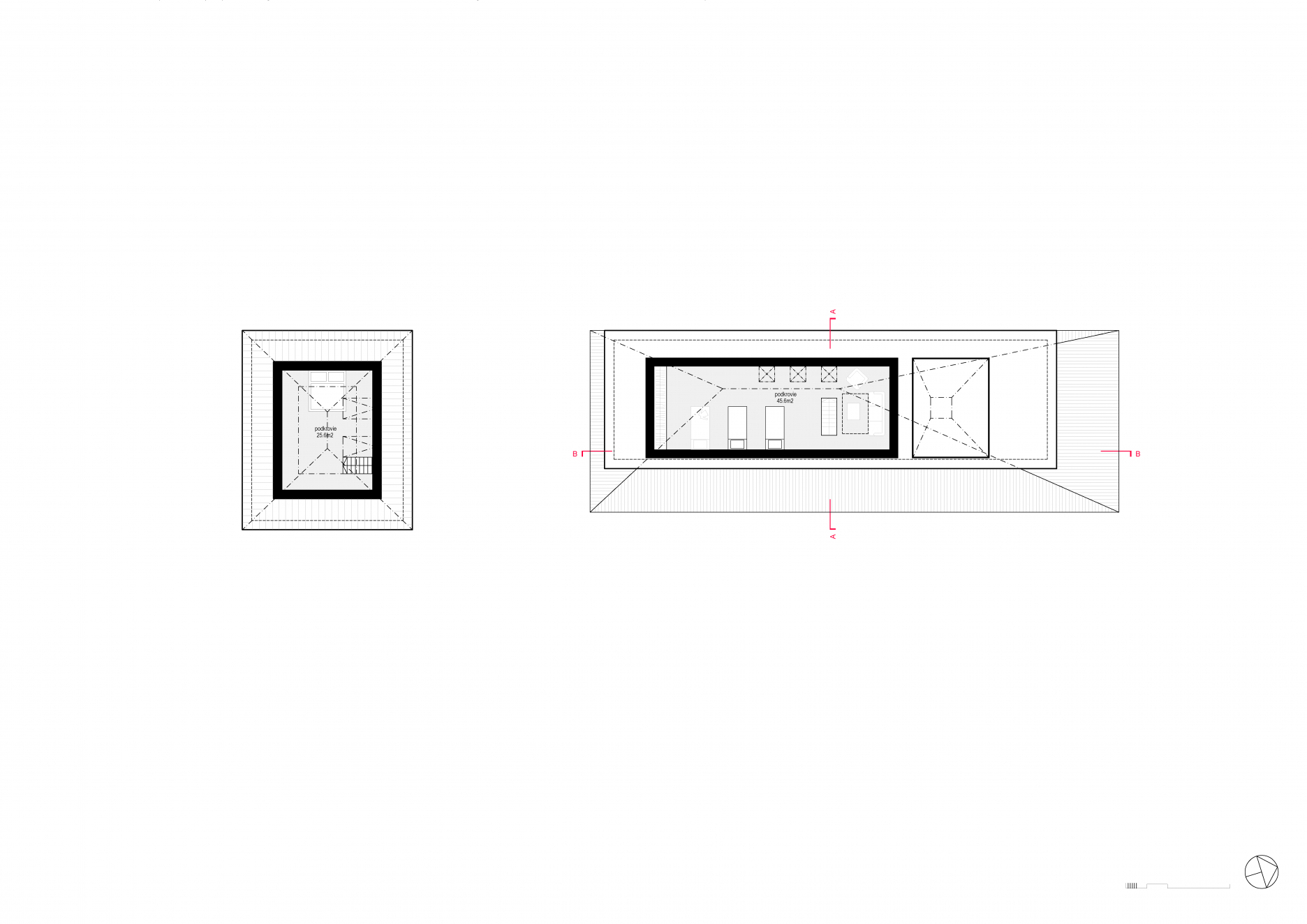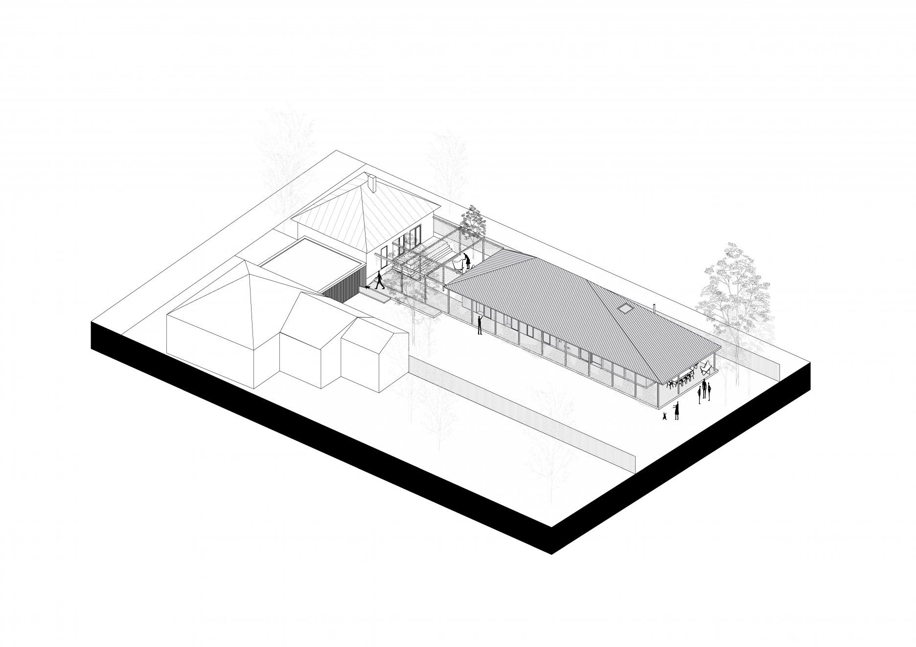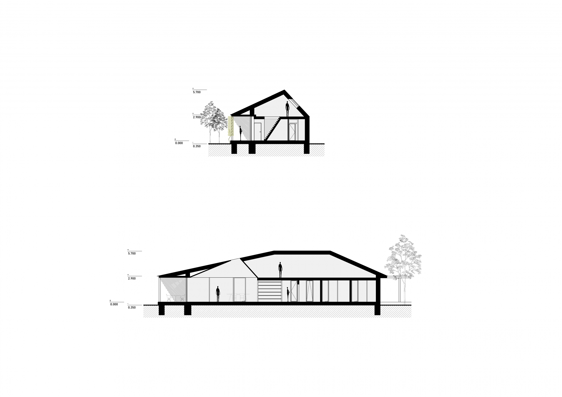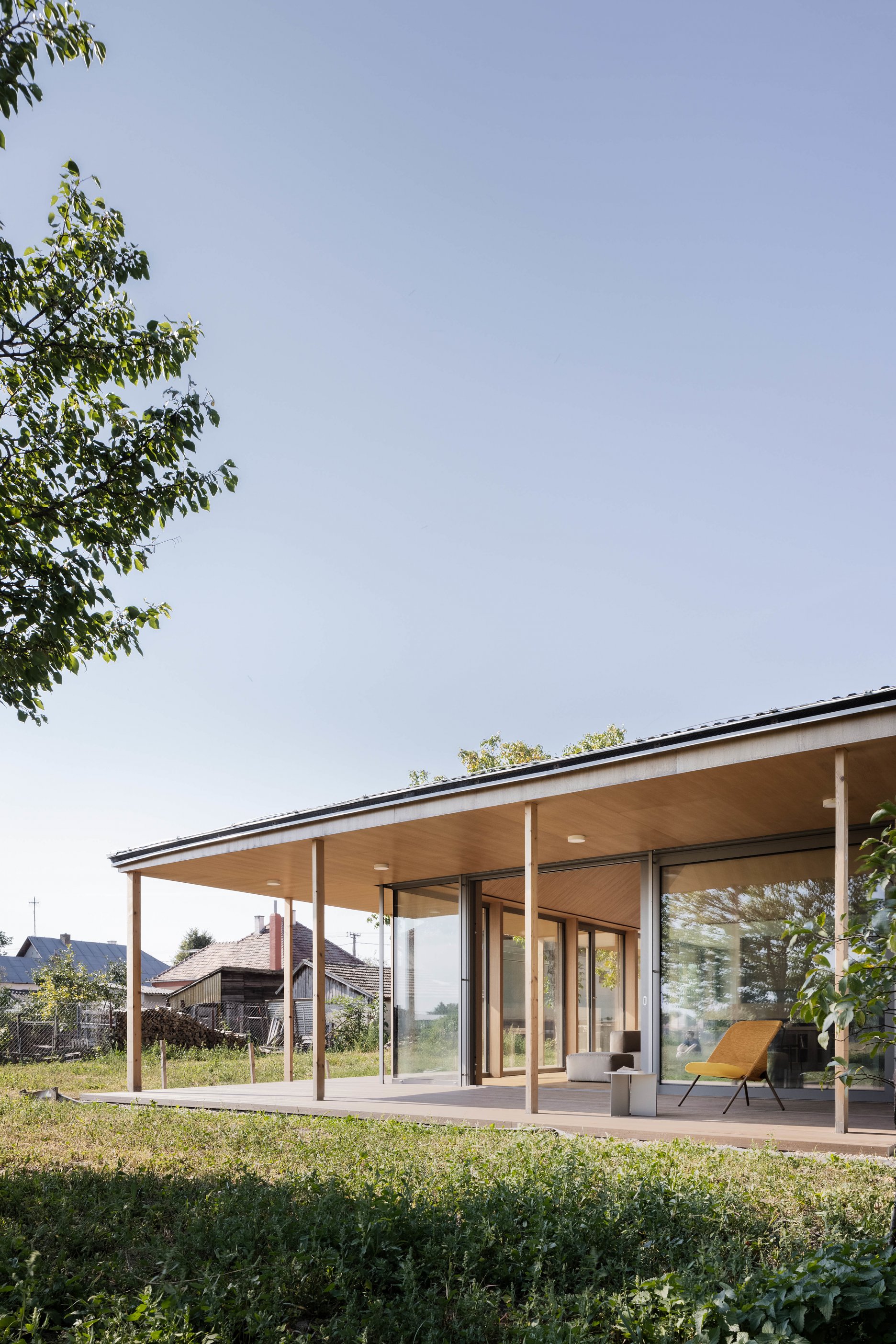 Adícia nového objemu umožňuje naplnenie požiadaviek a kapacít bez kompromisov, s rešpektom k pôvodnej zástavbe. Dom sa svojím usporiadaním a hmotovou skladbou odvoláva na staré jednopodlažné pozdĺžne domy s gánkom. S typickým tvaroslovím pracuje v náznakoch. Jednoduchá dispozícia čo najviac ťaží zo záhrady, výhľadov a rozsiahlej prestrešenej terasy okolo celého domu. Dennej zóne dominuje svetlík, symbolicky tak akcentuje hlavný priestor domu, kde sa stretáva rodina a priatelia. Svetlík naviac osvetľuje priestor pri potrebe letného tienenia a vďaka komínovému efektu je priestor dobre vetrateľný. Časť podkrovia je zobytnená, prístupná skrytým schodiskom pre hostí a priateľov, figúra domu však ostáva jednopodlažná tak, ako to bolo pre tento dom typické.