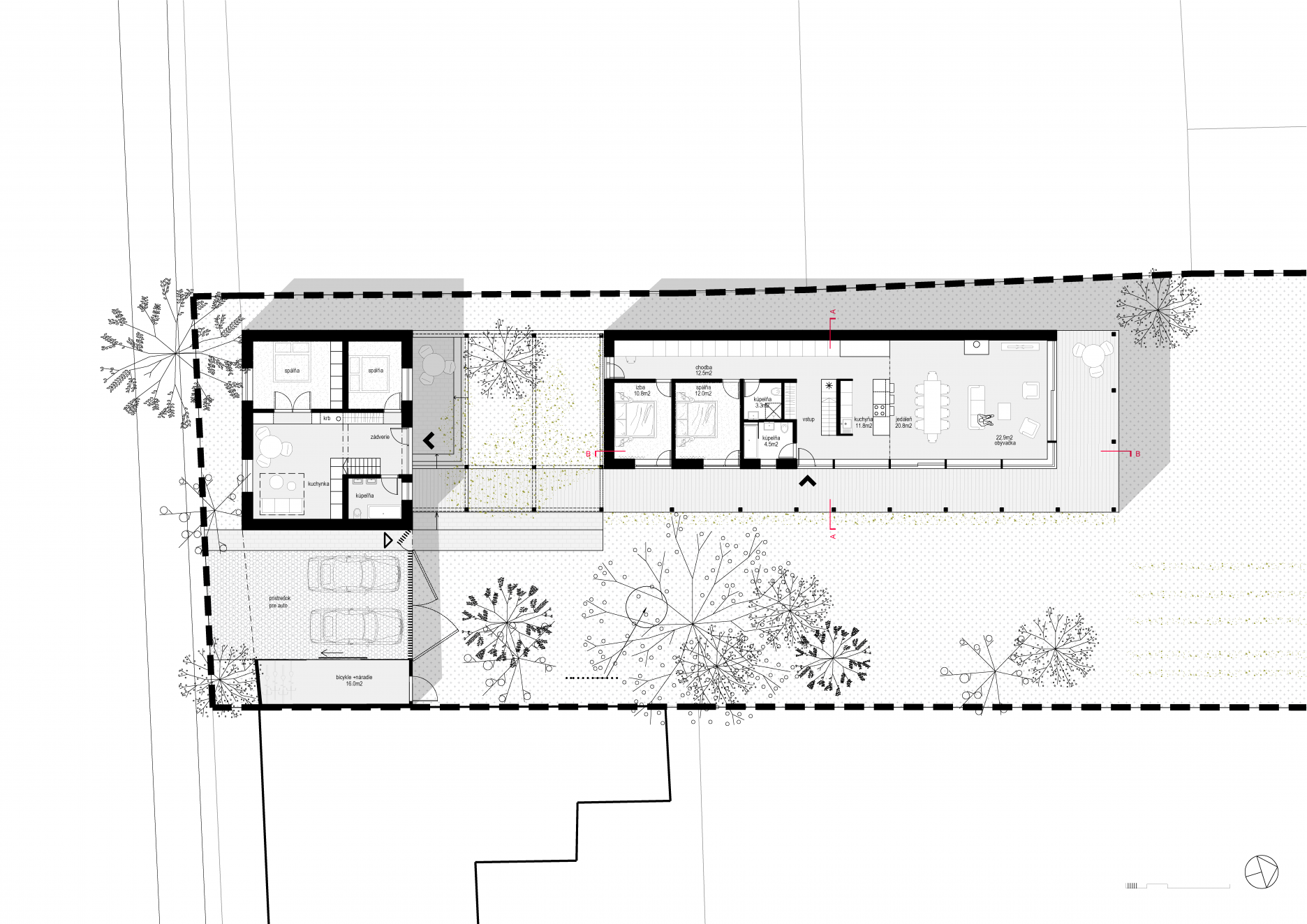 Pozemok a vzťah medzi starým a novým domom ešte nie je plne zadefinovaný. Postupne sa má pridať pergola spájajúca domy, či prístrešok na autá, rozsah bude vychádzať z reálnych potrieb obyvateľom domu. Vzniknú tak rôzne atmosféry záhrady a jej zákutí. Najsúkromnejšia v časti pod pergolou medzi domami až po úplne otvorenú bujnú úžitkovú záhradu na konci pozemku.