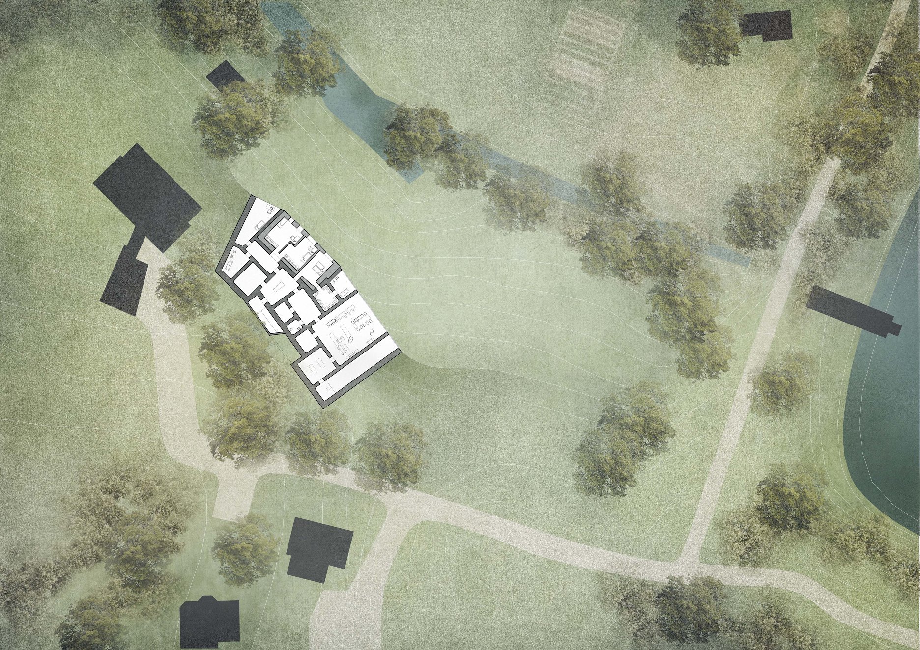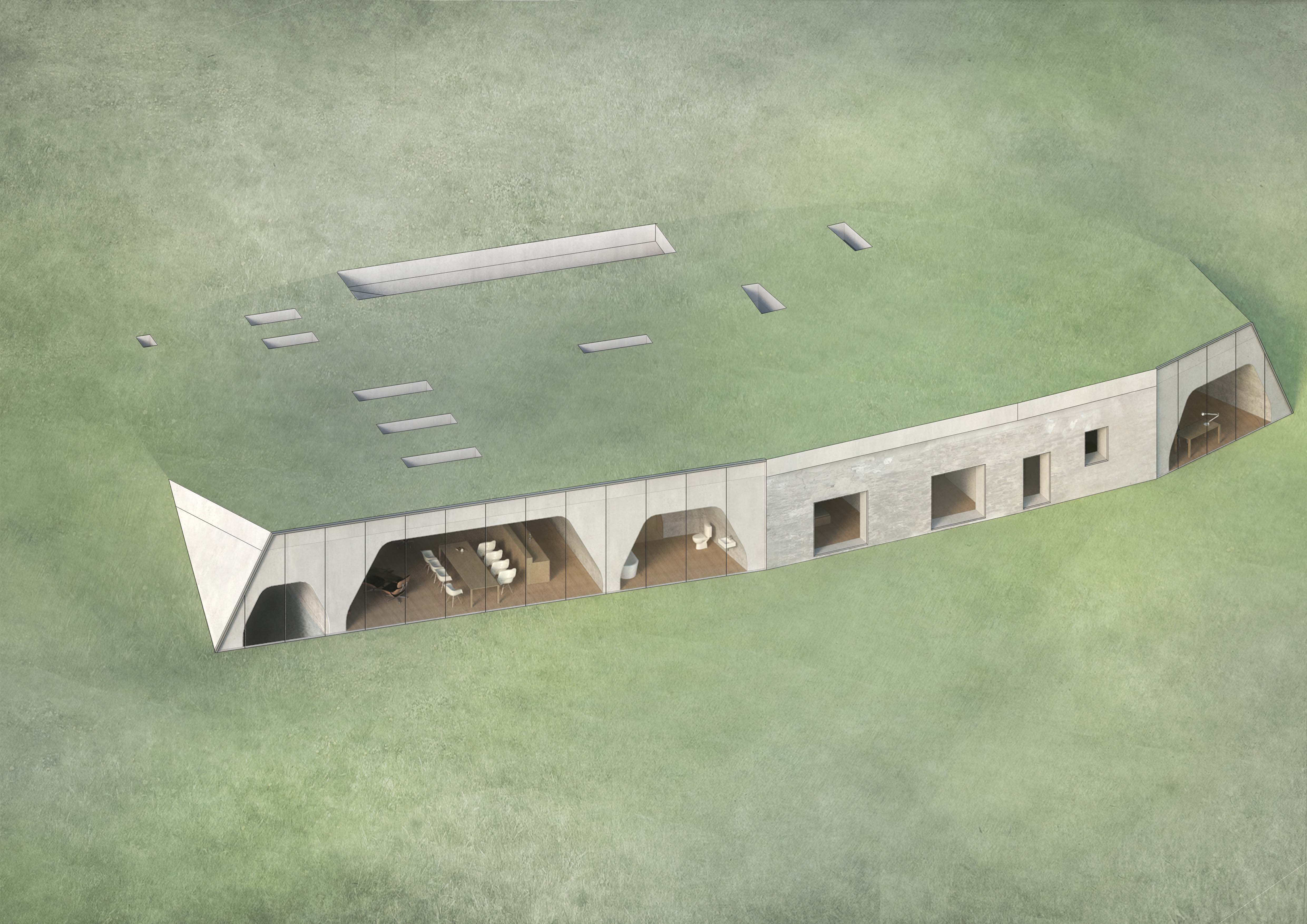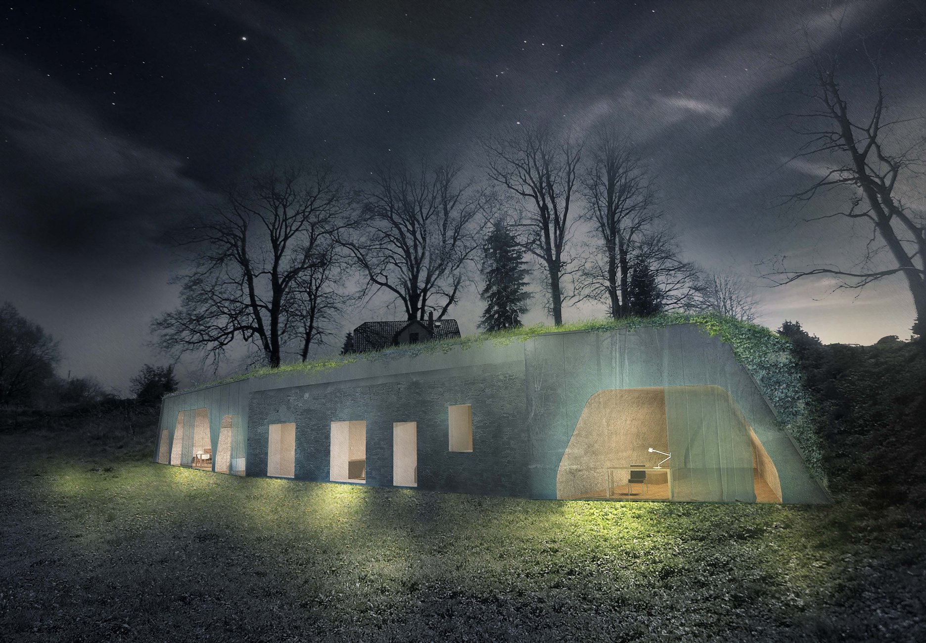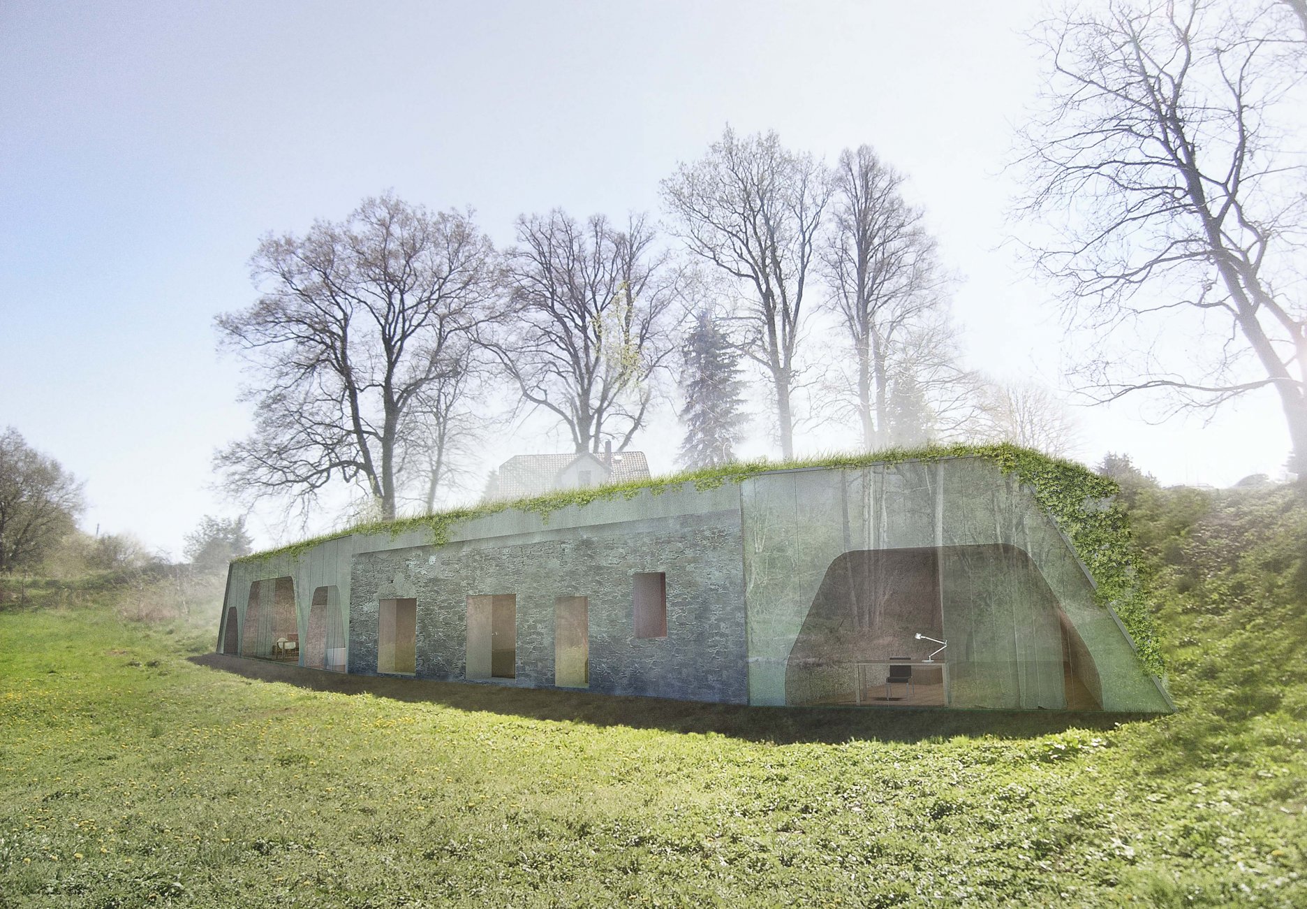 Dom zasadený do terénneho zlomu chce potvrdiť svoje poslanie nielen po urbanistickej stránke, ale aj v architektonickom výraze. Architekti sa snažia krajinu transformovať do výrazu stavby. Zemina je odkopaná na miestach, kde budú stáť steny. Krajina teda poslúži ako forma, do ktorej sa bude liať betón. Po zatvrdnutí betónu sa odoberie pôda, ktorá tvorila stratené debnenie. Výsledný objekt tak bude predstavovať odtlačok krajiny. Textúra miesta sa stane neopakovateľným motívom vnútorných povrchov. Vnútorné steny zohľadňujú sklon odoberaného terénu. Táto profilácia sa mení na vonkajšej fasáde v mieste terénneho zlomu. Ako stratené debnenie tu slúži pôvodná kamenná stavba, z ktorej bola odstránená strecha. S pôvodným objektom architekti nepracujú ako s pamiatkou, ale ako s hmotou, ktorá sa stane úplnou súčasťou novej stavby. Pôvodný objekt aj nová betónová substancia je prekrytá spoločnou strešnou doskou. Zelená strecha napomáha začleneniu stavby do krajiny. Najviac viditeľným miestom je priečelie, ktoré rešpektuje geometriu terénneho zlomu a je orientované smerom k potoku.