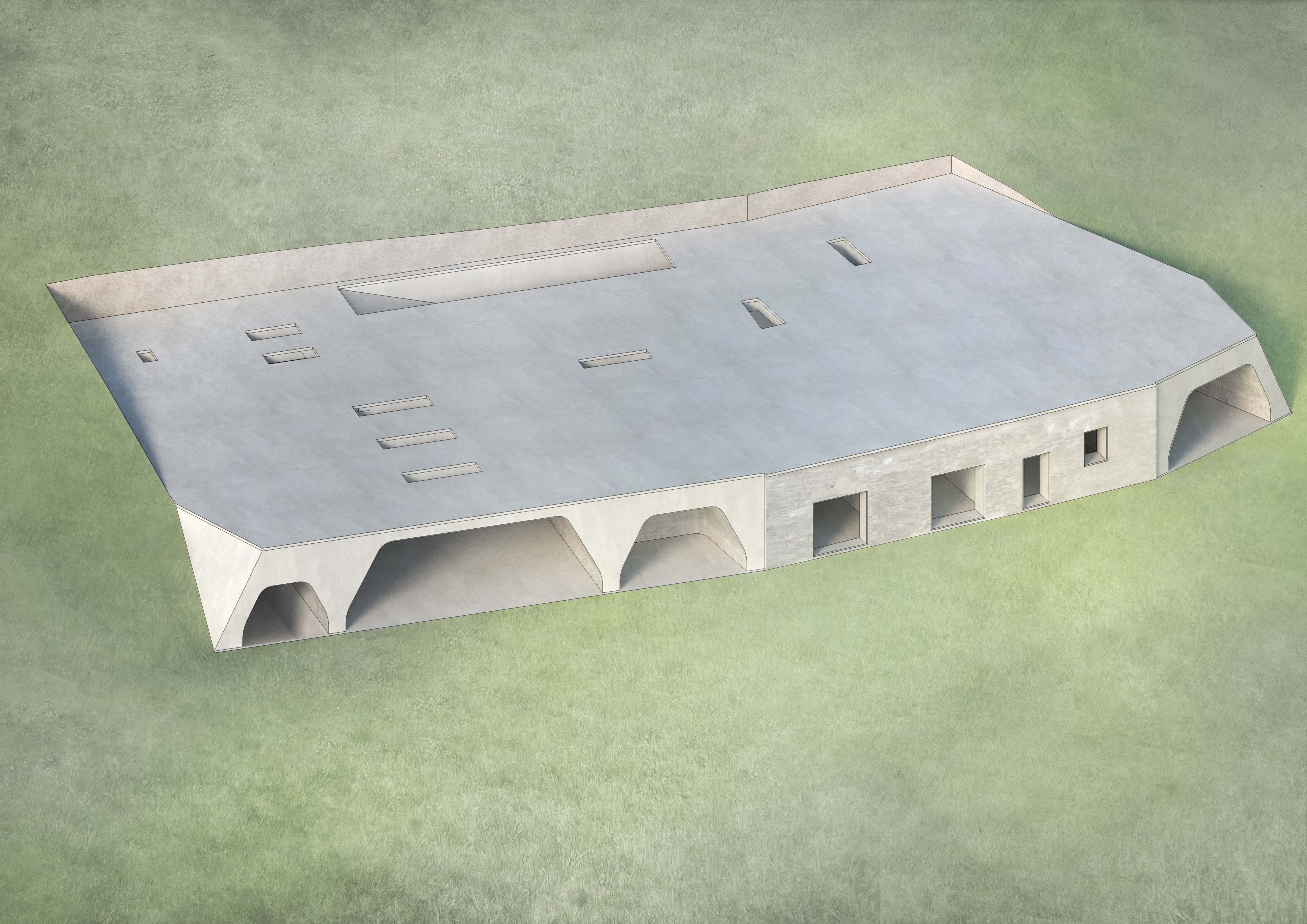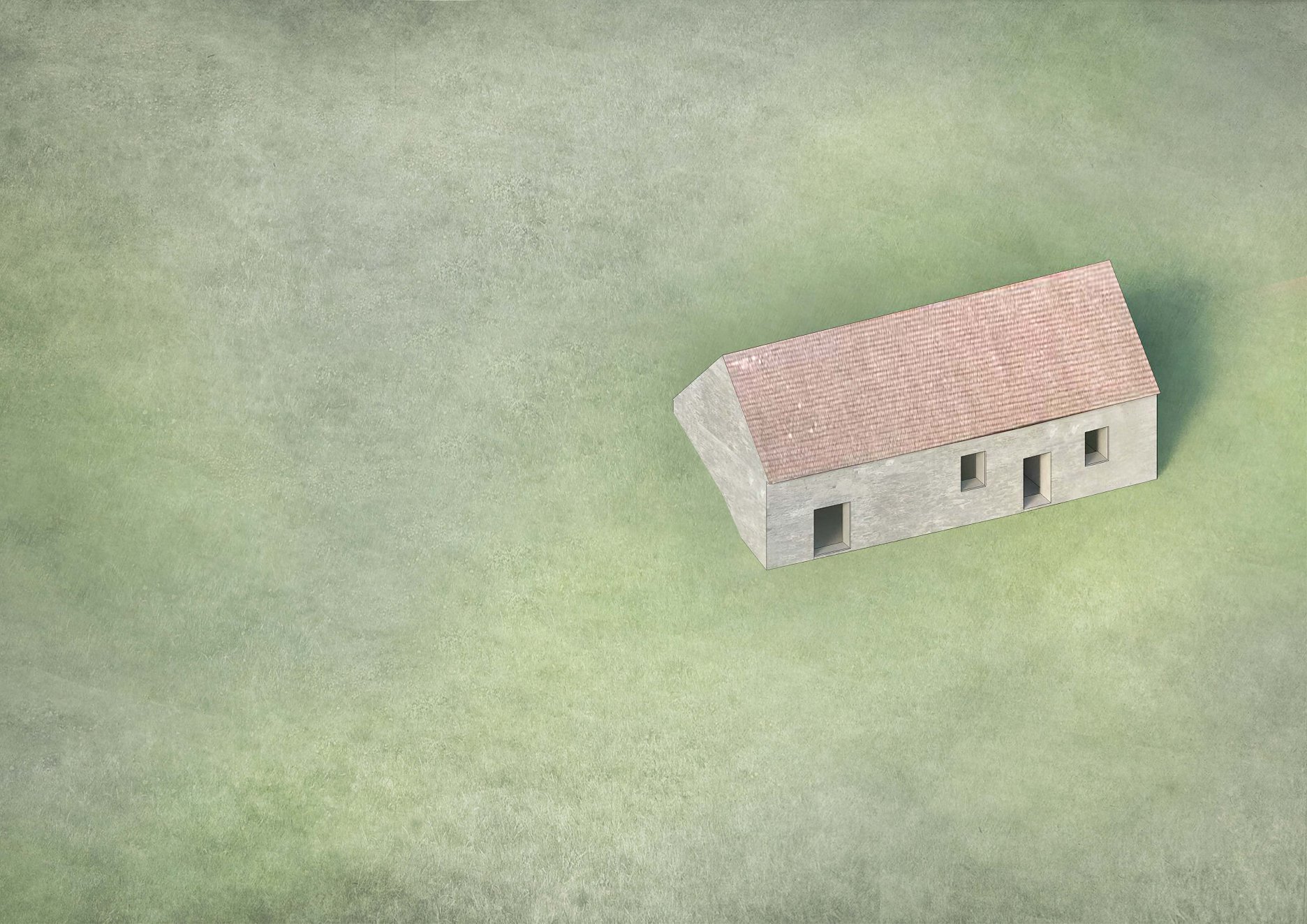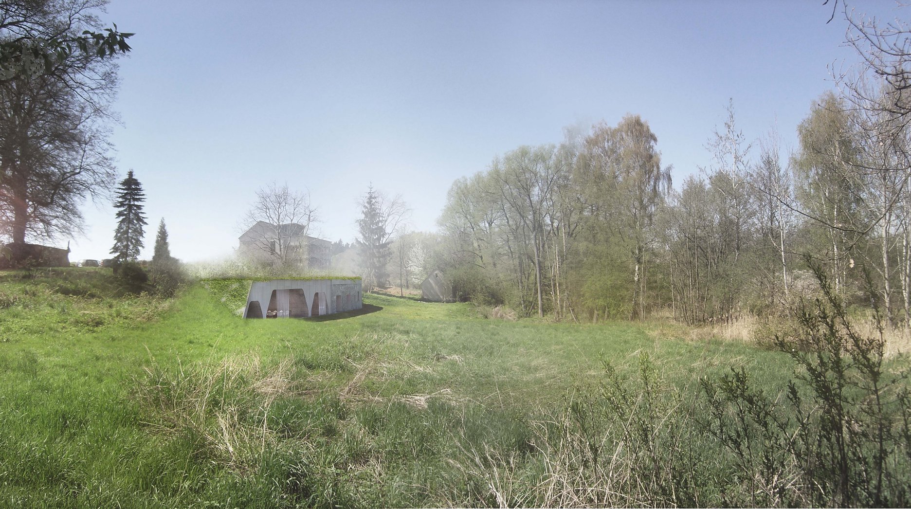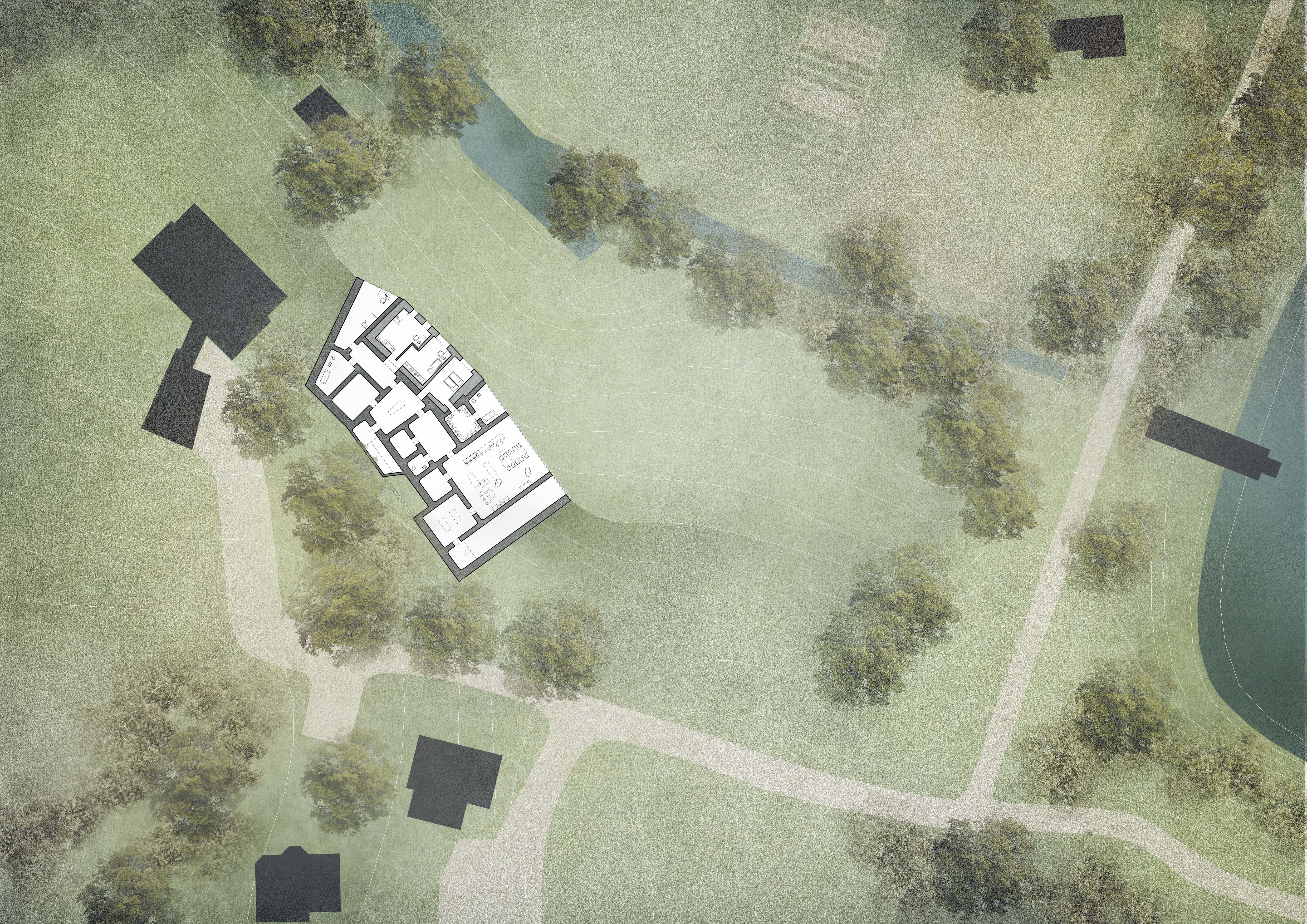 Dom zasadený do terénneho zlomu chce potvrdiť svoje poslanie nielen po urbanistickej stránke, ale aj v architektonickom výraze. Architekti sa snažia krajinu transformovať do výrazu stavby. Zemina je odkopaná na miestach, kde budú stáť steny. Krajina teda poslúži ako forma, do ktorej sa bude liať betón. Po zatvrdnutí betónu sa odoberie pôda, ktorá tvorila stratené debnenie. Výsledný objekt tak bude predstavovať odtlačok krajiny. Textúra miesta sa stane neopakovateľným motívom vnútorných povrchov. Vnútorné steny zohľadňujú sklon odoberaného terénu. Táto profilácia sa mení na vonkajšej fasáde v mieste terénneho zlomu. Ako stratené debnenie tu slúži pôvodná kamenná stavba, z ktorej bola odstránená strecha. S pôvodným objektom architekti nepracujú ako s pamiatkou, ale ako s hmotou, ktorá sa stane úplnou súčasťou novej stavby. Pôvodný objekt aj nová betónová substancia je prekrytá spoločnou strešnou doskou. Zelená strecha napomáha začleneniu stavby do krajiny. Najviac viditeľným miestom je priečelie, ktoré rešpektuje geometriu terénneho zlomu a je orientované smerom k potoku.