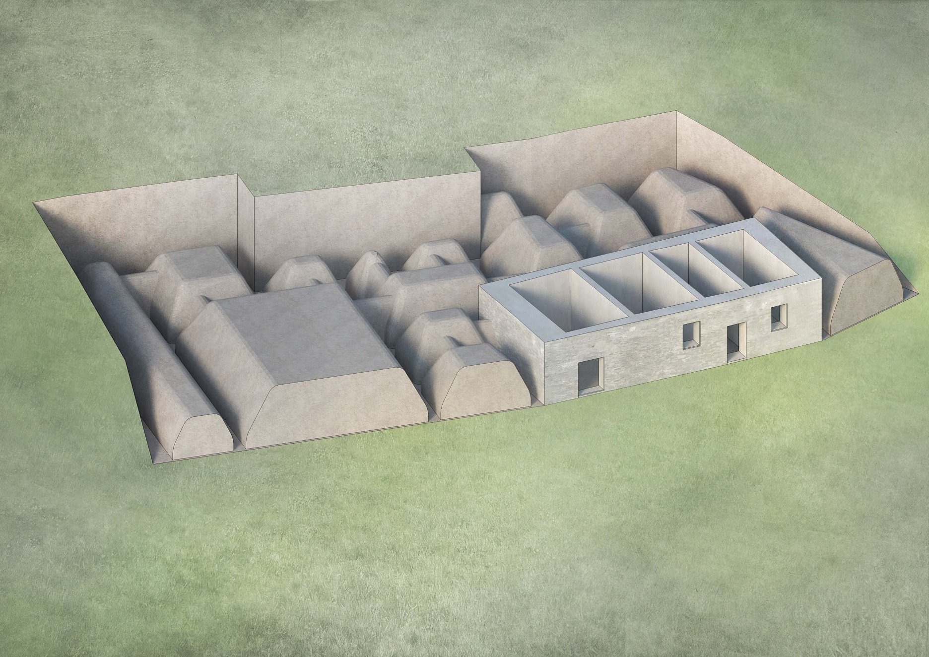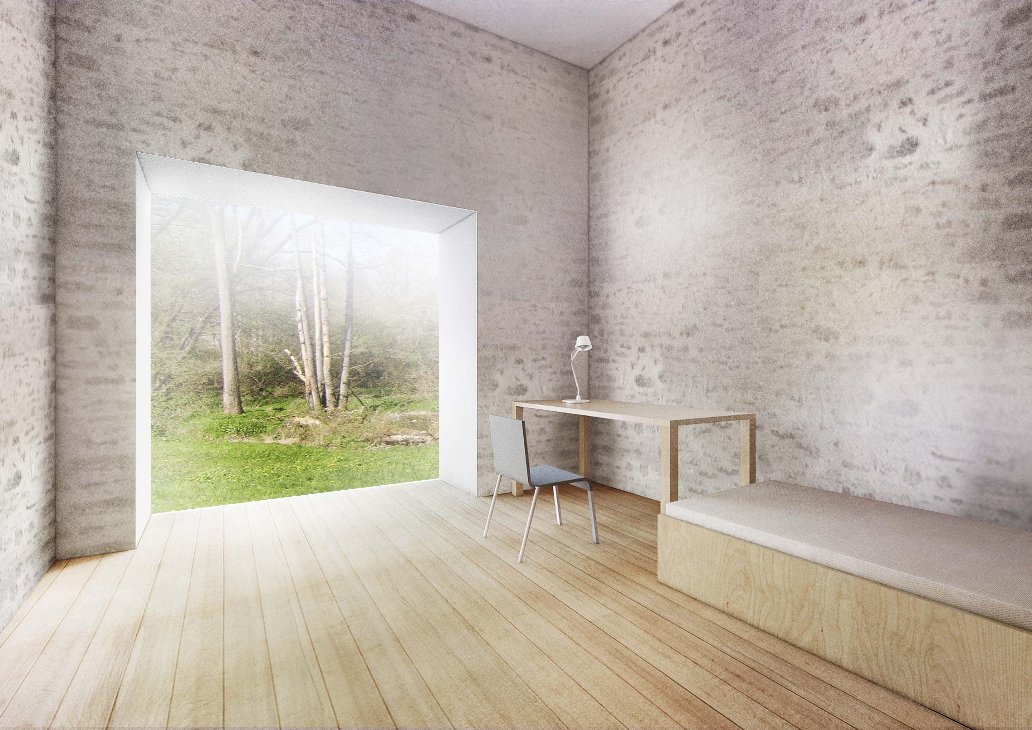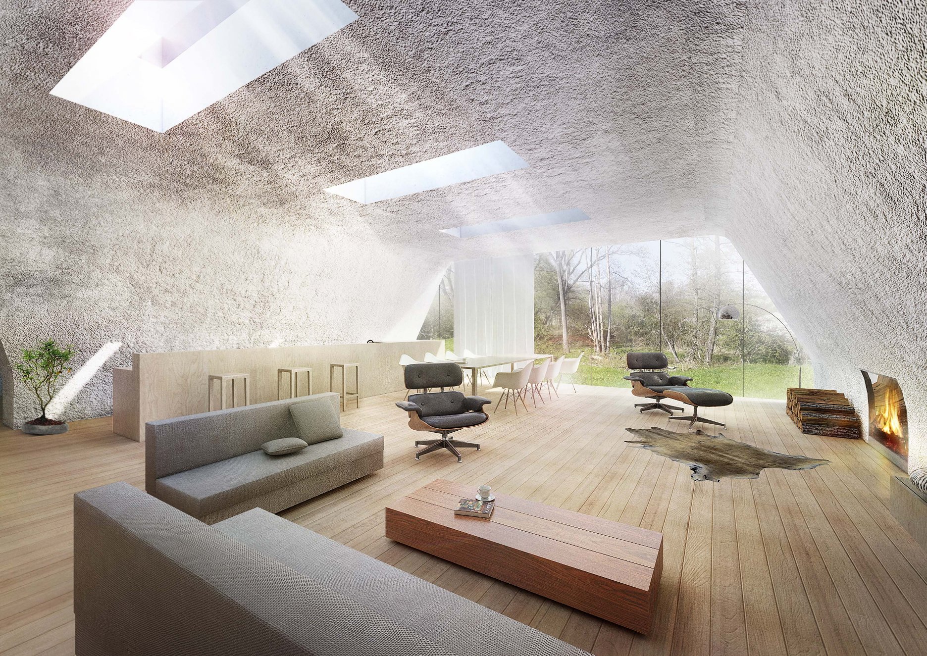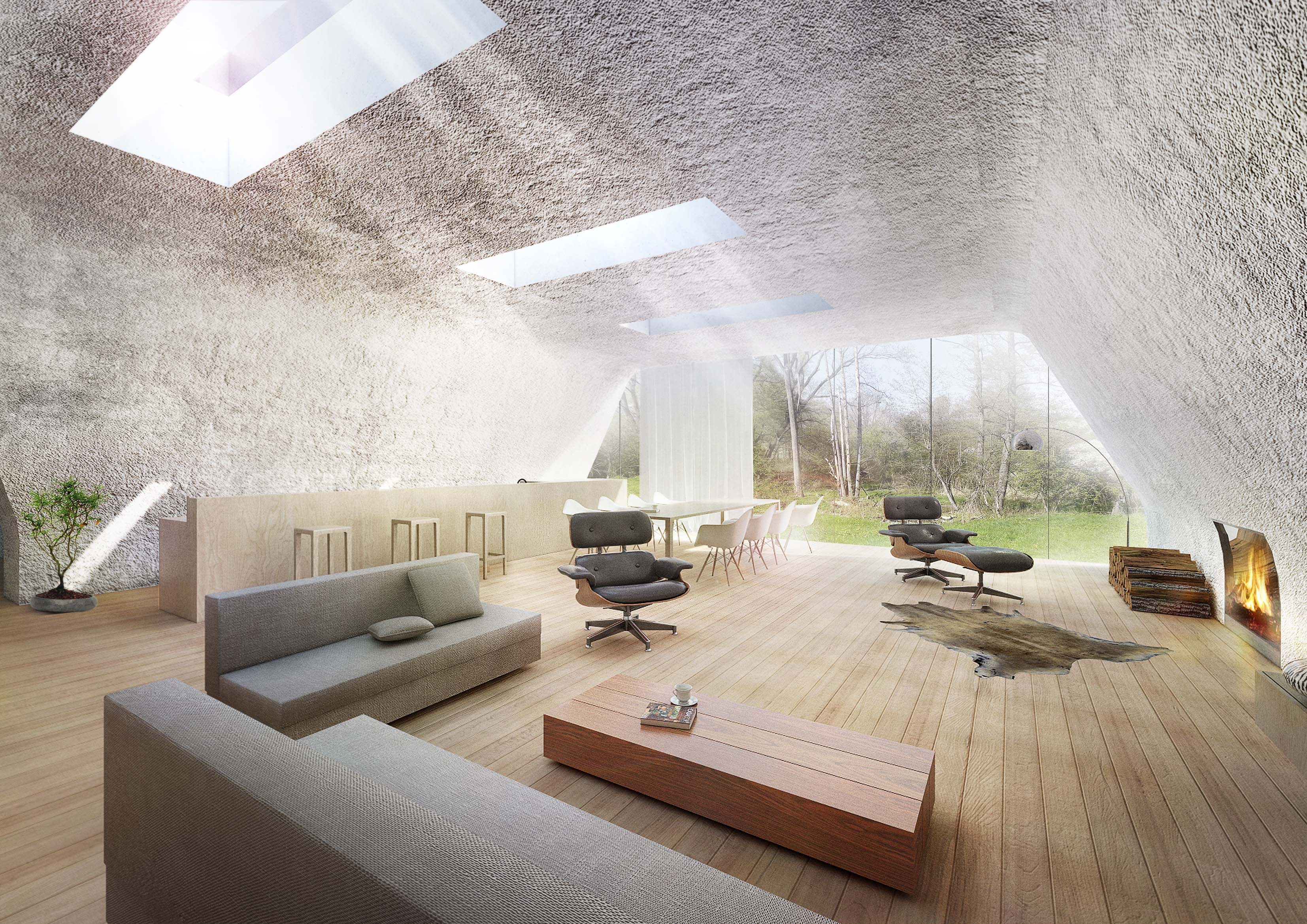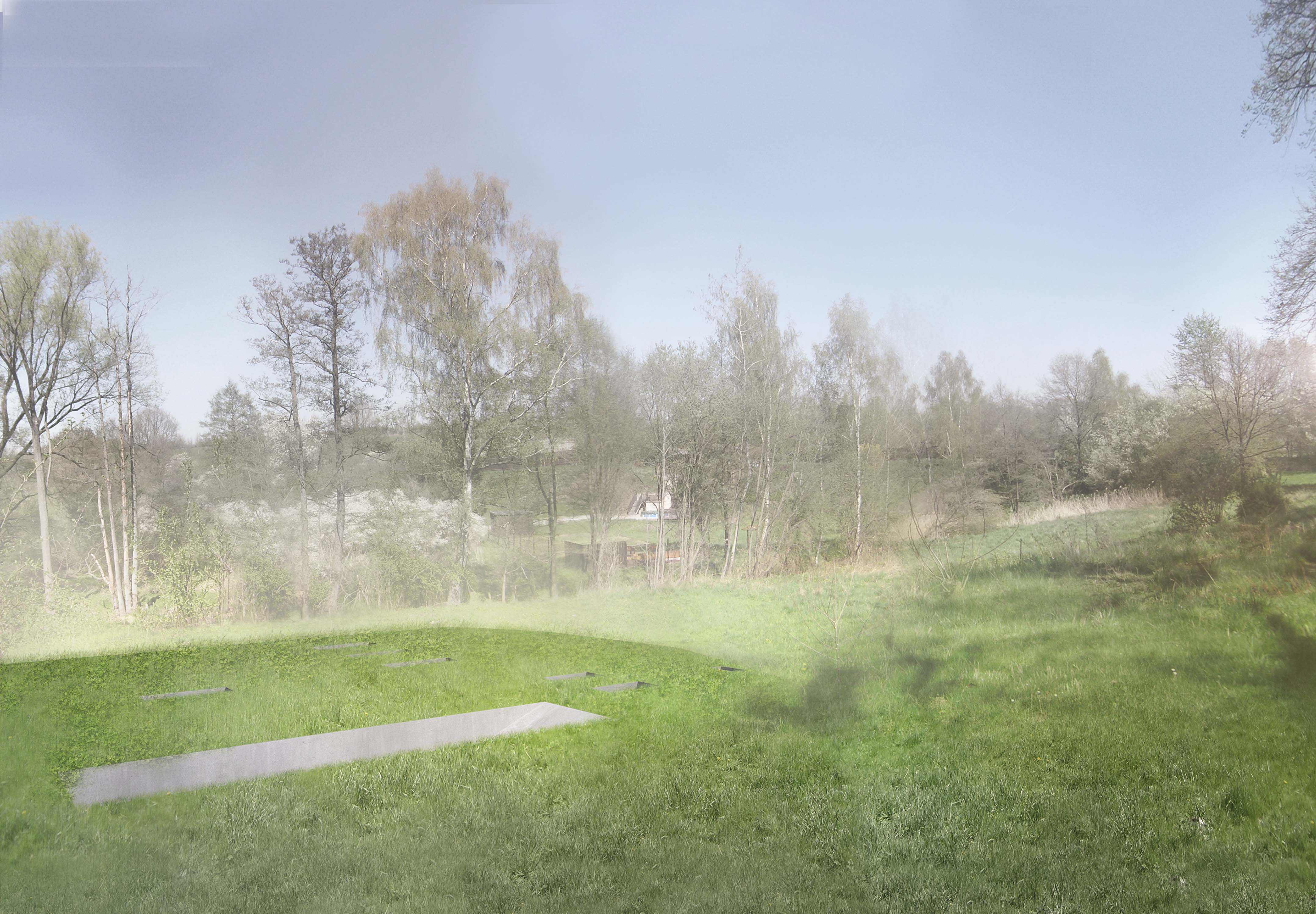 Dom zasadený do terénneho zlomu chce potvrdiť svoje poslanie nielen po urbanistickej stránke, ale aj v architektonickom výraze. Architekti sa snažia krajinu transformovať do výrazu stavby. Zemina je odkopaná na miestach, kde budú stáť steny. Krajina teda poslúži ako forma, do ktorej sa bude liať betón. Po zatvrdnutí betónu sa odoberie pôda, ktorá tvorila stratené debnenie. Výsledný objekt tak bude predstavovať odtlačok krajiny. Textúra miesta sa stane neopakovateľným motívom vnútorných povrchov. Vnútorné steny zohľadňujú sklon odoberaného terénu. Táto profilácia sa mení na vonkajšej fasáde v mieste terénneho zlomu. Ako stratené debnenie tu slúži pôvodná kamenná stavba, z ktorej bola odstránená strecha. S pôvodným objektom architekti nepracujú ako s pamiatkou, ale ako s hmotou, ktorá sa stane úplnou súčasťou novej stavby. Pôvodný objekt aj nová betónová substancia je prekrytá spoločnou strešnou doskou. Zelená strecha napomáha začleneniu stavby do krajiny. Najviac viditeľným miestom je priečelie, ktoré rešpektuje geometriu terénneho zlomu a je orientované smerom k potoku.