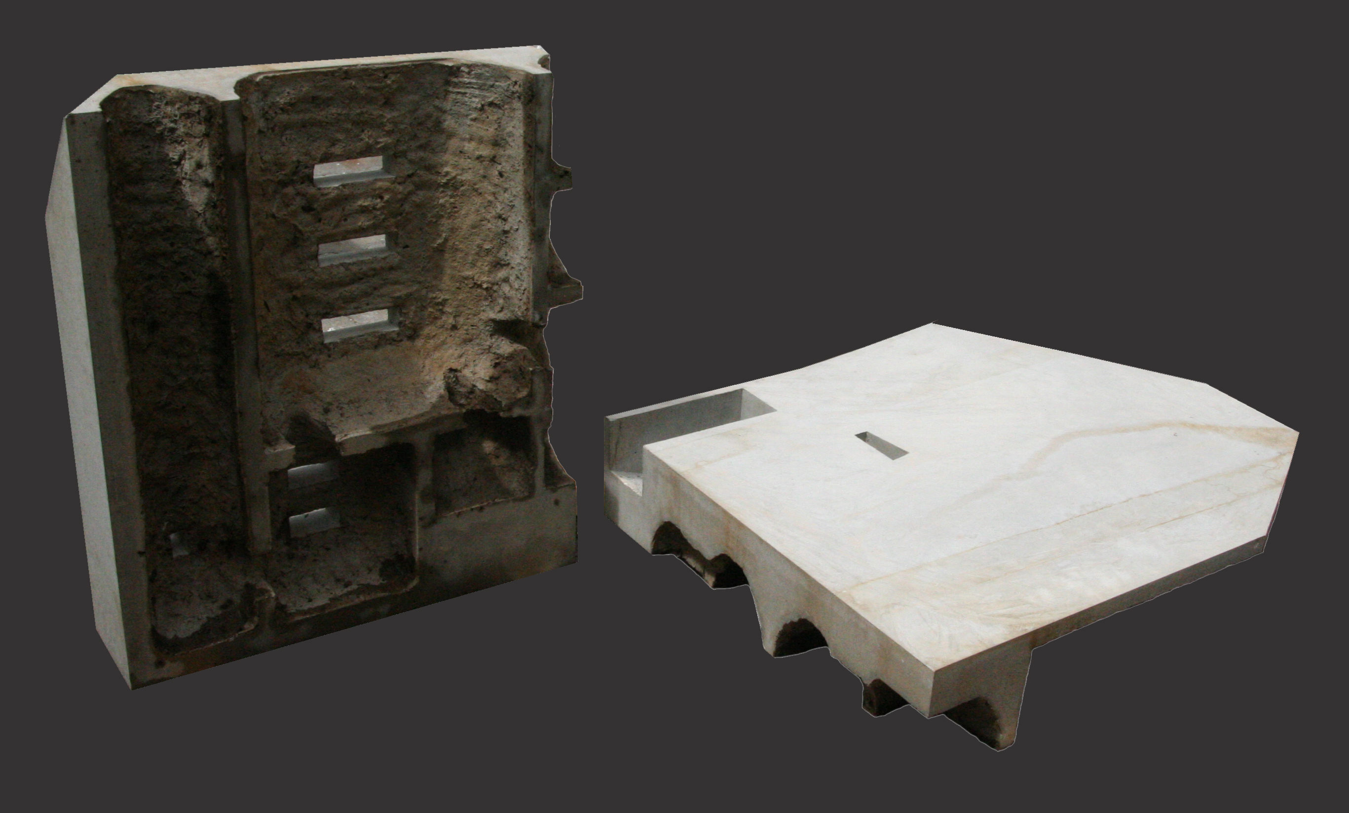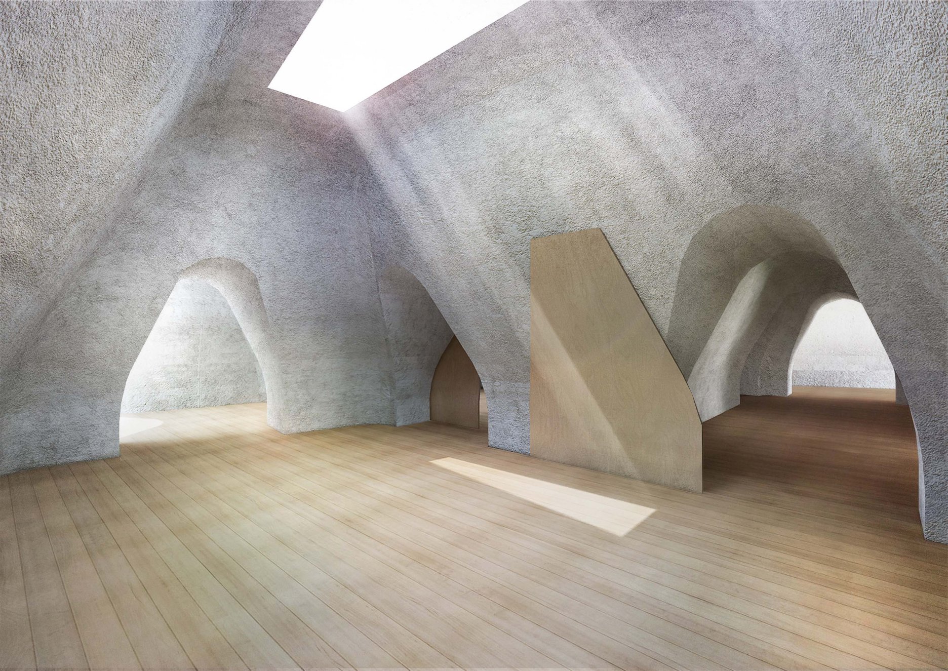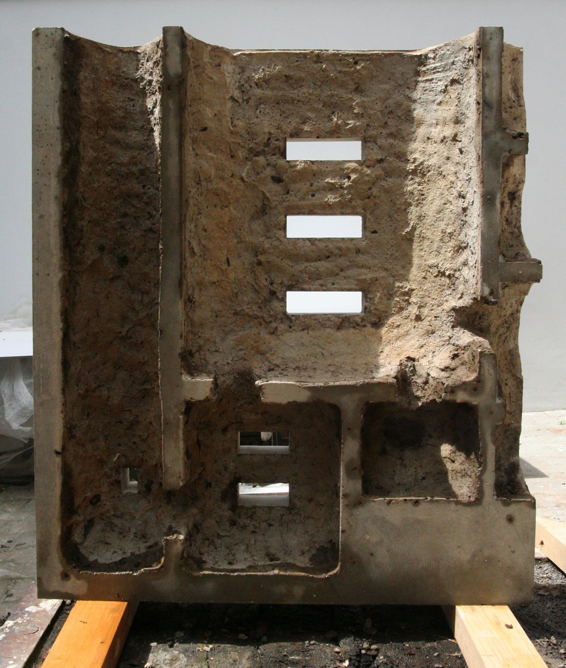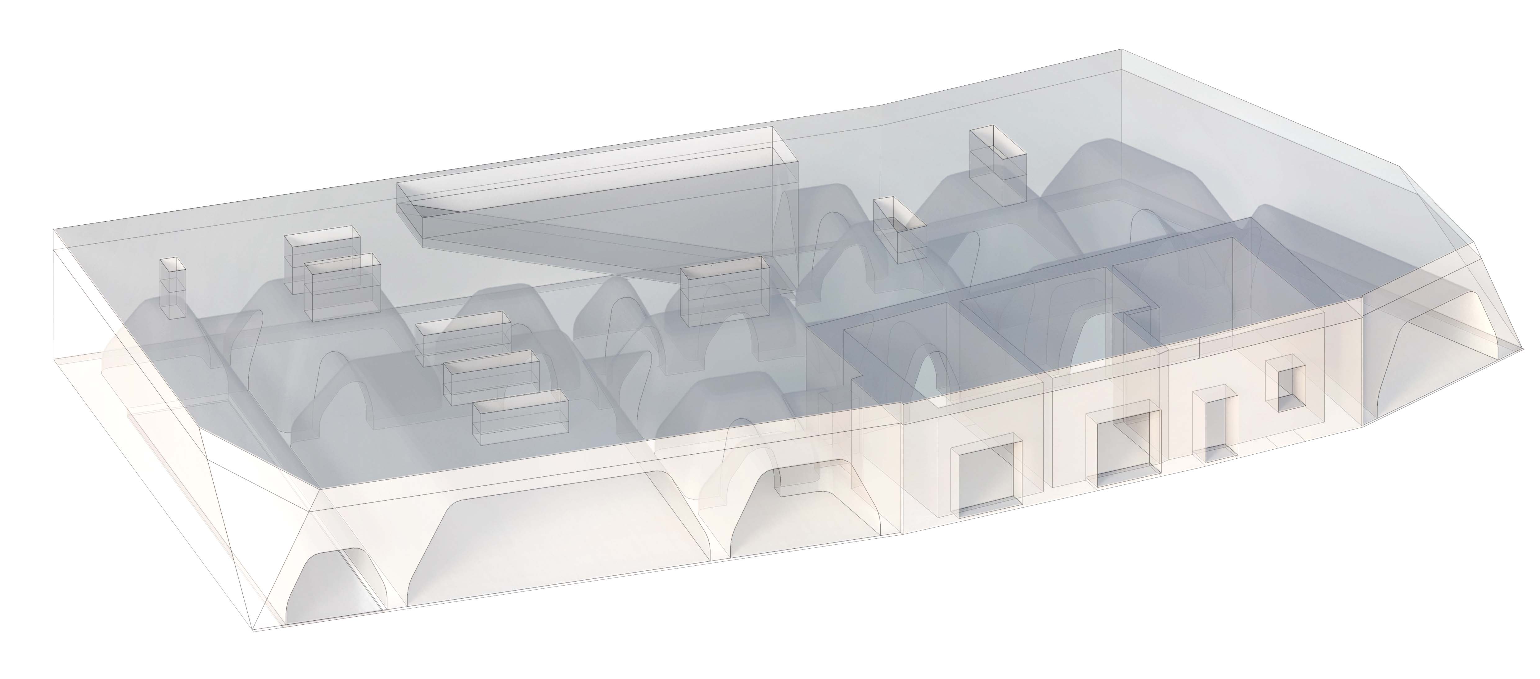Dom zasadený do terénneho zlomu chce potvrdiť svoje poslanie nielen po urbanistickej stránke, ale aj v architektonickom výraze. Architekti sa snažia krajinu transformovať do výrazu stavby. Zemina je odkopaná na miestach, kde budú stáť steny. Krajina teda poslúži ako forma, do ktorej sa bude liať betón. Po zatvrdnutí betónu sa odoberie pôda, ktorá tvorila stratené debnenie. Výsledný objekt tak bude predstavovať odtlačok krajiny. Textúra miesta sa stane neopakovateľným motívom vnútorných povrchov. Vnútorné steny zohľadňujú sklon odoberaného terénu. Táto profilácia sa mení na vonkajšej fasáde v mieste terénneho zlomu. Ako stratené debnenie tu slúži pôvodná kamenná stavba, z ktorej bola odstránená strecha. S pôvodným objektom architekti nepracujú ako s pamiatkou, ale ako s hmotou, ktorá sa stane úplnou súčasťou novej stavby. Pôvodný objekt aj nová betónová substancia je prekrytá spoločnou strešnou doskou. Zelená strecha napomáha začleneniu stavby do krajiny. Najviac viditeľným miestom je priečelie, ktoré rešpektuje geometriu terénneho zlomu a je orientované smerom k potoku.