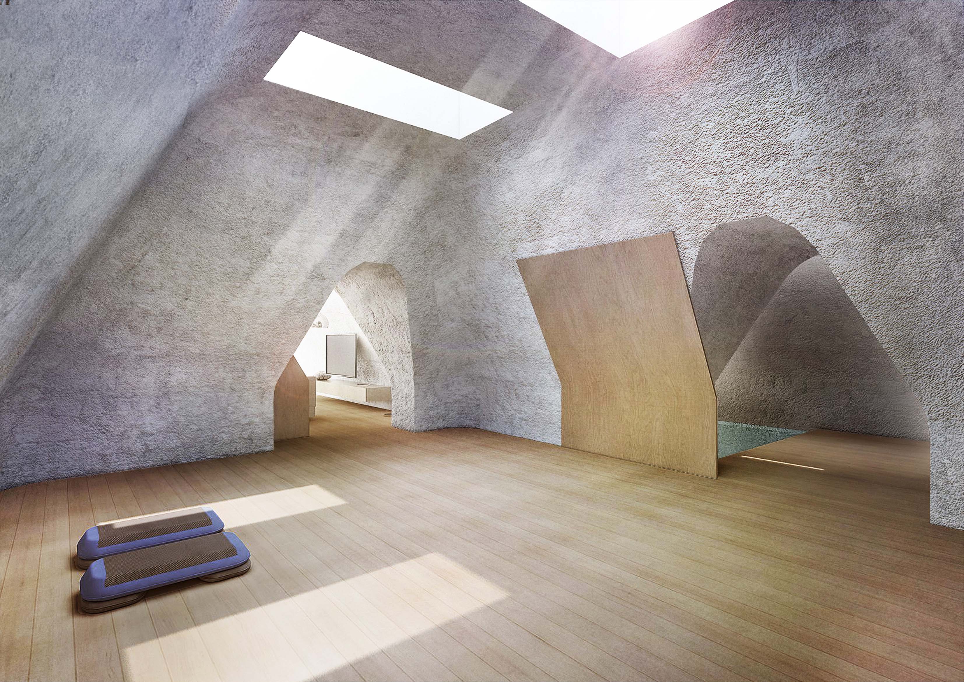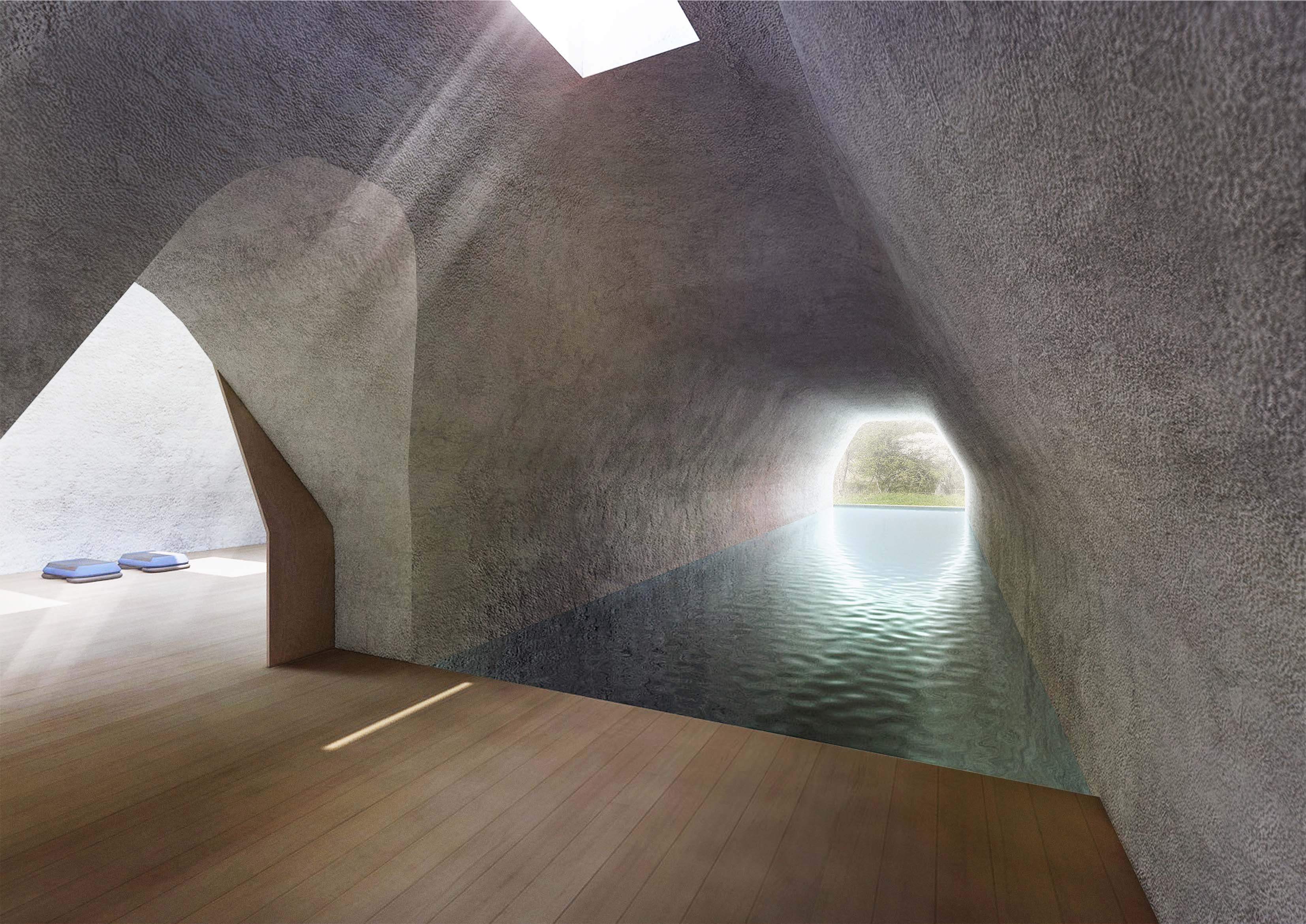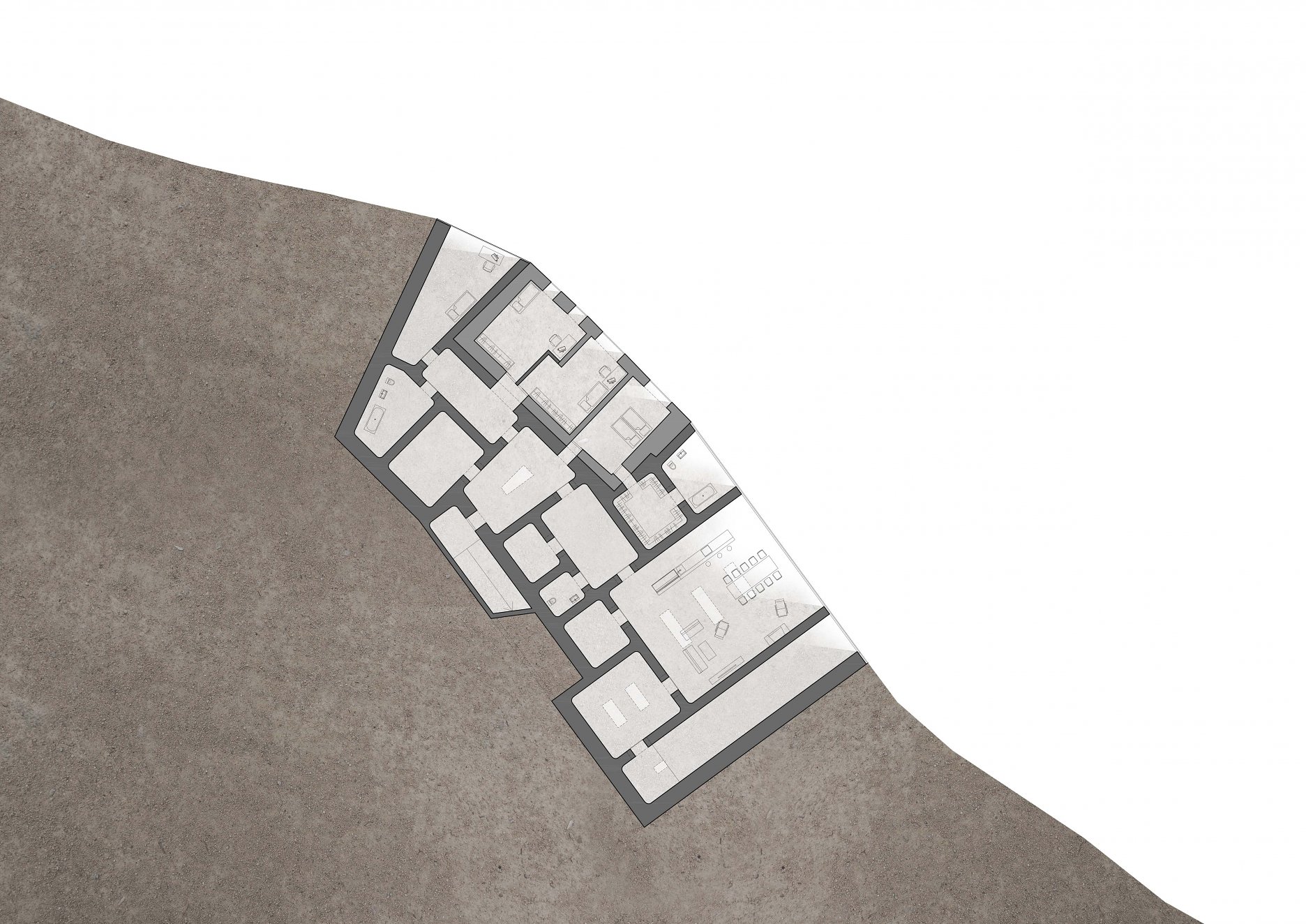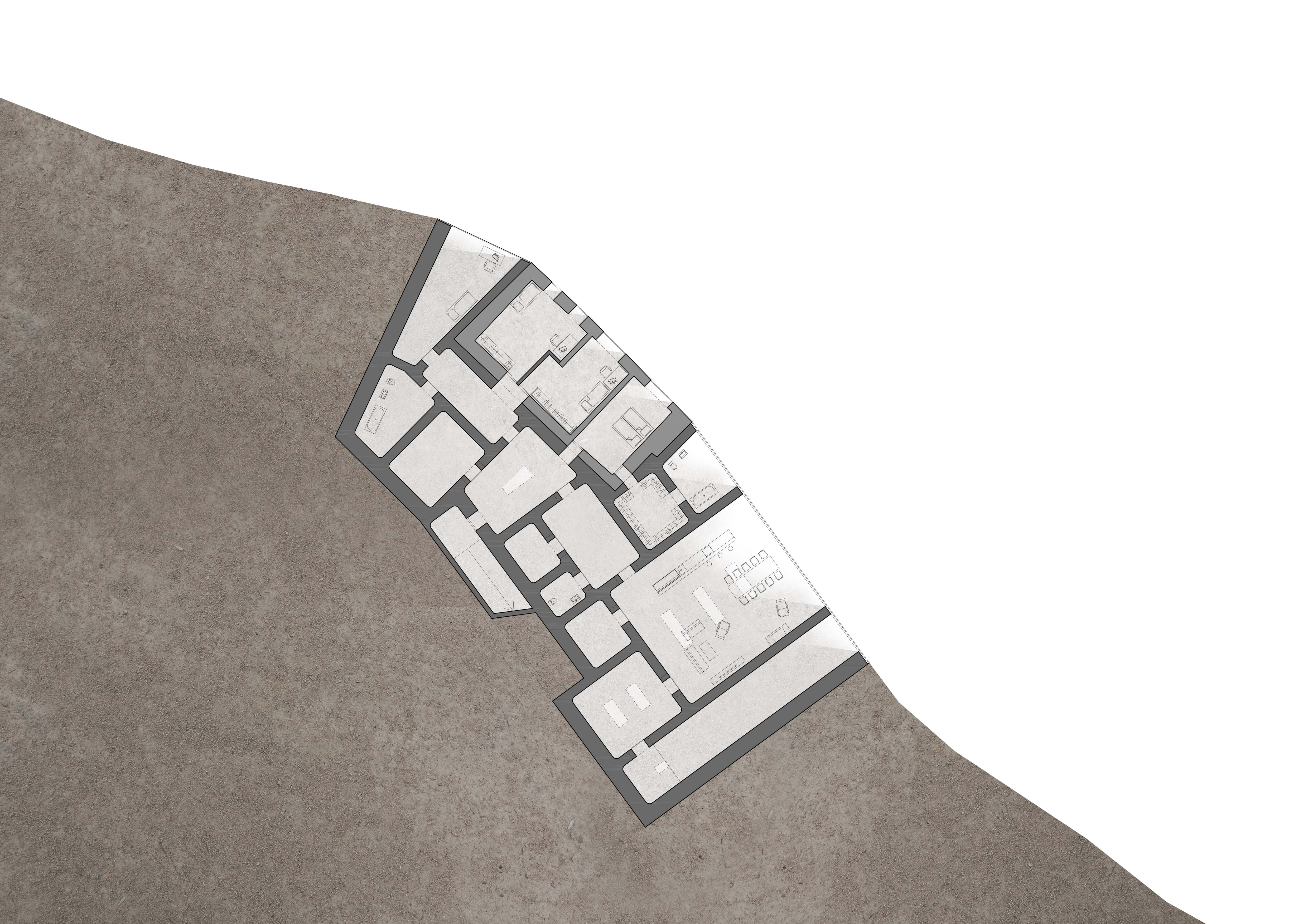 Zvolená koncepcia novostavby umožnila riešiť dispozíciu na jednom podlaží, do ktorého sa vstupuje po rampe z terénu na úrovni strechy. Vstupná hala od seba oddeľuje dve časti stavby. Súkromnú, kde sa nachádzajú izby, kúpeľne, šatne a spoločenskú, kam patrí obývacia izba, kuchyňa, fitness a krytý bazén. Starý objekt predstavuje obytnú časť so spálňami, ktorú je možné priamo prepojiť s exteriérom. Priestory zapustené hlbšie do svahu sú osvetlené zhora cez strešné svetlíky. Vzhľadom k možnosti tvarovania miestností pomocou odoberanie hliny, majú jednotlivé priestory rôznu svetlú výšku. Obývacia izba je vyššia ako ostatné priestory a dáva tak najavo svoj význam.
