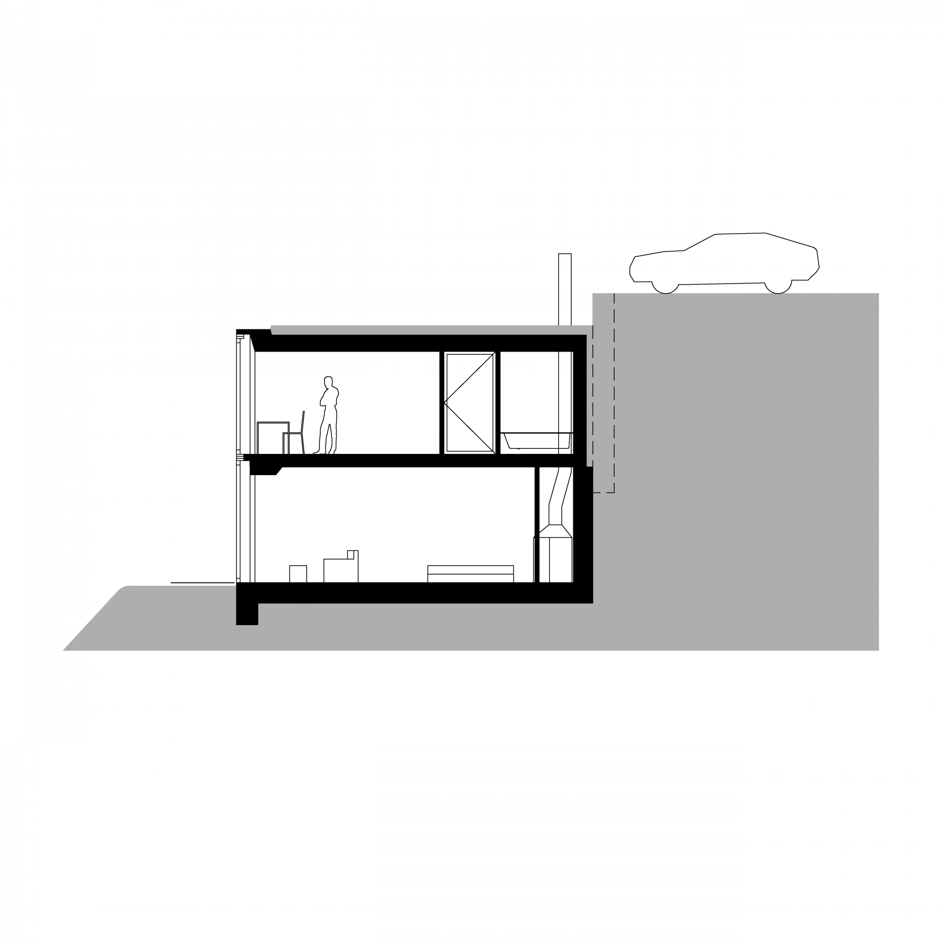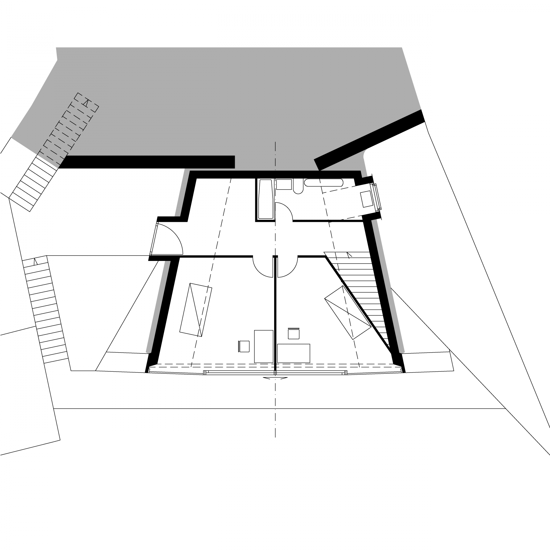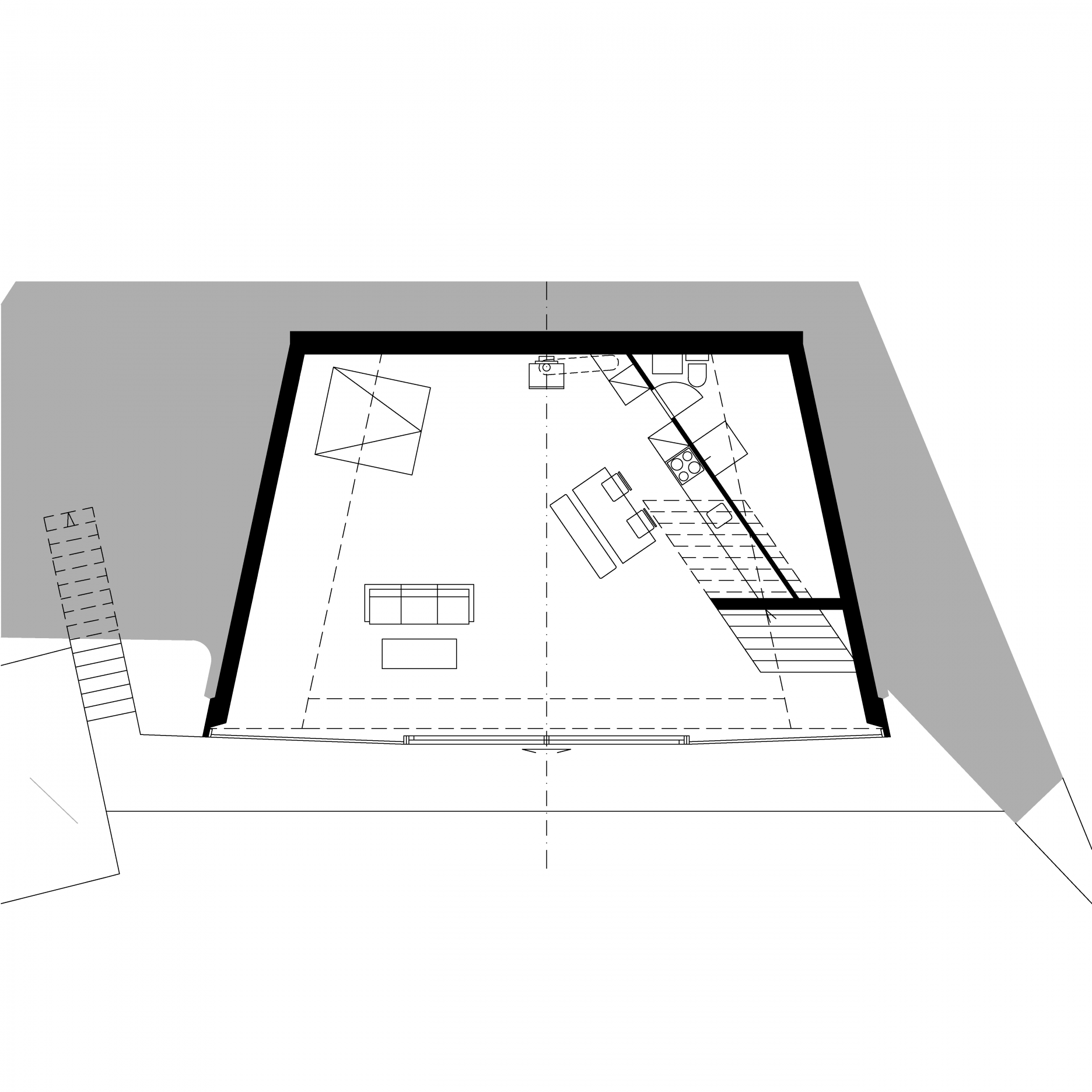 Pôdorys domu sme navrhli v tvare rovnoramenného lichobežníka, zrkadliaceho jeho pozdĺžny profil. Vnútorný priestor je voľný, členený na dve podlažia prepojené schodiskom. Dole, v kontakte so záhradou, je multifunkčný priestor, v ktorom sa nachádza obývacia izba s pracovným kútom a spálňou rodičov, kuchyňa s jedálňou a technické zázemie domu. V hornom podlažı́ sú umiestnené dve spálne detí, kúpelňa a vstupné zázemie. Všetky obytné miestnosti sú orientované cez veľké presklenia južným smerom k záhrade a lesu.