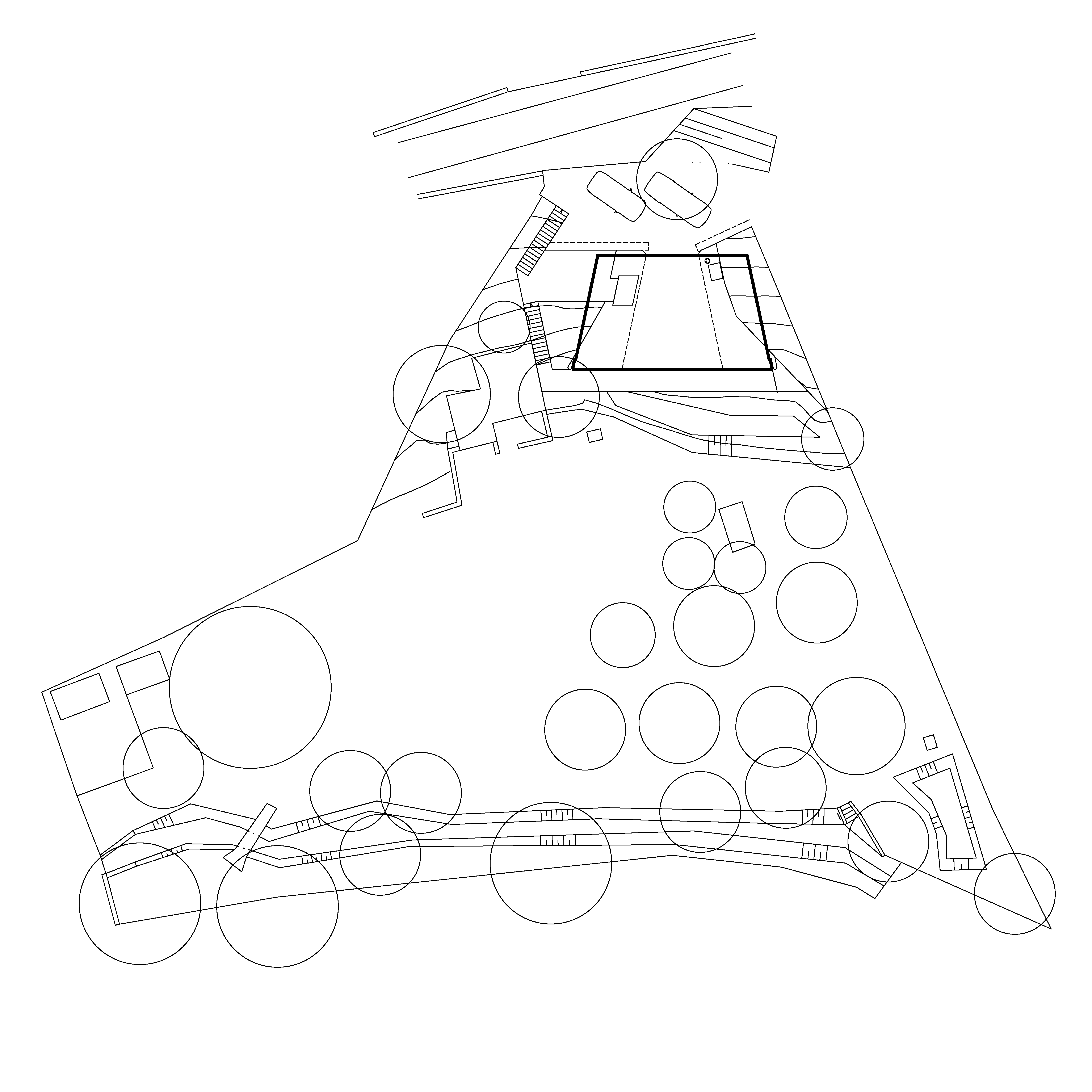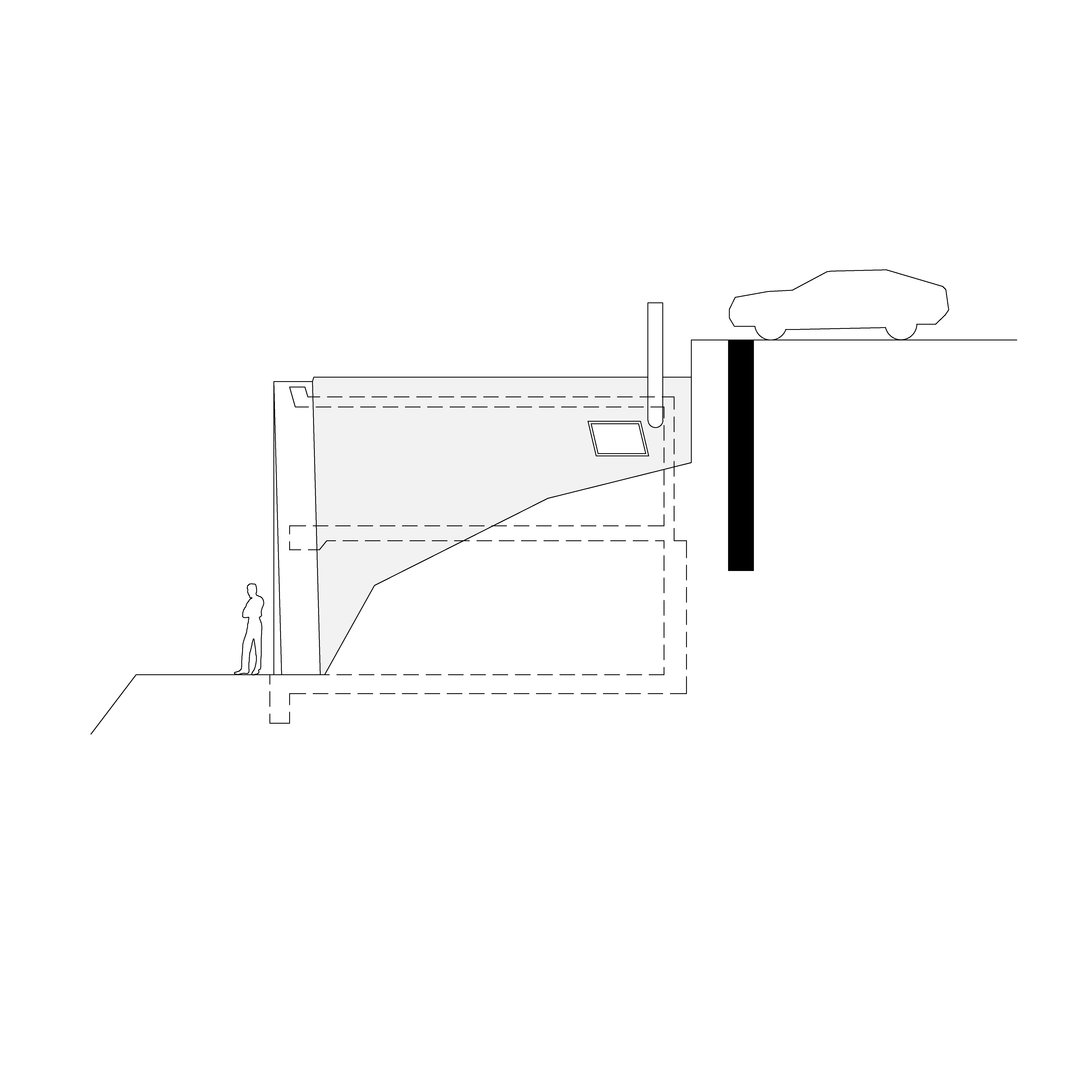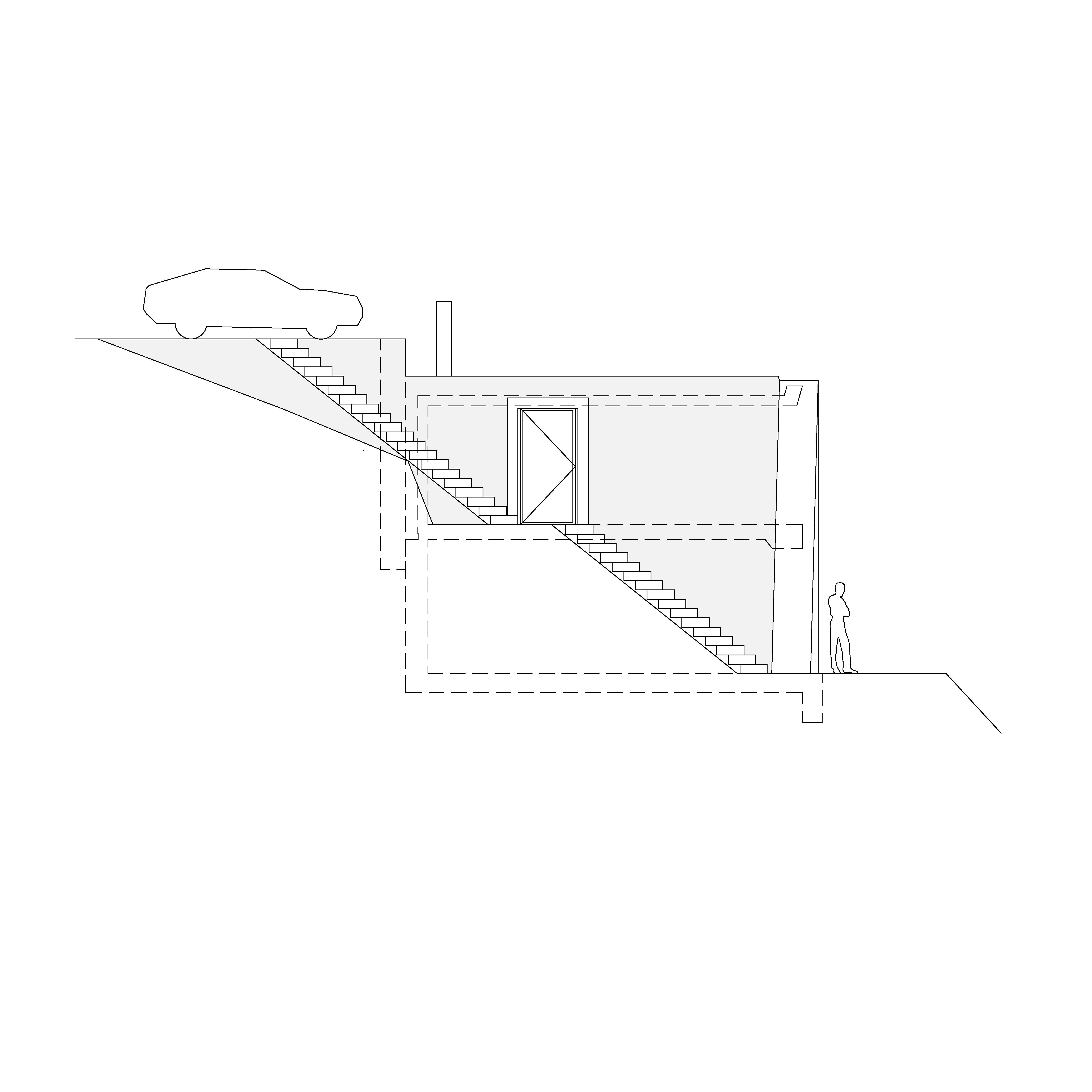 Pôdorys domu sme navrhli v tvare rovnoramenného lichobežníka, zrkadliaceho jeho pozdĺžny profil. Vnútorný priestor je voľný, členený na dve podlažia prepojené schodiskom. Dole, v kontakte so záhradou, je multifunkčný priestor, v ktorom sa nachádza obývacia izba s pracovným kútom a spálňou rodičov, kuchyňa s jedálňou a technické zázemie domu. V hornom podlažı́ sú umiestnené dve spálne detí, kúpelňa a vstupné zázemie. Všetky obytné miestnosti sú orientované cez veľké presklenia južným smerom k záhrade a lesu.