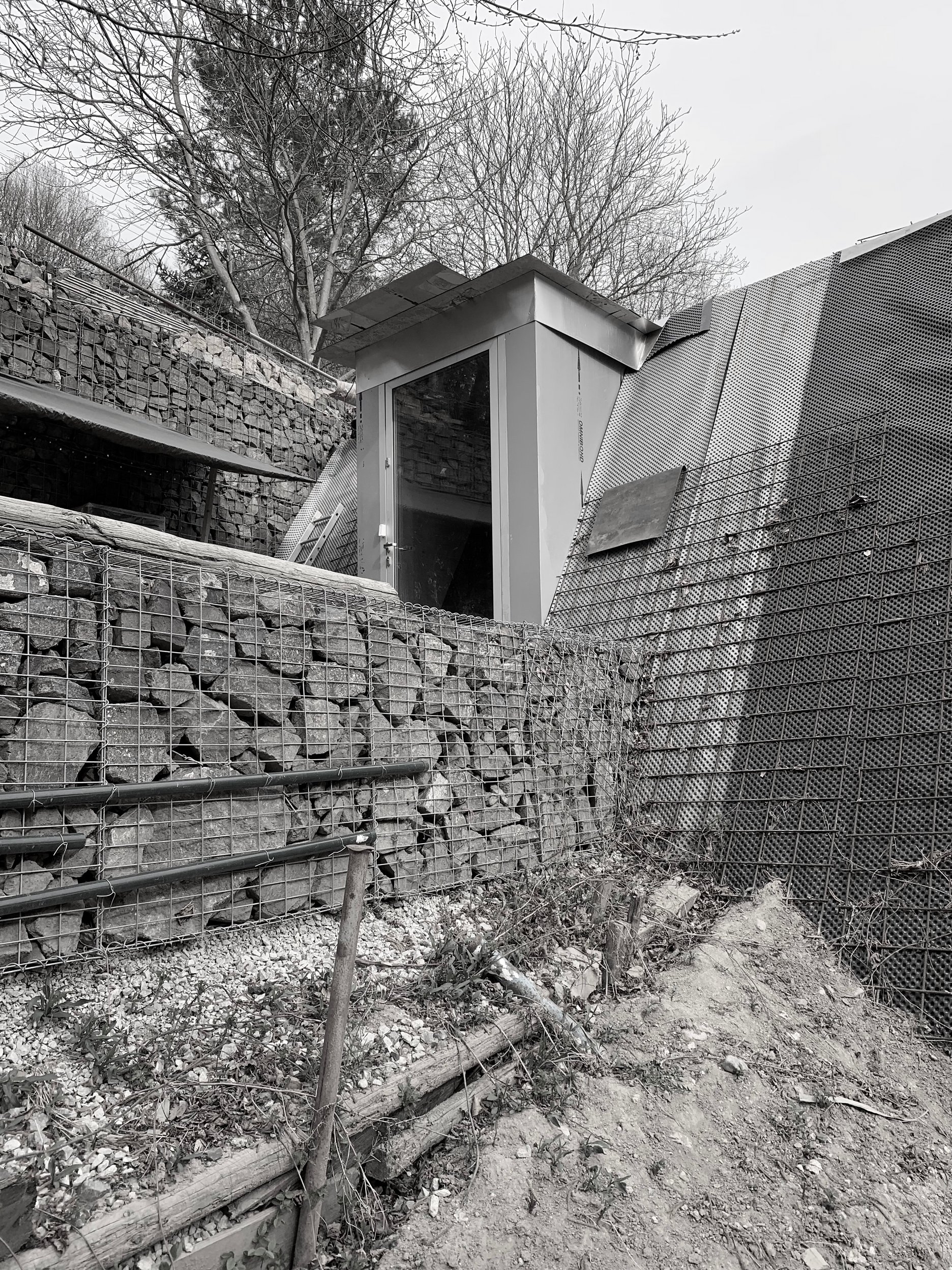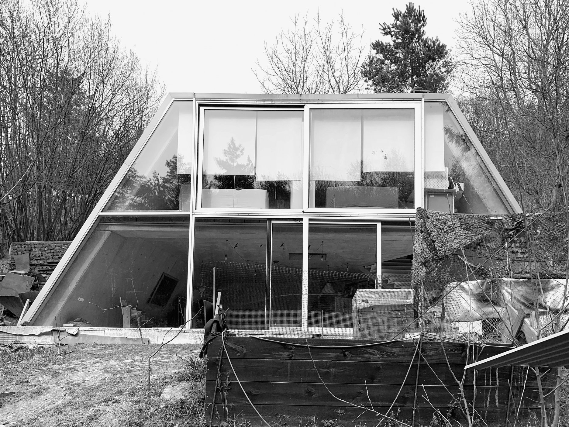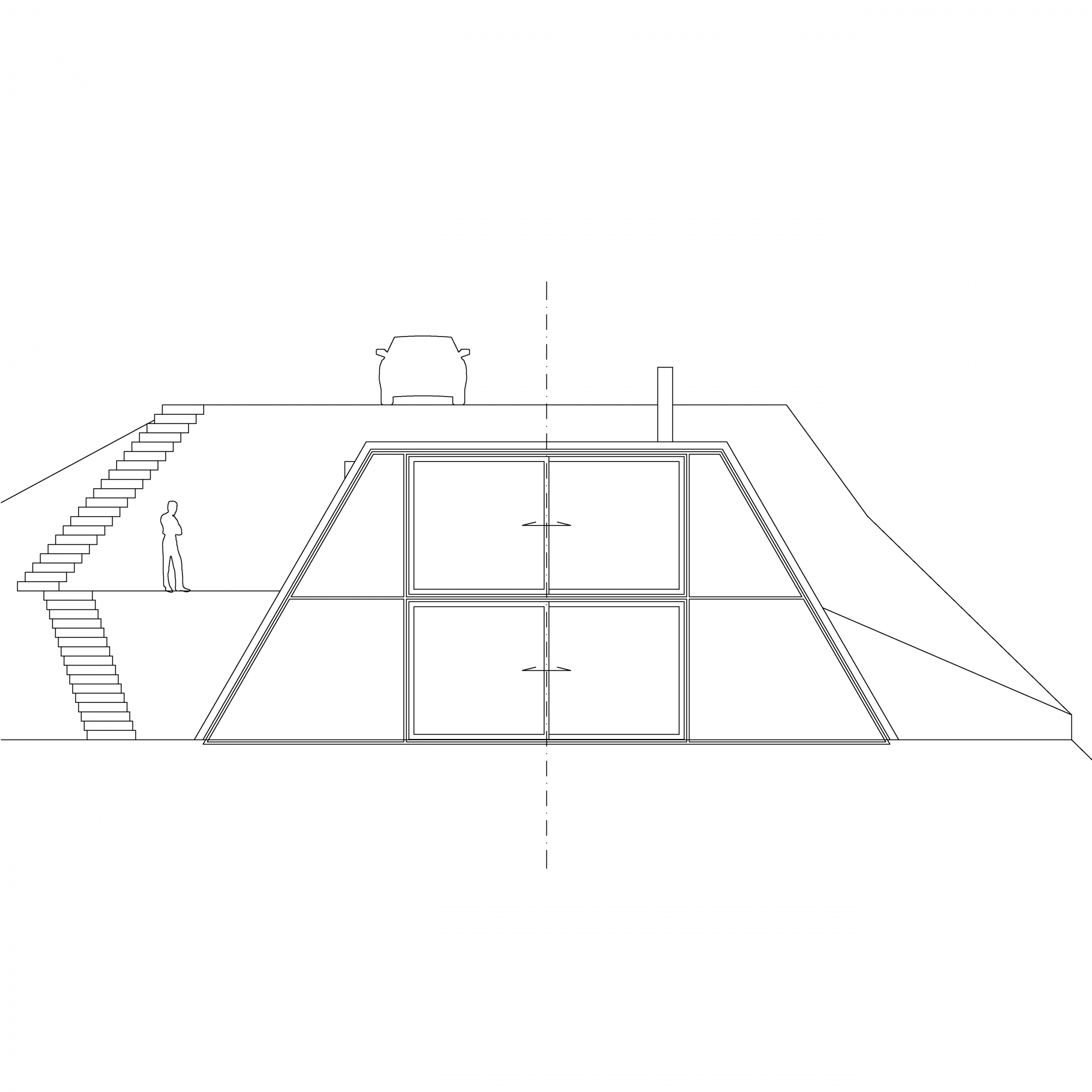 Konštrukciou domu je betónová škrupina (bez vnútrorných podpôr), realizovaná z monolitického betónu, ktorý je v interiéri priznaný. Jediná fasáda domu je presklená stena južným smerom, ktorou komunikuje so svojim okolím. Ostatné plochy domu sú zatrávnené a splývajú s terénom.