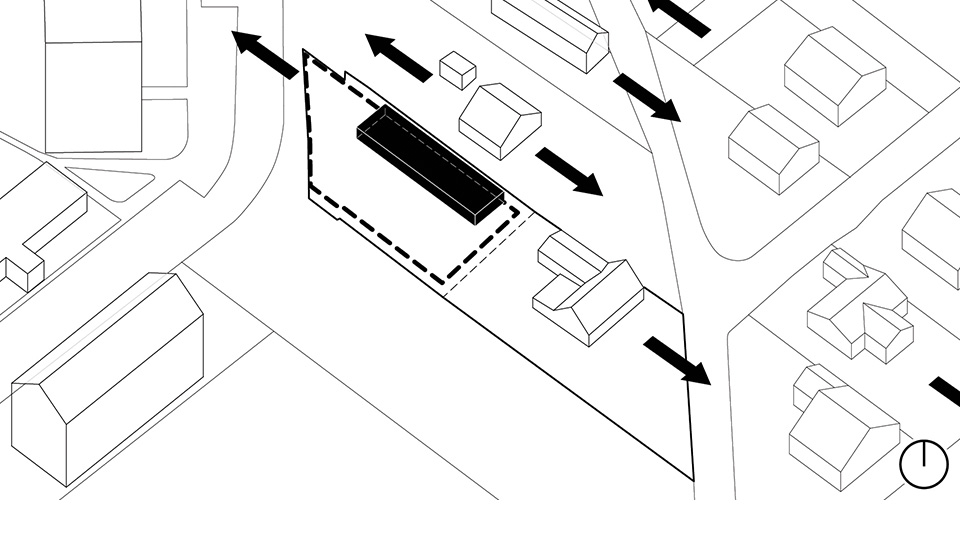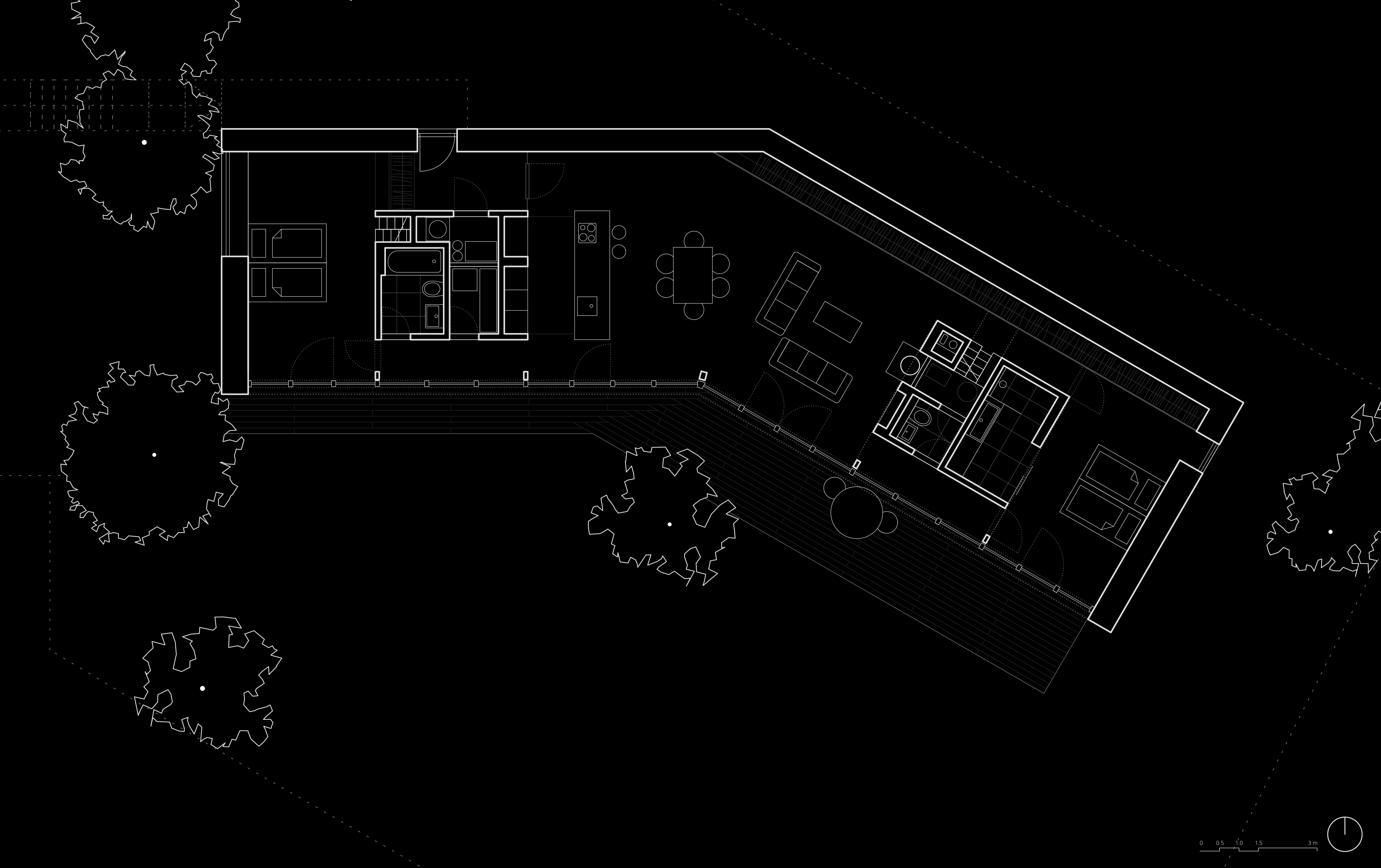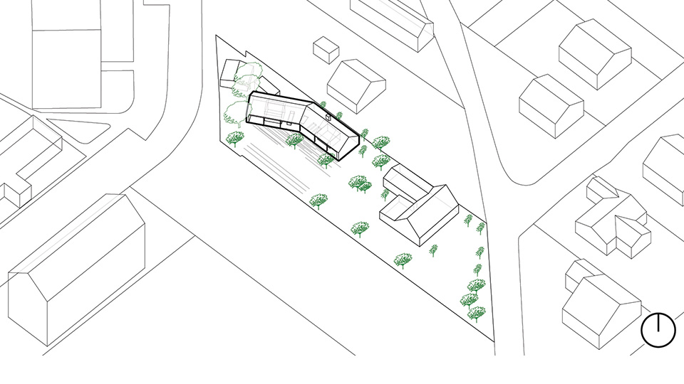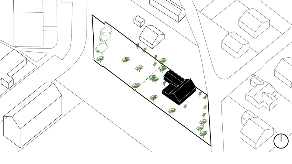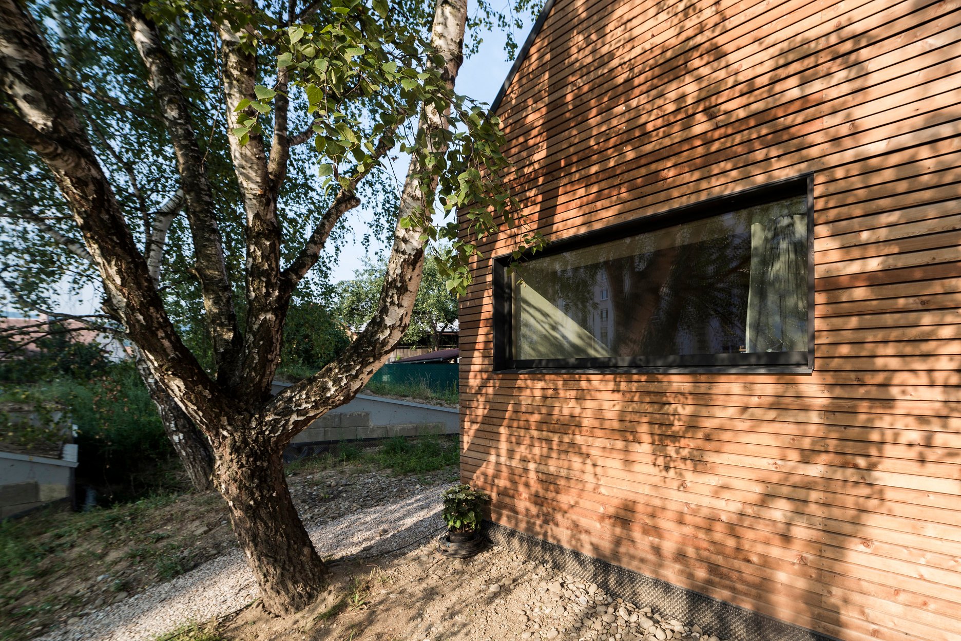 Dom je postavený v záhrade staršieho rodinného domu, kde jeden z klientov strávil svoju mladosť. Osobný vzťah k pozemku uľahčil klientom stotožniť sa s prostredím. Výberom tohto miesta klienti taktiež ušetrili peniaze na výstavbu domu. Charakteristickým znakom záhrady sú tri staré brezy, ktoré vysadili rodičia klientov a zostali ako ich spomienka. Popri tom tvoria optickú bariéru od ulice a ponúkajú tak viac intimity v záhrade.