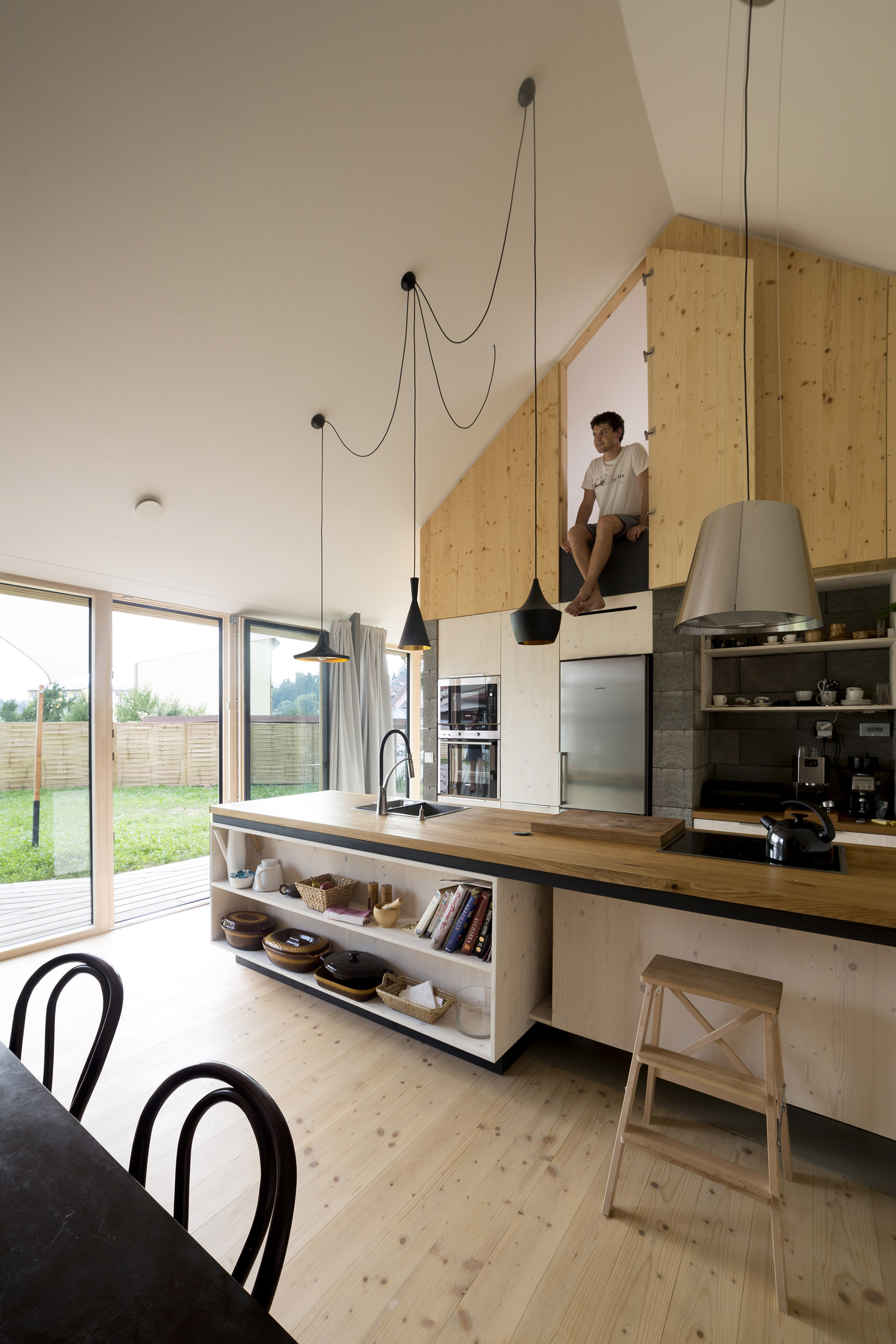 Kuchyňa, sedenie obývacej časti a jedálensky stôl sa nachádzajú vo veľkorysom, centrálne umiestnenom priestore, ktorý je spoločenským jadrom domu. Kachľová pec v obývacej časti vytvára tepelnú pohodu a atmosféru nielen v tomto priestore, ale je pomocou rekuperácie rozvádzané do celého domu a pomáha vykurovať všetky priestory.