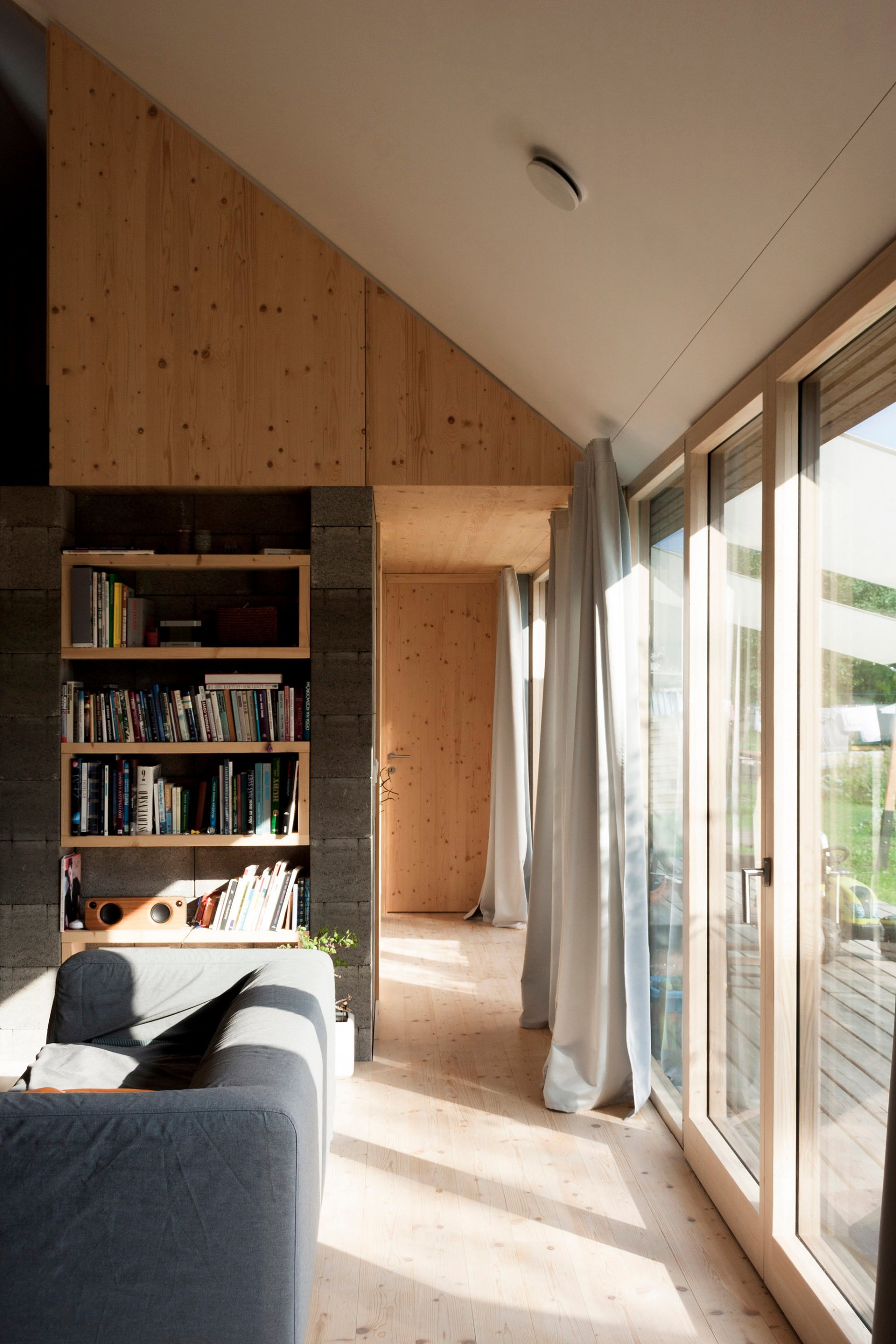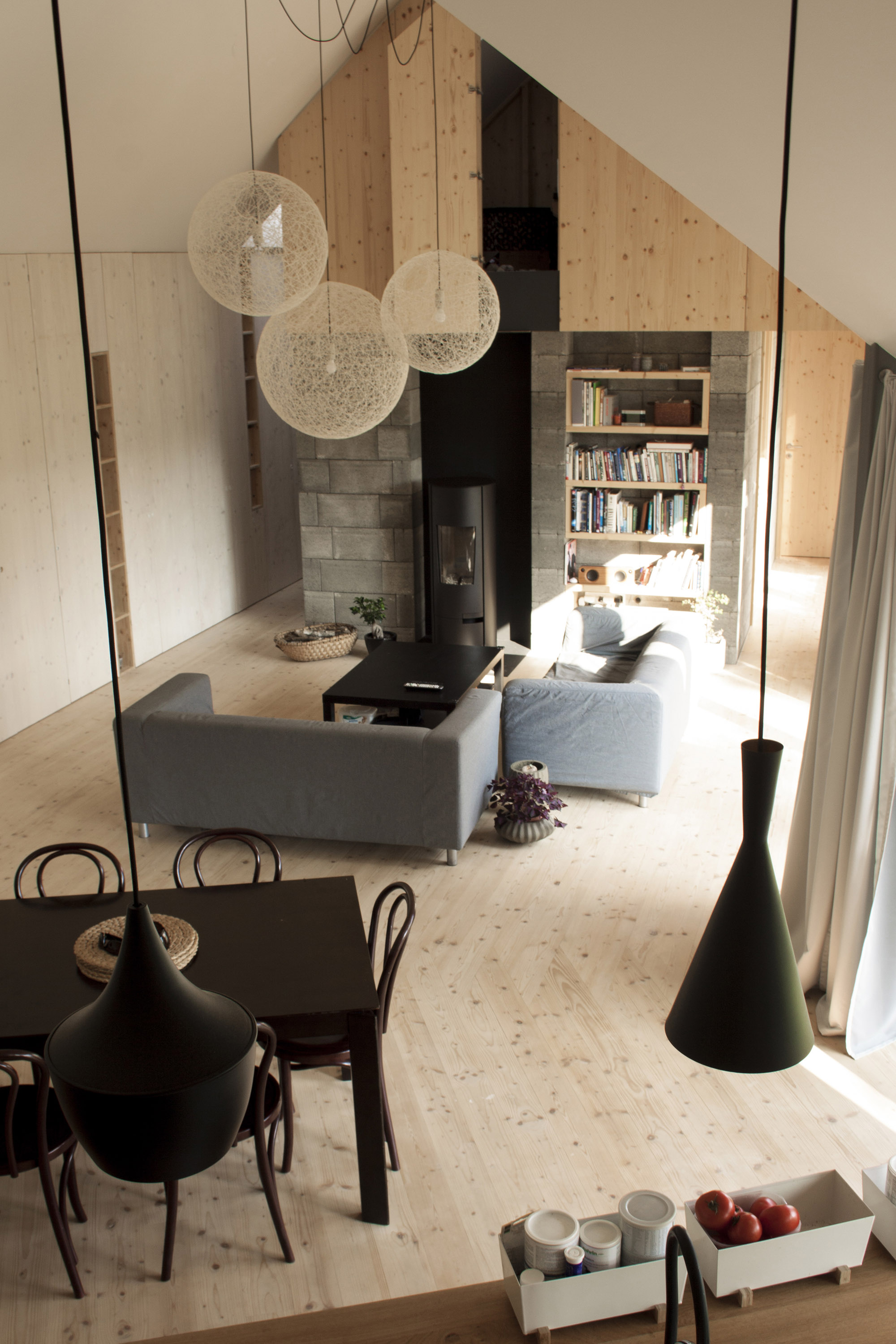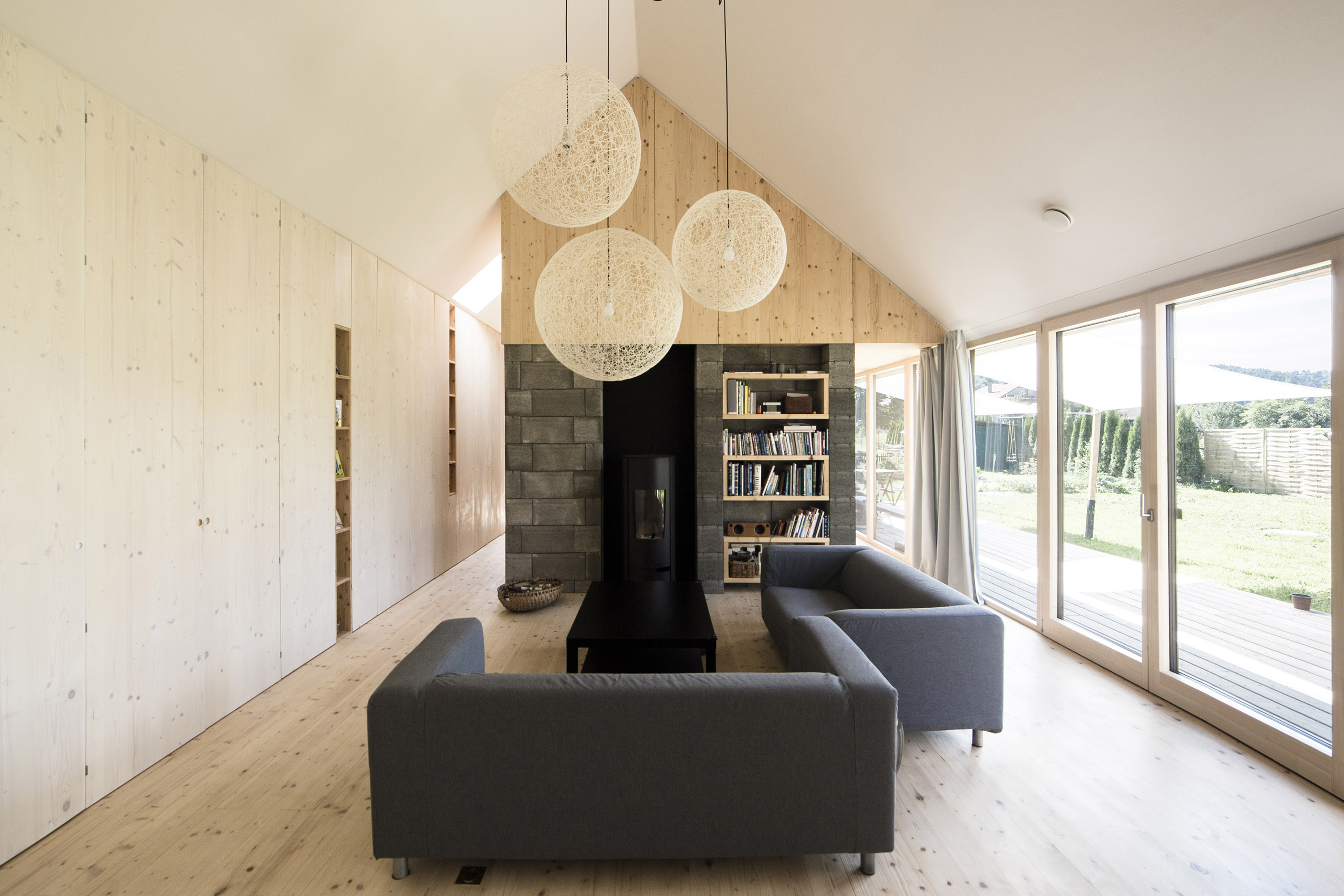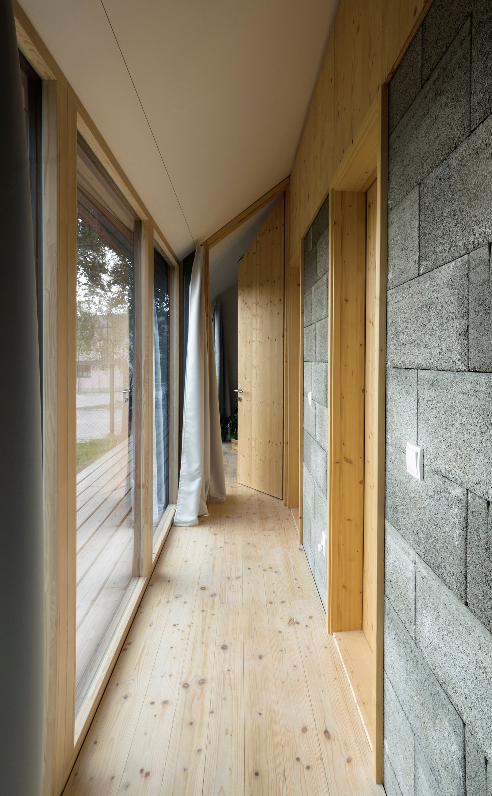 Výnimočný komfort v interiéri je dosiahnutý použitím výhradne masívnych drevených konštrukcií, povrchov a doplnkov zo smrekového dreva, ktoré je tradičným lokálnym materiálom. Smrek je použitý na priznaných konštrukciách, podlahe, rámoch okien a dverí, ako aj ich výplní, kuchynskej linke a 14 m dlhej vstavanej skrini, ktorá sa z centrálneho priestoru tiahne do rodičovskej izby. Surové betónové nosné steny sú príjemným kontrastom s použitých drevom.