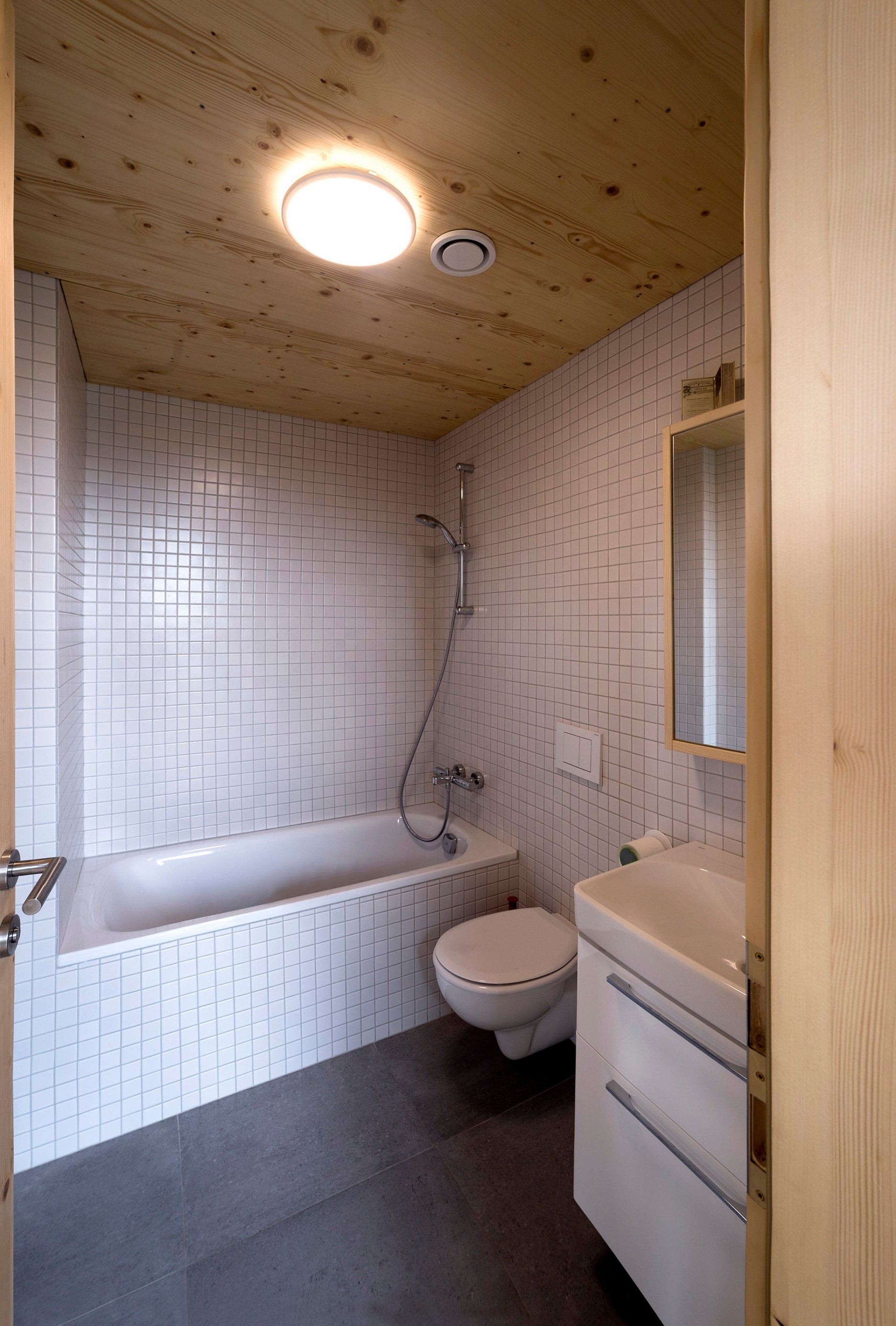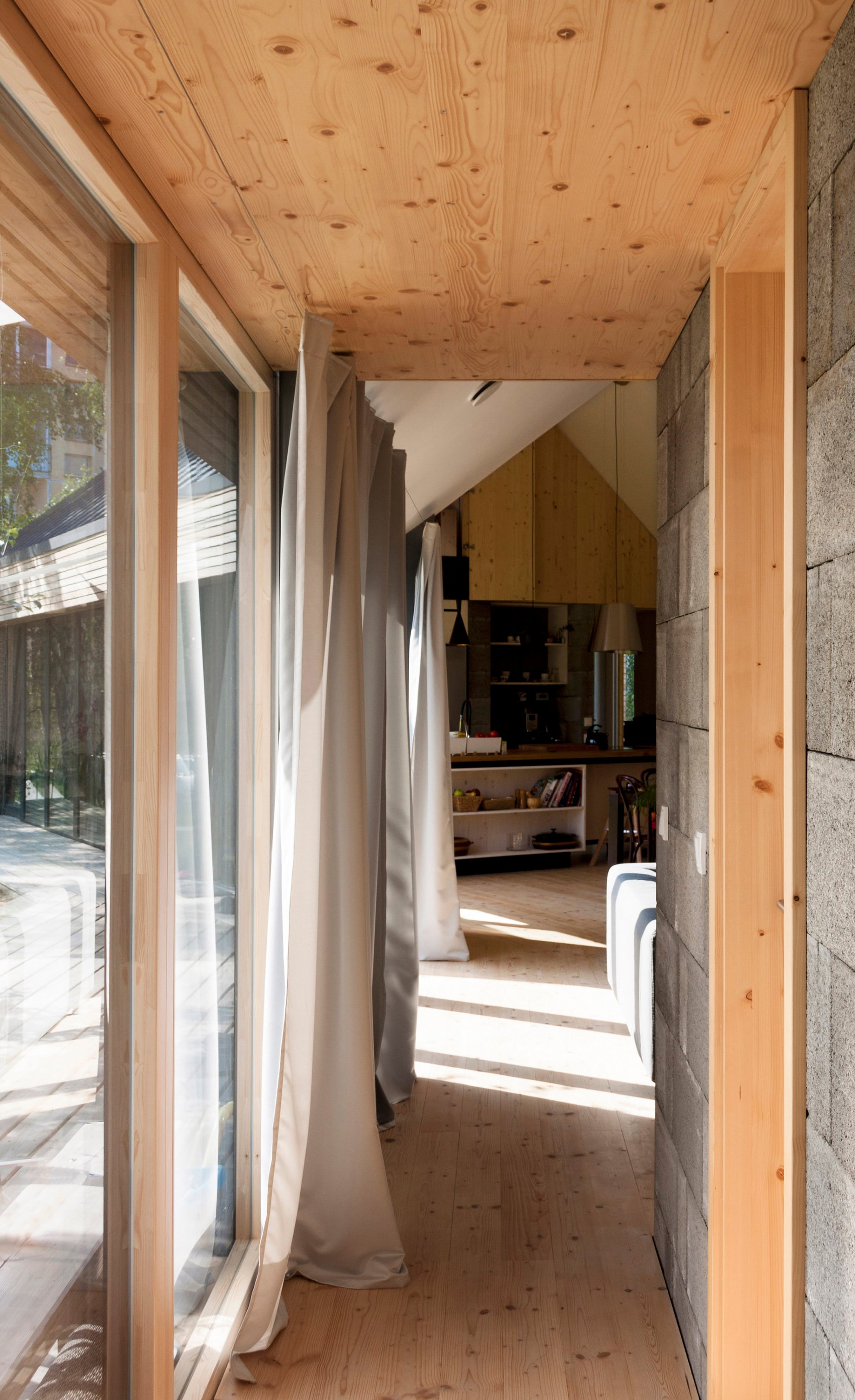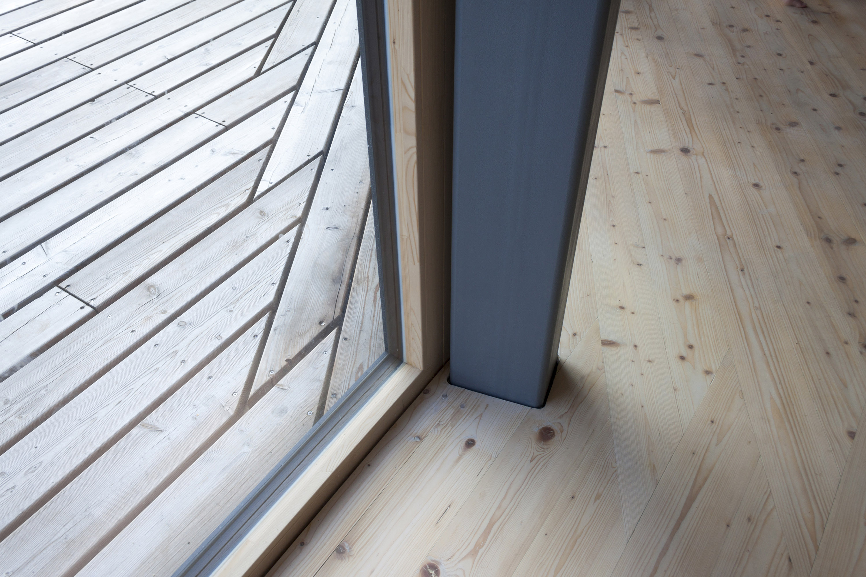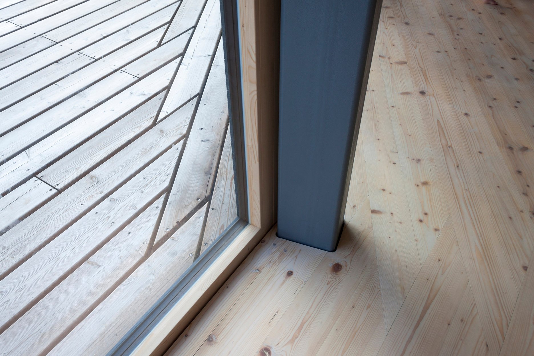 Výnimočný komfort v interiéri je dosiahnutý použitím výhradne masívnych drevených konštrukcií, povrchov a doplnkov zo smrekového dreva, ktoré je tradičným lokálnym materiálom. Smrek je použitý na priznaných konštrukciách, podlahe, rámoch okien a dverí, ako aj ich výplní, kuchynskej linke a 14 m dlhej vstavanej skrini, ktorá sa z centrálneho priestoru tiahne do rodičovskej izby. Surové betónové nosné steny sú príjemným kontrastom s použitých drevom.