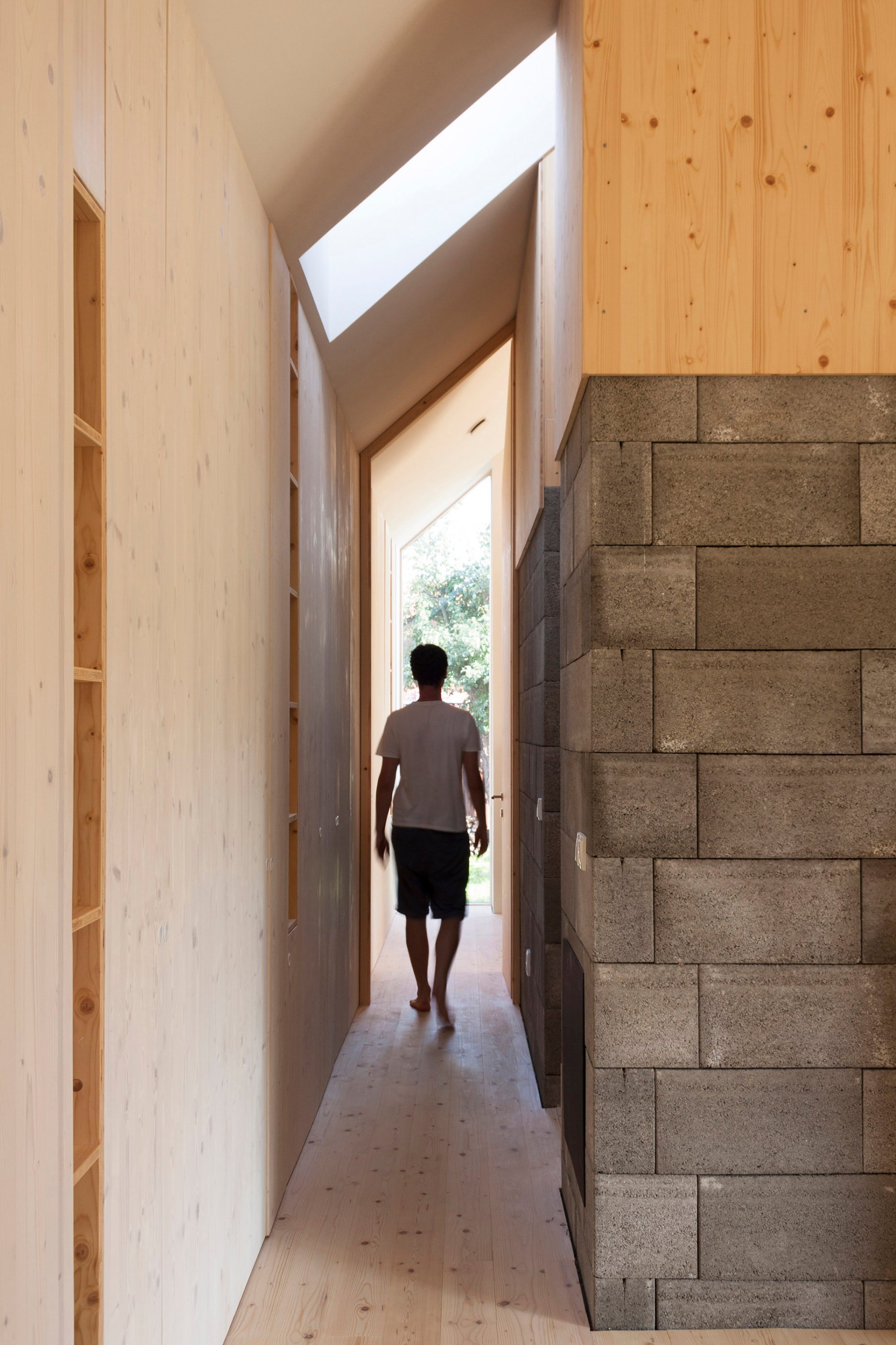 Ľahkú drevenú obvodovú konštrukciu dopĺňajú a stužujú centrálne umiestnené nosné betónové steny a oceľové stĺpiky, ktoré sú súčasťou fasády. Exteriér domu je obložený surovým neošetreným smrekovcovým drevom, ktoré časom zošedne. Koncept využitia surových materiálov je použitý aj na doplnkových budovách v záhrade a rovnako je priznaný materiál nosných stien z betónových tvárnic v interiéri.